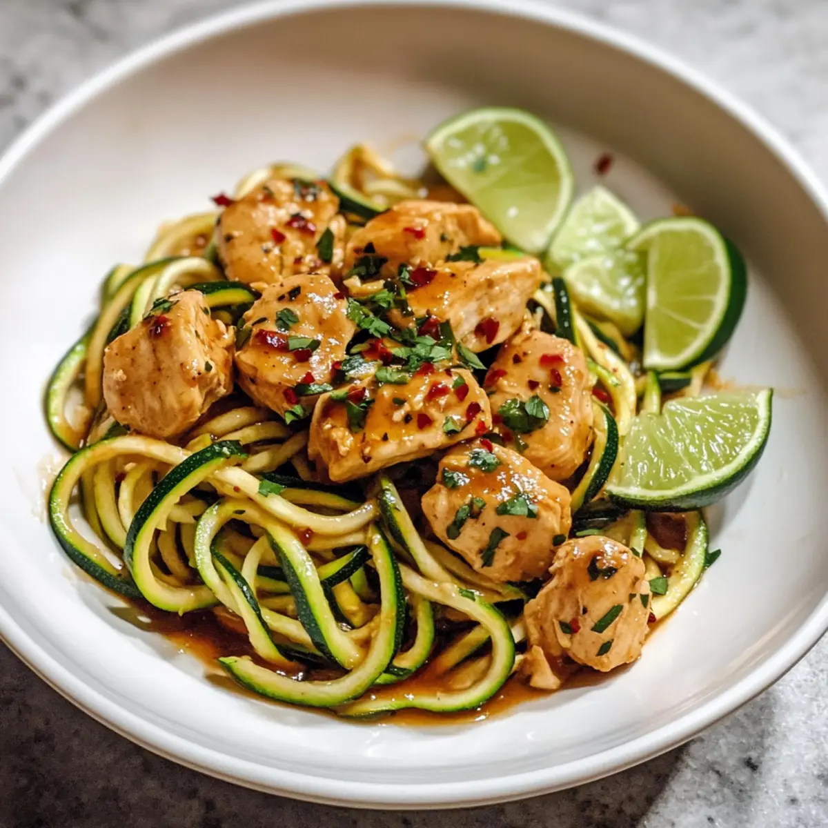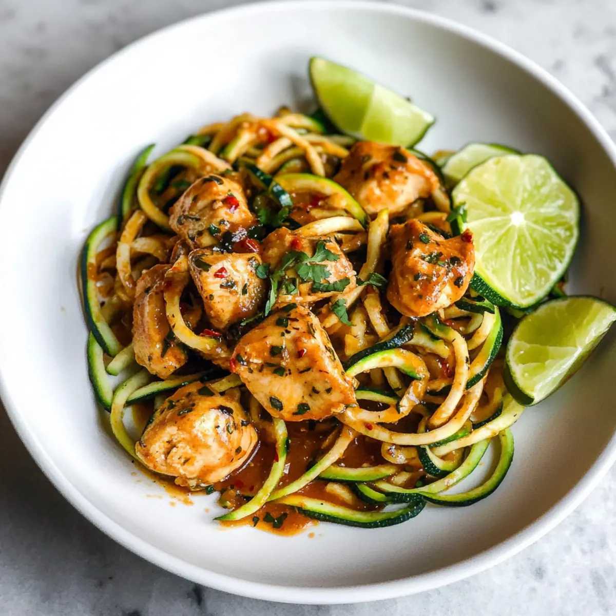 Eines Morgens, als der Duft von frisch gebratenem Hähnchen durch meine Küche zog, stellte ich fest, dass ich eine kreative Wendung für mein schnelles Mittagessen brauchte. So entstand das Rezept für 15 Minuten süß und scharf Hähnchen Zoodles – eine köstliche, low-carb Variante, die in weniger als einer Viertelstunde auf dem Tisch steht. Diese zarten Hähnchenstücke, umhüllt von einer würzigen Sauce, treffen auf knackige Zucchini-Nudeln, die das perfekte Wohlfühlessen für stressige Wochentage bieten. Egal, ob du ein schnelles Abendessen nach einem langen Arbeitstag zubereiten möchtest oder einfach nur Lust auf eine gesunde Mahlzeit hast, dieses Rezept wird deine neue Go-To-Option. Bereit, deine Kochkünste aufzupeppen? Lass uns gemeinsam in die Welt dieser schmackhaften Zoodles eintauchen und entdecken, wie einfach es sein kann, gesunde Gerichte zu zaubern! Warum wirst du dieses Rezept lieben? Einfachheit: Der gesamte Prozess nimmt nur 15 Minuten in Anspruch und erfordert keine komplizierten Kochtechniken, ideal für alle, die keine Zeit verlieren möchten. Vielseitigkeit: Du kannst das Hähnchen ganz einfach durch Garnelen oder Tofu ersetzen, um eine vegetarische Variante zu kreieren. Gesundheit: Mit zarten Zucchini-Nudeln und einer aromatischen, kalorienarmen Sauce ist dieses Gericht perfekt für jeden, der auf eine ausgewogene Ernährung Wert legt. Köstlicher Geschmack: Die Kombination aus süßen und scharfen Aromen bringt das Beste der asiatischen Küche direkt auf deinen Tisch. Familienfreundlich: Dieses Rezept ist ein Hit bei Groß und Klein – die Kinder lieben die „Nudeln“, und du kannst dir sicher sein, dass sie beim Essen auch gesund bleiben! 15 Minuten süß und scharf Hähnchen Zoodles Zutaten Für das Hähnchen • Hähnchenbrust – Bietet Protein und Struktur; verwende entbeinte, hautlose Hähnchenbrust für eine einfache Zubereitung. • Olivenöl – Sorgt für Feuchtigkeit und hilft beim Garen des Hähnchens; du kannst es auch durch Avocadoöl ersetzen, um den Rauchpunkt zu erhöhen. • Knoblauch – Verleiht dem Gericht aromatische Tiefe; frisch gehackter Knoblauch bringt den besten Geschmack. Für die Sauce • Sriracha-Sauce – Fügt dem Gericht Schärfe und Tiefe hinzu; passe die Menge nach deinem Geschmack an; für weniger Schärfe verwende weniger oder eine mildere Sauce. • Hoisin-Sauce – Sorgt für eine süße Note und eine glänzende Konsistenz; wenn sie nicht verfügbar ist, kannst du eine Mischung aus Sojasauce und einem Hauch Zucker verwenden. • Sojasauce – Bringt Umami-Geschmack ins Spiel; Tamari kann für eine glutenfreie Variante verwendet werden. • Limettensaft – Fügt Säure und Frische hinzu; du kannst ihn bei Bedarf auch durch Zitronensaft ersetzen. • Rote-Pfeffer-Flocken – bietet zusätzliche Würze; für eine mildere Version weglassen oder nach Belieben anpassen. Für die Zoodles • Zucchini – Dient als low-carb Nudelalternative und verleiht Frische und Ballaststoffe; spiraliere sie frisch vor dem Kochen für die beste Textur. Entdecke mit diesen 15 Minuten süß und scharf Hähnchen Zoodles, wie schnell und einfach gesunde, Genussreiche Mahlzeiten auf dem Tisch stehen können! Schritt-für-Schritt-Anleitung für 15 Minuten süß und scharf Hähnchen Zoodles Step 1: Hähnchen anbraten Erhitze in einer großen Pfanne bei mittlerer bis hoher Temperatur Olivenöl. Füge die gewürfelten Hähnchenstücke hinzu und brate sie für 5-7 Minuten an, bis sie goldbraun und durchgegart sind. Achte darauf, das Hähnchen regelmäßig zu wenden, damit es gleichmäßig gart und nicht anbrennt. Step 2: Zucchini spiralisieren Während das Hähnchen brät, bereite die Zucchini vor, indem du sie mit einem Spiralschneider in Nudeln (Zoodles) schnittst. Achte darauf, die Zucchini sofort zu verwenden, damit sie frisch bleibt und die beste Textur hat. Stelle die Zoodles beiseite, während das Hähnchen fertig gart. Step 3: Sauce vorbereiten In einer kleinen Schüssel vermischst du den gehackten Knoblauch, Sriracha, Hoisin-Sauce, Sojasauce, Limettensaft und die roten Pfefferflocken. Rühre die Zutaten gut um, bis sie gut kombiniert sind. Diese würzige Sauce verleiht deinem 15 Minuten süß und scharf Hähnchen Zoodles den perfekten Geschmack. Step 4: Sauce hinzufügen Sobald das Hähnchen goldbraun und durchgegart ist, gieße die vorbereitete Sauce in die Pfanne. Rühre das Hähnchen gründlich um, damit es gleichmäßig mit der Sauce bedeckt ist. Lass es für eine weitere Minute bei mittlerer Hitze köcheln, damit sich die Aromen gut verbinden. Step 5: Zoodles einarbeiten Füge nun die spiralisierte Zucchini in die Pfanne hinzu und vermische alles sanft. Koche die Zoodles für etwa 1-2 Minuten, bis sie leicht erwärmt sind, aber noch eine knackige Konsistenz haben. Achte darauf, dass die Zoodles nicht übergart werden, da sie sonst matschig werden könnten. Step 6: Anrichten und servieren Sobald die Zoodles gut mit dem Hähnchen und der Sauce vermischt sind, nimm die Pfanne vom Herd. Serviere die 15 Minuten süß und scharf Hähnchen Zoodles sofort auf Tellern und genieße das harmonische Zusammenspiel von scharfem Hähnchen und frischen Zucchini-Nudeln. Expertentipps für 15 Minuten süß und scharf Hähnchen Zoodles Hähnchen nicht überkochen: Achte darauf, das Hähnchen regelmäßig zu wenden und die Garzeit von 5-7 Minuten nicht zu überschreiten, um eine zarte Textur zu erhalten. Zoodles frisch zubereiten: Spiraliere die Zucchini kurz vor dem Kochen, um eine perfekte Knackigkeit und Frische zu gewährleisten; übermäßiges Kochen kann sie matschig machen. Sauce anpassen: Wenn du die Würze magst, probiere verschiedene Sriracha-Mengen aus oder ersetze diese durch eine mildere Sauce, um das Gericht für jeden Geschmack anzupassen. Aromen intensivieren: Für zusätzlichen Geschmack kannst du frische Kräuter wie Koriander oder Schnittlauch als Garnitur verwenden, um das Gericht noch ansprechender zu gestalten. Variationen prob