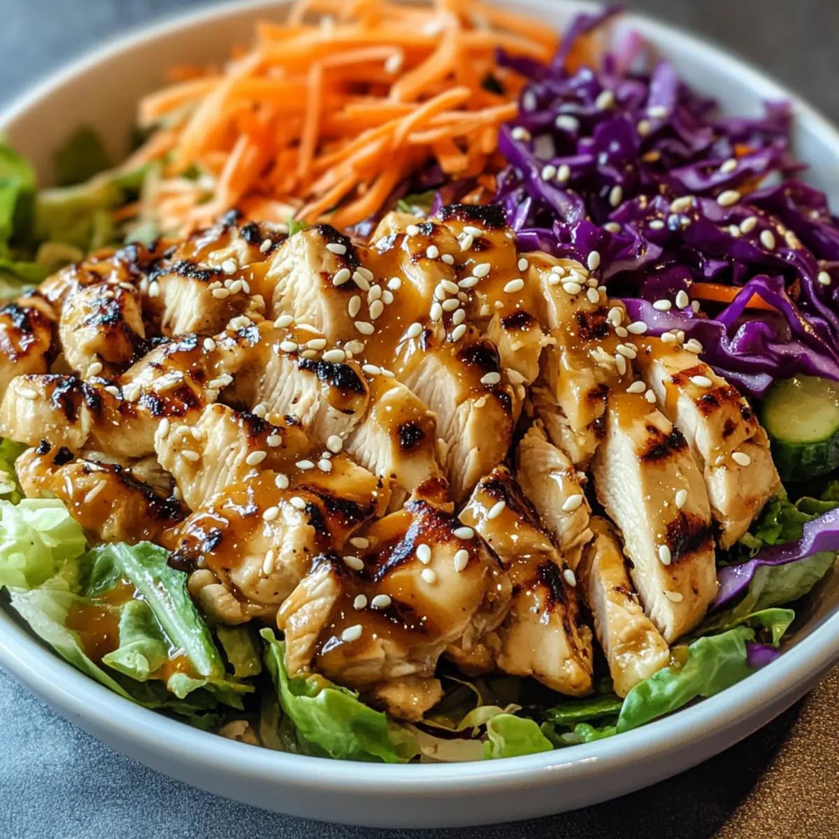 Als ich neulich in einem kleinen asiatischen Restaurant saß, wurde mir klar, dass der perfekte Salat nicht nur frisch und leicht sein kann, sondern auch ein wahres Geschmackserlebnis bietet. Diese Erkenntnis führte mich zu meinem Asiatischen Sesam-Hühnchen-Salat, der nicht nur in nur 25 Minuten zubereitet werden kann, sondern auch proteinreich und unendlich anpassbar ist. Das Zusammenspiel der knusprigen Gemüsesorten und zarten Grillhühner-Stücke, gepaart mit einem würzigen Sesam-Ingwer-Dressing, macht ihn zu einer echten Hauptspeise – ideal für ein schnelles Mittagessen oder ein leichtes Abendessen. Wer braucht da schon Fast Food? Bereit für eine Geschmacksexplosion? Lass uns in die Zubereitung eintauchen! Warum wird dieser Salat dein Favorit sein? Einfachheit: Die Zubereitung des Asiatischen Sesam-Hühnchen-Salats ist schnell und unkompliziert, perfekt für Anfänger oder vielbeschäftigte Köche. Vielseitigkeit ist ein weiteres Highlight; du kannst Zutaten nach deinem Geschmack anpassen, sei es mit Tofu, verschiedenen Gemüsesorten oder saisonalen Früchten. Gesundheit steht im Vordergrund: reich an Proteinen und Nährstoffen, macht er satt und bleibt leicht. Köstlicher Geschmack: Die Kombination aus frischen Aromen und dem würzigen Dressing wird jeden überzeugen. Perfekt für jede Gelegenheit: Ob als Mittagessen im Büro oder als leichtes Dinner, dieser Salat ist die ideale Wahl, die vielseitig verzehrt werden kann. Asiatischer Sesam-Hühnchen-Salat Zutaten • Entdecke alle Zutaten, die du für diesen köstlichen und gesunden Salat benötigst. Für den Salat: Grüner Kopfkohl (gerieben) – sorgt für knusprige Textur; du kannst ihn auch durch Napa-Kohl ersetzen, wenn du einen milderen Geschmack bevorzugst. Rotkohl (gerieben) – bringt Farbe und einen leicht pfeffrigen Geschmack; kann weggelassen werden, wenn du eine einfachere Variante möchtest. Karotten (gerieben) – verleihen Süße und Farbe; verwende vorgeriebene Karotten, um Zeit zu sparen. Edamame (geschält und gedämpft) – fügt Protein und eine sanfte Knusprigkeit hinzu; kannst sie durch Kichererbsen für eine andere Textur ersetzen. Gegrillte Hähnchenbrust (in Stücke geschnitten oder zerzupft) – die Hauptquelle für Protein. Vorgekochtes Hähnchen oder Rotisserie-Hähnchen sind praktische Alternativen. Frühlingszwiebeln (in Scheiben geschnitten) – bringen frische, scharfe Aromen; du kannst sie durch Schnittlauch ersetzen, falls benötigt. Sesamsamen – zum Garnieren und für zusätzlichen Geschmack; wechsle sie gegen geröstete Kürbiskerne als nussfreie Option. Mandeln (in Scheiben) – für knusprigen Biss; ersetze sie durch geröstete Erdnüsse für ein anderes Geschmackserlebnis. Wonton-Streifen – optional für mehr Textur; kannst sie durch knusprige Kichererbsen gegen eine gesündere Alternative ersetzen. Für das Sesam-Ingwer-Dressing: Reisweinessig – sorgt für eine angenehme Säure; kann durch Apfelessig für einen anderen Geschmack ersetzt werden. Sojasauce – bringt umami Tiefe; benutze Tamari für eine glutenfreie Variante. Sesamöl – fügt einen nussigen Geschmack hinzu; du kannst es durch Olivenöl für eine leichtere Option ersetzen. Olivenöl – um das Dressing auszubalancieren; jedes neutrale Öl kann hier Verwendung finden. Honig oder Ahornsirup – für die Süße; Agavendicksaft kann als vegane Alternative verwendet werden. Frischer Ingwer (gerieben) – der Hauptgeschmacksträger; gemahlener Ingwer kann im Notfall verwendet werden, schmeckt aber nicht so frisch. Knoblauch (gehackt) – verbessert das Geschmacksprofil; ersetze ihn durch Knoblauchpulver, wenn nötig. Spritzer Limettensaft oder Sriracha – für den zusätzlichen Geschmackskick; lassen sich weglassen, wenn du es milder magst. Entdecke alle Zubereitungsschritte und lass dich inspirieren, deinen eigenen Asiatischen Sesam-Hühnchen-Salat zu kreieren! Schritt-für-Schritt-Anleitung für den Asiatischen Sesam-Hühnchen-Salat Step 1: Gemüse vorbereiten In einer großen Schüssel kombinierst du den geriebenen grünen und roten Kohl, die geriebenen Karotten sowie die gedämpften Edamame und die in Scheiben geschnittenen Frühlingszwiebeln. Achte darauf, alles gut zu vermengen, sodass die Farben leuchtend und ansprechend sind. Dieser Schritt dauert etwa 5 Minuten und bildet die knusprige Basis für deinen asiatischen Sesam-Hühnchen-Salat. Step 2: Hähnchen hinzufügen Sobald das Gemüse gut vermischt ist, belege die Mischung gleichmäßig mit den in Stücke geschnittenen oder zerzupften gegrillten Hähnchenbrustfilets. Verteile das Hähnchen appetitlich über den Salat und genieße den Kontrast zwischen dem zarten Fleisch und den knackigen Gemüsen. Dieser Schritt benötigt etwa 2 Minuten, um eine festliche Präsentation zu gewährleisten. Step 3: Dressing zubereiten In einer separaten Schüssel vermischst du die Zutaten für das Sesam-Ingwer-Dressing. Dazu gehören Reisweinessig, Sojasauce, Sesamöl, Olivenöl, Honig oder Ahornsirup, frisch geriebener Ingwer und gehackter Knoblauch. Mit einem Schneebesen die Mischung gut durchschlagen, bis sie cremig und homogen ist — dieser Prozess dauert etwa 3 Minuten. Step 4: Dressing hinzufügen und mischen Gieße das Dressing über den Salat und rühre mit einer großen Gabel oder einem Salatbesteck alles sanft um, bis alle Zutaten gleichmäßig mit der würzigen Sauce überzogen sind. Achte darauf, nicht zu fest zu rühren, damit die frischen Elemente erhalten bleiben. Das Mischen sollte nur etwa 2 Minuten in Anspruch nehmen, um die Farben lebendig zu halten. Step 5: Garnitur und Servieren Zum Schluss streue die Sesamsamen oder andere gewünschte Toppings über den Salat. Optional kannst du auch die Wonton-Streifen oder gerösteten Mandeln für zusätzlichen Knuspergenuss hinzufügen. Serviere den asiatischen Sesam-Hühnchen-Salat sofort, um die frischen Aromen zu genießen, und freue dich auf die perfekt ausgewogene Mischung aus Texturen und Geschmacksrichtungen! Was