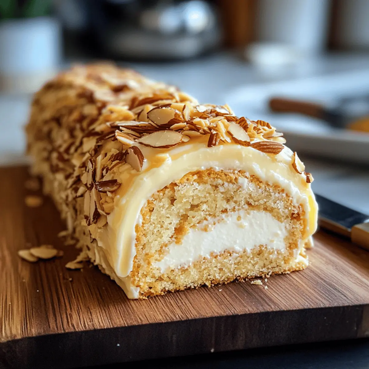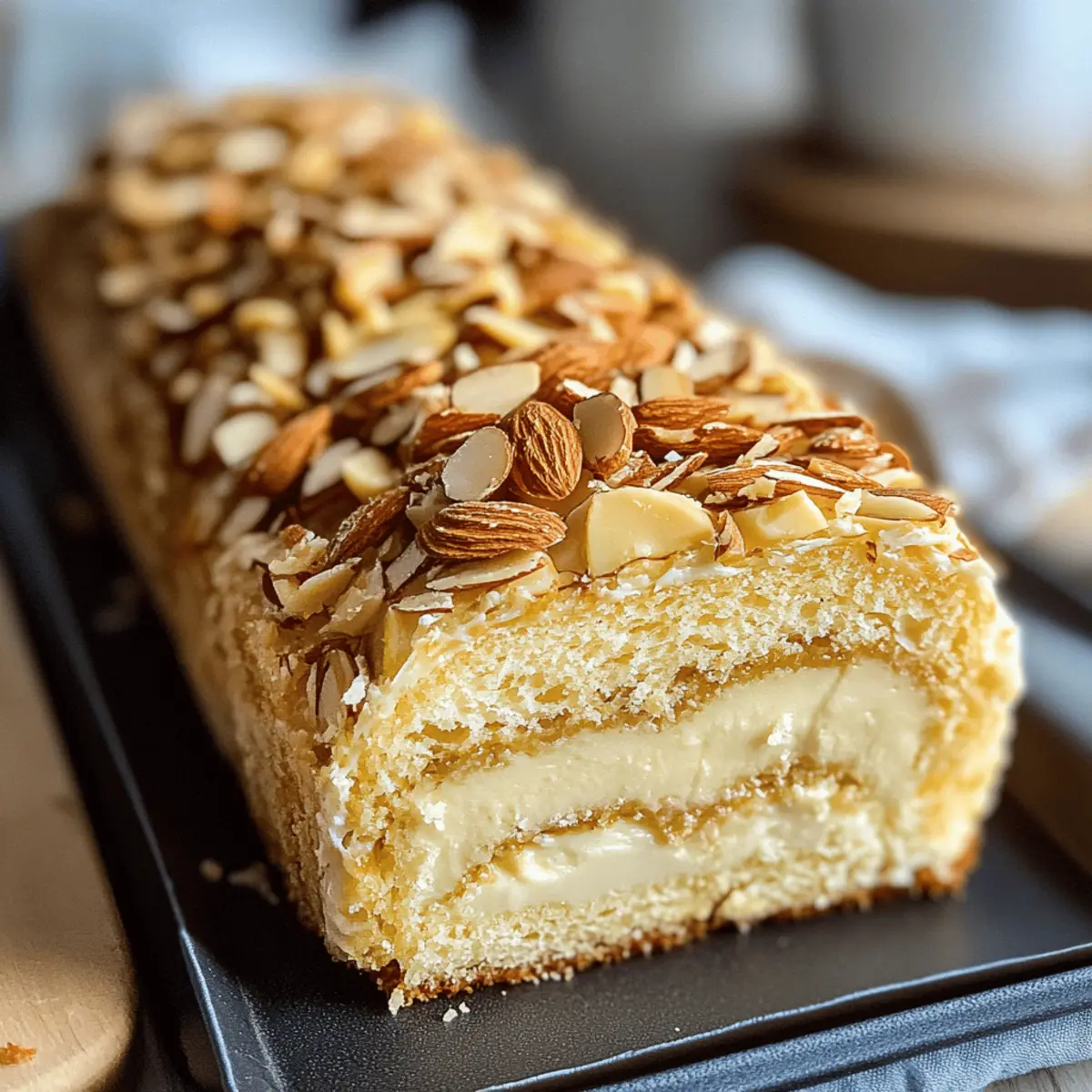 Schneide die Enden der Rolle ab, um eine schöne Form zu erhalten, und trage die restliche Füllung auf die Außenseite auf. Drücke das abgekühlte Mandel-Topping sanft auf die Creme, um ein ansprechendes Erscheinungsbild zu schaffen.