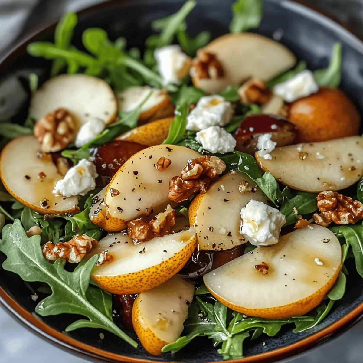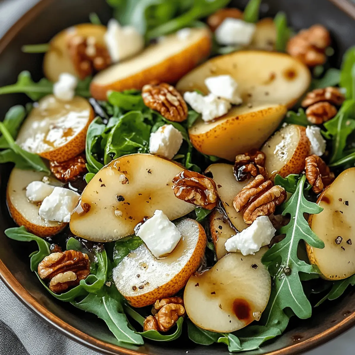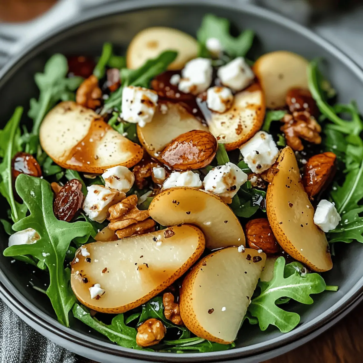 Hast du schon einmal die frische Brise des Mittelmeers auf deinem Teller gespürt? Unser Schneller Birnensalat mit Balsamico-Dressing bringt genau dieses Gefühl direkt in deine Küche! In nur 10 Minuten zubereitet, vereint dieser Salat süße, reife Birnen, würzigen Rucola und cremigen Feta-Käse – perfekt für alle, die ehrliche Geschmackserlebnisse lieben. Egal, ob du Gäste bei einer Sommerparty beeindrucken oder einfach nur ein gesundes, aber unkompliziertes Gericht für dich selbst zubereiten möchtest, dieser Salat ist eine echte Bereicherung. Die Kombination aus knackigen Walnüssen und dem aromatischen Balsamico-Dressing sorgt für einen unwiderstehlichen Genuss, der sowohl das Auge als auch den Gaumen erfreut. Bereit für ein einfaches Rezept, das nicht nur köstlich, sondern auch vielseitig ist? Lass uns gemeinsam dieses Geschmackserlebnis entdecken! Warum wird dieser Salat dein Favorit? Schnell und einfach: In nur 10 Minuten zubereitet, ist dieser Birnensalat mit Balsamico-Dressing die perfekte Lösung für eilige Tage oder überraschende Gäste. Vielseitig einsetzbar: Er passt zu jedem Anlass – als erfrischende Beilage zu Gegrilltem oder als leichtes Hauptgericht. Gesund und köstlich: Mit gesunden Fetten aus Walnüssen und frischem Gemüse bietet er eine nährstoffreiche Option für deine Ernährung. Ein wahrer Blickfang: Die farbenfrohe Präsentation aus süßen Birnen und knackigem Rucola wird deine Geschmacksknospen erfreuen und bleibt unvergesslich. Für individuelle Differenzierung: Experimentiere mit verschiedenen Käsesorten oder Nüssen, um den Salat ganz nach deinem Geschmack anzupassen – noch mehr Ideen findest du in unseren Variationsideen! Birnensalat mit Balsamico-Dressing Zutaten • Lass uns die köstlichen Zutaten für unseren Birnensalat mit Balsamico-Dressing entdecken! Für den Salat Birnen – süße, reife Birnen sorgen für die natürliche Süße des Salats. Hinweis: Verwenden Sie gut gereifte Birnen für den besten Geschmack. Rucola – würziger Rucola bildet die Basis des Salats und bringt Frische. Hinweis: Er kann durch Spinat oder Mischsalat ersetzt werden. Walnüsse – grob gehackte Walnüsse fügen eine knusprige Textur hinzu. Hinweis: Geröstete Sonnenblumenkerne sind eine gute glutenfreie Alternative. Feta-Käse – zerbröselter Feta liefert eine salzige, cremige Note. Hinweis: Ziegenkäse kann ebenfalls verwendet werden für einen intensiveren Geschmack. Für das Dressing Balsamico-Essig – erzeugt die nötige Säure und verleiht dem Dressing Tiefe. Olivenöl – hochwertiges Olivenöl sorgt für Geschmeidigkeit im Dressing. Honig – selbst kleine Mengen bieten eine süße Harmonie im Dressing. Salz und Pfeffer – zum Abschmecken, wichtig für die Balance der Aromen. Schritt-für-Schritt-Anleitung für Birnensalat mit Balsamico-Dressing Step 1: Rucola vorbereiten Verteile eine großzügige Menge frischen Rucola gleichmäßig in einer großen Schüssel. Achte darauf, dass die Blätter frei von welken Stellen sind. Dieser würzige Salat wird die Basis für deinen Birnensalat mit Balsamico-Dressing bilden und ihm eine erfrischende Note verleihen. Step 2: Birnen schneiden Wasche zwei reife Birnen gründlich und schneide sie in dünne, gleichmäßige Scheiben. Diese sollten hübsch über den Rucola drapiert werden. Je nach Geschmack können die Birnen auch in kleine Stücke geschnitten werden. Achte darauf, dass die Birnen fest und saftig sind, um den Salat geschmacklich zu bereichern. Step 3: Nüsse und Feta hinzufügen Nimm eine Handvoll Walnüsse und hacke sie grob. Streue die Walnüsse gleichmäßig über den Salat, gefolgt von zerbröseltem Feta-Käse. Diese beiden Zutaten verleihen dem Birnensalat mit Balsamico-Dressing eine wunderbare Textur und eine herzhafte Note. Step 4: Dressing zubereiten In einer kleinen Schüssel vermenge 3 Esslöffel Balsamico-Essig, 4 Esslöffel hochwertiges Olivenöl, 1 Teelöffel Honig, sowie eine Prise Salz und frisch gemahlenen Pfeffer. Verwende einen Schneebesen, um die Zutaten gut zu emulgieren, sodass das Dressing schön cremig wird. Step 5: Salat anrichten Gieße das Balsamico-Dressing gleichmäßig über den Salat. Achte darauf, alles gut zu vermengen, ohne die zarten Zutaten zu zerdrücken. Der Birnensalat mit Balsamico-Dressing sollte nach dem Würzen gleichmäßig glasiert aussehen und verführerisch duften. Step 6: Servieren und genießen Serviere den Salat sofort auf schönen Tellern oder lasse ihn 15 Minuten im Kühlschrank ziehen, damit die Aromen sich intensivieren können. Dieser frische Birnensalat ist perfekt als Beilage oder leichtes Hauptgericht und wird deine Gäste begeistern. Lagerungstipps für Birnensalat mit Balsamico-Dressing Kühlschrank: Lagere den Salat in einem luftdichten Behälter für bis zu 2 Tage. Achte darauf, das Dressing getrennt aufzubewahren, um die Frische der Zutaten zu bewahren. Dressing: Bewahre das Balsamico-Dressing in einem separaten, gut verschlossenen Glasbehälter auf. Es bleibt bis zu einer Woche im Kühlschrank haltbar und kann vor dem Servieren leicht aufgeschüttelt werden. Raumtemperatur: Der Birnensalat mit Balsamico-Dressing sollte idealerweise sofort serviert werden, um die knackige Textur zu genießen. Vermeide die Lagerung bei Raumtemperatur, um die Frische zu gewährleisten. Wiederehitzen: Dieser Salat sollte nicht erhitzt werden, da die frischen Aromen beim Erhitzen verloren gehen können. Genieße ihn kalt oder bei Zimmertemperatur für das beste Geschmackserlebnis. Expert Tips für Birnensalat mit Balsamico-Dressing Einfache Vorbereitung: Bereite alle Zutaten im Voraus vor, um den Prozess zu beschleunigen und den Salat in weniger als 10 Minuten zusammenzustellen. Frische Zutaten: Verwende frisch geernteten Rucola und gut gereifte Birnen, um die Aromen des Birnensalats mit Balsamico-Dressing zu intensivieren. Käse-Alternativen: Experimentiere mit verschiedenen Käsesorten wie Ziegenkäse oder Brie, um deinem Salat eine persönliche Note 