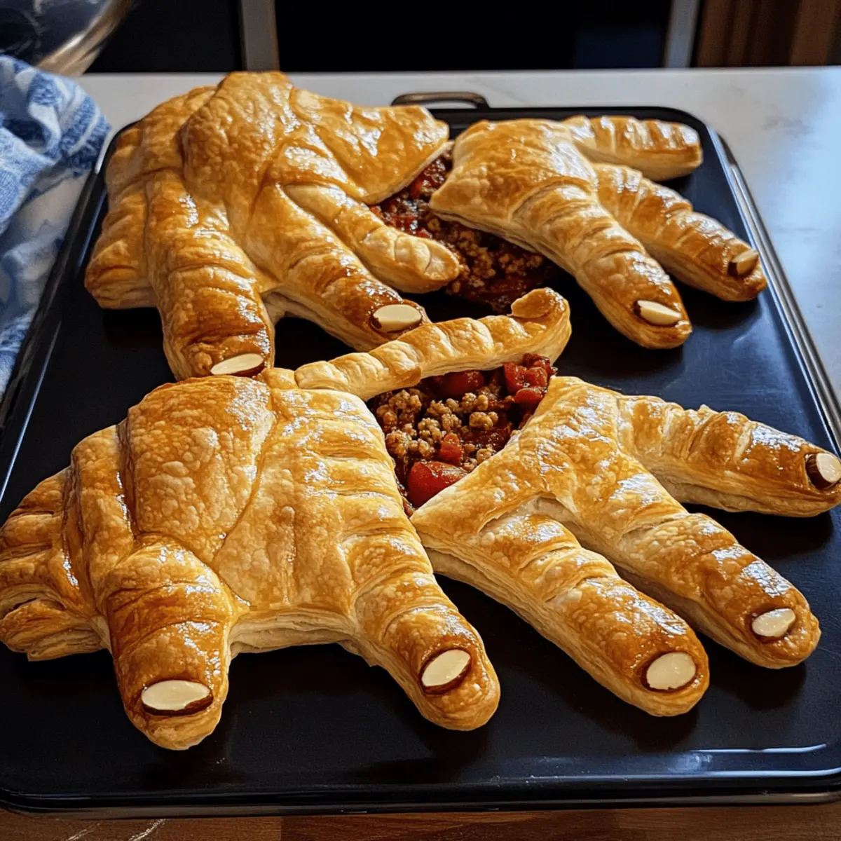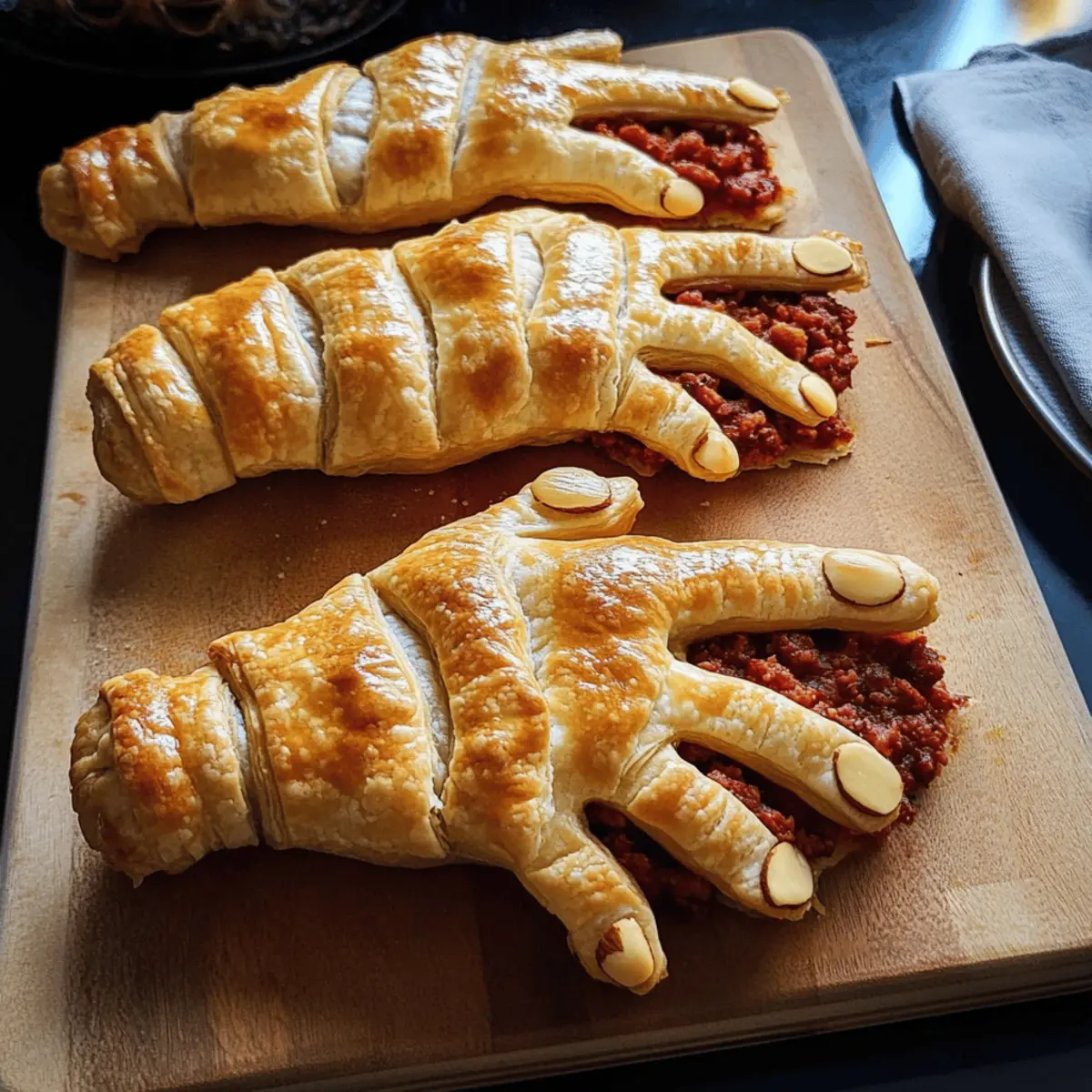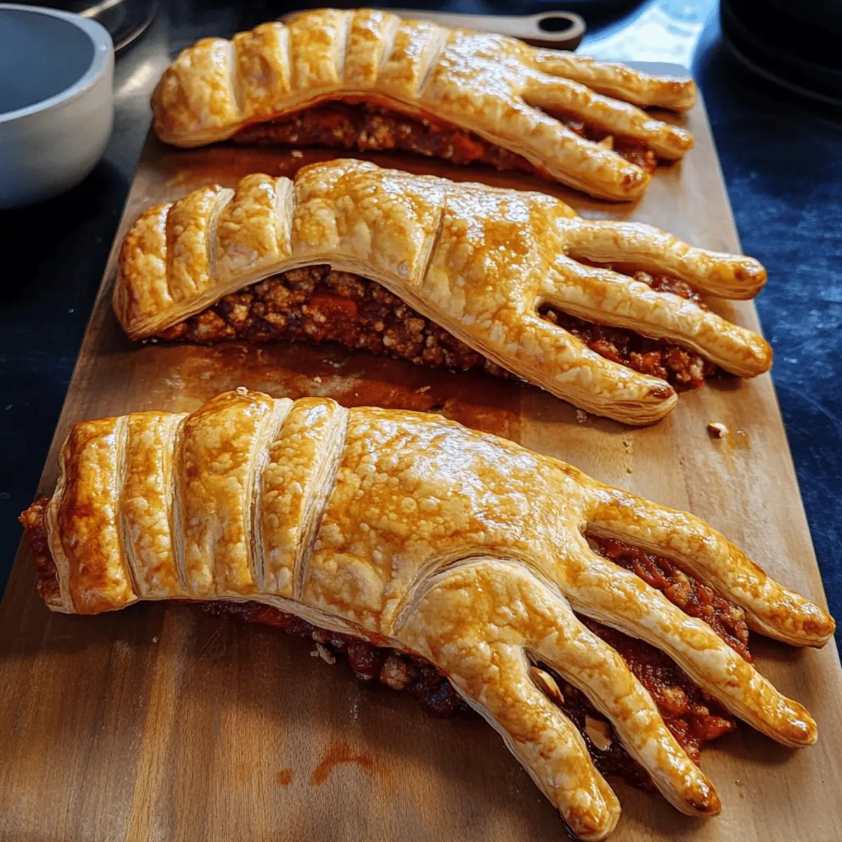 Die blätterteigenden Kreationen, die wir heute zaubern, sind nicht nur schmackhaft, sondern auch ein echter Hingucker auf jeder Halloween-Party! Diese Blätterteighände mit Tomaten-Fleischfüllung sind eine köstliche Mischung aus knusprigem Blätterteig, herzhaftem Fleisch und saftigen Tomaten, die den Gaumen erfreut und die Augen zum Leuchten bringt. Perfekt zuzubereiten und eine tolle Möglichkeit, den Gästen schmackhafte Halloweensnacks zu bieten, die auch noch schnell in der Küche gemacht sind. Du wirst begeistert sein, wie einfach es ist, diese gruseligen Leckerbissen zu formen – und sie werden garantiert für Gesprächsstoff sorgen! Bist du bereit, dein Festmahl auf ein neues Niveau zu heben? Warum wirst du dieses Rezept lieben? Einfachheit: Der Zubereitungsprozess ist unkompliziert und benötigt nur grundlegende Kochkünste, sodass auch Anfänger schnell Erfolg haben. Würzige Aromen: Mit einer herzhaften Mischung aus Fleisch und Tomaten ist jede Bissen ein Geschmackserlebnis, das die Gäste begeistern wird. Lecker und kreativ: Die Gestaltung der Blätterteighände lässt dir viel Raum für kreative Anpassungen – füge zum Beispiel verschiedene Füllungen hinzu, wie in unserem Rezept für Käse und Spinatfüllung. Perfekte Party-Snacks: Diese gruseligen Leckerbissen sind ideal für deine Halloween-Feier und werden sicher zum Gesprächsthema! Zeitersparnis: Die Zubereitungszeit ist kurz, sodass du mehr Zeit für das Gesellige hast und weniger Stress in der Küche. Visuelle Attraktivität: Diese knusprigen Hände sind nicht nur lecker, sondern auch ein echter Hingucker auf jedem Buffet! Blätterteig Hände mit Tomaten-Fleischfüllung Zutaten Hinweis: Diese Zutaten machen die perfekten Blätterteighände für dein nächstes Halloween-Fest! Für die Füllung Faschiertes (Ground Meat) – Hauptproteinquelle für eine herzhafte Füllung; kann durch pflanzliche Crumbles ersetzt werden für eine vegetarische Variante. Gewürfelte Tomaten (Diced Tomatoes) – Stellen die Feuchtigkeit der Füllung sicher; frische oder Dosentomaten sind ideal, sonnengetrocknete Tomaten intensivieren den Geschmack. Knoblauch (Garlic) – Hebt den Geschmack hervor; frischer Knoblauch ist am besten, aber gehackter Knoblauch funktioniert auch. Zwiebel (Onion) – Fügt Süße und Tiefe hinzu; Schalotten können für einen milderen Geschmack verwendet werden. Olivenöl (Olive Oil) – Für das Anbraten der Füllung, verleiht eine angenehme Reichhaltigkeit; Butter kann für mehr Geschmack verwendet werden. Für den Teig Blätterteig (Puff Pastry) – Die Basis des Rezepts für eine knusprige Textur; Dinkel-Blätterteig bietet eine kräftigere, vollwertige Option. Ei (Egg) – Für den Pinsel auf dem Teig, um eine goldene Farbe zu erzielen; kann für vegane Varianten weggelassen oder mit Mandelmilch ersetzt werden. Für die Dekoration Mandelhälften (Almond Halves) – Optional, können als fingernägelartige Dekoration verwendet werden, um den gruseligen Effekt zu verstärken. Schritt-für-Schritt-Anleitung für Blätterteig Hände mit Tomaten-Fleischfüllung Step 1: Füllung vorbereiten Erhitze in einer Pfanne bei mittlerer Hitze etwas Olivenöl und füge fein gehackten Knoblauch sowie Zwiebelwürfel hinzu. Sautiere sie für 3-4 Minuten, bis sie goldbraun und duftend sind. Gib dann das Faschierte dazu und brate es unter gelegentlichem Rühren an, bis es gleichmäßig gebräunt ist. Anschließend die gewürfelten Tomaten und Gewürze hinzufügen und die Mischung für etwa 20 Minuten bei schwacher Hitze köcheln lassen, bis sie gut durchgezogen ist. Step 2: Blätterteig vorbereiten Heize den Ofen auf 200°C vor und lege ein Backblech mit Backpapier aus. Rolle den Blätterteig auf einer leicht bemehlten Oberfläche gemäß den Anweisungen auf der Verpackung aus. Verwende eine Schablone, um die Form von Händen auszuschneiden – du solltest zwei pro Portion haben. Achte darauf, dass der Teig gleichmäßig dick ist. Step 3: Hände zusammensetzen Lege zwei ausgeschnittene Blätterteighände auf das Backblech. Verteile die herzhafte Tomaten-Fleischfüllung in der Mitte jeder Hand, dabei einen 5 mm breiten Rand freilassen. Bestreiche die Ränder mit dem verquirlten Ei, um sicherzustellen, dass die Füllung beim Backen gut bleibt. Step 4: Oben auflegen und verschließen Setze die zweiten Teighand-Ausschnitte vorsichtig als Deckel auf die Füllung. Drücke die Ränder mit einer Gabel fest zusammen, um sicherzustellen, dass sie gut verschlossen sind. Bestreiche die Oberseiten mit dem verquirlten Ei für eine goldene Farbe und platziere die Mandelhälften geschickt als „Fingernägel“, um den gruseligen Effekt zu verstärken. Step 5: Backen Schiebe das Backblech in den vorgeheizten Ofen und backe die Blätterteighände für etwa 20 Minuten. Achte darauf, dass sie schön goldbraun sind und der Blätterteig knusprig aussieht. Nach dem Backen aus dem Ofen nehmen und einige Minuten auskühlen lassen, bevor du die Blätterteighände servierst. Blätterteig Hände mit Tomaten-Fleischfüllung Variationen Experimentiere mit diesen kreativen Anpassungen, um deine Blätterteighände ganz nach deinem Geschmack zu gestalten! Vegetarisch: Ersetze das Faschierte durch pflanzliche Crumbles oder Linsen für eine fleischlose Variante. Diese Füllung behält weiterhin eine herzhafte Note und ist dabei gesund. Würzige Note: Füge eine Prise Cayennepfeffer oder gehackte Jalapeños zur Füllung hinzu, um einen feurigen Kick zu erhalten. Der zusätzliche Schärfe lässt die Gaumen richtig aufblühen! Käse-Fans: Streue geriebenen Käse (z. B. Mozzarella oder Cheddar) in die Füllung, um eine cremige Konsistenz zu erreichen, die die Geschmacksknospen entzückt. Ein echter Genuss! Vollkorn-Teig: Nutze Dinkel-Blätterteig statt herkömmlichem Blätterteig für eine vollwertigere Option, die etwas nussiger im Geschmack ist. So wird es noch gesünder! Getrocknete Tomaten: Verwandle deine Füllung mit sonnengetrockneten Tomaten für einen