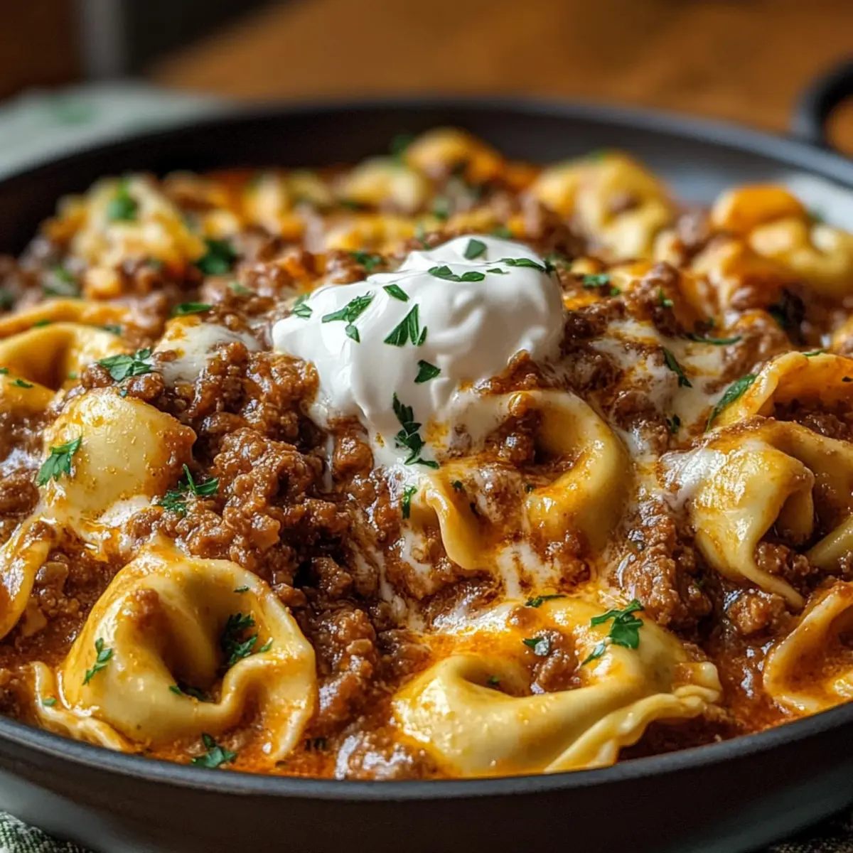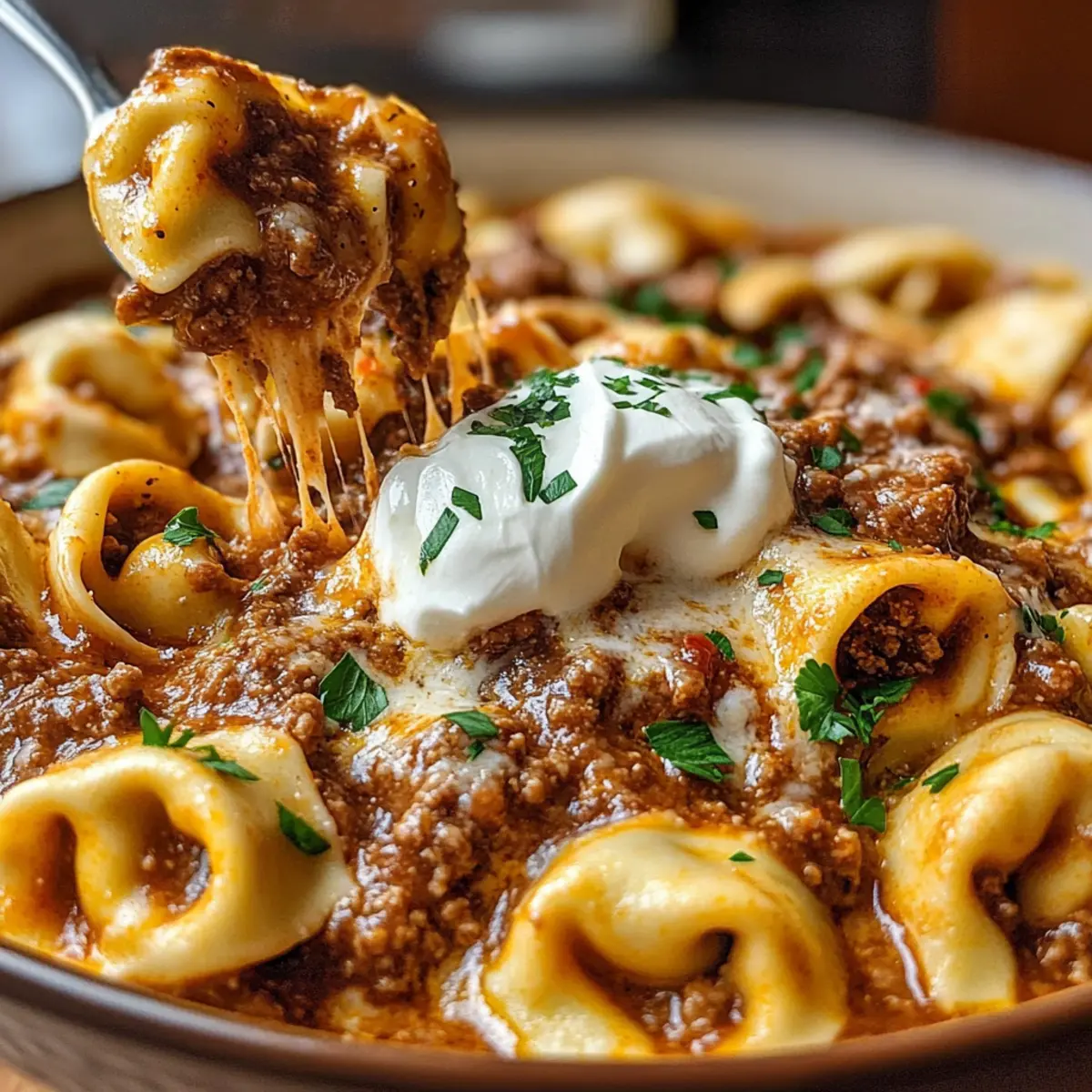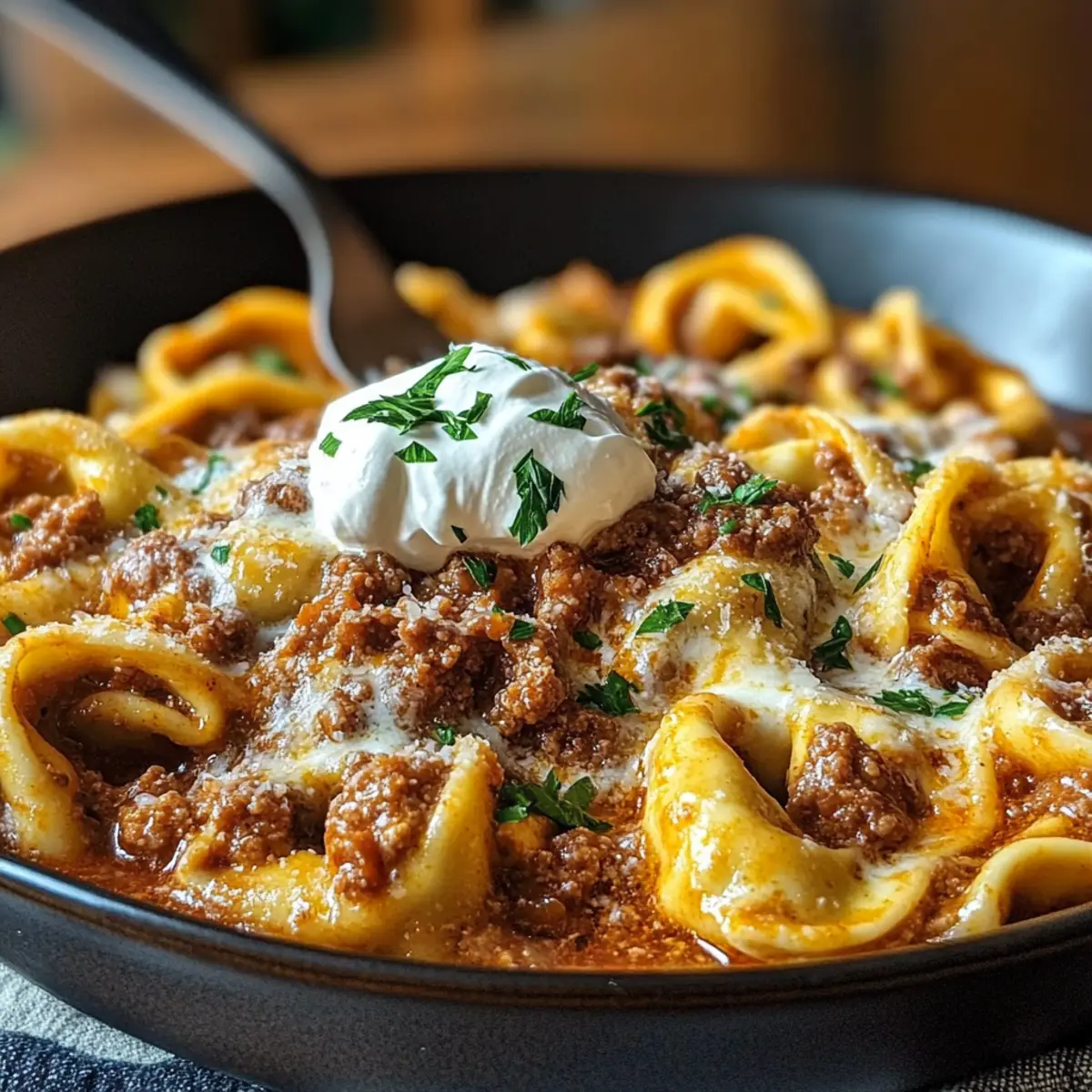 Für viele von uns sind schnelle, schmackhafte Gerichte die Rettung nach einem langen Arbeitstag. Hier kommt mein Rezept für Blitz-Tortellini mit Hackfleischsauce, das nicht nur in unter 30 Minuten auf deinem Tisch steht, sondern auch den Gaumen verzaubert. Diese Kombination aus zarten Tortellini und einer herzhaften, aromatischen Sauce ist die perfekte Antwort auf das Bedürfnis nach etwas Hausgebackenem, wenn die Zeit drängt. Darüber hinaus kannst du die Füllung der Tortellini ganz nach deinem Geschmack anpassen – von cremigem Ricotta über würzigen Spinat bis hin zu herzhaftem Fleisch oder Pilzen. So wird jede Portion zum Genuss! Bist du bereit, deine Küche in ein italienisches Restaurant zu verwandeln? Warum wirst du dieses Rezept lieben? Schnelligkeit und Einfachheit: In nur 30 Minuten zauberst du ein köstliches Gericht, das den Stress des Alltags vergessen lässt. Vielfalt der Füllungen: Du kannst die Tortellini nach deinem Geschmack füllen – von cremigem Ricotta bis zu würzigem Spinat. Aromatische Sauce: Die reichhaltige Hackfleischsauce begeistert mit Geschmackstiefe dank frischer Zutaten und italienischen Kräutern. Perfekte Konsistenz: Zarte Tortellini, umhüllt von einer dicken, käsigen Sauce, machen dieses Gericht zum echten Komfortessen. Verführerischer Käse: Geschmolzener Käse rundet das Ganze ab und sorgt für eine köstliche Cremigkeit. Wenn du mehr über die besten Käsevarianten erfahren möchtest, schau dir unseren Artikel zu Käse für italienische Gerichte an! Blitz-Tortellini Zutaten Für die Sauce • 500 g Rinderhackfleisch – Hauptproteinquelle, die reichhaltigen Geschmack liefert. Könnte auch durch vegetarisches Hackfleisch ersetzt werden. • 1 Zwiebel, fein gewürfelt – Fügt grundlegende Süße und Tiefe hinzu. Alternativ können Schalotten oder Lauch verwendet werden. • 2 Knoblauchzehen, fein gehackt – Verstärkt die Geschmacksvielfalt; essenziell für herzhafte Gerichte. Knoblauchpulver ist eine schnelle Alternative. • 800 g passierte Tomaten oder gehackte Tomaten aus der Dose – Basis der Sauce, die Säure und Süße bietet. Frische Tomaten in der Saison sorgen für ein anderes Geschmackserlebnis. • 200 ml Gemüsebrühe – Sorgt für Tiefe und Feuchtigkeit in der Sauce. Hühner- oder Rinderbrühe kann für zusätzlichen Reichtum verwendet werden. • 1 Esslöffel Olivenöl – Essentiell für das Kochen und den Geschmack. Jede neutrale Ölvariante kann genutzt werden. • 1 Teelöffel getrockneter Oregano – Trägt klassischen italienischen Kräutergeschmack bei. Frischer Oregano bringt mehr Frische ins Gericht. • 1/2 Teelöffel getrockneter Basilikum – Ergänzt die Sauce mit einer süßen und aromatischen Note. Frisches Basilikum ist eine hervorragende Ergänzung, wenn man es am Ende hinzufügt. • Salz und frisch gemahlener Pfeffer – Grundgewürze nach Geschmack anpassen. Für die Tortellini und Garnitur • 500 g frische Tortellini (aus dem Kühlregal) – Sorgen für Schnelligkeit und einfaches Kochen. Gefrorene Tortellini können ebenfalls verwendet werden, was die Garzeit verlängert. • 150 g geriebener Käse (z.B. Mozzarella oder Gouda) – Sorgt für Cremigkeit und verbindet das Gericht. Wähle Käse, der gut schmilzt. • 100 g Schmand oder Sauerrahm – Fügt Cremigkeit und eine leicht säuerliche Note hinzu. Greek-Yogurt ist eine leichtere Alternative. • Frische Petersilie, gehackt, zum Garnieren – Bringt Frische und visuelle Anziehungskraft. Andere Kräuter wie Schnittlauch können ebenfalls genutzt werden. Schritt-für-Schritt-Anleitung für Blitz-Tortellini mit Hackfleischsauce Step 1: Rinderhackfleisch anbraten Erhitze einen Esslöffel Olivenöl in einer großen Pfanne bei mittlerer Hitze. Füge das Rinderhackfleisch hinzu und drücke es mit einem Spatel flach, um eine schöne Kruste zu entwickeln. Lasse das Fleisch 5-7 Minuten braten, ohne es zu rühren, bis es gut gebräunt ist. So wird der Geschmack intensiver und die Umgebung wird von einem köstlichen Aroma erfüllt. Step 2: Zwiebel und Knoblauch hinzufügen Sobald das Fleisch schön gebräunt ist, füge die fein gewürfelte Zwiebel und den gehackten Knoblauch hinzu. Sauté die Mischung weitere 3-4 Minuten, bis die Zwiebel weich und durchsichtig ist. Dabei die Hitze nicht zu hoch einstellen, um ein Anbrennen zu vermeiden. Die Zwiebel wird deinem Blitz-Tortellini mit Hackfleischsauce eine süße Note verleihen. Step 3: Pfanne ablöschen Gieße die Gemüsebrühe über die angebratenen Zutaten in der Pfanne und kratzen mit einem Holzlöffel die angebratenen Reste vom Boden ab. Lasse die Mischung zum Kochen bringen und dabei gelegentlich umrühren, um die Aromen zu vereinen und die Konsistenz zu verbessern. Die Brühe hilft, die Sauce zu beleben und sorgt für zusätzlichen Geschmack. Step 4: Sauce köcheln lassen Füge nun die passierten Tomaten, den Oregano und den Basilikum zur Pfanne hinzu und rühre alles gut durch. Lass die Sauce 10-15 Minuten bei schwacher Hitze simmer, damit sich die Aromen entfalten können. Überprüfe zwischendurch, ob die Sauce eventuell nach Salz und Pfeffer verlangt – so wird die Hackfleischsauce für die Tortellini perfekt abgestimmt. Step 5: Tortellini kochen Bereite in der Zwischenzeit die frischen Tortellini gemäß der Verpackungsanweisung vor. Normalerweise dauerts 2-3 Minuten, bis sie al dente sind. Bringe dafür einen separaten Topf mit Salzwasser zum Kochen und füge die Tortellini hinzu. Anschließend siebe sie ab, aber behalte ein wenig vom Kochwasser, falls du die Sauce später auflockern möchtest. Step 6: Tortellini und Sauce kombinieren Gib die abgetropften Tortellini vorsichtig in die Pfanne mit der Hackfleischsauce und schwenke alles liebevoll, damit jedes Stück gleichmäßig mit der Sauce umhüllt ist. Achte darauf, dass die Tortellini nicht zerdrückt werden. Die Kombination aus der zarten Pasta und der herzhaften Sauce macht das Gericht besonders schmackhaft. Step 7: Käse schmelzen lassen Be