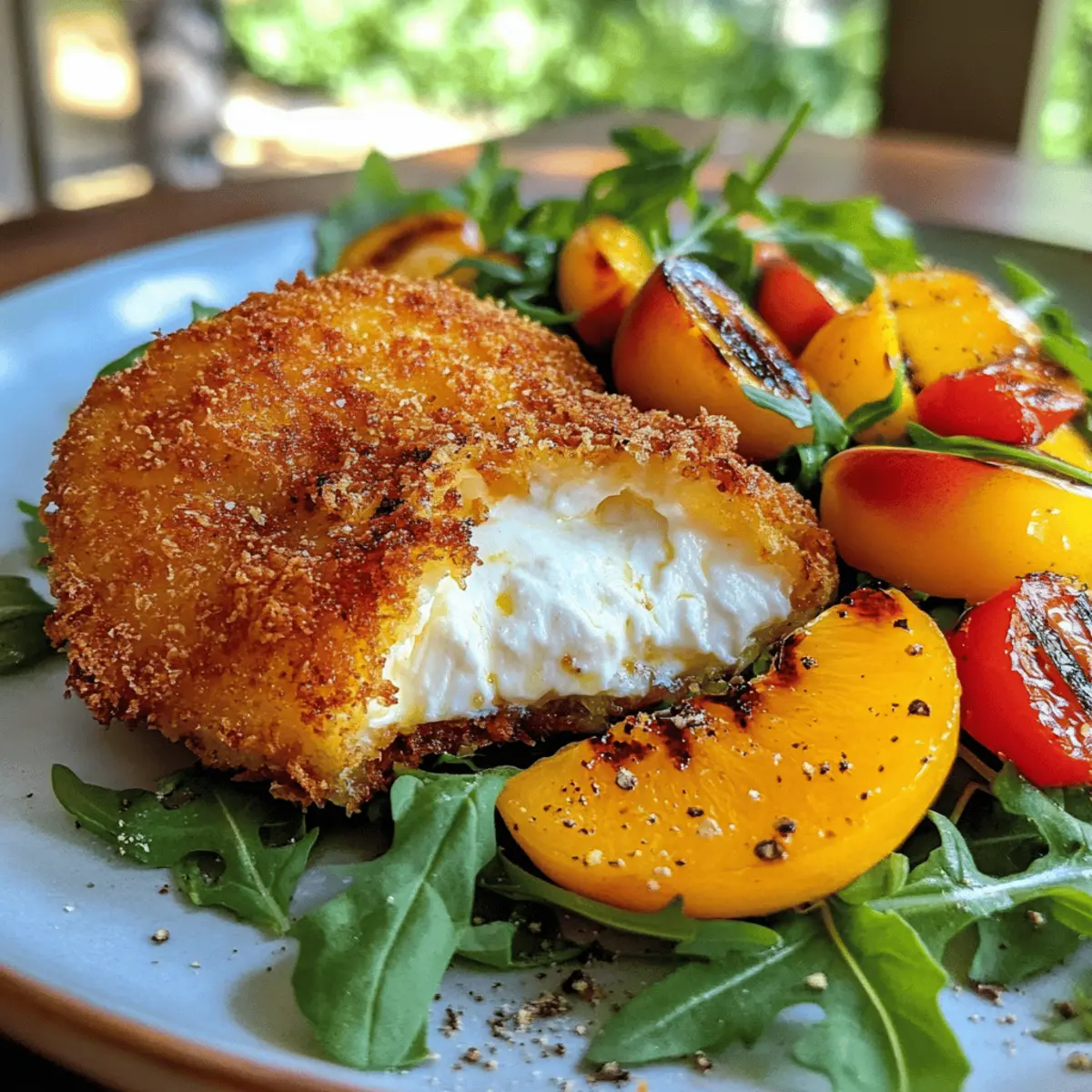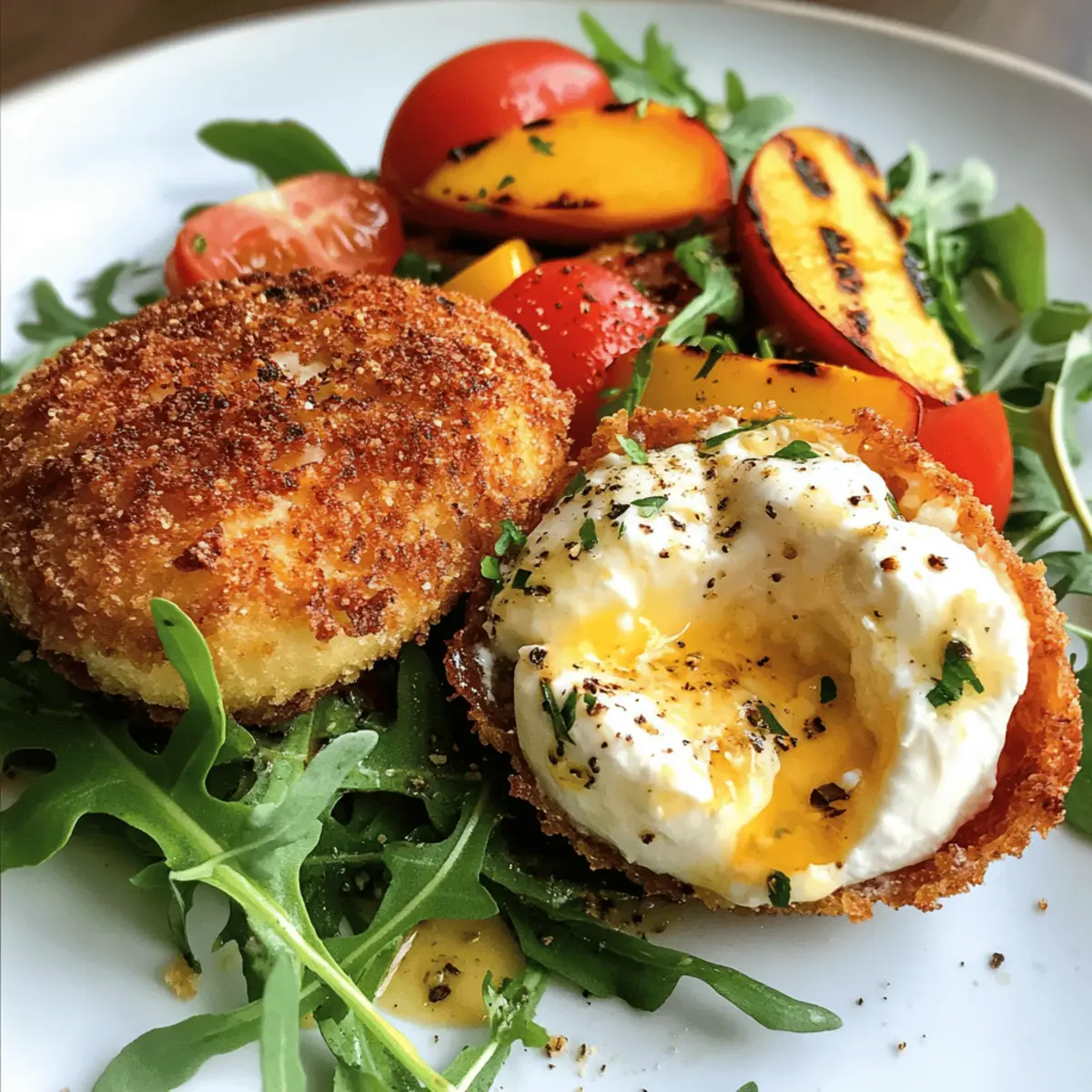 Wenn die ersten warmen Sonnenstrahlen den Frühling ankündigen, erwartet uns eine kulinarische Entdeckung: Frittierte Burrata mit Pfirsich-Tomatensalat. Die Kombination aus knusprig frittiertem Käse und dem süß-sauren Biss von frischen Pfirsichen und saftigen Tomaten ist ideal für erfrischende, leichte Mahlzeiten an heißen Tagen. Dieses Rezept ist nicht nur ein Genuss für das Auge, sondern sorgt auch für ein Gefühl von Sommer auf dem Teller. In nur wenigen Schritten bereitet ihr ein Gericht zu, das sowohl Zeit als auch Aufwand spart und sich perfekt für gesellige Abende eignet. Neugierig auf die Geheimnisse hinter dieser sommerlichen Gaumenfreude? Lass uns gemeinsam eintauchen! Warum solltest du dieses Rezept ausprobieren? Einzigartiger Genuss: Die Kombination aus knuspriger, frittierter Burrata und frisch, süß-sauerem Pfirsich-Tomatensalat sorgt für ein unvergessliches Geschmackserlebnis. Einfachheit: Nur wenige Schritte und einfache Zutaten, die meist schon in deiner Küche sind, machen diese Zubereitung zum Kinderspiel. Flexibel: Perfekt anpassbar mit saisonalen Zutaten – probiere die Variationen mit anderen Früchten oder Kräutern aus! Geselligkeit: Ideal für gesellige Abende und Grillpartys; dieses Gericht zieht alle Blicke auf sich und bringt Freude auf den Tisch. Wohlfühlfaktor: Leicht und dennoch befriedigend – das perfekte Rezept für warme Sommertage, das jeden begeistert. Burrata Fritti auf Tomaten-Pfirsich-Salat Zutaten • Hinweis: Entdecke die köstlichen Zutaten für unsere Burrata fritti auf Tomaten-Pfirsich-Salat, die dieses Gericht zu einem besonderen Erlebnis machen! Für den Salat Pfirsiche (Peaches) – Frische und natürliche Süße; ersetzen durch Nektarinen oder Aprikosen, wenn Pfirsiche nicht verfügbar sind. Tomaten (Mixed Tomatoes) – Bieten Frische und Saftigkeit; jede reife Tomatensorte kann verwendet werden. Rucola (Arugula) – Fügt eine pfeffrige Note und nährstoffreiche Greens hinzu; kann durch Spinat ersetzt werden. Pfirsichkonfitüre (Peach Jam) – Für süße Dressing-Note; andere Marmeladen wie Aprikose oder Himbeere sind auch gut geeignet. Für die Burrata Burrata (Fresh Cheese) – Der starre Bestandteil mit cremigem Kern; kann durch Mozzarella ersetzt werden. Parma-Schinken (Parma Ham) – Fügt eine salzige und umami Note hinzu; für eine vegetarische Variante weglassen oder durch Prosciutto ersetzen. Für die Panade Bruschetta-Chips – Fügt der Speise Crunch hinzu; jede Art von knusprigem Brot oder Croutons kann verwendet werden. Mehl (Flour) – Sorgt für einen gleichmäßigen Überzug der Burrata; kann bei Bedarf durch glutenfreies Mehl ersetzt werden. Eier (Eggs) – Bindet die Panier-Zutaten; eine vegane Alternative wäre Aquafaba. Für das Dressing Heller Balsamico-Essig (Light Balsamic Vinegar) – Fügt Säure zum Dressing hinzu; kann durch weißen Weinessig oder Apfelessig ersetzt werden. Olivenöl (Olive Oil) – Für das Dressing verwenden; Avocadoöl ist auch eine gute Alternative. Salz und Pfeffer (Salt and Pepper) – Für die Würze; an persönliche Vorlieben anpassen. Für das Frittieren Öl zum Frittieren (Oil for Frying) – Ein Öl mit hohem Rauchpunkt wählen, zum Beispiel Raps- oder Pflanzenöl. Mit diesen Zutaten zauberst du eine Burrata fritti auf Tomaten-Pfirsich-Salat, die nicht nur köstlich ist, sondern auch begeistert! Schritt-für-Schritt-Anleitung für Burrata Fritti auf Tomaten-Pfirsich-Salat Step 1: Pfirsiche marinieren Wasche die Pfirsiche gründlich und schneide sie in dünne Scheiben. Lege die geschnittenen Pfirsiche in eine Schüssel und mariniere sie etwa 15 Minuten lang in Prosecco. Achte darauf, dass die Scheiben gut befeuchtet sind, damit sie die Süße des Weins aufnehmen und ihre Frische bewahren. Step 2: Paniermischung vorbereiten Zerkleinere 100 g Bruschetta-Chips in einer Küchenmaschine oder mit einem Nudelholz, bis sie feine Krümel ergeben. Stelle drei separate Teller bereit: einen mit Mehl, einen mit geschlagenen Eiern und einen mit den pürierten Chips. Die verschiedenen Schichten sorgen für eine knusprige Kruste um die Burrata fritti. Step 3: Dressing zubereiten In einer kleinen Schüssel mische die Pfirsichkonfitüre, den hellen Balsamico-Essig und das Olivenöl. Füge einige Esslöffel von der Prosecco-Marinade hinzu und rühre gut um. Schmecke das Dressing mit Salz und Pfeffer ab, um den Geschmack zu verfeinern. Dieses Dressing wird das Aroma der Burrata fritti auf Tomaten-Pfirsich-Salat wunderbar ergänzen. Step 4: Salat vorbereiten Wasche die Tomaten und schneide sie in hübsche Scheiben oder Viertel. Lasse die marinierten Pfirsiche gut abtropfen und tupfe sie trocken. Erhitze eine Grillpfanne auf mittlerer Hitze und grille die Pfirsiche für etwa 2 Minuten pro Seite, bis sie leicht gebräunt sind. Die Kombination der gegrillten Früchte mit den frischen Tomaten schafft einen köstlichen Salat. Step 5: Burrata panieren Entferne die Burrata aus der Verpackung und tupfe sie vorsichtig mit einem Küchentuch trocken. Wende die Burrata zuerst im Mehl, dann in den geschlagenen Eiern und schließlich in den Bruschetta-Krümeln. Achte darauf, die Käse-Rundungen gründlich zu beschichten, damit die perfekte knusprige Kruste entsteht. Step 6: Burrata frittieren Erhitze in einem tiefen Topf genügend Öl (zum Beispiel Rapsöl) auf etwa 175 °C. Lege vorsichtig die panierten Burrata-Kugeln hinein und frittiere sie 6-8 Minuten lang, bis sie goldbraun und knusprig sind. Drehe sie gelegentlich, um ein gleichmäßiges Frittierergebnis zu erzielen. Lass die Burrata anschließend auf Küchenpapier abtropfen. Step 7: Salat anrichten Lege auf einer großen Servierplatte die geschnittenen Tomaten, den Rucola und die gegrillten Pfirsiche schön an. Kröne die Mischung mit den knusprigen Burrata-Kugeln und, falls gewünscht, mit den Parma-Schinken-Scheiben. Träufle das zuvor zubereitete Dressing großzügig über den Salat und genieße das farbenfrohe Gericht, das die Aromen zusammenbr