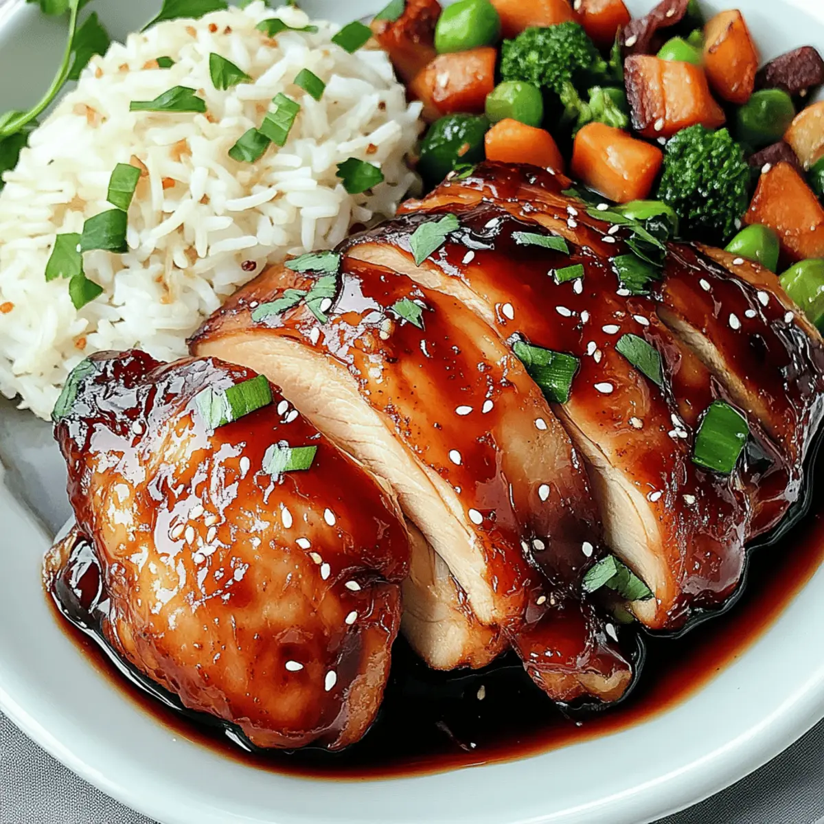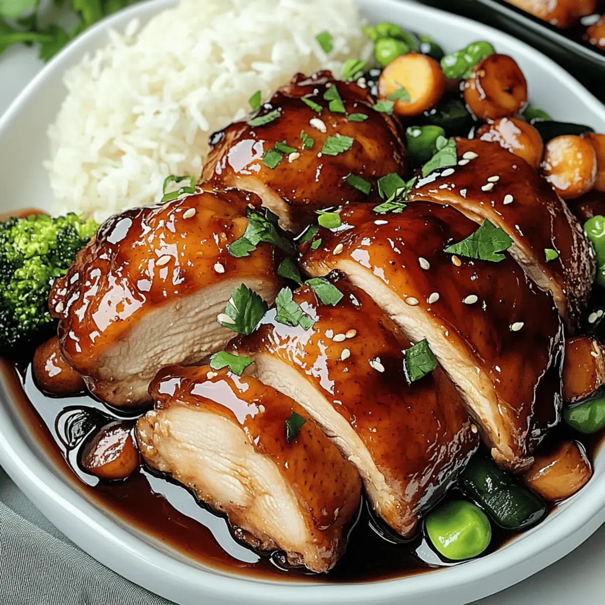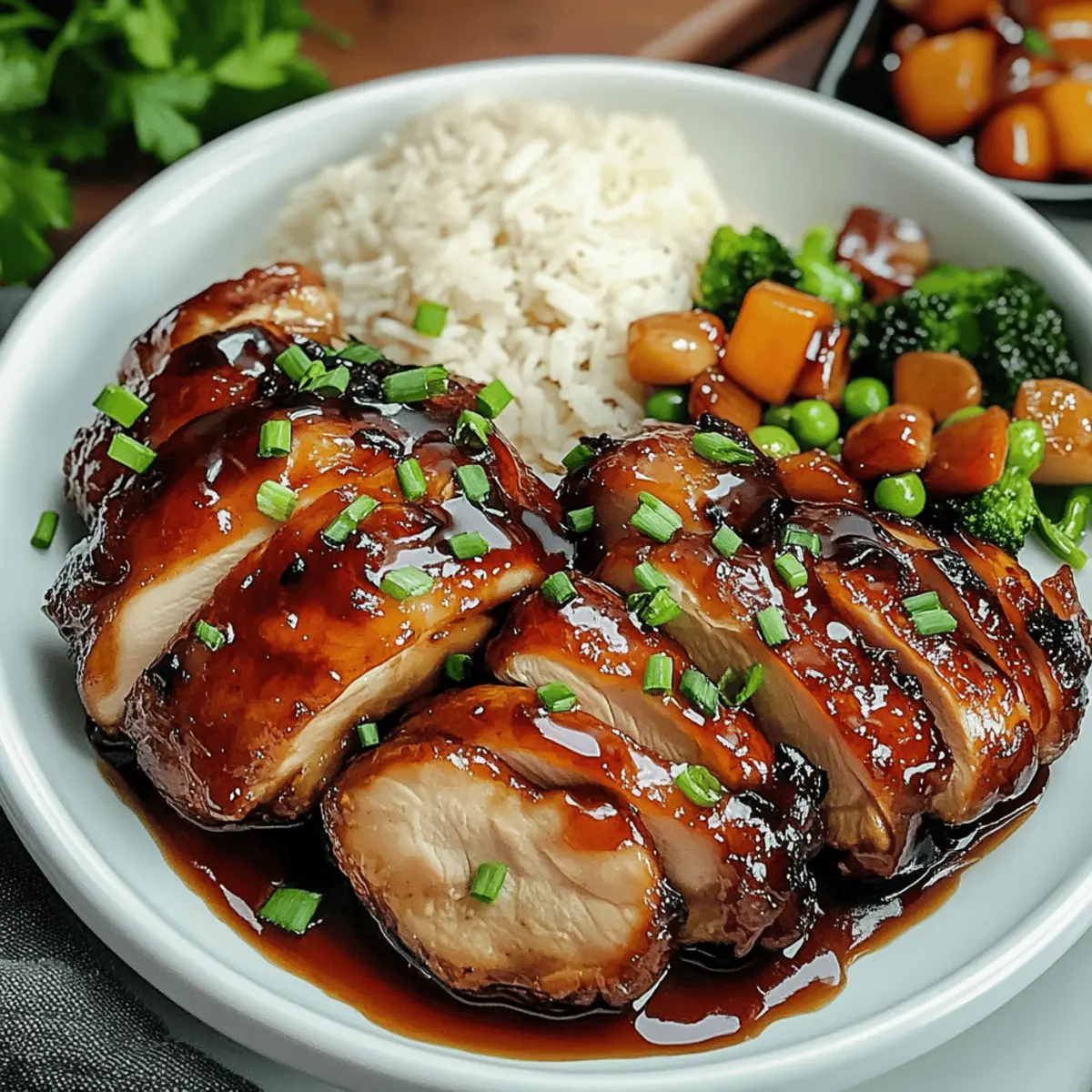 • Gedämpfter Jasminreis: Er bietet eine neutrale Basis, die die süß-herzhafte Marinade des Hähnchens aufnimmt und jede Gabel harmonisch verbindet.