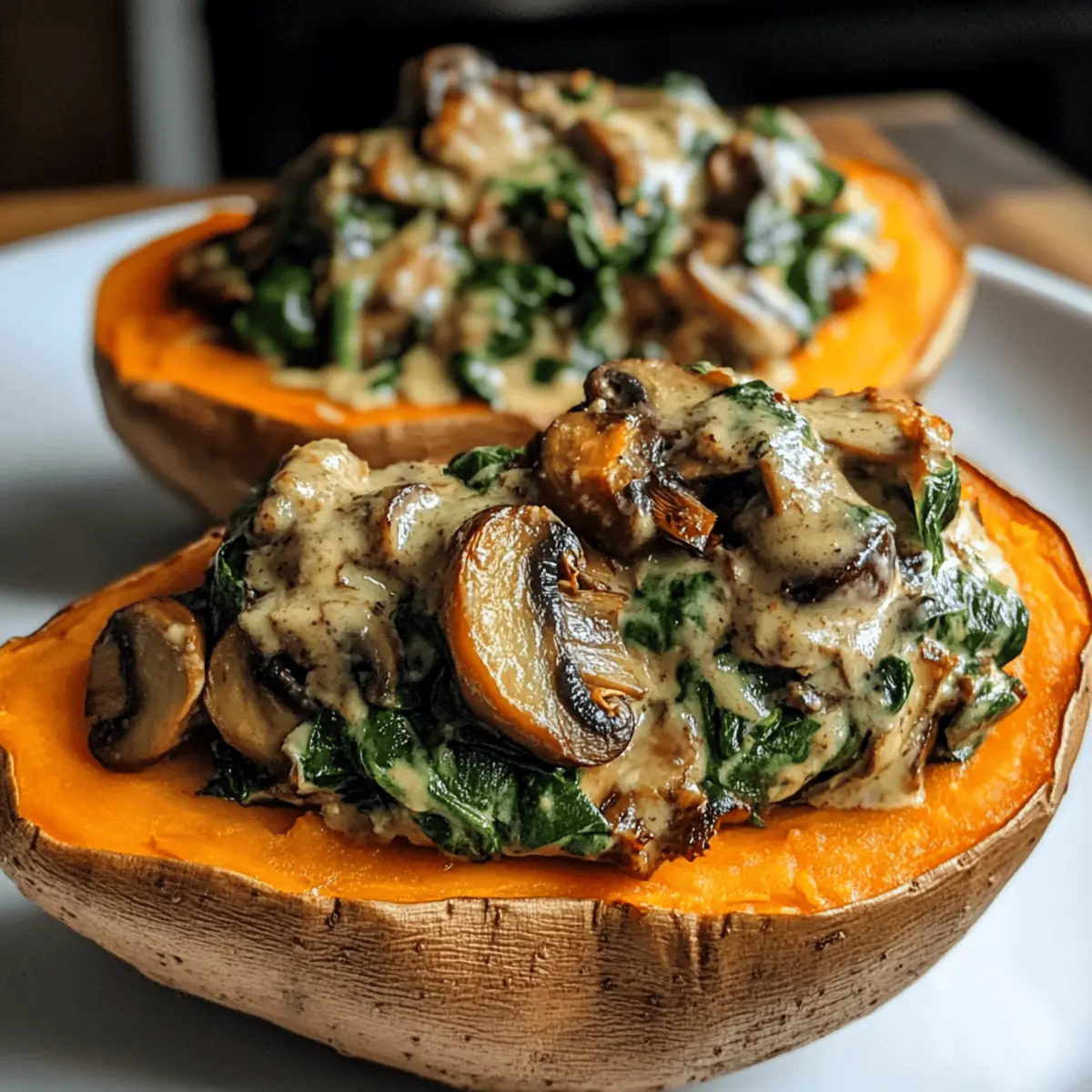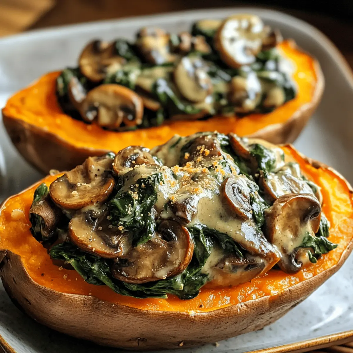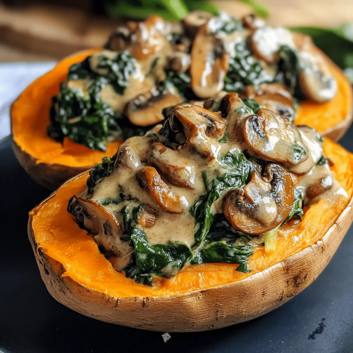 Creamy, stuffed sweet potatoes with mushrooms and spinach