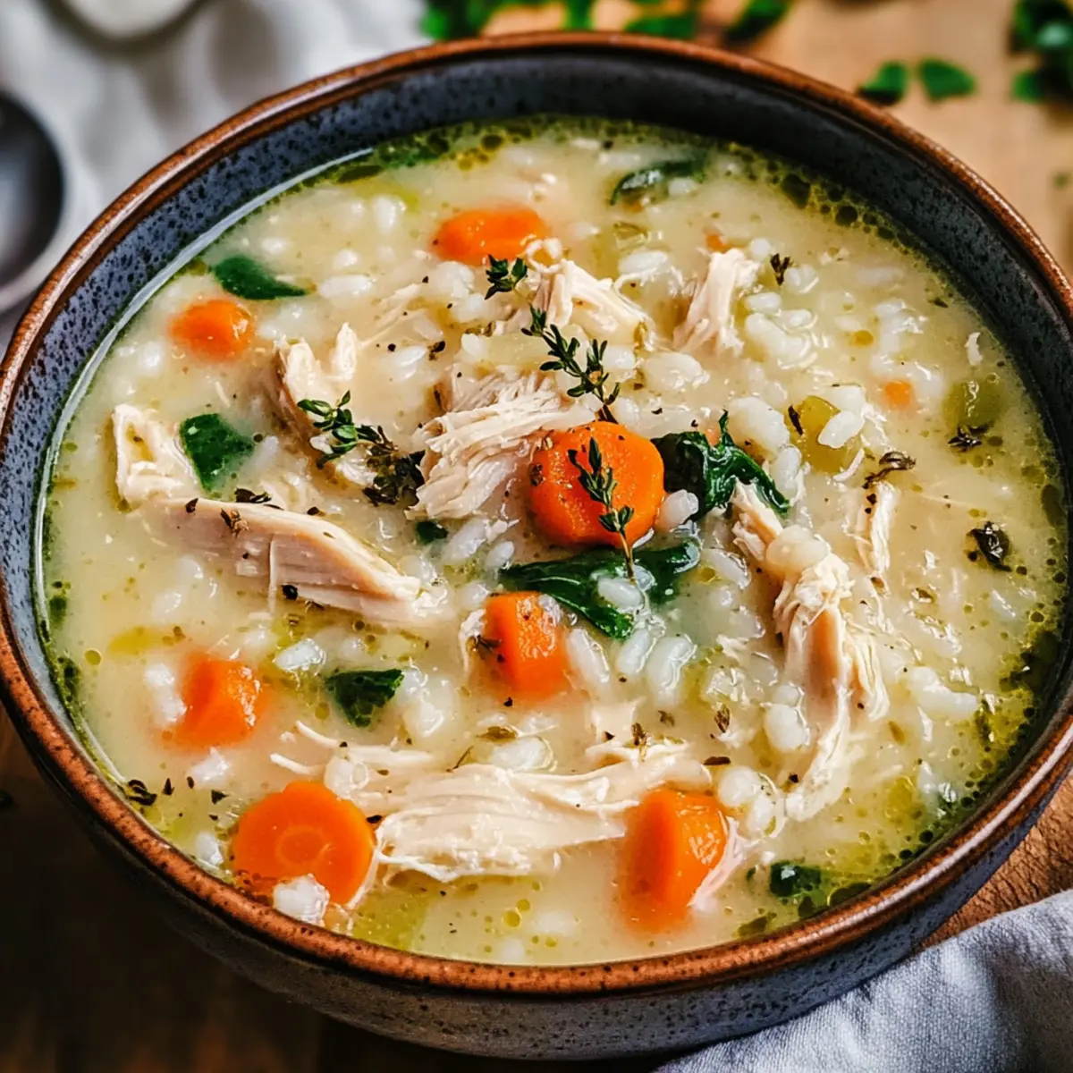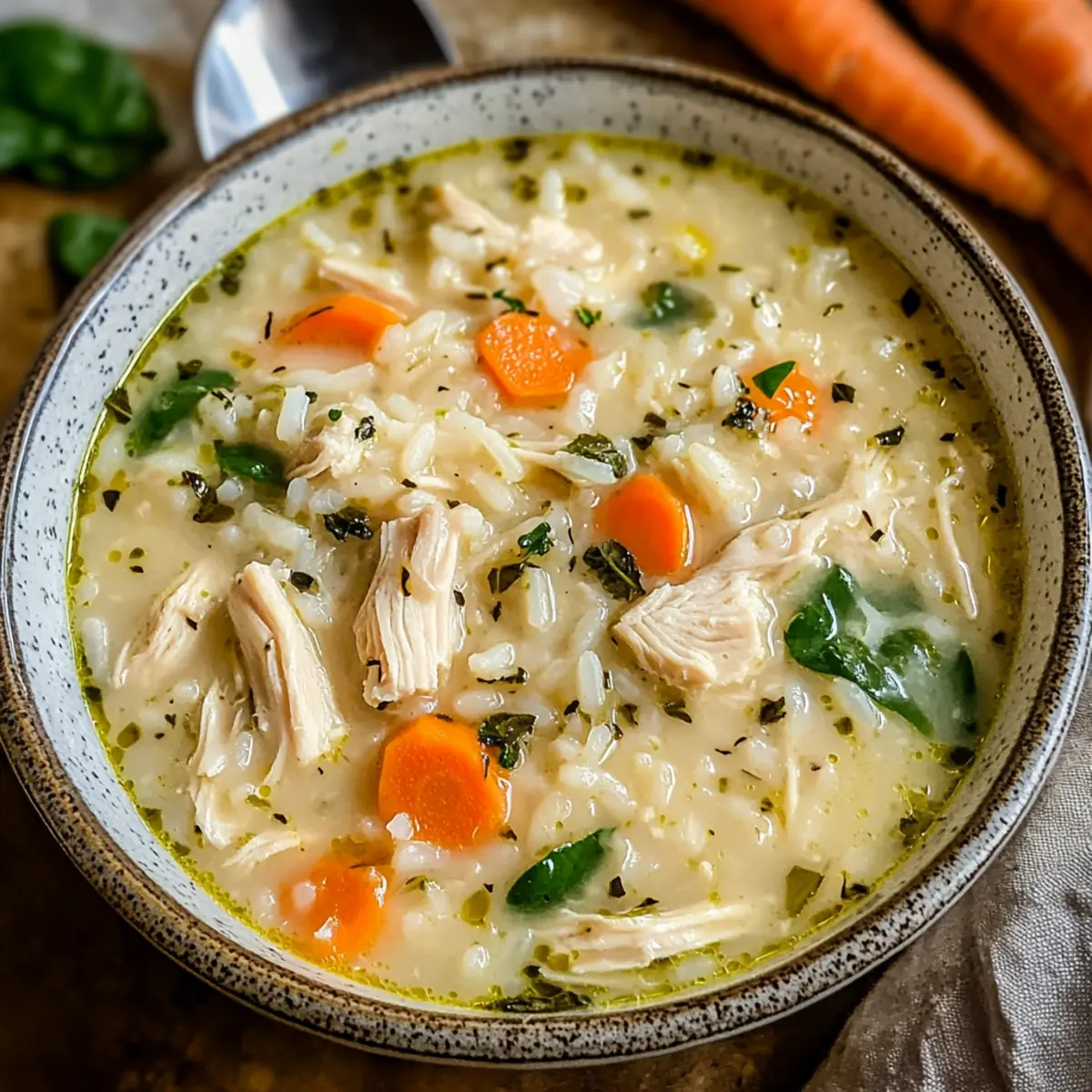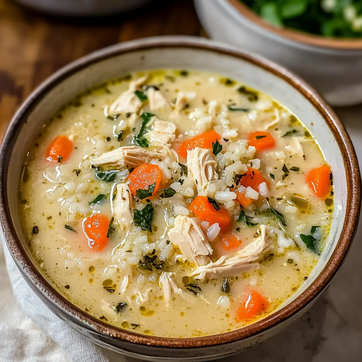 Wenn ich an gemütliche Abende zuhause denke, kommt mir sofort die cremige Hühner-Reis-Suppe in den Sinn. Diese herzhafte Mahlzeit ist mein persönlicher Geheimtipp für kalte Tage, an denen man sich nach etwas Tröstendem sehnt. Mit ihrer samtigen Brühe, zartem Hähnchen und sättigendem Reis bietet sie nicht nur eine köstliche Möglichkeit, den Hunger zu stillen, sondern ist auch schnell und einfach zuzubereiten. Was mir an dieser Suppe besonders gefällt, ist ihre Vielseitigkeit – du kannst die Zutaten nach Lust und Laune anpassen, sodass sie perfekt zu deinem Geschmack passt. Außerdem ist sie ein wahrer Publikumsliebling, der sowohl Familie als auch Freunde begeistert. Glaubst du, dass ein so einfaches Rezept solch große Freude bereiten kann? Lass uns gemeinsam in die Zubereitung eintauchen! Warum wirst du diese Suppe lieben? Einfachheit: Die Zubereitung ist unkompliziert und erfordert nur wenige Schritte, ideal für Kochanfänger und Profis gleichermaßen. Vielseitigkeit: Mit verschiedenen Zutaten kannst du die Suppe ganz nach deinem Geschmack anpassen – egal ob mit Quinoa oder saisonalem Gemüse, es gibt unzählige Möglichkeit. Reichhaltiger Geschmack: Die Kombination aus zartem Hähnchen und cremiger Brühe sorgt für ein Geschmackserlebnis, das sowohl Herz als auch Gaumen wärmt. Gesunde Wahl: Diese Suppe lässt sich leicht in eine gesunde Mahlzeit verwandeln und ist perfekt für ernährungsbewusste Genießer. Familienfreundlich: Ihre Mischung aus Aromen und Texturen macht sie zum perfekten Gericht, um die ganze Familie am Tisch zu versammeln, während du schnelle Abendessen zubereiten kannst. Zeitersparnis: Die Cremige Hühner-Reis-Suppe ist im Handumdrehen zubereitet und eignet sich hervorragend für hektische Wochentage. Cremige Hühner-Reis-Suppe Zutaten Hinweis: Diese Zutatenliste sorgt für die perfekte Cremige Hühner-Reis-Suppe, die euch in kalten Zeiten wärmt und tröstet. Für die Brühe Hähnchen – liefert mageres Protein und einen köstlichen Geschmack; du kannst auch Hähnchenbrust oder Reste von einem Brathähnchen verwenden. Gemüsebrühe – bildet die Basis für die Suppe und bringt zusätzliche Aromen; selbstgemacht oder gekauft, beides ist möglich. Milch oder Sahne – sorgt für die cremige Konsistenz; ersetze sie durch pflanzliche Milch oder gemixte Blumenkohlmasse für eine leichtere Version. Für die Suppe Reis – sorgt für die Sättigung und bietet Energie; du kannst weißen Reis, braunen Reis oder Quinoa für eine glutenfreie Option verwenden. Karotten – bringen süße und Farbe in das Gericht; frische oder gefrorene Karotten sind ideal. Sellerie – verleiht Frische und Crunch; ersetzbar durch Fenchel oder Paprika für eine andere Geschmacksnote. Zwiebel – sorgt für ein aromatisches Fundament; kannst sie je nach Vorliebe auch durch Lauch herausstechen lassen. Für die Gewürze Knoblauch – intensiviert den Geschmack und passt perfekt in die Brühe; frisch oder als Pulver verwendbar. Petersilie – verleiht der Suppe Frische und Farbe; ersetze sie durch andere Kräuter wie Thymian oder Rosmarin für Abwechslung. Salz und Pfeffer – kommen zum Würzen hinzu; passe die Menge deinem persönlichen Geschmack an. Mit dieser Zutatenliste bist du bestens gerüstet, um die köstliche und cremige Hühner-Reis-Suppe zuzubereiten, die alle um den Tisch versammelt! Schritt-für-Schritt-Anleitung für die Cremige Hühner-Reis-Suppe Step 1: Hähnchen vorbereiten Gib die Hähnchenstücke in einen großen Topf mit kochendem Wasser und koche sie bei mittlerer Hitze für etwa 20 Minuten, bis sie zart sind. Entferne das Hähnchen, lasse es etwas abkühlen und zerkleinere es dann mit zwei Gabeln. Stelle das zerkleinerte Hähnchen beiseite, während du die Suppe vorbereitest. Step 2: Gemüse anbraten In dem gleichen Topf erhitzt du einen Schuss Öl bei mittlerer Hitze. Füge die gewürfelte Zwiebel, Karotten und Sellerie hinzu und brate sie für etwa 5-7 Minuten, bis das Gemüse weich und duftend ist. Achte darauf, das Gemüse regelmäßig umzurühren, damit es gleichmäßig gar wird. Step 3: Brühe zubereiten Gieße jetzt die Gemüsebrühe in den Topf mit dem angedünsteten Gemüse. Füge den zerdrückten Knoblauch und die frischen Kräuter hinzu. Bringe die Mischung zum Kochen und lasse sie dann bei niedriger Hitze für etwa 10 Minuten köcheln, damit sich die Aromen entfalten können. Step 4: Reis hinzufügen Streue den Reis in die heiße Brühe und bringe die Mischung wieder zum Kochen. Reduziere die Hitze auf niedrig und decke den Topf ab. Koche den Reis in der Brühe für ca. 15-20 Minuten, bis er gar und weich ist, und achte darauf, gelegentlich umzurühren. Step 5: Hähnchen und Sahne einrühren Sobald der Reis fertig ist, füge das zerkleinerte Hähnchen und die Sahne in den Topf hinzu. Rühre alles gut um, damit sich die Zutaten vermischen und die Brühe schön cremig wird. Lass die Suppe noch 5 Minuten auf niedriger Hitze köcheln, bis sie gut durchgewärmt ist. Step 6: Abschmecken und servieren Nun ist es an der Zeit, die cremige Hühner-Reis-Suppe nach deinem Geschmack zu würzen. Überprüfe die Salz- und Pfeffermenge und passe sie gegebenenfalls an. Serviere die heiße Suppe in Schüsseln und garniere sie nach Belieben mit frischer Petersilie für einen zusätzlichen Farb- und Geschmackskick. Vorbereitung für die Cremige Hühner-Reis-Suppe Die Cremige Hühner-Reis-Suppe lässt sich hervorragend im Voraus zubereiten, ideal für hektische Wochentage! Du kannst das Hähnchen bis zu 24 Stunden vorher kochen und zerkleinern; empfehlenswert ist es, es in einem luftdichten Behälter im Kühlschrank zu lagern, um die Frische zu bewahren. Das Gemüse kann ebenfalls vorbereitet und bis zu 3 Tage im Kühlschrank aufbewahrt werden. Wenn du bereit bist, die Suppe zu genießen, erhitzt du einfach das Gemüse in der Brühe, rührst den Reis ein und gibst das vorbereitete Hähnchen und die Sahne hinzu. Das spart Zeit und du erhältst dennoch eine köstli
