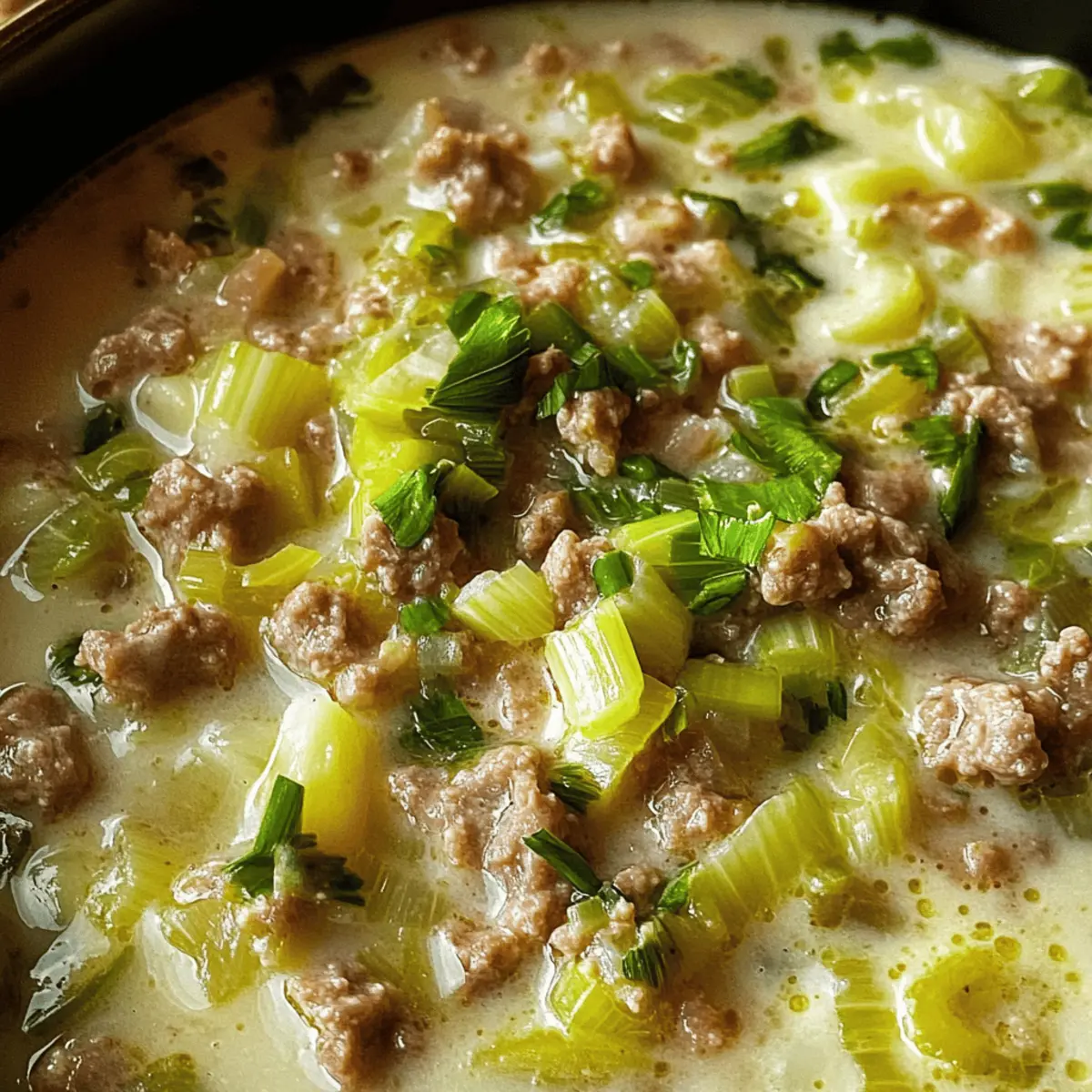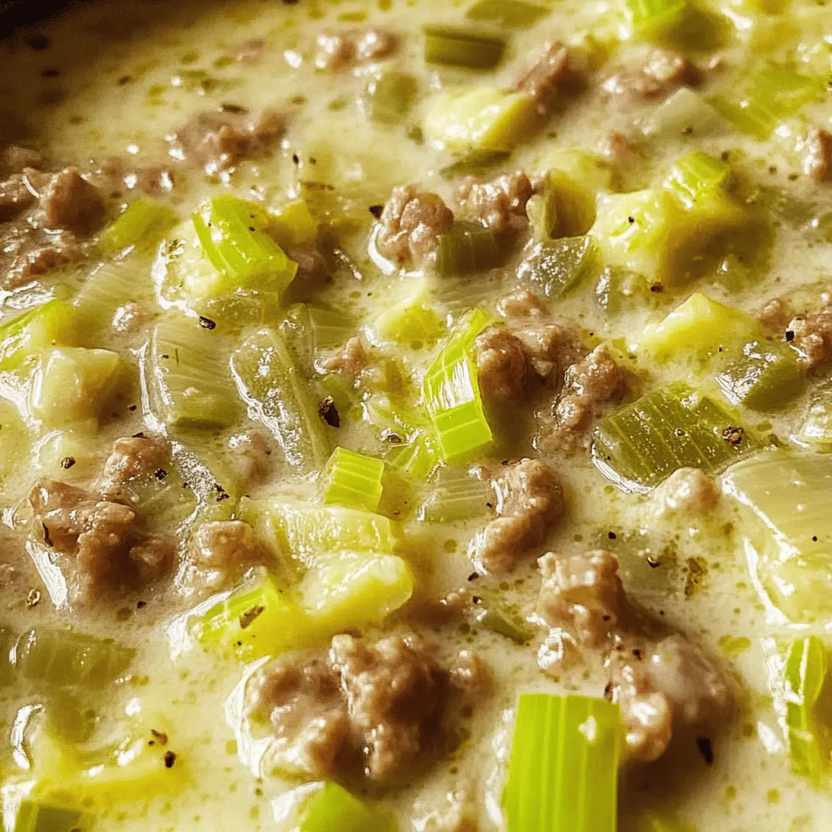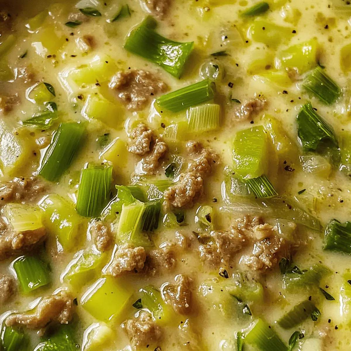 „Ein Teller Hüftgold, bitte!“ hörte ich neulich in einer kleinen Café-Ecke, und da wusste ich sofort, dass ich meine Küche mit einem tollen Rezept bereichern musste: Cremige Käse-Lauch-Suppe mit Hackfleisch. Diese wärmende Suppe ist der Inbegriff von comfort food und dabei so einfach zuzubereiten! Mit ihrem herzhaften Geschmack von geschmolzenem Käse und frischen Lauch und der herzhaften Note durch das Hackfleisch, ist sie ein Hit für die ganze Familie – egal ob klein oder groß. An kalten Tagen wird sie zu deinem neuen Lieblingsgericht, das dir nicht nur den Bauch füllt, sondern auch die Seele wärmt. Und das Beste? Du kannst sie je nach Lust und Laune mit verschiedenen Hackfleischsorten wunderbar variieren oder sogar eine vegetarische Version daraus zaubern! Wie wird deine persönliche Note bei dieser köstlichen Suppe aussehen? Lass uns gemeinsam ins Kochen starten! Warum wirst du diese Suppe lieben? Einfache Zubereitung: Mit nur wenigen Zutaten und ganz ohne komplizierte Techniken ist die Käse-Lauch-Suppe schnell gemacht und perfekt für Kochanfänger. Herzhafter Geschmack: Die Kombination aus geschmolzenem Käse und frischem Lauch sorgt für eine cremige, reichhaltige Erfahrung, die jeden Löffel zu einem Genuss macht. Vielseitigkeit: Ob mit Rinder- oder Hühnerhack – diese Suppe lässt sich ganz nach deinen Vorlieben anpassen. Sogar eine vegetarische Variante ist möglich! Überlege doch, sie mit frischen Kräutern zu verfeinern, um sie aufzupeppen, oder probiere die Variation Ideen für noch mehr spannende Geschmackserlebnisse. Familienfreundlich: Ein echtes Comfort Food, das deine Liebsten an kalten Tagen verwöhnt und sich bestens für große Runden eignet. Für jeden Anlass: Egal, ob als schnelles Abendessen oder als festliches Gericht – diese Suppe wird garantiert ein Publikumsliebling! Cremige Käse-Lauch-Suppe Hackfleisch Zutaten • Für die Suppe: Gemischtes Hackfleisch – sorgt für herzhaften Geschmack und Protein; ersetzbar durch Rinder- oder Hühnerhack. Lauch – bringt Süße und Tiefe; nur die weißen und hellgrünen Teile verwenden. Zwiebel – verstärkt das Aroma; gelbe Zwiebeln sind ideal und sollten fein gehackt werden. Öl – zum Anbraten verwendet; Olivenöl oder Pflanzenöl eignet sich gut. Gemüsebrühe – bildet die Basis für die Suppe; wähle eine natriumarme Version für eine gesündere Option. Schmelzkäse – verleiht eine cremige Textur; kann durch Ricotta für einen anderen Geschmack ersetzt werden. Schlagsahne – bringt reichhaltigen Geschmack; kann auch durch Frischkäse oder Milch ersetzt werden. Salz und Pfeffer – grundlegende Gewürze, um den Geschmack zu intensivieren. Muskatnuss – sorgt für eine warme, raffinierte Würze; frisch gerieben ist am besten. Das sind die Zutaten für deine cremige Käse-Lauch-Suppe mit Hackfleisch! Lass uns weiterkochen! Step-by-Step Instructions for Cremige Käse-Lauch-Suppe mit Hackfleisch Step 1: Zutaten vorbereiten Schneide den Lauch und die Zwiebeln in feine Ringe bzw. Würfel und stelle sie beiseite. Achte darauf, die weißen und hellgrünen Teile des Lauchs zu verwenden, da sie den besten Geschmack liefern. Nutze ein scharfes Messer und ein Schneidebrett, um die Vorbereitung schnell und sicher zu gestalten. Step 2: Fleisch anbraten Erhitze in einem großen Topf etwas Öl bei mittlerer Hitze. Füge das gemischte Hackfleisch hinzu und brate es für etwa 5-7 Minuten an, bis es schön gebräunt und krümelig ist. Rühre zwischendurch um, damit das Fleisch gleichmäßig brät und keine Stücke aneinander haften. Step 3: Gemüse sautieren Gib die fein gehackten Zwiebeln und den Lauch in den Topf mit dem frisch gebratenen Hackfleisch. Sauté für weitere 5 Minuten, bis die Zwiebeln glasig sind und der Lauch zart und leicht welgelig aussieht. Achte darauf, Hitze zu halten, damit nichts anbrennt, und vermische alles gut. Step 4: Brühe hinzufügen Gieße die Gemüsebrühe in den Topf und bringe die Mischung bei hoher Hitze zum Kochen. Sobald sie kocht, reduziere die Hitze auf mittlere Stufe und lasse die Suppe etwa 10 Minuten köcheln, damit sich die Aromen gut verbinden können. Rühre gelegentlich um, um ein Anbrennen zu verhindern. Step 5: Käse und Sahne einrühren Reduziere die Hitze auf niedrig und füge den Schmelzkäse sowie die Schlagsahne hinzu. Rühre vorsichtig, bis der Käse geschmolzen ist und die Mischung eine cremige Konsistenz erreicht hat. Achte darauf, dass die Suppe nicht kocht, da dies die cremige Textur beeinträchtigen kann. Step 6: Würzen Schmecke die cremige Käse-Lauch-Suppe mit Hackfleisch mit Salz, Pfeffer und einer Prise frisch geriebener Muskatnuss ab. Teste den Geschmack und füge nach Bedarf mehr Gewürze hinzu, um das Aroma zu intensivieren. Achte darauf, dass die Gewürze die reichhaltige Cremigkeit der Suppe ergänzen. Step 7: Servieren Serviere die Suppe heiß in tiefen Tellern oder Schalen. Optional kannst du sie mit frischen Kräutern oder gerösteten Kürbiskernen garnieren. Diese cremige Käse-Lauch-Suppe ist perfekt dazu geeignet, mit knusprigem Brot genossen zu werden, was das ganze Gericht abrundet und zu einem echten Genuss macht. Was passt zu Cremiger Käse-Lauch-Suppe mit Hackfleisch? Diese köstliche, cremige Suppe lässt sich wunderbar in ein vollwertiges Menü integrieren und sorgt für ein unvergessliches Geschmackserlebnis. Knuspriges Brot: Ideal zum Dippen! Das Brot ergänzt die cremige Textur der Suppe und sorgt für einen herzhaften Biss. Frische grüne Salate: Ein knackiger Beilagensalat mit leichtem Dressing bringt Frische ins Spiel und balanciert die Reichhaltigkeit der Suppe aus. Rustikale Kartoffeln: Ofenkartoffeln oder Kartoffel-Wedges sorgen für eine sättigende Komponente und harmonieren geschmacklich hervorragend mit dem Lauch. Herzhafte Quiche: Eine Quiche mit Gemüse oder Käse bietet etwas Vielfalt und ist eine schmackhafte Ergänzung zu deinem Suppe-Menü. Rotwein: Ein leichter, fruchtiger Rotwein wie ein Pinot Noir kann