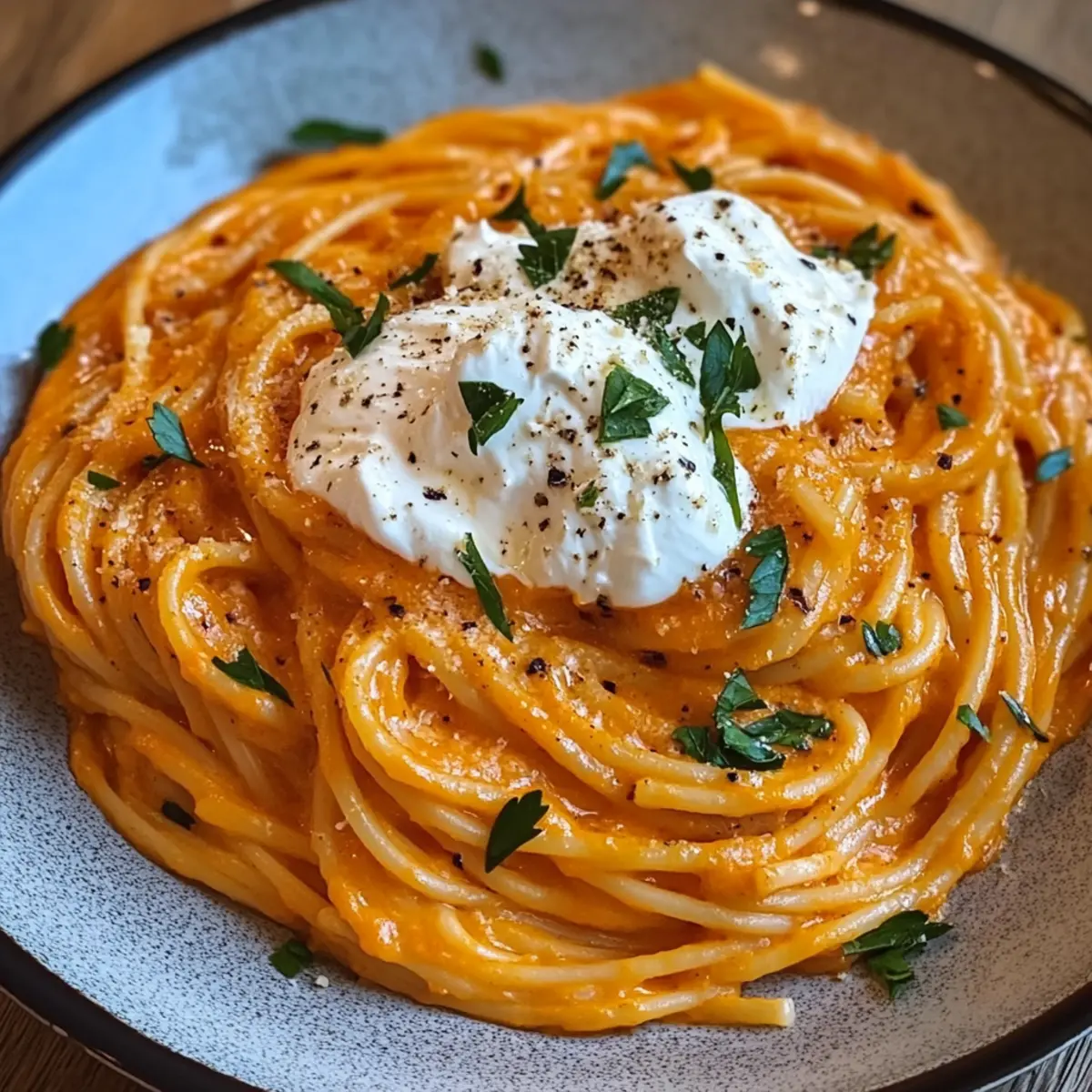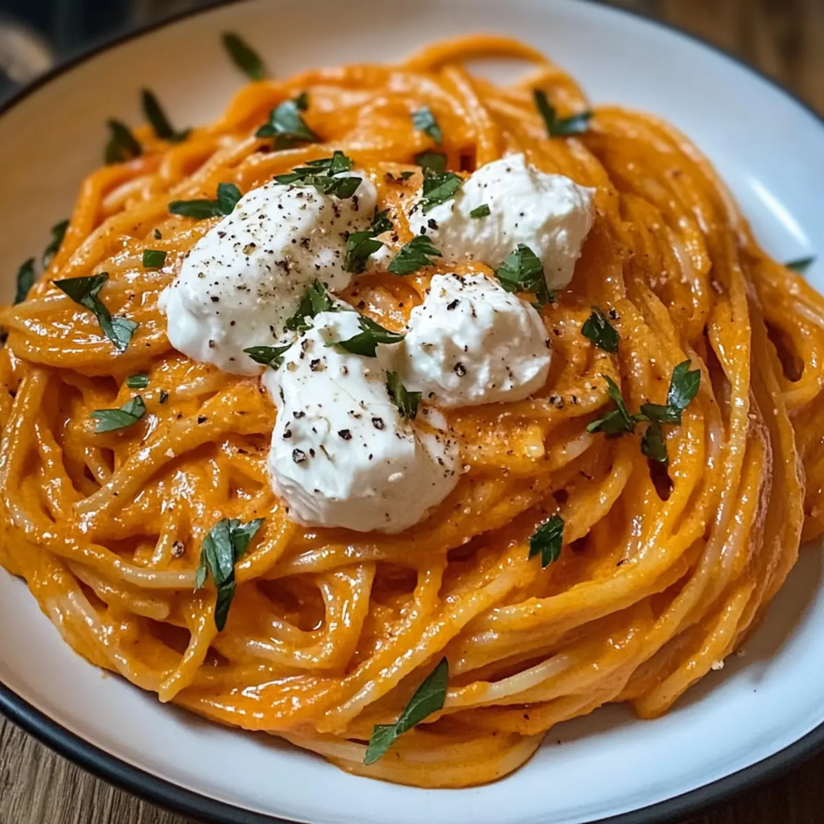 Als ich neulich mit einem großen Korb voller frischer, roter Paprika nach Hause kam, wusste ich sofort, dass ich etwas Besonderes daraus zaubern wollte. Diese cremige rote Paprika-Pasta mit Burrata und Kräutern ist die perfekte Lösung – ein elegantes Gericht, das in nur 30 Minuten auf dem Tisch steht! Die Kombination aus süßen, karamelisierten Paprika und dem seidigen Burrata-Käse macht dieses Rezept nicht nur zu einem echten Hingucker, sondern es ist auch wunderbar einfach zu kochen. Ideal für Anfänger und diejenigen, die nicht viel Zeit haben, denn die Aromen vereinen sich zu einem Hochgenuss, der selbst eingefleischte Fast-Food-Fans überzeugen wird. Neugierig, wie du dieses köstliche Gericht ganz schnell selbst zubereiten kannst? Lass uns direkt mit dem Rezept beginnen! Warum wirst du dieses Rezept lieben? Schnelligkeit: In nur 30 Minuten bereit, perfekt für hektische Abende! Cremige Textur: Die Kombination aus Burrata und Sahne schafft ein unglaubliches, luxuriöses Mundgefühl. Einfachheit: Ideal für Anfänger – keine komplizierten Techniken erforderlich. Vielfältigkeit: Kann leicht abgewandelt werden, zum Beispiel mit Joghurtkuchen Ohne Mehl oder als vegane Variante. Gesund und nahrhaft: Vollgepackt mit frischem Gemüse und Kräutern, die deine Gesundheit unterstützen. Diese cremige rote Paprika-Pasta ist nicht nur ein Fest für die Augen, sondern auch ein Genuss für den Gaumen, der auch ihre Liebsten begeistern wird! Cremige rote Paprika-Pasta Zutaten Für die Soße Olivenöl – Essentiell zum Anbraten der Schalotten und für die Geschmacksbasis, kann durch Avocadoöl ersetzt werden. Schalotten – Fügen milden Süßgeschmack hinzu; können bei Bedarf durch Zwiebeln ersetzt werden. Rote Paprika – Hauptzutat, die natürliche Süße und lebendige Farbe liefert; frische Paprika schmecken besser als eingelegte. Frischer Thymian, Oregano, Rosmarin – Diese Kräuter bringen Komplexität ins Gericht; getrocknete Kräuter können in kleineren Mengen substituiert werden. Koscheres Salz & schwarzer Pfeffer – Grundlagenwürzungen, die die Aromen verstärken; nach Geschmack anpassen. Knoblauch – Fügt ein herzhaftes Aroma hinzu; kann durch 1/8 TL Knoblauchpulver ersetzt werden. Balsamico-Essig – Balanciert die Reichhaltigkeit mit Säure; kann durch Rotweinessig ersetzt werden. Gemüsebrühe – Liefert die Flüssigkeit für die Soße; Hühnerbrühe ist eine geeignete Alternative für Nicht-Vegetarier. Schlagsahne – Schafft eine reichhaltige, cremige Textur; für eine leichtere oder milchfreie Option kannst du Kokoscreme verwenden. Parmesankäse – Fügt Umami und Dicke hinzu; Nährhefe kann als vegane Option verwendet werden. Für die Pasta Linguine – Die bevorzugte Pastaform für dieses Gericht, die die Soße gut hält; Alternativen sind Spaghetti oder Fettuccine. Burrata-Käse – Bietet eine luxuriöse Cremigkeit; kann durch frische Mozzarella oder Ricotta ersetzt werden. Frische Petersilie – Verleiht als Garnitur Frische; kann weggelassen werden, wenn nicht verfügbar. Step-by-Step Instructions für Cremige rote Paprika-Pasta mit Burrata und Kräutern Step 1: Wasser für die Pasta kochen Bringe einen großen Topf mit gesalzenem Wasser zum Kochen, während du die anderen Zutaten vorbereitest. Die Salzkonzentration im Wasser sorgt dafür, dass die Pasta gleichmäßig gewürzt wird. Warte, bis das Wasser sprudelnd kocht, bevor du die Linguine hinzufügst, um ein Klumpen zu vermeiden. Step 2: Schalotten anbraten Erhitze in einer großen Pfanne etwa 2 Esslöffel Olivenöl bei mittlerer Hitze. Füge die gehackten Schalotten hinzu und brate sie für 2–3 Minuten, bis sie goldbraun sind. Achte darauf, die Schalotten regelmäßig umzurühren, damit sie gleichmäßig garen und nicht anbrennen. Step 3: Rote Paprika und Kräuter hinzufügen Füge nun die gewürfelten roten Paprika, frischen Thymian, Oregano, Rosmarin sowie Koscheres Salz und schwarzen Pfeffer in die Pfanne. Koche alles unter gelegentlichem Rühren für 15–18 Minuten, bis die Paprika weich und leicht karamellisiert sind. Dieser Schritt verleiht der cremigen roten Paprika-Pasta ein intensives Aroma. Step 4: Knoblauch und Balsamico-Essig hinzugeben Rühre den gehackten Knoblauch und den Balsamico-Essig für etwa 1 Minute in die Pfanne. Achte darauf, dass der Knoblauch nicht verbrennt – er sollte nur aromatisch und weich werden. Die Säure des Essigs wird die Süße der Paprika perfekt ausgleichen. Step 5: Gemüsebrühe einfüllen Gieße die Gemüsebrühe in die Pfanne und lasse die Mischung für etwa 5 Minuten bei niedriger bis mittlerer Hitze köcheln. Dadurch können sich die Aromen verbinden und die Soße erhält die richtige Konsistenz. Rühre regelmäßig um, um ein Ansetzen zu verhindern. Step 6: Linguine kochen Koche die Linguine im zuvor zum Kochen gebrachten Wasser, bis sie al dente sind, normalerweise etwa 8–10 Minuten. Achte darauf, die Pasta etwas unter dem gewünschten Gargrad zu belassen, damit sie die Aromen der Soße gut aufnehmen kann, wenn alles vermischt wird. Step 7: Soße pürieren Nutze einen Standmixer oder einen Stabmixer, um die Paprika-Gemüse-Mischung aus der Pfanne bis zur cremigen Konsistenz zu pürieren. Diese Schritt sorgt dafür, dass du eine seidige, gleichmäßige Soße erhältst, die die Flüssigkeit für die cremige rote Paprika-Pasta bildet. Step 8: Sahne einrühren Rühre jetzt die Schlagsahne in die pürierte Paprika-Mischung ein. Lasse die Soße bei niedriger Hitze kurz köcheln, damit sie sich mit der Sahne verbindet und eine reichhaltige, cremige Textur entsteht. Achte darauf, die Soße nicht zu stark zu kochen, da die Sahne sonst gerinnen könnte. Step 9: Pasta und Parmesan vereinen Sobald die Linguine fertig ist, lasse sie abtropfen und gebe sie direkt in die Pfanne mit der cremigen Paprika-Soße. Streue den geriebenen Parmesan darüber und vermenge alles gut bei niedriger Hitze, bis die Pasta von der Soße umhüllt ist und der Käse geschmolzen ist.