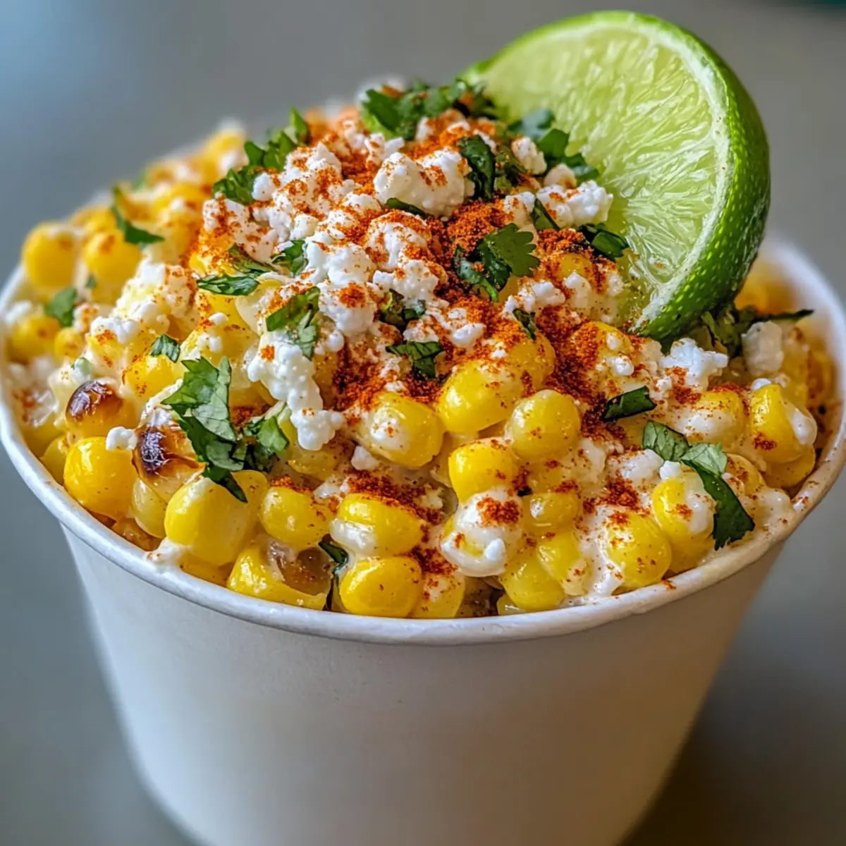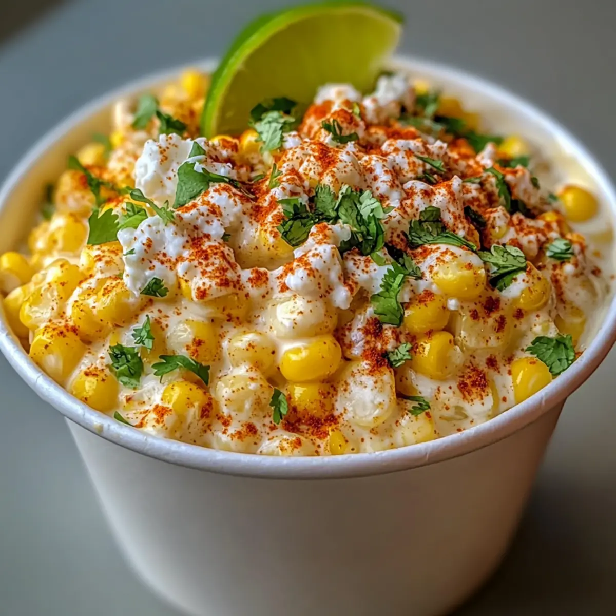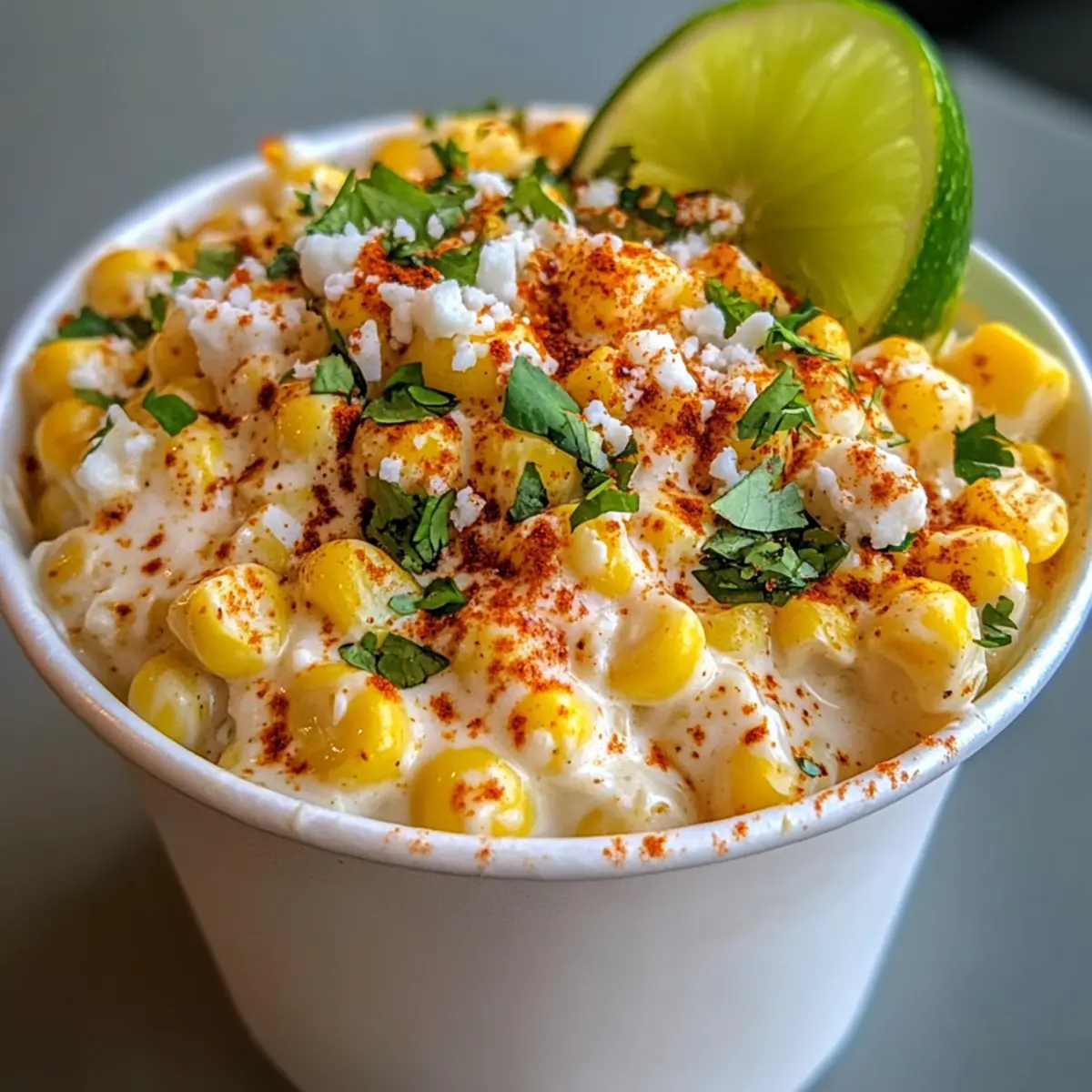 Genieße cremigen mexikanischen Straßenmais im Becher, eine köstliche Mischung aus süßen Maiskörnern und einer reichhaltigen Sauce, die dich an sonnige Tage erinnert.