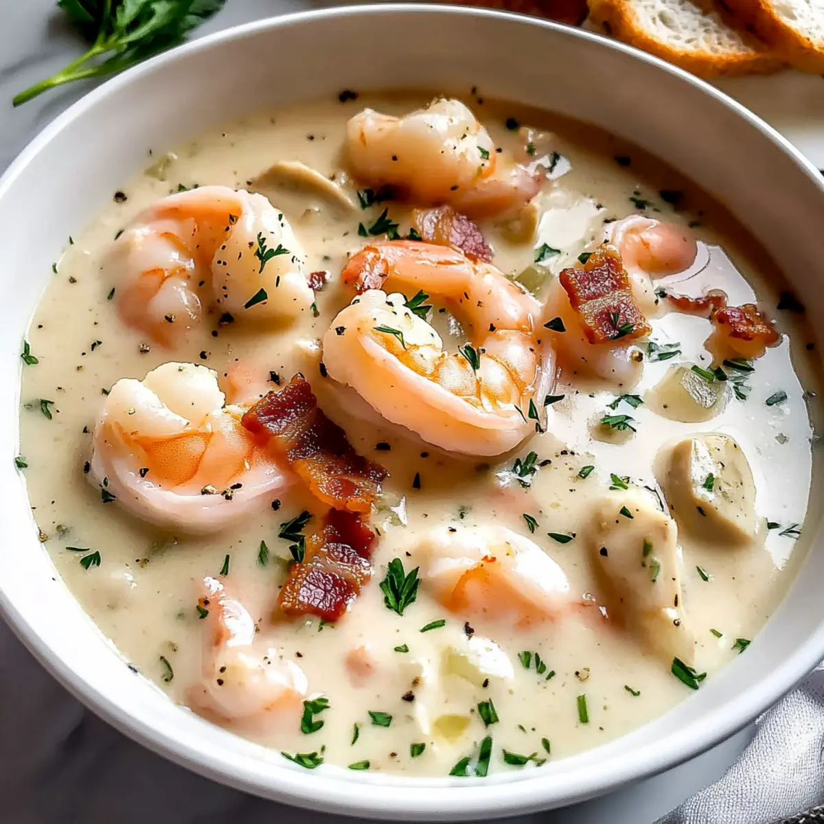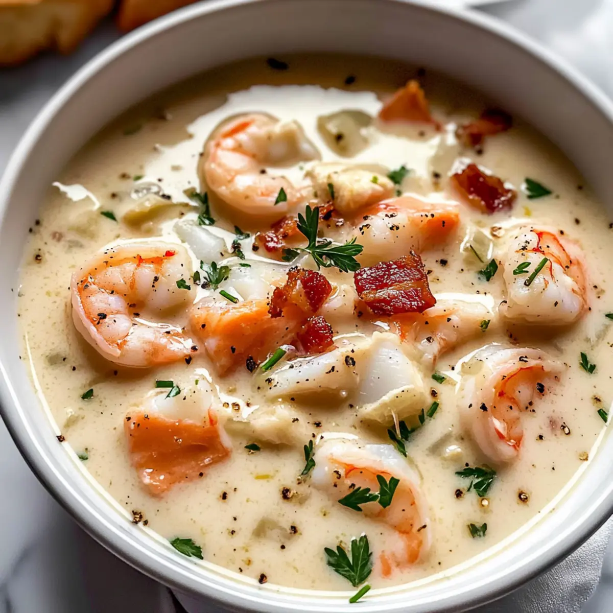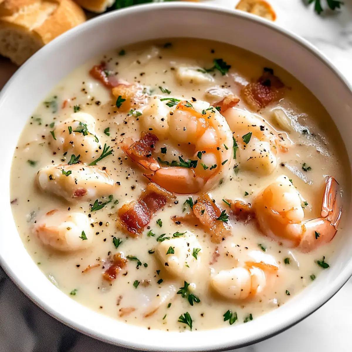 Das sanfte Sprudeln von kochendem Wasser und der verführerische Duft von frisch angebratenem Speck machen sofort klar, dass etwas ganz Besonderes im Gange ist. Dies ist die beste cremige Meeresfrüchte Chowder, und sie wird dich mit jedem Löffel in eine Welt der Aromen entführen. Diese herzhafte, reichhaltige Suppe ist nicht nur einfach und schnell zuzubereiten, sondern auch unglaublich anpassungsfähig und sorgt für ein perfektes Gericht, egal ob an einem gemütlichen Abend zu Hause oder beim Empfang von Gästen. Mit einer Fülle an zartem Seafood, frischen Gemüse und einem cremigen Finish erhältst du ein echtes Komfortessen, das jeden glücklich macht. Bist du bereit, deine Küche mit diesem köstlichen Stück Meer aufzupepen? Warum wirst du diese Chowder lieben? Einfachheit, die begeistert: In nur wenigen Schritten erhältst du eine köstliche Chowder, die sogar Kochanfängern gelingt. Aromatische Vielfalt: Die perfekte Kombination aus zartem Seafood und frischen Kräutern sorgt für ein Geschmackserlebnis, das zum Wiederholen einlädt. Vielseitigkeit für jeden Geschmack: Ob du Muscheln, Krabben oder Gemüse hinzufügst, diese Chowder ist für kreative Modifikationen ideal. Schnelles Comfort Food: Ideal für stressige Tage – in weniger als 30 Minuten auf dem Tisch und einfach unwiderstehlich. Ideal zum Teilen: Diese cremige Meeresfrüchte Chowder eignet sich hervorragend für ein gemütliches Abendessen mit Freunden oder der Familie. Ein Genuss, den niemand ablehnen kann! Zutaten für die beste cremige Meeresfrüchte Chowder Für die Suppe Bacon oder Pancetta – sorgt für ein rauchiges Aroma und geschmackliche Tiefe. Substitution Hinweis: Verwende Truthahnbacon für eine fettärmere Variante. Zwiebel – bietet die süße, herzhaft basis. Substitution Hinweis: Schalotten können für einen milderen Geschmack eingesetzt werden. Sellerie – bringt einen knackigen Biss und subtile Erdigkeit mit sich. Karotte – fügt natürliche Süße und lebendige Farbe hinzu. Knoblauch – verstärkt den Gesamtgeschmack mit seiner milden Schärfe. Gemischte Meeresfrüchte – bestehen aus Garnelen, Lachs und weißem Fisch für verschiedene Geschmäcker. Substitution Hinweis: Kann durch Muscheln, Kabeljau oder Krabben ersetzt werden. Kartoffeln – bieten Substanz und Fülle. Substitution Hinweis: Süßkartoffeln können für ein anderes Geschmacksprofil verwendet werden. Mehl – dient als Verdickungsmittel. Fisch- oder Hühnerbrühe – bildet die aromatische Flüssigkeitsbasis. Substitution Hinweis: Gemüsebrühe für eine vegetarische Variante. Weißwein – verleiht Säure und Komplexität. Substitution Hinweis: Kann weggelassen oder durch Zitronensaft ersetzt werden. Schlagsahne – sorgt für eine reichhaltige, cremige Konsistenz. Substitution Hinweis: Halbe-Halbe oder Kondensmilch für eine leichtere Variante. Salz und Pfeffer – unerlässlich zur Geschmacksverstärkung. Petersilie – bringt Frische und Farbe. Thymian – fügt eine subtile, kräuterige Note hinzu. Substitution Hinweis: Dill oder Estragon können alternativ verwendet werden. Genieße diese beste cremige Meeresfrüchte Chowder mit all ihren köstlichen Zutaten! Schritt-für-Schritt-Anleitung für die beste cremige Meeresfrüchte Chowder Step 1: Speck und Gemüse vorbereiten Brate den gewürfelten Speck in einem großen Topf bei mittlerer Hitze an, bis er knusprig ist. Füge dann Zwiebeln, Sellerie, Karotten und Knoblauch hinzu und dünste die Mischung weiter für etwa 5 Minuten, bis die Zwiebeln glasig sind. Die aromatische Basis wird jetzt sofort spürbar. Step 2: Die Mehlschwitze herstellen Streue das Mehl über das angebratene Gemüse und rühre es für 1–2 Minuten gut unter, um eine gleichmäßige Konsistenz zu erreichen. Achte darauf, dass das Mehl leicht goldbraun wird, was den Geschmack deiner Chowder intensiviert und die Basis für eine cremige Textur schafft. Step 3: Brühe hinzufügen Gieße langsam die Brühe in den Topf und rühre dabei kräftig mit einem Schneebesen, um Klumpen zu vermeiden. Füge optional den Weißwein hinzu und bringe alles zum Kochen, damit sich die Aromen gut verbinden. Dieser Schritt sorgt für eine köstliche und würzige Basis in deiner besten cremigen Meeresfrüchte Chowder. Step 4: Kartoffeln garen Sobald die Brühe kocht, reduziere die Hitze und füge die gewürfelten Kartoffeln hinzu. Lass die Mischung 10–15 Minuten köcheln, bis die Kartoffeln weich sind und leicht mit einer Gabel zerdrückt werden können. Achte darauf, dass sie nicht zu lange kochen, damit du die perfekte Konsistenz erreichst. Step 5: Meeresfrüchte hinzufügen Rühre die gemischten Meeresfrüchte in den Topf und lasse die Chowder weitere 5–10 Minuten leicht köcheln, bis die Meeresfrüchte gar sind und eine zarte Konsistenz annehmen. Die Farben und Aromen aus den verschiedenen Meeresfrüchten werden jetzt wunderbar sichtbar. Step 6: Chowder vollenden und servieren Gib die Schlagsahne in die Chowder und rühre sie unter, während du mit Salz und Pfeffer abschmeckst. Füge frisch gehackte Petersilie und Thymian hinzu, um eine spritzige Frische zu erzielen. Serviere deine beste cremige Meeresfrüchte Chowder heiß, garniert mit knusprigem Speck für den letzten Schliff. Perfekte Vorbereitung für die beste cremige Meeresfrüchte Chowder Die beste cremige Meeresfrüchte Chowder ist ideal für die Vorbereitung im Voraus, was dir wertvolle Zeit an hektischen Abenden spart. Du kannst das Gemüse – Zwiebeln, Sellerie, Karotten und Knoblauch – bis zu 24 Stunden vorher schneiden und in einem luftdichten Behälter im Kühlschrank aufbewahren, um die Frische zu bewahren. Auch die Baconwürfel kannst du schon am Vortag braten und gekühlt lagern. Wenn du bereit bist, die Chowder zuzubereiten, brate einfach das vorbereitete Gemüse und den Speck an, füge die Brühe und die Kartoffeln hinzu und koche alles wie gewohnt. Wichtig ist, die Chowder nach dem Kochen noch heiß mit Sahne zu verfeinern und die Meere