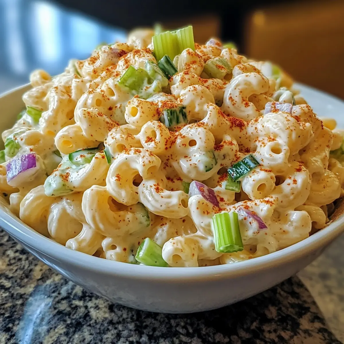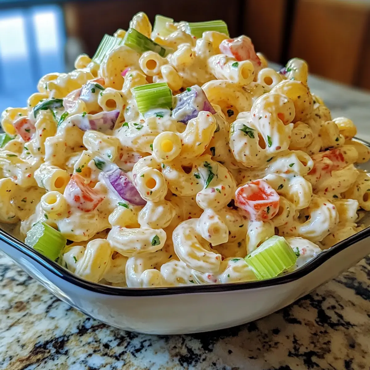 Es war ein sonniger Nachmittag, als ich in den Garten trat, um das perfekte Gericht für das bevorstehende Picknick zuzubereiten. Die Entscheidung fiel schnell auf mein einfaches Macaroni-Salat Rezept – eine bunte Mischung aus Makkaroni, knackigem Gemüse und einer herrlich cremigen Mayonnaise-Soße. Was ich an diesem Rezept liebe? Es ist nicht nur unkompliziert in der Zubereitung, sondern auch ein echter Publikumsliebling, der jedem Sommerfest Leben einhaucht. Zudem ist der Salat vegetarisch und ideal für all jene, die eine köstliche, aber gesunde Beilage suchen. Bleib dran, um herauszufinden, wie du diesen Klassiker unkompliziert und mit frischen Zutaten zubereiten kannst! Warum ist dieser Macaroni-Salat so besonders? Einfachheit: Die Zubereitung ist kinderleicht und benötigt keine speziellen Küchenkenntnisse – perfekt für alle, die sich auch ohne große Erfahrung in der Küche beweisen möchten. Vielseitigkeit: Dieses Rezept lässt sich problemlos abwandeln, indem du zusätzliches Gemüse oder sogar Käse hinzufügst – so wird jeder Biss zu einer neuen Entdeckung! Köstlicher Geschmack: Die Kombination aus cremiger Mayonnaise und frischen, knackigen Gemüse sorgt für ein wunderbares Geschmackserlebnis, das die Erinnerungen an Sommerpicknicks weckt. Beliebtheit: Dieser Salat ist ein echter Hit auf jedem Buffet oder Grillfest und wird von Familien und Freunden gleichermaßen geschätzt. Zeitersparnis: Mit wenigen Schritten und ohne langen Kochaufwand hast du innerhalb kürzester Zeit eine köstliche Beilage gezaubert. Wenn du mehr über gesunde und unkomplizierte Rezepte erfahren möchtest, schau dir auch unser einfaches Kartoffelsalat Rezept an! Einfache Macaroni-Salat Zutaten • Für den Salat: Makkaroni – Basis des Salats, sorgt für Struktur; du kannst auch glutenfreie Pasta verwenden. Erbsen – Fügen einen süßen Geschmack und schöne Farbe hinzu; frische oder gefrorene Erbsen sind ideal. Paprika – Bringt knackigen Biss und frische; wähle rote, gelbe oder grüne Paprika je nach Vorliebe. Zwiebel – Verleiht Schärfe und Aroma; kannst sie auch durch Frühlingszwiebeln ersetzen, wenn du es milder magst. • Für das Dressing: Mayonnaise – Das cremige Element der Soße; tausche sie gegen griechischen Joghurt für eine leichtere Variante aus. Senf – Fügt dem Dressing eine angenehme Säure hinzu; alternativ kannst du auch Apfelessig verwenden für eine andere Geschmacksnote. Salz und Pfeffer – Verstärken den Geschmack; justiere diese nach deinem persönlichen Geschmack. Genieße dieses einfache Macaroni-Salat Rezept als eine köstliche und unkomplizierte Ergänzung zu deinen Sommergerichten! Schritt-für-Schritt-Anleitung für Einfache Macaroni-Salat Rezept Schritt 1: Makkaroni kochen Bringe einen großen Topf mit salzwarmem Wasser zum Kochen. Füge die Makkaroni hinzu und koche sie gemäß der Packungsanweisung für etwa 8 bis 10 Minuten, bis sie al dente sind. Rühre gelegentlich um, damit sie nicht aneinander kleben. Gieße die Makkaroni anschließend in ein Sieb ab und lasse sie unter kaltem Wasser abkühlen, um den Kochvorgang zu stoppen. Schritt 2: Gemüse vorbereiten Während die Makkaroni abkühlen, nimm dir das frische Gemüse zur Hand. Schneide die Erbsen, Paprika und Zwiebel in kleine, gleichmäßige Stücke. Verwende ein scharfes Küchenmesser und ein Schneidebrett, um sicherzustellen, dass alles gleichmäßig groß ist – dies sorgt für eine ansprechende Optik im Einfache Macaroni-Salat. Achte darauf, die Paprika nach deiner Farbvorliebe auszuwählen. Schritt 3: Makkaroni abkühlen lassen Nachdem du die Makkaroni abgegossen hast, gib sie in eine große Schüssel und lasse sie bei Raumtemperatur für etwa 10 Minuten abkühlen. Dies ist wichtig, da es verhindert, dass die Makkaroni beim Mischen mit dem Dressing matschig werden. Du kannst sie gelegentlich umrühren, um eine gleichmäßige Abkühlung zu gewährleisten. Schritt 4: Zutaten vermengen Sobald die Makkaroni abgekühlt sind, füge die vorbereiteten Erbsen, Paprika und Zwiebel in die Schüssel hinzu. Mit einem großen Löffel oder einer Kelle vermengst du die Zutaten sanft, so dass alle Farben und Texturen gut verteilt werden. Dies sorgt dafür, dass jeder Bissen im Einfache Macaroni-Salat das volle Geschmackserlebnis bietet. Schritt 5: Dressing hinzufügen In einer separaten Schüssel mischst du die Mayonnaise, den Senf, Salz und Pfeffer. Verteile die Mischung gleichmäßig über den Makkaroni und dem Gemüse. Verwende einen großen Löffel, um alles gründlich zu vermengen, bis die Makkaroni und das Gemüse schön mit dem Dressing umhüllt sind. Dies sorgt für den cremigen Charakter des Einfache Macaroni-Salat. Schritt 6: Abschmecken Nun ist es an der Zeit, den Einfache Macaroni-Salat zu probieren und gegebenenfalls nachzuwürzen. Füge bei Bedarf mehr Salz und Pfeffer hinzu, um den Geschmack zu verstärken. Denke daran, dass die Aromen beim Kühlen intensiver werden, also korrigiere nach deinem persönlichen Geschmack und das, was für dich und deine Gäste angenehm ist. Schritt 7: Kühlen und servieren Decke die Schüssel mit Frischhaltfolie ab und stelle den fertigen Salat für mindestens 30 Minuten in den Kühlschrank. So können sich die Aromen besser entfalten und die Aromen kommen optimal zur Geltung. Vor dem Servieren einmal gut umrühren, um sicherzustellen, dass das Dressing gleichmäßig verteilt ist und der Salat frisch aussieht. Schritt 8: Genießen! Serviere deinen Einfache Macaroni-Salat kalt als erfrischende Beilage zu Gegrilltem oder als schmackhaftes Mittagessen. Diese sommerliche Delikatesse eignet sich hervorragend für Picknicks oder Grillabende und wird sicherlich bei Familie und Freunden gut ankommen. Aufbewahrungstipps für Einfache Macaroni-Salat Kühlschrank: Bewahre den Einfache Macaroni-Salat in einem luftdichten Behälter auf. So bleibt er bis zu 3 Tage frisch, und die Aromen entwickeln sich optimal. Vorbereiten: Du kannst den Salat auch einen Tag im Vorau