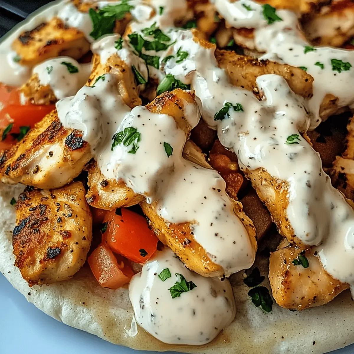 Richte die Hähnchen-Gyros auf Tellern an und gib die cremige Sauce großzügig darüber. Garniere die Gyros mit dem frisch geschnittenen Gemüse und serviere dazu Pita-Brot oder Reis für ein herzhaftes und leckeres Essen.