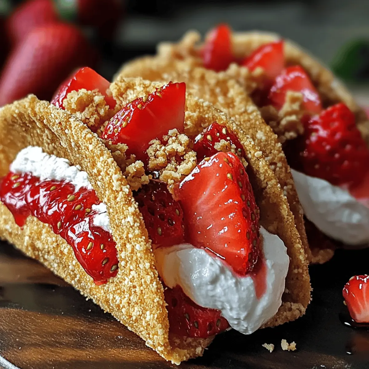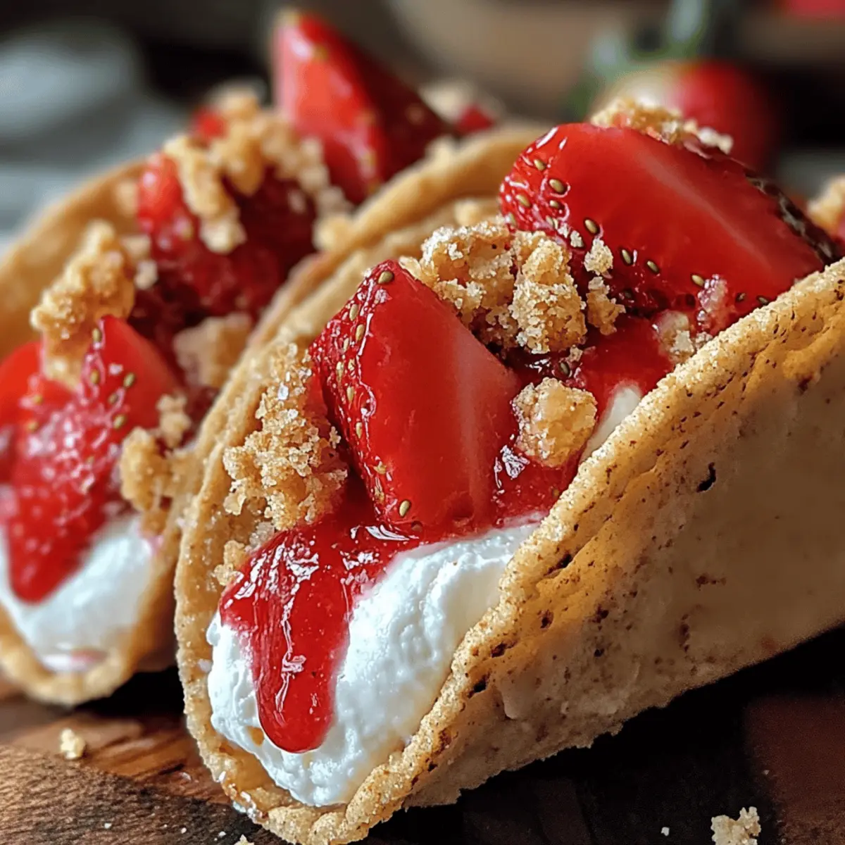 In einer kleinen Ecke meiner Küche, wo der Duft von frischen Erdbeeren und süßer Sahne in der Luft schwebt, habe ich die perfekte Idee gefunden, um jedes Dessertliebhaber-Herz höher schlagen zu lassen: Erdbeer-Crunch-Cheesecake-Tacos. Diese köstlichen kleinen Wunder sind nicht nur ein wahrer Hingucker, sondern auch ein Genuss, der im Handumdrehen zubereitet ist – ganz ohne Backen! Die Kombination aus cremigem Käsekuchen, knusprigem Graham-Cracker und saftigen Erdbeeren sorgen für ein harmonisches Geschmackserlebnis, das sowohl Gäste bei Feiern begeistert als auch als besondere Belohnung für sich selbst dient. Und das Beste daran? Du kannst die Tacos nach Belieben anpassen und mit verschiedenen Früchten variieren! Bist du bereit, deine Küche in eine wahre Dessert-Oase zu verwandeln? Warum wirst du diese Tacos lieben? Einfache Zubereitung: Mit nur wenigen Zutaten und ohne Backen sind diese Erdbeer-Crunch-Cheesecake-Tacos ein Kinderspiel! Selbst Anfänger können sie zaubern. Köstliche Kombi: Die harmonische Verbindung aus cremigem Käsekuchen und knusprigen Graham-Cracker-Schalen sorgt für einen Genuss, der süchtig macht. Vielseitigkeit: Ob mit frischen Erdbeeren oder anderen Früchten, diese Tacos lassen sich leicht anpassen, um deiner Kreativität freien Lauf zu lassen. Probiere auch andere Varianten wie Raspberry Cheesecake Tacos für eine fruchtige Abwechslung! Perfektes Dessert für Partys: Die beeindruckende Präsentation dieser Tacos macht sie zu einem wahren Blickfang auf jedem Tisch. Schneller Genuss: In weniger als 30 Minuten sind die Tacos fertig vorbereitet und bereit, in den Kühlschrank zu wandern – ideal für unerwartete Gäste! Erdbeer-Crunch-Cheesecake-Tacos Zutaten • Frische Erdbeer-Crunch-Cheesecake-Tacos sind einfach zuzubereiten und schmecken himmlisch! Für die Füllung Frischkäse – sorgt für eine cremige Basis; achte darauf, dass er weich ist, um das Mischen zu erleichtern. Zucker – süßt die Füllung; schmecke beim Mischen ab und passe die Süße nach deinem Bedarf an. Vanilleextrakt – fügt eine tiefere Geschmacksnote hinzu; verwende reinen Vanilleextrakt für ein intensiveres Aroma. Schlagsahne – trägt zu einer reichen, glatten Textur bei, wenn sie unter die Käsekuchenmischung gefaltet wird. Frische Erdbeeren – bringen lebhaften Geschmack und natürliche Süße; du kannst sie auch durch Himbeeren oder Heidelbeeren ersetzen. Für die Taco-Schalen Graham-Cracker-Brösel – bildet die knusprige Basis; wähle glutenfreie Graham-Cracker für eine glutenfreie Variante. Ungesalzene Butter – bindet die Graham-Cracker-Brösel zusammen; verwende geschmolzene Butter für die besten Ergebnisse. Für die Garnitur (optional) Gehackte geröstete Pekannüsse – bietet zusätzlichen Crunch und Geschmack; ersetze sie durch andere Nüsse wie Mandeln oder Walnüsse. Zusätzlich gehackte Erdbeeren – zur Dekoration der Tacos, die einen frischen Farbtupfer hinzufügen. Schritt-für-Schritt-Anleitung für Erdbeer-Crunch-Cheesecake-Tacos Step 1: Frischkäse vorbereiten In einer mittelgroßen Schüssel den weichen Frischkäse mit einem Handmixer kräftig schlagen, bis er ganz glatt ist. Füge Zucker und Vanilleextrakt hinzu und mixe alles gut, bis die Mischung gleichmäßig und cremig ist. Dies dauert etwa 2 Minuten auf mittlerer Stufe, sodass sich die Zutaten vollständig verbinden. Step 2: Sahne und Erdbeeren hinzufügen Sobald die Basis für die Füllung zubereitet ist, die schwere Sahne langsam unter die Frischkäse-Mischung heben, bis alles gut kombiniert ist. Danach die fein gehackten, frischen Erdbeeren vorsichtig unterheben. Diese Schritte sorgen dafür, dass dein Erdbeer-Crunch-Cheesecake-Tacos eine luftigere und vollmundigere Textur erhalten. Step 3: Taco-Schalen herstellen In einer separaten Schüssel die Graham-Cracker-Brösel mit der geschmolzenen Butter gut vermengen, bis die Brösel gleichmäßig bedeckt sind. Diese Mischung sollte eine leicht feuchte Konsistenz haben, die sich gut formen lässt. Siehst du, dass die Brösel beim Zusammendrücken zusammenhalten, bist du bereit für den nächsten Schritt. Step 4: Taco-Schalen formen Drücke die Graham-Cracker-Mischung fest in Taco-Formen oder in ein Muffinblech, um die Form der Taco-Schalen zu erzeugen. Achte darauf, dass du die Mischung gleichmäßig verteilst und eine ausreichende Dicke erzeugst, damit die Schalen stabil sind. Diese sollten jetzt für mindestens 2 Stunden in den Kühlschrank gestellt werden, um fest zu werden. Step 5: Taco-Schalen füllen Sobald die Taco-Schalen fest sind, nimm sie aus dem Kühlschrank und fülle jede Schale gleichmäßig mit der leckeren Käsekuchenfüllung. Verwende dafür ein Spritzbeutel oder einen Löffel, um eine schöne und sorgfältige Füllung zu erreichen. Achte darauf, die Füllung bis zum Rand zu bringen, um den köstlichen Geschmack der Erdbeer-Crunch-Cheesecake-Tacos zu maximieren. Step 6: Tacos garnieren Falls gewünscht, streue einige gehackte, geröstete Pekannüsse oder anderes gewähltes Nuss-Topping über die gefüllten Taco-Schalen. Eine kleine Menge zusätzlich gehackter Erdbeeren verleiht den Tacos einen zusätzlichen Frischekick und eine ansprechende Präsentation. Dies sollte direkt vor dem Servieren geschehen, um die besten Aromen hervorzubringen. Step 7: Servieren und genießen Sobald alles fertig ist, kannst du deine Erdbeer-Crunch-Cheesecake-Tacos kalt servieren. Stelle sicher, dass sie gut gekühlt sind, um die perfekte Konsistenz zu erreichen. Diese Tacos sind ein absoluter Hingucker und der ideale Genuss für jede Gelegenheit! Erdbeer-Crunch-Cheesecake-Tacos Variationen Lass deiner Kreativität freien Lauf und passe die Tacos ganz nach deinem Geschmack an. Beerenmix: Statt nur Erdbeeren, kannst du gemischte Beeren wie Himbeeren, Heidelbeeren und Brombeeren verwenden, um ein fruchtiges Geschmackserlebnis zu schaffen. Kombiniere sie für eine explosive Geschmackskombination, die jeden Biss aufregend macht. Zitrusfrüchte: