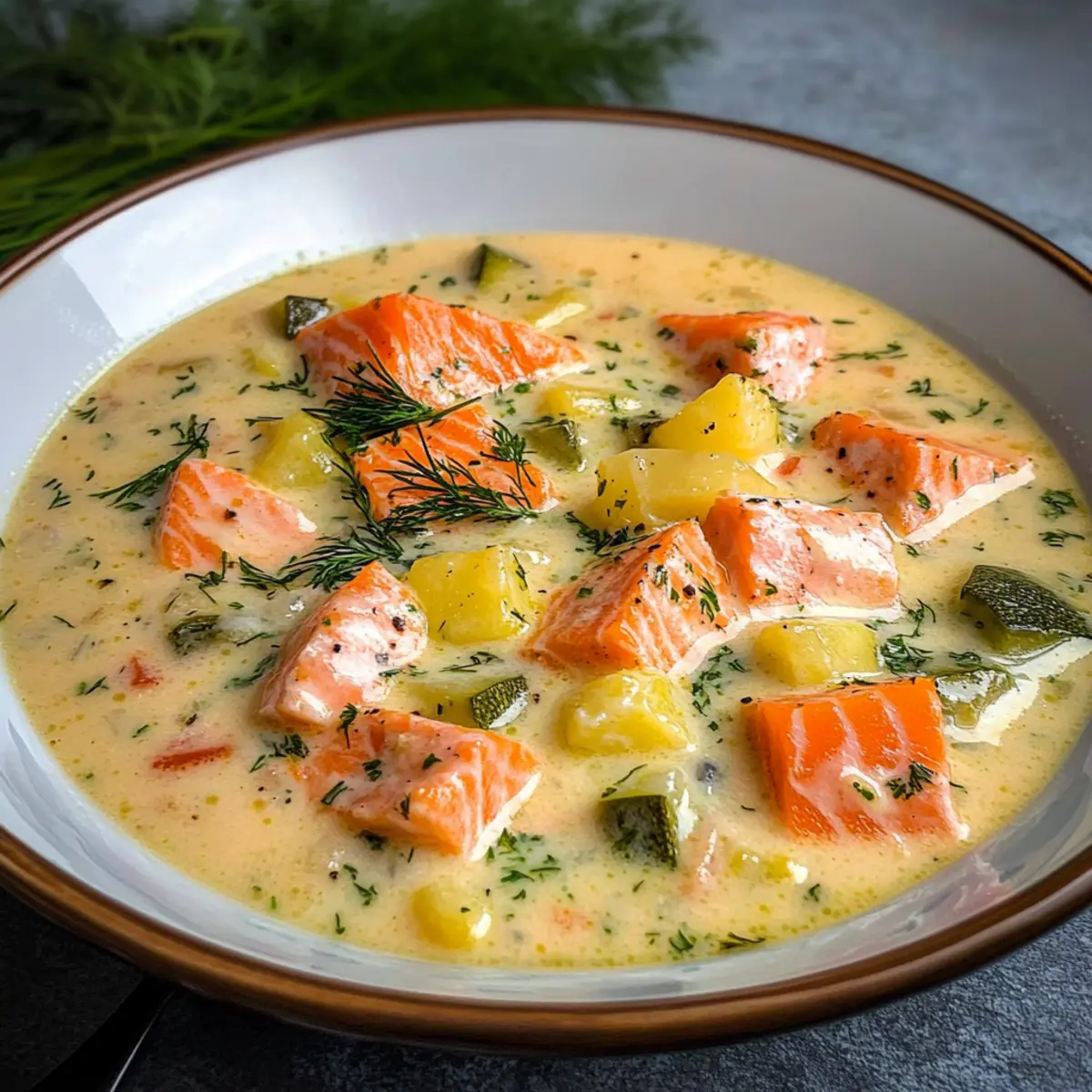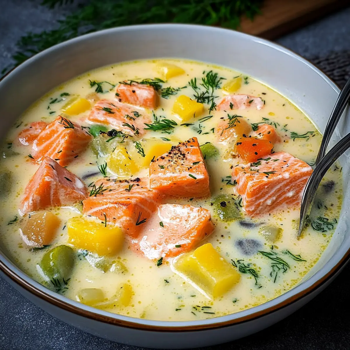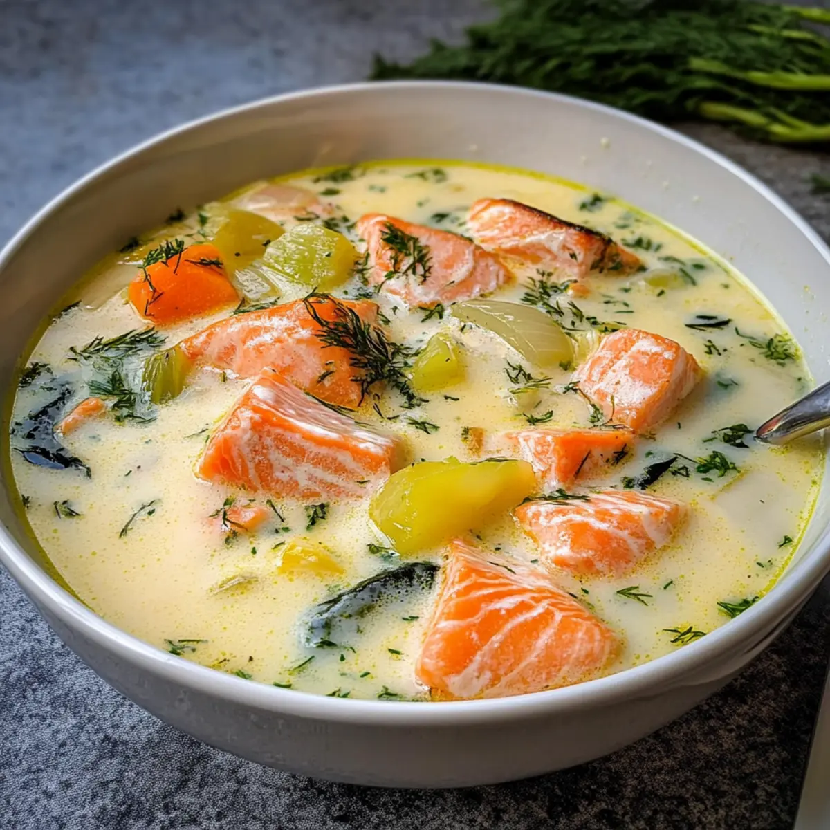 Die kalte Winterzeit verlangt nach etwas Warmem und Herzhaftem – wie dieser köstlichen Finnischen Lachscremesuppe (Lohikeitto). Wenn ich an diesen wohltuenden Genuss denke, überkommt mich das Gefühl von Geborgenheit und Heimat. Diese cremige Suppe mit zartem Lachs und frischen Gemüsestücken ist nicht nur einfach zuzubereiten, sondern auch ein absoluter Publikumsliebling, der garantiert alle am Tisch erfüllte Gesichter zaubert. Egal, ob ihr es euch an einem so frostigen Abend gemütlich machen oder einfach den Geschmack Nordens entdecken möchtet – dieses Rezept wird euch nicht enttäuschen. Seid ihr bereit, eure Küche in eine kleine finnische Wohlfühloase zu verwandeln? Warum ist diese Suppe so besonders? Herzhaft und einladend: Diese Finnische Lachscremesuppe ist der Inbegriff von Komfortessen, perfekt für kalte Tage. Die cremige Textur und die zarten Lachsstücke laden zum Genießen ein, während frisches Gemüse für einen gesunden Kick sorgt. Einfache Zubereitung: Selbst Anfänger in der Küche können mit diesem Rezept punkten – die Schritte sind klar und unkompliziert. Nördlicher Geschmack: Die Kombination aus Dill und frischem Fisch bringt den authentischen Geschmack Finnlands auf euren Tisch. Für die ganze Familie: Ihre wohltuende Wärme macht sie zum idealen Gericht für gemeinsame Abende. Egal ob mit frischem Brot oder als Vorspeise, diese Suppe wird mit Sicherheit zum neuen Lieblingsrezept . Finnische Lachscremesuppe Zutaten Hinweis: Diese Zutatenliste enthält alles, was ihr für die Zubereitung der köstlichen Finnischen Lachscremesuppe benötigt. Für die Brühe Ungesalzene Butter – gibt einen reichhaltigen, cremigen Geschmack und bildet die Basis zum Anbraten. Tipp: Verwende gesalzene Butter, aber reduziere die zusätzliche Salzmenge. Lauch – sorgt für einen milden, süßen Zwiebelgeschmack. Nutze nur den weißen Teil, fein gehackt. Karotte – trägt zur Süße und Farbgebung bei. Kann fein gehackt oder in größeren Stücke gelassen werden, je nach Vorliebe. Kartoffeln – schafft eine herzhafte Textur. Rote Kartoffeln behalten gut die Form; mehlige Sorten wie Maris Piper ergeben eine cremigere Suppe. Lachsfilets – die Hauptzutat, die einen frischen, maritimen Geschmack verleiht. In große Würfel schneiden für eine flakigere Konsistenz in der Suppe. Für die cremige Basis Sahne – schafft eine üppige, reichhaltige Konsistenz. Für eine leichtere Variante kann auch halbfette Sahne verwendet werden; die Suppe wird weniger cremig. Dill – verleiht einen charakteristischen, frischen Kräutergeschmack, der für die Authentizität entscheidend ist. Ersatzstoffe sind nicht empfehlenswert, da getrockneter Dill nicht die nötige Intensität besitzt. Diese Zutaten sind der Schlüssel zu einer köstlichen Finnischen Lachscremesuppe, die alle mit ihrem Geschmack bezaubern wird. Schritt-für-Schritt-Anleitung für Finnische Lachscremesuppe Step 1: Butter schmelzen und Lauch anbraten Erhitze einen schweren Topf bei mittlerer Hitze und schmelze darin die ungesalzene Butter. Füge den fein gehackten Lauch hinzu und brate ihn 7-8 Minuten lang an, bis er weich und leicht glasig ist. Diese Basis sorgt für einen aromatischen und cremigen Geschmack in deiner Finnischen Lachscremesuppe. Step 2: Gemüse hinzufügen und garen Gib die gewürfelte Karotte und die geschälten, gewürfelten Kartoffeln in den Topf und bedecke alles mit Fischbrühe. Lass die Mischung etwa 10 Minuten köcheln, bis die Kartoffeln fast gabelzart sind. Diese Schritt ist entscheidend, um die Aromen der Finnischen Lachscremesuppe richtig zu entfalten. Step 3: Lachs und Sahne integrieren Füge nun die in große Würfel geschnittenen Lachsfilets und die Sahne hinzu. Lasse die Suppe 3-4 Minuten bei niedriger Hitze simmern, bis der Lachs durchgegart und flakig wird. Achte darauf, dass die Suppe nicht kocht, um die zarte Textur des Lachses zu bewahren. Step 4: Dill einrühren und abschmecken Streue den frisch gehackten Dill in die Suppe und lasse sie kurz ziehen, um das Aroma zu intensivieren. Schmecke die Suppe mit Salz und Pfeffer ab. Dieser letzte Schritt bringt den charakteristischen Geschmack der Finnischen Lachscremesuppe perfekt zur Geltung. Step 5: Servieren und genießen Serviere die warme Suppe in tiefen Tellern und garniere sie nach Belieben mit zusätzlichem Dill und einem Spritzer frischem Zitronensaft. Die herzhafte und cremige Konsistenz dieser Finnischen Lachscremesuppe macht sie zur idealen Wahl für kalte Tage. Lagerungstipps für Finnische Lachscremesuppe Zimmertemperatur:: Die Suppe sollte nicht länger als 2 Stunden bei Zimmertemperatur stehen, um die Frische zu bewahren. Kühlschrank:: Bewahre die Finnische Lachscremesuppe bis zu 3 Tage in einem luftdicht verschlossenen Behälter im Kühlschrank auf. Gefrierschrank:: Die Suppe kann bis zu 3 Monate im Gefrierfach aufbewahrt werden. Achte darauf, sie in einem frostbeständigen Behälter einzufrieren, um Gefrierbrand zu vermeiden. Wiederaufwärmen:: Erhitze gefrorene oder gekühlte Suppe sanft bei niedriger Temperatur auf dem Herd, um die zarte Textur des Lachses zu erhalten. Tipps für die beste Finnische Lachscremesuppe Cremigkeitsgrad anpassen: Experimentiere mit der Menge der Sahne, um die perfekte Konsistenz für deine Finnische Lachscremesuppe zu finden. Mehr Sahne bedeutet eine reichhaltigere Suppe. Lachswürfel schneiden: Schneide den Lachs in etwas größere Würfel, damit er während des Kochens flakiger wird und nicht zerfällt. So bleibt die Textur optimal. Abschmecken nicht vergessen: Würze die Suppe erst gegen Ende der Kochzeit. So kannst du die Intensität der Aromen besser kontrollieren und das perfekte Geschmacksprofil erreichen. Gemüse variieren: Füge zusätzliches Gemüse wie Brokkoli oder Blumenkohl hinzu, um der Suppe mehr Textur und Nährstoffe zu verleihen, ohne den klassischen Geschmack zu verlieren. Lagerungshinweise: Bewahre die Suppe im Kühlschrank auf und trenne den Lachs, wenn du sie wieder erhitz