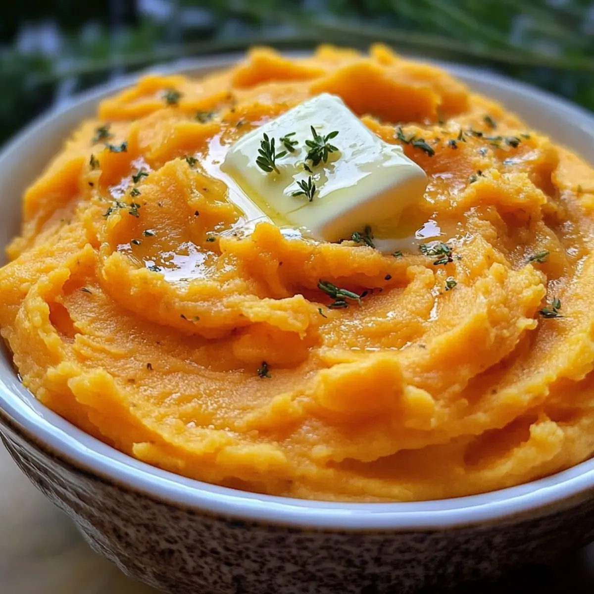 6. Die fluffigen pürierten Süßkartoffeln in eine Servierschüssel übertragen. Optional mit einem Klacks Butter oder frischen Kräutern dekorieren.