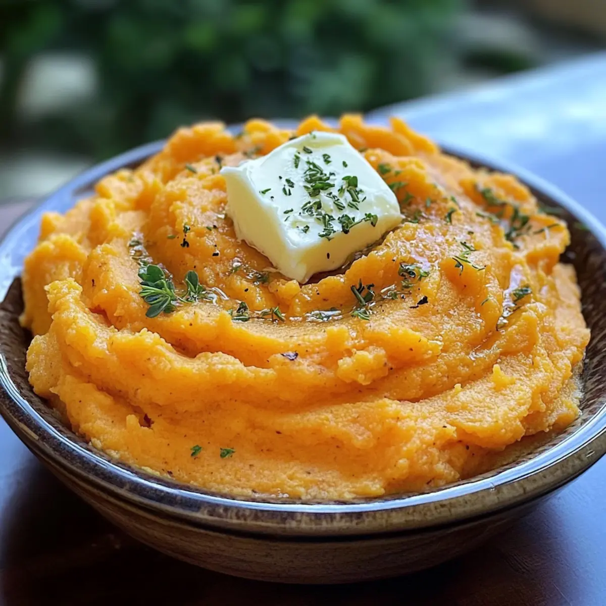 Übertrage die fluffigen pürierten Süßkartoffeln in eine Servierschüssel. Optional kannst du einen kleinen Klacks Butter oder frische Kräuter wie Petersilie oder Thymian obenauf geben, um das Gericht noch ansprechender zu gestalten.