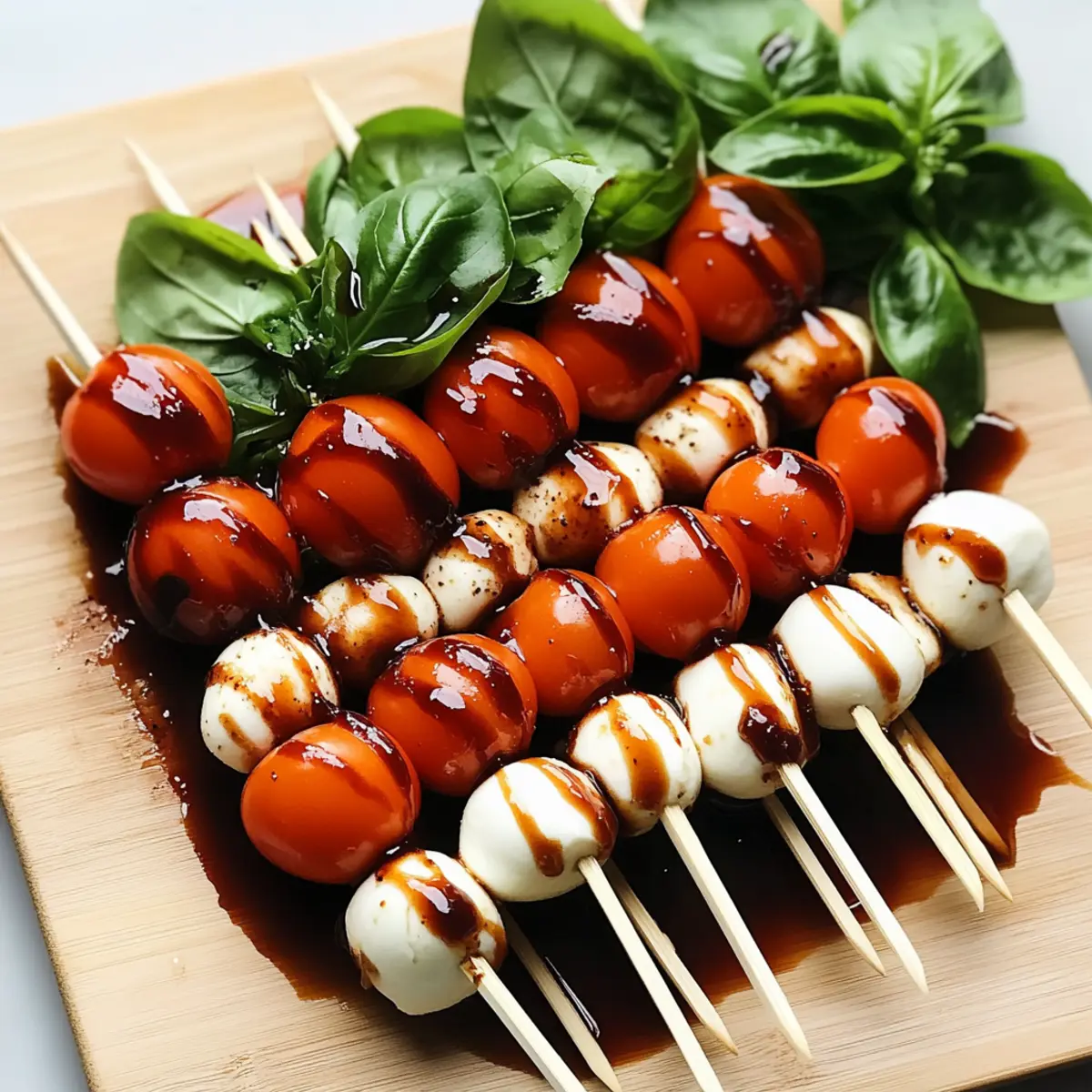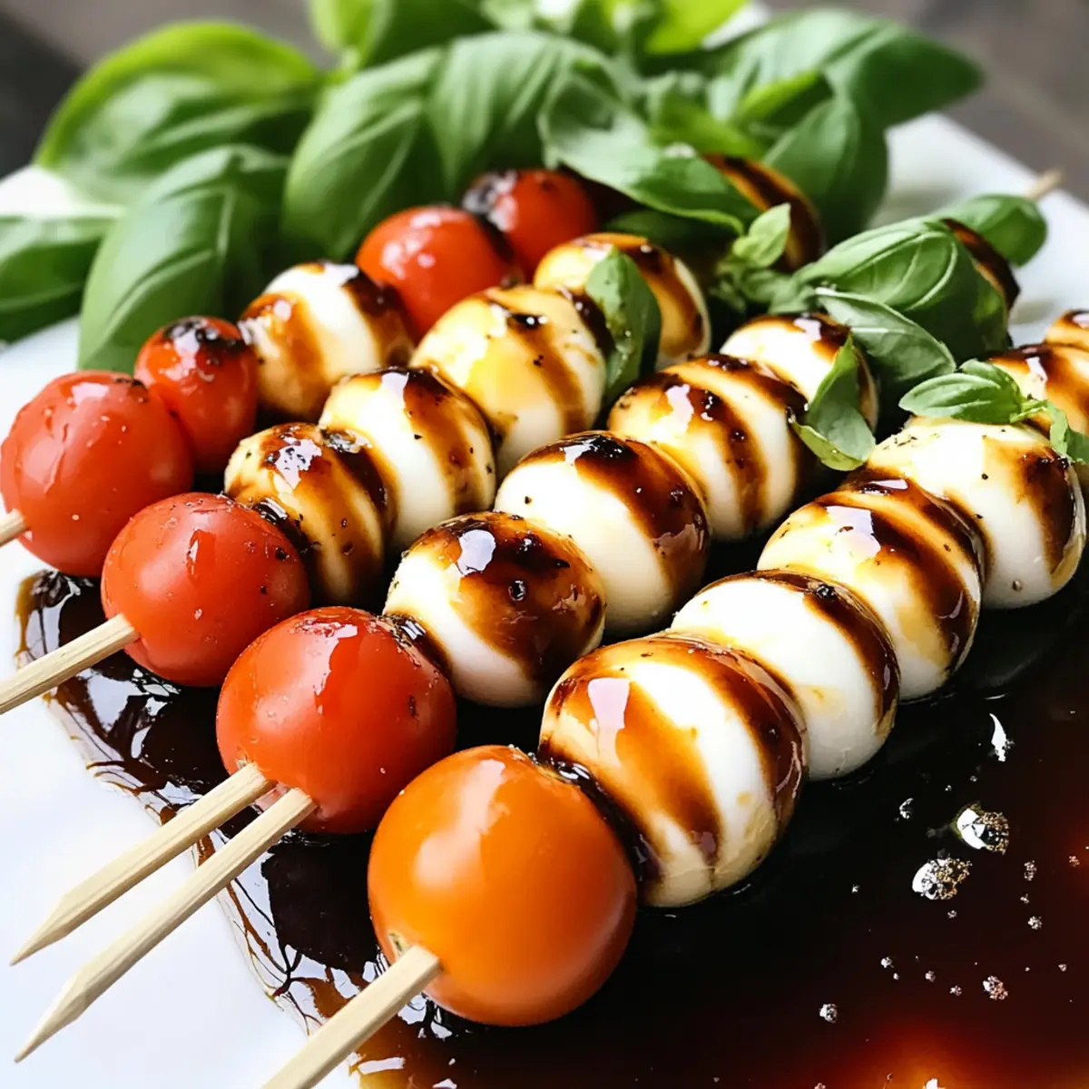 Es war ein warmer Sommerabend und die Luft war voller verlockender Aromen. Während ich mit Freunden im Garten saß, hatte ich einen Geistesblitz: Frische Caprese-Spieße! Diese bunten Häppchen sind nicht nur ein Fest für die Augen, sondern auch für den Gaumen. Sie vereinen saftige Traubentomaten, cremige Mozzarella-Bällchen und aromatische Basilikumblätter zu einer harmonischen Mischung. Als köstlicher, no-cook Sommer-Aperitif sind diese Spieße perfekt für spontane Zusammenkünfte. In kürzester Zeit zubereitet, bringen sie nicht nur Freude auf den Tisch, sondern sind auch eine gesunde, vegetarische Option, die jeder liebt. Bereitere dich darauf vor, deine Gäste mit diesem einfachen, aber beeindruckenden Snack zu begeistern. Bist du bereit für eine köstliche Geschmacksexplosion? Warum wirst du diese Spieße lieben? Einfachheit: Die Zubereitung könnte nicht einfacher sein – du benötigst keine speziellen Kochfähigkeiten, nur frische Zutaten und ein paar Spieße! Erfrischender Geschmack: Die Kombination aus süßen Tomaten, cremigem Mozzarella und aromatischem Basilikum sorgt für ein Geschmackserlebnis, das den Sommer verkörpert. Vielfältig: Diese Spieße sind äußerst anpassungsfähig – füge Prosciutto für eine herzhaftere Version hinzu oder mache sie vegan, indem du die Mozzarella durch marinierte Tofuwürfel ersetzt! Du kannst sie sogar mit grillgemüse ergänzen, um noch mehr Abwechslung zu bieten. Perfekt für Partys: Sie sind das ideale Fingerfood für jeden Anlass, sei es ein Abendessen mit Freunden oder ein entspanntes Picknick im Park. Gesund und köstlich: Diese leichten Spieße sind nicht nur ein Genuss, sondern auch eine gesunde Wahl, um deinen Vitaminbedarf auf leckere Weise zu decken. Frische Caprese-Spieße Zutaten • Für die Spieße Traubentomaten – Diese sorgen für Süße und Saftigkeit; verwende stattdessen Kirschtomaten, wenn gewünscht. Frische Basilikumblätter – Sie liefern den aromatischen Geschmack und eine duftende Kräuternote; verwende für eine Variation auch milde Kräuter wie Minze. Mini-Mozzarella-Bällchen – Sie bieten eine cremige, reiche Textur; ersetze sie durch Feta oder Burrata für einen anderen Geschmack. • Für das Dressing Extra natives Olivenöl – Es wertet das Gericht mit einer fruchtigen Note auf; wähle ein hochwertiges Öl für den besten Geschmack. Balsamico-Reduktion – Fügt eine würzige Tiefe hinzu; ersetze sie durch Balsamico-Essig, wenn die Reduktion nicht verfügbar ist. Meersalz & frisch gemahlener Pfeffer – Diese Zutaten sollten nach Geschmack hinzugefügt werden; sie verbessern die Aromen aller Zutaten. Genieße die frischen Caprese-Spieße als eine köstliche, gesunde und vegetarische Option in deinen Sommerversammlungen! Schritt-für-Schritt-Anleitung für Frische Caprese-Spieße Step 1: Tomaten und Basilikum vorbereiten Wasche die Traubentomaten und die frischen Basilikumblätter gründlich in kaltem Wasser und tupfe sie vorsichtig mit einem Küchentuch trocken. Achte darauf, dass die Zutaten gut abgetrocknet sind, um ein Kleben an den Spießen zu verhindern. Dies sorgt dafür, dass deine Frischen Caprese-Spieße am Ende fantastisch aussehen und schmecken. Step 2: Spieße zusammenstellen Nehme einen Bambusspieß und beginne mit einer Traubentomate, die du auf den Spieß steckst. Füge nun ein Basilikumblatt und eine Mini-Mozzarella-Bällchen hinzu. Wiederhole diesen Vorgang, bis der Spieß schön gefüllt ist, wobei du an beiden Enden ausreichend Platz zum Halten lässt. So kannst du die Frischen Caprese-Spieße mühelos servieren. Step 3: Spieße würzen Wenn alle Spieße fertig zusammengestellt sind, lege sie auf einen großen Teller oder eine Servierplatte. Beträufle die Spieße gleichmäßig mit hochwertigem Olivenöl und Balsamico-Reduktion. Achte darauf, die Flüssigkeiten gleichmäßig zu verteilen, und würze anschließend die Spieße großzügig mit Meersalz und frisch gemahlenem Pfeffer. Dies wird die Aromen deiner Frischen Caprese-Spieße optimal hervorheben. Step 4: Servieren oder kühlen Die zubereiteten Frischen Caprese-Spieße können sofort serviert werden. Wenn du möchtest, lasse sie jedoch für etwa 30 Minuten im Kühlschrank ruhen, damit die Aromen miteinander verschmelzen. Dabei erhalten die Spieße eine noch intensivere Frische. Arrangiere sie anschließend ansprechend auf einem Teller, um deinen Gästen eine ansprechende Präsentation zu bieten. Tipps für die besten Frischen Caprese-Spieße • Frische Zutaten: Achte darauf, nur die frischesten Tomaten, Basilikum und Mozzarella zu verwenden. Sie machen einen großen Unterschied im Geschmack deiner Frischen Caprese-Spieße. • Vorbereitung: Bereite die Spieße bis zu 2 Stunden im Voraus vor und bewahre sie im Kühlschrank auf. So sind sie gut durchgezogen und bereit für deine Gäste. • Variationen: Experimentiere mit verschiedenen Käse-Alternativen wie Feta oder Burrata, um den Geschmack zu variieren und deinen Frischen Caprese-Spießen eine persönliche Note zu geben. • Vermeidung von Kleben: Sorge dafür, dass alle Zutaten gut abgetrocknet sind, um ein Kleben an den Spießen zu verhindern. So behalten sie ihre Form und sehen ansprechend aus. • Wasserbad für Holzspieße: Wenn du Holzspieße verwendest, lege sie 30 Minuten in Wasser, um ein Abbrennen beim Grillen zu vermeiden und sie stabiler zu machen. Variationen & Alternativen für Frische Caprese-Spieße Entdecke, wie du die frischen Caprese-Spieße einfach anpassen kannst, um noch mehr Geschmack und Vielfalt in deine Sommerpartys zu bringen! Mit Prosciutto: Füge für einen herzhaften Twist dünne Scheiben Prosciutto hinzu. Diese Ergänzung bringt einen salzigen Kontrast, der perfekt zu den frischen Zutaten passt. Oliven hinzufügen: Verwende Kalamata- oder grüne Oliven zwischen den Spießelementen für einen zusätzlicher mediterraner Geschmack. Sie bringen eine salzige Note, die ganz wunderbar harmoniert. Grillgemüse: Ergänze die Spieße mit gegril