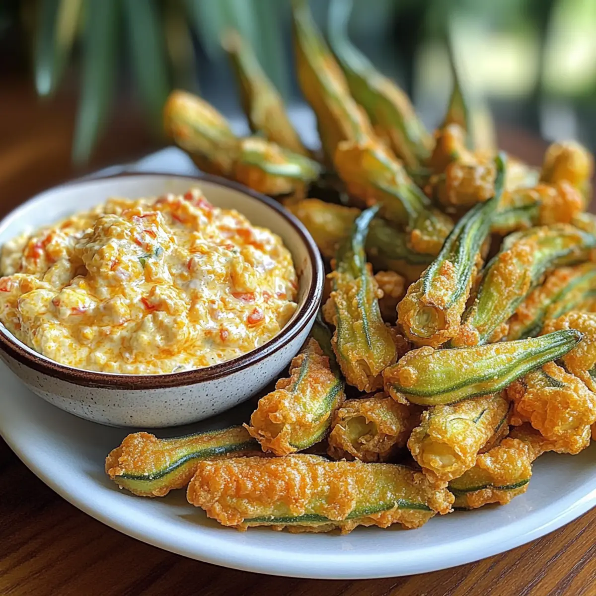 Inmitten einer geselligen Runde präsentierte mir ein Freund die Überraschung des Abends: frittierte eingelegte Okra mit einer cremigen Pimento-Käse-Delikatesse! So einfach, so köstlich – und ich konnte kaum abwarten, dieses Geschmackserlebnis nachzukochen. Diese frittierte Köstlichkeit bietet nicht nur einen herzhaften Crunch, sondern vereint die frische Säure der eingelegten Okra mit dem reichen, cremigen Geschmack des Pimento-Käse-Dips. Ideal für spontane Partys oder gemütliche Abende zu Hause, zaubert dieser Snack im Handumdrehen ein Lächeln auf jedes Gesicht. Und das Beste? Mit nur 20 Minuten Vorbereitungszeit und 25 Minuten Kochzeit wird dein Snack-Tisch im Nu zum Highlight! Bist du bereit, deine eigene Version dieser Southern-Delikatesse zu entdecken? Warum wirst du diese Okra lieben? Einzigartiger Geschmack: Die Kombination aus knuspriger, frittierter Okra und cremigem Pimento-Käse begeistert Gaumen und sorgt für ein einzigartiges Geschmackserlebnis! Vielseitigkeit: Egal, ob du ein schnelles Snack für die Familie zubereitest oder Gäste bewirtest, diese Delikatesse passt zu jedem Anlass. Einfach zuzubereiten: Mit nur wenigen Schritten und einfachen Zutaten kannst du in kurzer Zeit etwas ganz Besonderes zaubern. Geselligkeit: Ob bei Partys oder gemütlichen Abenden, dieser Snack ist ein echter Publikumsmagnet. Und für eine glutenfreie Variante kannst du Pfifferlinge mit Spinat oder Gruenkohl mit Pinkel als Beilage in Betracht ziehen! Zutaten für frittierte eingelegte Okra Erlebe den perfekten Crunch mit diesen Zutaten! Für die Okra Eingelegte Okra – Sorgt für einen würzigen Biss; darauf achten, dass sie gut abgetropft sind. Buttermilch – Fügt Feuchtigkeit hinzu und ist wesentlich für die Panade; Joghurt kann als Ersatz dienen. Maismehl – Macht die Panade knusprig und verleiht einen südlichen Touch; glutenfreies Maismehl ist ebenfalls erhältlich. Weizenmehl – Hilft, die Panade zu binden; glutenfreies Mehl kann alternativ verwendet werden. Paprika – Bringt eine milde Schärfe und lebendige Farbe in die Panade. Cayennepfeffer – Fügt Würze hinzu; nach persönlichem Schärfewunsch anpassen. Öl zum Frittieren – Hoch erhitzbares Öl wie Pflanzenöl ist ideal zum Frittieren. Für den Pimento-Käse-Dip Geriebener scharfer Cheddar – Verleiht dem Dip einen reichen Geschmack und Textur. Frischkäse – Trägt zur Cremigkeit des Dips bei; weich genug für einfaches Mischen. Mayonnaise – Fügt Fülle und Geschmack hinzu; kann durch griechischen Joghurt ersetzt werden. Würfelige Pimentos – Bringt eine süße Paprikanote ins Spiel; darauf achten, dass sie gut abgetropft sind, um überschüssige Feuchtigkeit zu vermeiden. Worcestershiresauce – Verstärkt die Geschmacksvielfalt; optional nach Belieben. Knoblauchpulver – Fügt Würze hinzu; frischer gehackter Knoblauch ist eine gute Alternative. Schritt-für-Schritt-Anleitungen für Frittierte eingelegte Okra mit Pimento-Käse-Delikatesse Step 1: Pimento-Käse zubereiten In einer Schüssel vermischst du den geriebenen Cheddar, Frischkäse, Mayonnaise, die gewürfelten Pimentos, Worcestershiresauce und Knoblauchpulver, bis die Mischung schön cremig wird. Mit Salz und Pfeffer abschmecken und in den Kühlschrank stellen, um die Aromen für etwa 30 Minuten ziehen zu lassen. Step 2: Panierstationen vorbereiten Bereite zwei Schalen vor: Fülle eine mit Buttermilch und die andere mit einer Mischung aus Maismehl, Weizenmehl, Paprika, Cayennepfeffer, Salz und Pfeffer. Rühre die trockenen Zutaten gut um. Diese Stationen helfen dir, die eingelegte Okra gleichmäßig zu panieren. Step 3: Okra panieren Nimm jedes Stück eingelegte Okra und tauche es zuerst in die Buttermilch. Lass überschüssige Flüssigkeit abtropfen, bevor du die Okra in die Maismehlmischung tauchst. Schüttle leicht, um überschüssiges Mehl zu entfernen, und lege die panierten Okra auf einen Teller. Step 4: Öl erhitzen Erhitze in einer großen, schweren Pfanne etwa 2,5 cm Öl auf 180 °C. Um die Temperatur zu testen, streue eine kleine Menge der Panade ins Öl; wenn sie sofort brutzelt, ist das Öl bereit. Achte darauf, die Temperatur während des Frittierens konstant zu halten. Step 5: Okra frittieren Füge die panierten Okra portionsweise in das heiße Öl und frittiere sie 3-4 Minuten lang, bis sie goldbraun und knusprig sind. Wende die Stücke gelegentlich, um eine gleichmäßige Bräunung zu gewährleisten. Arbeite in Chargen, um ein Überfüllen der Pfanne zu vermeiden. Step 6: Abtropfen und servieren Verwende einen Schaumlöffel, um die frittierte Okra auf einen mit Küchenpapier ausgelegten Teller zu übertragen, damit überschüssiges Öl abtropfen kann. Serviere die frittierte eingelegte Okra warm, zusammen mit dem Pimento-Käse-Dip, der die perfekte Ergänzung bietet. Meal Prep für frittierte eingelegte Okra mit Pimento-Käse-Delikatesse Diese frittierte eingelegte Okra mit Pimento-Käse-Delikatesse ist ideal für die Vorbereitung im Voraus, sodass du die ganze Woche über Zeit sparst! Du kannst den Pimento-Käse-Dip bis zu 4-5 Tage im Voraus zubereiten und in einem luftdichten Behälter im Kühlschrank aufbewahren, damit sich die Aromen gut entfalten. Außerdem kannst du die panierten Okra bis zu 24 Stunden vorher vorbereiten und sie bis zum Frittieren im Kühlschrank lagern. Um die Qualität zu erhalten, achte darauf, dass die Okra gut umhüllt sind, damit sie nicht austrocknen. Wenn du bereit bist zu servieren, erhitze das Öl und frittiere die Okra in Chargen, um die perfekte Knusprigkeit zu gewährleisten – so hast du im Handumdrehen eine köstliche, herzhafte Snackvariante! Was passt zu frittierter eingelegter Okra mit Pimento-Käse-Delikatesse? Entdecke die perfekten Begleiter für deine knusprige Okra und den cremigen Dip, die dein Geschmackserlebnis auf die nächste Stufe heben! Frischer Coleslaw: Der knackige und erfrischende Coleslaw kontrastiert köstlich mit dem warmen, frittierten Snack und verleiht dem Gerich