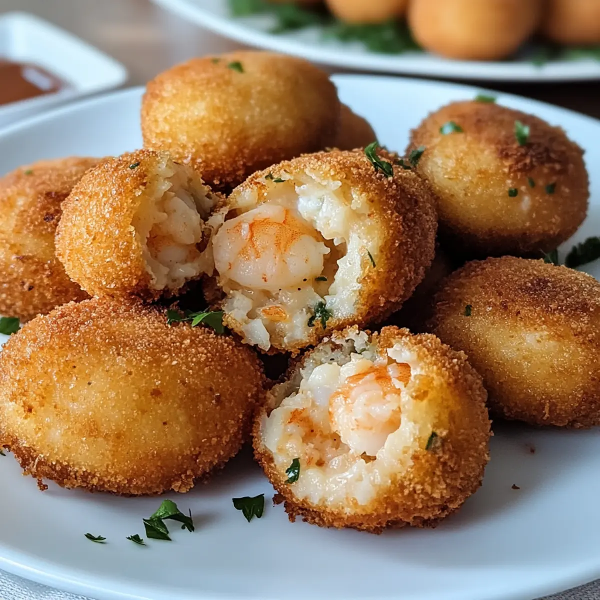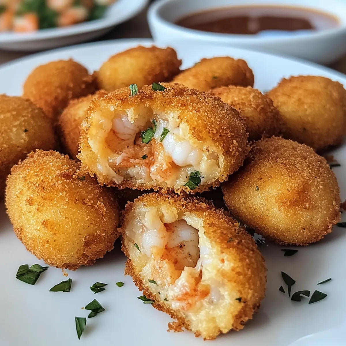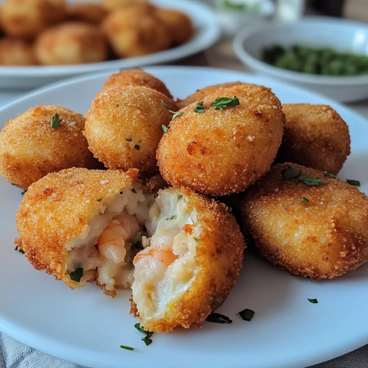 Als ich letztens durch die Straßen eines kleinen portugiesischen Fischerdorfs schlenderte, wurde ich von dem köstlichen Aroma von frisch gefriebene Garnelenkroketten verführt. Diese kleinen Köstlichkeiten aus zartem Shrimp und cremigen Kartoffeln, umhüllt von einer knusprigen Panade, sind nicht nur ein Genuss für den Gaumen, sondern auch eine Augenweide auf jedem Tisch. Perfekt für gesellige Abende und ebenso einfach zuzubereiten, bringen sie die lebhaften Geschmackserlebnisse Portugals direkt nach Hause. Die Garnelenkroketten sind nicht nur ein Publikumsliebling, sondern auch ein wunderbarer Snack, um sich eine Pause von der Fastfood-Routine zu gönnen. Neugierig, wie du diese köstlichen Häppchen selbst zaubern kannst? Lass uns gemeinsam in die Zubereitung eintauchen! Warum sind Garnelenkroketten so besonders? Einfachheit: Die Zubereitung dieser Garnelenkroketten ist kinderleicht und auch für Kochanfänger machbar. Aromenvielfalt: Die Kombination aus frisch gefangenem Shrimp, cremigen Kartoffeln und würzigen Kräutern entfaltet einen unvergesslichen Geschmack, der jeden Gaumen erfreut. Anpassungsfähigkeit: Du kannst die Füllung ganz nach deinem Geschmack gestalten, indem du verschiedene Kräuter ausprobierst oder sogar Käse hinzufügst. Kross und Lecker: Die goldene Panade sorgt für einen knusprigen Biss, der perfekt zu jedem Anlass passt; egal ob als Snack bei einem Filmabend oder als Appetizer bei einer Feier. Beeindruckend: Diese Kroketten sind nicht nur köstlich, sondern auch ein echter Hingucker auf jedem Tisch – ideal, um deine Gäste zu beeindrucken! Genauso wie bei anderen köstlichen Tapas-Rezepten könnte dies dein nächster Lieblingssnack werden! Garnelenkroketten Zutaten Für die Füllung Garnelen – Hauptproteinquelle, die für reichhaltigen Geschmack sorgt; frische oder aufgetaute Garnelen ergeben die besten Ergebnisse. Kartoffelpüree – Fügt Cremigkeit hinzu und wirkt als Bindemittel; Instant-Püree kann für eine schnellere Zubereitung verwendet werden. Frische Kräuter (z.B. Petersilie, Koriander) – Intensiviert den Geschmack und sorgt für Frische; getrocknete Kräuter können im Notfall verwendet werden, allerdings ist der Geschmack weniger lebendig. Knoblauch – Verleiht Aroma und verbessert den Geschmack; frischer, gehackter Knoblauch ist ideal, aber Knoblauchpulver kann bei Zeitmangel genutzt werden. Breadcrumbs – Sorgt für die knusprige Textur; Panko kann für extra Knusprigkeit verwendet werden oder zerbröselte Cracker für eine andere Geschmacksrichtung. Ei – Verbindet die Zutaten und hilft der Panade zu haften; ein Flachsei eignet sich als vegane Alternative. Gewürze (Salz, Pfeffer, Paprika) – Essentiell für die Würzung der Garnelenfüllung; anpassen für milde oder kräftige Aromen. Für das Frittieren Öl – Zum Frittieren der Kroketten; Sonnenblumen- oder Erdnussöl eignen sich gut, weil sie hoch erhitzbar sind. Die Garnelenkroketten werden mit Liebe zubereitet und sind ein echter Genuss auf jedem Tisch! Schritt-für-Schritt-Anleitung für Garnelenkroketten Schritt 1: Garnelen vorbereiten Erhitze etwas Öl in einer Pfanne bei mittlerer Hitze. Füge die geschälten und entdarmten Garnelen sowie den gehackten Knoblauch hinzu. Sautiere die Garnelen für etwa 3-4 Minuten, bis sie rosa und durchgegart sind. Achte darauf, dass sie nicht überkochen, um eine zähe Textur zu vermeiden. Nimm die Pfanne vom Herd und lasse die Garnelen etwas abkühlen. Schritt 2: Füllung herstellen Gib die abgekühlten Garnelen in eine Schüssel und zerdrücke sie mit einer Gabel oder einem Löffel. Füge das Kartoffelpüree, frische gehackte Kräuter, Salz, Pfeffer und Paprika hinzu. Mische alles gründlich, bis eine homogene Füllung entsteht. Probiere die Mischung und passe die Gewürze nach Geschmack an, um deine perfekten Garnelenkroketten zu kreieren. Schritt 3: Kroketten formen Nimm mit deinen Händen kleine Portionen der Füllung und forme sie zu kleinen Bällchen oder Patties. Achte darauf, dass alle Kroketten gleich groß sind, damit sie gleichmäßig garen. Lege die geformten Kroketten auf einen mit Backpapier ausgelegten Teller, während du die restlichen formst. Schritt 4: Kroketten panieren Bereite eine Schüssel mit geschlagenem Ei vor und eine zweite mit Paniermehl. Tauche jede Krokettenform zuerst in das Ei, sodass sie gut benetzt ist, und rolle sie dann im Paniermehl, bis sie gleichmäßig bedeckt sind. Dadurch erhalten die Garnelenkroketten eine köstliche, knusprige Kruste beim Frittieren. Schritt 5: Kroketten frittieren Erhitze in einer tiefen Pfanne ausreichend Öl bei mittlerer bis hoher Hitze. Sobald das Öl heiß ist (ein Stück Brot sollte darin brutzeln), gib vorsichtig die panierten Kroketten hinein. Brate sie für etwa 4-5 Minuten pro Seite, bis sie goldbraun und knusprig sind. Überfüll die Pfanne nicht, um eine gleichmäßige Frittierung zu gewährleisten. Schritt 6: Servieren Nimm die fertigen Garnelenkroketten mit einer Schaumkelle aus der Pfanne und lasse sie auf Küchenpapier abtropfen, um überschüssiges Öl zu entfernen. Serviere die warmen Kroketten sofort mit einer würzigen Dipsauce oder einem frischen Salat. Lass dir diese knusprigen Köstlichkeiten schmecken und genieße die Aromen Portugals! Nützliche Tipps für Garnelenkroketten Öltemperatur prüfen: Achte darauf, dass das Öl heiß genug ist, bevor du die Kroketten hinzufügst; teste dies mit einem kleinen Stück Brot, das brutzeln sollte. Nicht überfüllen: Vermeide es, zu viele Kroketten auf einmal zu frittieren, da dies die Öltemperatur senkt und die Knusprigkeit beeinträchtigt. Füllung abkühlen: Lass die Füllung nach dem Kochen der Garnelen etwas abkühlen, bevor du die Kroketten formst. So bleibt die Masse besser zusammen und wird leicht zu handhaben. Panade nicht skippen: Der Panade eine besondere Note geben: Panko für extra Knusprigkeit verwenden oder experimentiere mit zerbröselten Crackern für abwechselnde Geschmäcker. Variationen 