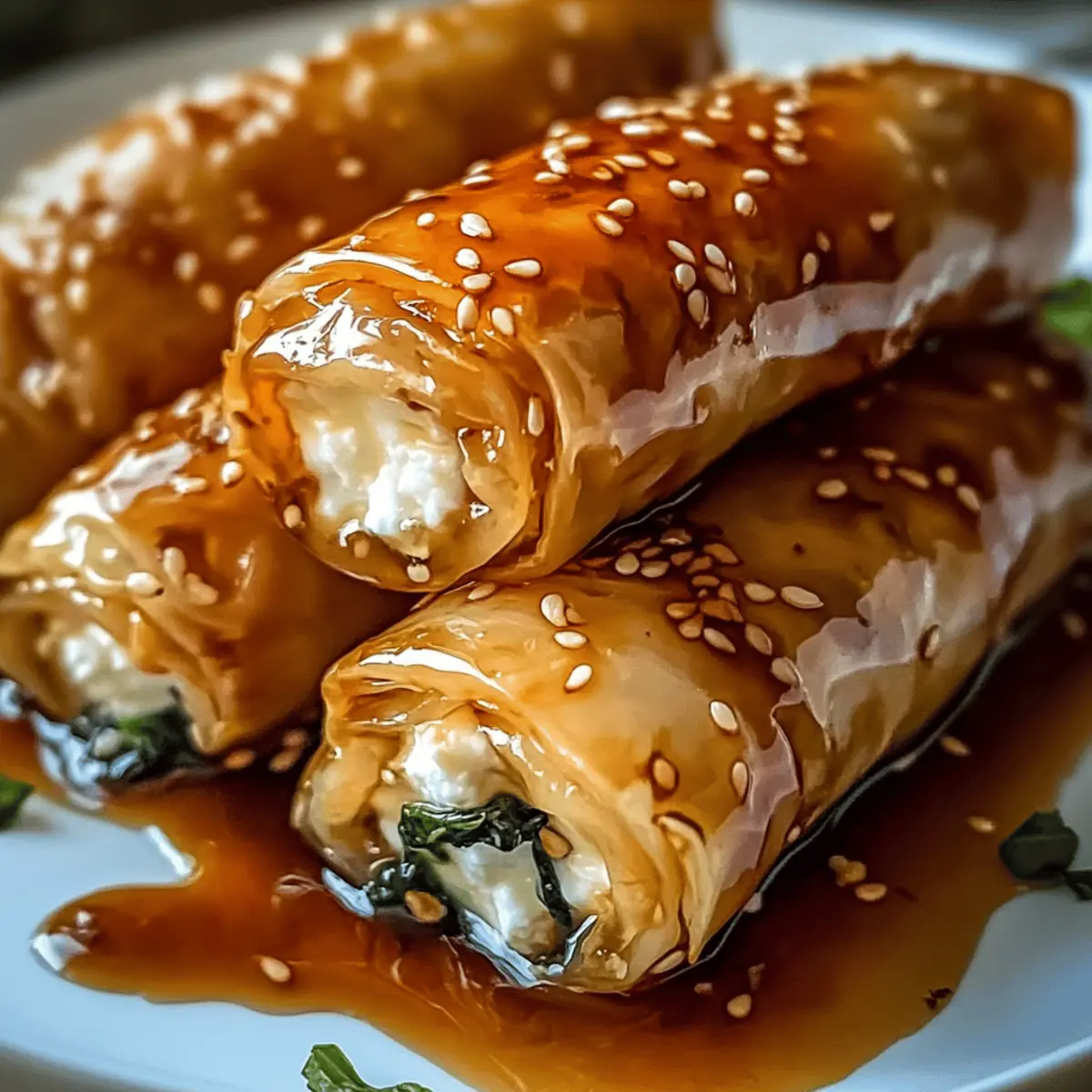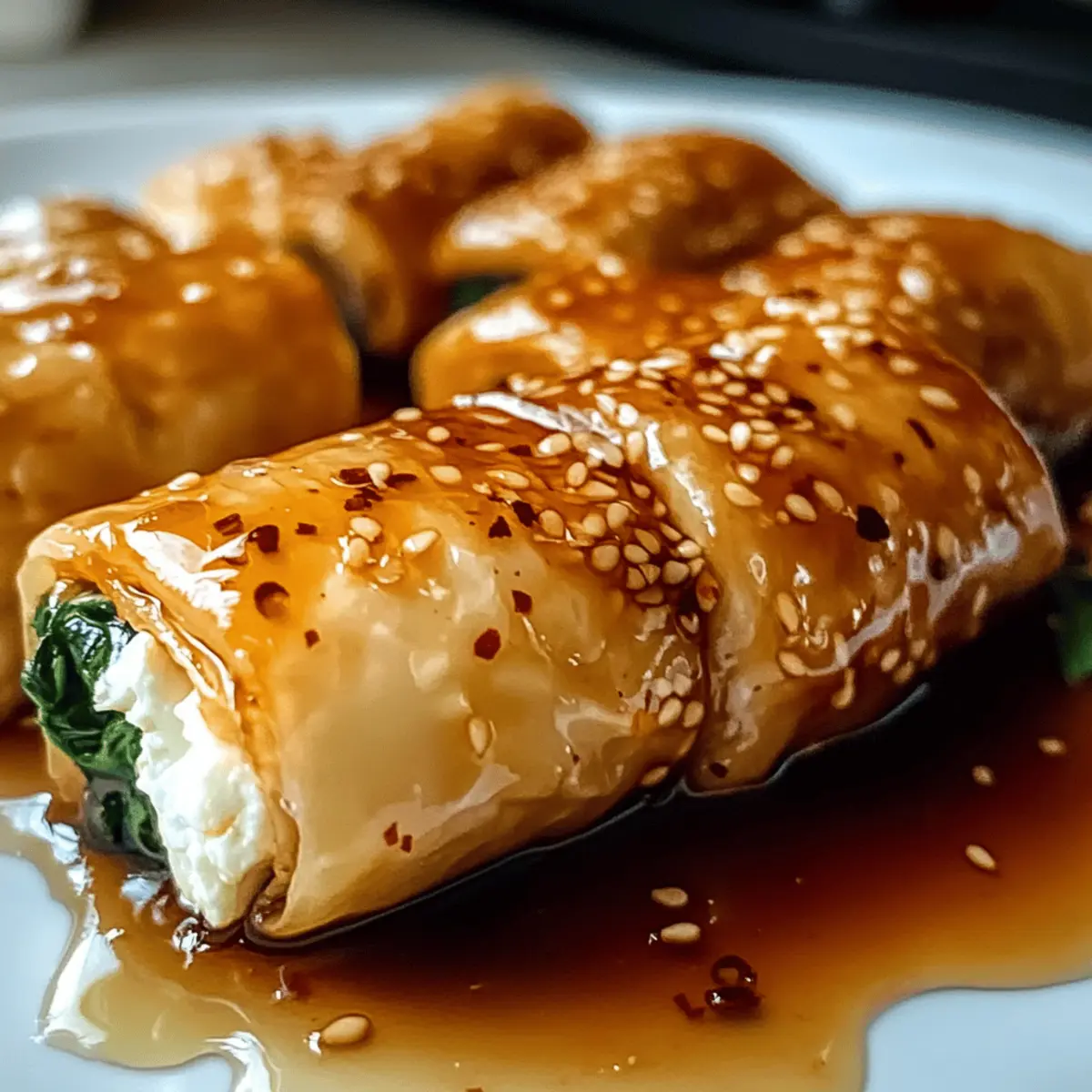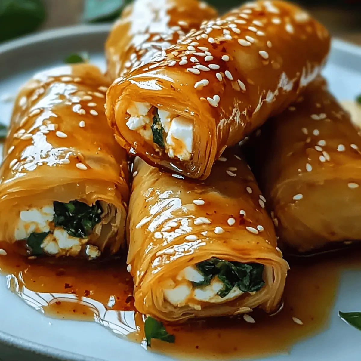Ein unerwarteter Besuch steht bevor, und mein Kühlschrank ist fast leer – aber ein Blick auf die Reste offenbart das i-Tüpfelchen: Feta-Käse! Ich finde mich plötzlich vor dem Ofen wieder, während ich mit phyllo Teig und einer Prise Chili-Honig kreative Ofen gebackene Feta-Röllchen mit Chili-Honig zaubere. Diese köstlichen Snacks sind nicht nur blitzschnell zubereitet, sondern beeindrucken auch jeden Gast mit ihrer knusprigen Textur und dem abgeschmeckten süß-scharfen Belag. Ideal für spontane Zusammenkünfte oder einfach als Snack für zwischendurch – diese Röllchen lassen sich ganz nach Geschmack variieren. Neugierig, wie du diese Geschmacksexplosion selbst zubereiten kannst? Lass uns gemeinsam in die Welt der gebackenen Feta-Röllchen eintauchen! Warum lieben wir gebackene Feta-Röllchen? Einfachheit: Die Zubereitung erfordert nur grundlegende Kochkenntnisse und ist in kurzer Zeit erledigt. Wunderbarer Geschmack: Die Kombination aus cremigem Feta, knackigem Filoteig und einer süß-scharfen Chili-Honig-Glasur sorgt für ein unvergleichliches Geschmackserlebnis. Vielfalt: Ob mit frischem Spinat, sonnengetrockneten Tomaten oder scharfen Jalapeños – die Variationsmöglichkeiten sind nahezu endlos! Perfekt für jede Gelegenheit: Diese Röllchen sind der ideale Snack für Partys oder gemütliche Abende; sie treffen immer auf Begeisterung. Gesund und lecker: Mit frischen Zutaten sind sie nicht nur lecker, sondern auch eine gesunde Wahl, die schnell zubereitet ist. Wusstest du, dass du die Feta-Röllchen sogar im Voraus zubereiten und im Kühlschrank aufbewahren kannst? Probier sie aus und erlebe, wie sie sich perfekt als Snack für jede Gelegenheit machen! Zutaten für gebackene Feta-Röllchen Für die Füllung Feta-Käse – sorgt für den cremigen und salzigen Geschmack der Röllchen; Ricotta oder Ziegenkäse sind ebenfalls gute Alternativen. Blattspinat (frisch oder gefroren) – bringt Farbe und Nährstoffe ins Spiel; frischer Spinat bietet den besten Geschmack. Getrockneter Oregano – verleiht eine herzhafte Note; kann durch Thymian oder italienische Kräutermischungen ersetzt werden. Chili-Flocken – geben der Füllung eine angenehme Schärfe; passe die Menge nach deinem Geschmack an oder ersetze sie durch frische Chilis. Salz und Pfeffer – die Basisgewürze für eine geschmackliche Abrundung; nach Belieben verwenden. Für den Teig Filoteig – sorgt für die knusprige Textur; Pâte feuilletée kann im Notfall verwendet werden. Olivenöl – bringt Feuchtigkeit und einen reichhaltigen Geschmack; geschmolzene Butter ist eine weitere köstliche Wahl. Eigelb – für die Eiwäsche, um eine goldbraune Kruste zu erzielen; für vegane Varianten einfach weglassen. Für die Glasur Honig – bildet das süße Gegengewicht zur Salzigkeit des Fetas; für eine vegane Variante kann auch Ahornsirup verwendet werden. Step-by-Step Instructions für gebackene Feta-Röllchen mit Chili-Honig Step 1: Spinat vorbereiten Falls du gefrorenen Spinat verwendest, taue ihn auf und drücke überschüssiges Wasser aus. Bei frischem Spinat blanchiere ihn für etwa 2 Minuten in kochendem Wasser und kalte ihn dann ab, um die Farbe zu fixieren. Der Spinat sollte nach der Zubereitung gut ausgedrückt und bereit zur Verwendung sein. Step 2: Füllung mischen Krümle den Feta-Käse in eine große Schüssel und füge den vorbereiteten Spinat, getrockneten Oregano, Chili-Flocken, sowie Salz und Pfeffer hinzu. Vermische alles gründlich, bis die Zutaten gleichmäßig verteilt sind. Diese Mischung ist die Grundlage für die köstlichen gebackenen Feta-Röllchen mit Chili-Honig. Step 3: Filoteig vorbereiten Nehme den Filoteig und lege 1 bis 3 Blätter übereinander auf eine saubere Arbeitsfläche. Bestreiche jedes Blatt gründlich mit Olivenöl mithilfe eines Pinsels. Je mehr Schichten du verwendest, desto knuspriger wird der Teig. Achte darauf, den Teig nicht austrocknen zu lassen, während du arbeitest. Step 4: Röllchen füllen und rollen Platziere einen Esslöffel der Feta-Spinat-Füllung am unteren Rand des Filoteigs. Rolle das Teigblatt von unten nach oben fest auf, während du die Seiten einklappst, um die Füllung einzuschließen. Diese Technik sorgt dafür, dass die Röllchen während des Backens nicht auseinanderfallen. Step 5: Backen Heize den Ofen auf 200°C vor. Platziere die gefüllten Röllchen auf einem mit Backpapier ausgelegten Blech. Bestreiche die Oberseiten der Röllchen mit Eigelb, um eine schöne goldene Farbe während des Backens zu erzielen. Backe die Röllchen für etwa 25 Minuten, bis sie goldbraun und knusprig sind. Step 6: Chili-Honig vorbereiten Während die Röllchen im Ofen sind, erhitze den Honig in einem kleinen Topf bei mittlerer Hitze. Füge nach Belieben Chili-Flocken hinzu und rühre gut um, bis eine gleichmäßige Konsistenz entsteht. Dies wird ein süß-scharfer Drizzle für deine gebackenen Feta-Röllchen mit Chili-Honig sein. Step 7: Warm servieren Lasse die Röllchen nach dem Backen kurz abkühlen, um die Füllung zu festigen. Drizzle dann den Chili-Honig über die Röllchen und serviere sie warm als köstlichen Snack oder als Vorspeise. Achte darauf, sie schnell zu genießen, damit die knusprige Textur erhalten bleibt. Lagerungstipps für gebackene Feta-Röllchen mit Chili-Honig Raumtemperatur: Wenn du die Röllchen nicht sofort servierst, lasse sie abkühlen und bleibe dann nicht länger als 2 Stunden bei Raumtemperatur, um die Frische zu bewahren. Kühlschrank: Lagere die Röllchen in einem luftdichten Behälter im Kühlschrank, um sie bis zu 3 Tage frisch zu halten. Vor dem Servieren kurz im Ofen aufwärmen, um die Knusprigkeit wiederherzustellen. Gefrierschrank: Gefrier die ungebackenen Röllchen bis zu 2 Monate in einem geeigneten Behälter oder Beutel; backe sie direkt aus dem Gefrierschrank, erhöhe jedoch die Backzeit um 5-10 Minuten. Wiedererwärmen: Heize den Ofen auf 180°C vor und backe die Röllchen 10-15 Minuten, bis sie heiß und knusprig sind, um