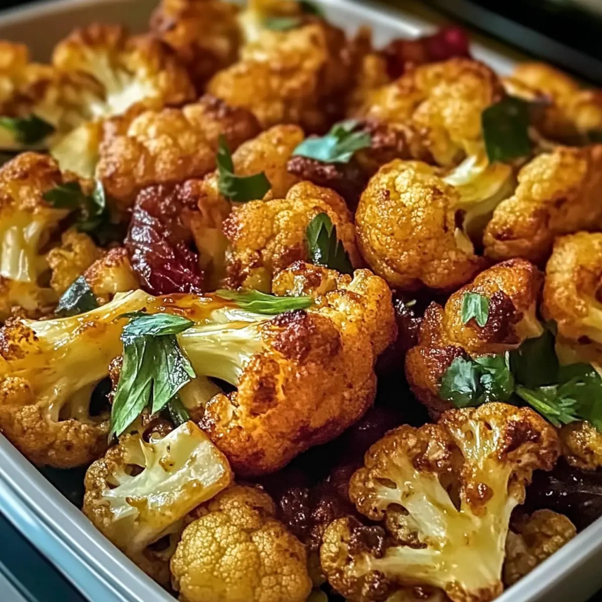 Die Zubereitung von gebratenem Blumenkohl mit Honig-Curry ist ideal für alle, die Zeit sparen möchten, denn viele Komponenten lassen sich bereits bis zu 24 Stunden im Voraus vorbereiten. Du kannst den Blumenkohl in Röschen schneiden und ihn in einem luftdicht verschlossenen Behälter im Kühlschrank aufbewahren, um seine Frische zu bewahren. Die Marinade aus Olivenöl, Honig und Gewürzen kann ebenfalls im Voraus gemischt werden — so sind die Aromen bereits perfekt vereint, wenn du bereit bist, das Gericht zuzubereiten. Am Zubereitungstag einfach die marinierten Röschen auf ein Backblech verteilen und für 20-25 Minuten rösten, dabei nach der Hälfte der Garzeit umdrehen. Diese Vorbereitungen garantieren, dass dein gebratener Blumenkohl mit Honig-Curry genauso köstlich bleibt, wie du es dir wünschst, während sie deine Kochzeit erheblich verkürzen!