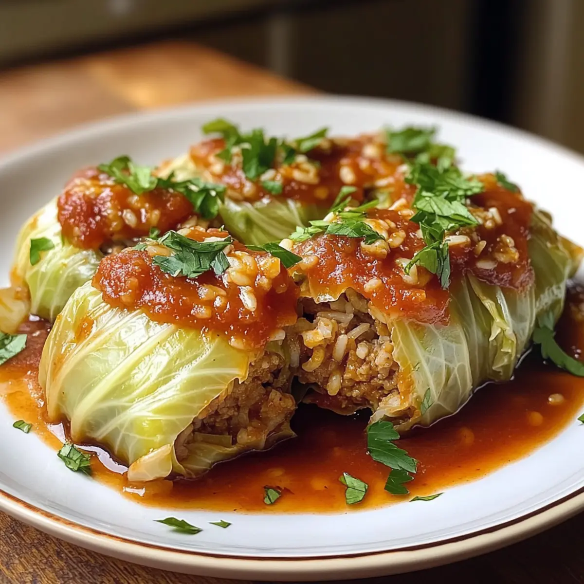 Nach dem Backen nimm die gefüllten Napa-Kohlrouladen aus dem Ofen, lasse sie kurz abkühlen und garniere sie mit frisch gehackter Petersilie. Serviere die Rouladen heiß, idealerweise mit einer Beilage aus frischem Brot oder einem knackigen Salat.