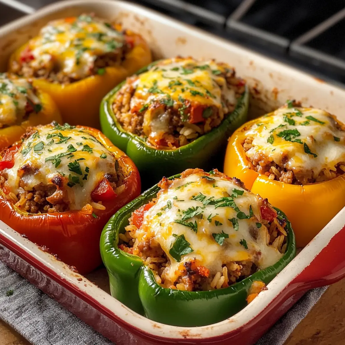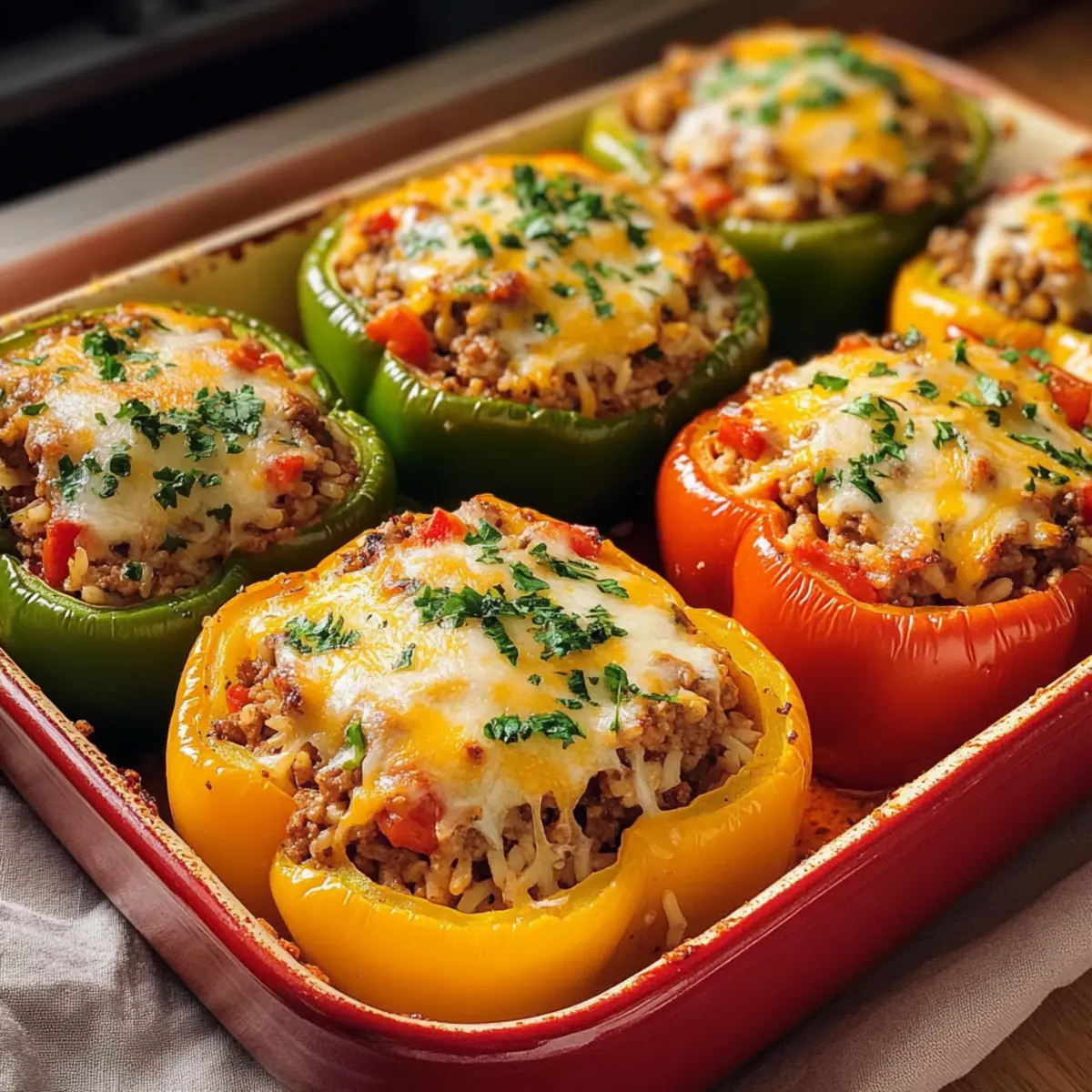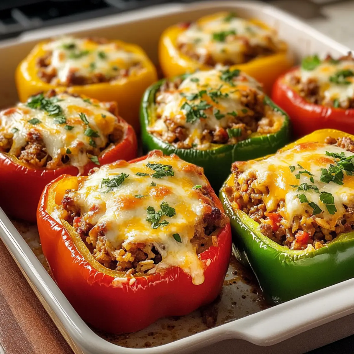 Die leuchtenden Farben frisch gefüllter Paprika ziehen wirklich alle Blicke auf sich! Wenn ich an den letzten Familienabend denke, erinnere ich mich daran, wie diese gefüllten Paprika Klassiker nicht nur gut aussahen, sondern auch den Raum mit einem herzlichen Aroma erfüllten. Diese einfach zuzubereitenden, herzhaften Leckerbissen sind eine hervorragende Wahl, wenn Sie Ihren Lieben eine köstliche Mahlzeit bieten möchten, die sich leicht anpassen lässt – ob mit fleischiger oder vegetarischer Füllung. Perfekt für das Abendessen unter der Woche oder als Teil eines gemütlichen Wochenend-Brunchs, die Kombination aus saftiger Füllung und geschmolzenem Käse macht sie garantiert zu einem Hit. Sind Sie bereit, das Geheimnis zum perfekten Genuss dieser klassischen Speise zu entdecken? Warum sind gefüllte Paprika ein Hit? Bunte Präsentation: Die leuchtenden Farben der Paprika machen jedes Gericht zu einer wahren Augenweide, perfekt für besondere Anlässe oder ein gemütliches Familienessen. Einfach anzupassen: Mit fleischlicher oder vegetarischer Füllung sind diese Klassiker vielseitig und passen zu jedem Geschmack. Herzhaft und sättigend: Die Kombination aus saftigem Fleisch und geschmolzenem Käse bietet nicht nur Geschmack, sondern auch ein sättigendes Erlebnis. Zeitsparendes Kochen: In nur wenigen Schritten sind diese gefüllten Paprika bereit für den Ofen – ideal für hektische Wochentage! Klassisches Familienrezept: Sie bringen die Familie zusammen und fördern geselliges Beisammensein, genau wie die Gemüsebrühe für zusätzlichen Geschmack sorgt, ohne zu kompliziert zu sein. Nährstoffreich: Vollgepackt mit Gemüse und Protein, bietet dieses Gericht eine ausgewogene Mahlzeit für die ganze Familie. Gefüllte Paprika Zutaten • Die perfekte Mischung für den Klassiker! Für die Füllung Mittelgroße Paprikaschoten (6 pcs) – Sorgt für Farbe und Crunch; verschiedene Farben verbessern die Präsentation. Rinderhackfleisch (500g) – Hauptzutat für einen herzhaften Geschmack; kann durch Geflügelhackfleisch ersetzt werden. Zwiebel (1 große) – Fügt Tiefe und Süße zur Füllung hinzu. Knoblauch (2 Zehen) – Aromatisiert die Füllung und verstärkt den Geschmack. Reis (150g, ungekocht) – Lockert die Füllung und absorbiert die Aromen. Gehackte Tomaten (400g, aus der Dose) – Bringt Saftigkeit zur Füllung. Gemüsebrühe (100ml) – Sorgt für zusätzliche Feuchtigkeit in der Füllung. Tomatenmark (2 Esslöffel) – Intensiviert den Geschmack und sorgt für eine kräftige Note. Edelsüßes Paprikapulver (1 Teelöffel) – Fügt eine wärmere, wohlschmeckende Note hinzu. Salz und Pfeffer – Für die optimale Würzung der Füllung. Geriebener Käse (150g, z.B. Mozzarella oder Gouda) – Schafft eine goldene, geschmolzene Kruste, perfekt für den letzten Schliff. Frische Petersilie – Garnierung für Farbe und Aroma. Olivenöl (2 Esslöffel) – Für das Anbraten der Füllung und zur Geschmacksentfaltung. Optionale Beilage Frisches Bauernbrot – Perfekt zum Dippen in die köstliche Füllung. Ein grüner Salat – Bringt Frische und eine ausgewogene Ergänzung. Klecks Crème fraîche – Für einen harmonischen Genuss, der die Aromen abrundet. Diese gefällte Paprika sind kinderleicht zuzubereiten und ein Genuss für die ganze Familie – bereit zum Ausprobieren? Schritt-für-Schritt-Anleitung für Gefüllte Paprika Klassiker Step 1: Vorbereitung der Paprika Heizen Sie den Ofen auf 200°C vor, damit er rechtzeitig bereit ist. Waschen Sie die Mittelgroßen Paprikaschoten gründlich, schneiden Sie die Deckel ab oder halbieren Sie sie und entfernen Sie die Kerne sowie die Innenhäute. Legen Sie die Paprikahälften in eine Auflaufform und lassen Sie sie 10 Minuten im Ofen vorbacken, um überschüssige Feuchtigkeit zu entziehen. Step 2: Reis kochen Kochen Sie den ungekochten Reis gemäß der Packungsanweisung in einem Topf mit leicht gesalzenem Wasser. Der Reis sollte bissfest sein, was etwa 15 Minuten dauert. Achten Sie darauf, dass Sie ihn rechtzeitig vom Herd nehmen, denn der Reis wird später in die Füllung gegeben und bei Bedarf etwas nachgaren. Step 3: Hackfleisch anbraten Würfeln Sie die große Zwiebel und die zwei Knoblauchzehen. Erhitzen Sie in einer Pfanne zwei Esslöffel Olivenöl bei mittlerer Hitze und braten Sie das Rinderhackfleisch krümelig an. Fügen Sie die Zwiebeln und den Knoblauch hinzu und dünsten Sie alles für etwa 3-5 Minuten, bis die Zwiebeln weich und goldbraun sind. Step 4: Füllung zubereiten Geben Sie das Tomatenmark und das edelsüße Paprikapulver zum angebratenen Hackfleisch und braten Sie diese kurz mit an. Fügen Sie dann die gehackten Tomaten sowie die Gemüsebrühe hinzu und würzen Sie die Mischung großzügig mit Salz und Pfeffer. Lassen Sie die Füllung 5 Minuten köcheln, bis sie gut durchzieht und aromatisch ist. Step 5: Mischen der Füllung Sobald der Reis gekocht ist, nehmen Sie ihn vom Herd und lassen Sie ihn kurz abkühlen. Mischen Sie den Reis gründlich unter die Hackfleischmasse, bis alles gleichmäßig verteilt und gut vermengt ist. Die gefüllte Paprika Klassiker erhalten dadurch eine saftige und aromatische Füllung. Step 6: Paprika füllen Nehmen Sie die vorgebackenen Paprikahälften aus dem Ofen und füllen Sie jede Hälfte großzügig mit der vorbereiteten Hackfleisch-Reis-Mischung. Streuen Sie den geriebenen Käse gleichmäßig über die gefüllten Paprikas, sodass er beim Backen schmelzen und eine goldbraune Kruste bilden kann. Step 7: Backen im Ofen Setzen Sie die gefüllten Paprikas zurück in die Auflaufform und backen Sie sie für 30-35 Minuten im vorgeheizten Ofen. Halten Sie ein Auge darauf, dass die Paprika weich sind und der Käse goldbraun wird. Dies sorgt nicht nur für ein köstliches Aussehen, sondern auch für einen fantastischen Geschmack. Step 8: Garnieren und servieren Wenn die gefüllten Paprika Klassiker aus dem Ofen kommen, lassen Sie sie kurz abkühlen. Bestreuen Sie sie dann mit frisch geh