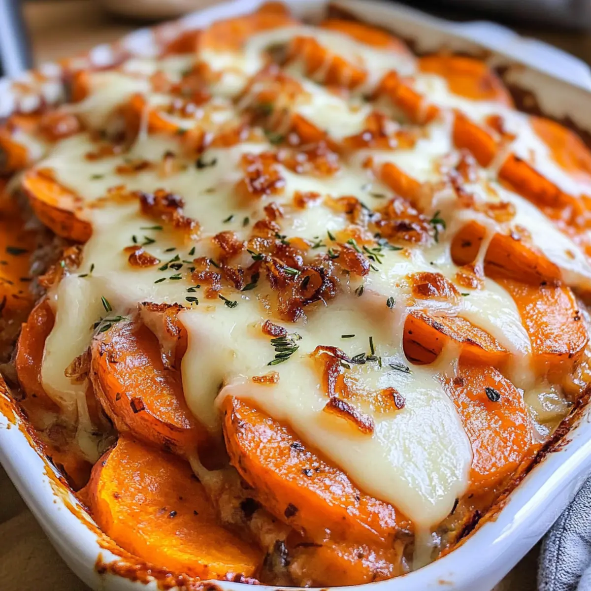 Die goldene Kruste, die aus dem Ofen strömt, hat eine besondere Ausstrahlung, die jeden in den Bann zieht. Wenn ich die Gerösteten Süßkartoffeln au Gratin zubereite, weiß ich, dass ich nicht nur ein Gericht kreiere, sondern eine Erfahrung, die meiner Familie und Freunden schmeichelt. Diese cremige, cheesy Köstlichkeit kombiniert zarte Süßkartoffeln mit süßen Zwiebeln und einer geschmackvollen Mischung aus Cheddar und Parmesan. Das Beste daran? Sie ist nicht nur ein wahres Geschmackserlebnis, sondern auch ein schneller, vegetarischer Begleiter, der jedes Abendessen aufwertet und an Feiertagen für Begeisterung sorgt. Ich lade dich ein, dieses Rezept auszuprobieren und herauszufinden, wie ein einfaches Gericht in ein Highlight deiner Mahlzeiten verwandelt werden kann. Bist du bereit für diesen Käsetraum? Warum wirst du diese Rezept lieben? Einfachheit: Die Zubereitung der gerösteten Süßkartoffeln au Gratin ist kinderleicht und erfordert nur grundlegende Kochkenntnisse. Wurm im Mund: Die Kombination aus süßlichen Süßkartoffeln, zarten Zwiebeln und reichem, cremigem Käse vereint sich zu einem unvergleichlichen Genuss. Vielfältigkeit: Dieses Gericht eignet sich nicht nur als Beilage zu herzhaften Hauptgerichten, sondern kann auch allein serviert werden. Schnelligkeit: Perfekt für beschäftigte Abende; die Zubereitung ist zeitsparend, ohne Kompromisse bei Geschmack und Genuss. Gesundheit: Reich an Vitaminen A und C, ist dieses Gericht nicht nur ein Genuss, sondern auch eine gesunde Wahl für deine Familie. Feste und Feiern: Begeistere deine Gäste an Feiertagen mit dieser auffälligen Speise, die sicher Herzen und Gaumen erobert! Geröstete Süßkartoffeln au Gratin Zutaten Für die Hauptzutaten Süßkartoffeln – Diese bilden die Basis des Gerichts und verleihen eine natürliche Süße. Tipp: Alternativ können Yukon Gold Kartoffeln verwendet werden, wenn du eine weniger süße Variante bevorzugst. Zwiebel – Sie sorgt für einen köstlichen, süßen Geschmack. Hinweis: Gelbe oder weiße Zwiebeln sind ideal. Schlagsahne – Für eine luxuriöse, cremige Textur. Tipp: Halber und halber oder Vollmilch können für eine leichtere Version eingesetzt werden. Scharfer Cheddar-Käse – Bringt eine kräftige Geschmacksnote. Tipp: Milde Cheddar-Varianten sind ebenfalls möglich für eine sanftere Note. Parmesan – Fügt eine salzige, umami-reiche Tiefe hinzu. Hinweis: Geriebener Pecorino Romano ist ein guter Ersatz. Ungesalzene Butter – Zum Sautieren von Knoblauch und zum Verfeinern der Sahnemischung. Tipp: Margarine passt im Notfall auch. Knoblauch – Bereichert die Sahne mit einem aromatischen Duft. Hinweis: Frischer Knoblauch bietet den besten Geschmack, kann aber auch durch Knoblauchpulver ersetzt werden. Frischer Thymian – Verleiht eine erdige, kräuterige Note. Tipp: Dörrobst-Thymian kann im Verhältnis ½ Teelöffel getrocknet pro 1 Teelöffel frisch verwendet werden. Salz – Für die geschmackliche Abrundung. Schwarzer Pfeffer – Fügt eine milde Schärfe hinzu. Muskatnuss – Sorgt für eine wärmende Gewürznote (optional). Hinweis: Kann weggelassen werden, wenn du es schlichter magst. Olivenöl – Verhindert, dass das Gericht im Backblech kleben bleibt. Frische Petersilie – Für eine farbenfrohe Garnierung. Für das Topping Zusätzlicher Cheddar-Käse – Für eine köstliche, goldene Kruste und zusätzlichen Käsegeschmack. Zusätzlicher Parmesan – Um die oberste Schicht noch köstlicher zu gestalten. Mit den Gerösteten Süßkartoffeln au Gratin sorgst du für Moment der Freude und einen Höhepunkt auf jedem Tisch! Schritt-für-Schritt-Anleitung für Geröstete Süßkartoffeln au Gratin Step 1: Ofen vorheizen Heize deinen Ofen auf 190°C (375°F) vor. Diese Temperatur sorgt dafür, dass die Gerösteten Süßkartoffeln au Gratin gleichmäßig garen und die Güte der Käsekruste optimal entfaltet wird. Während der Ofen vorheizt, kannst du das Gemüse vorbereiten. Step 2: Süßkartoffeln schneiden Schäle die Süßkartoffeln und schneide sie in gleichmäßige, dünne Scheiben von etwa 0,5 cm Dicke. Eine Mandoline kann dir helfen, die Scheiben gleichmäßig und einfach zu schneiden. So erhältst du die perfekte Textur für dein Gericht und gewährleistest ein gleichmäßiges Garen. Step 3: Zwiebel schneiden Schneide nun die Zwiebel in dünne Scheiben. Achte darauf, dass sie ähnlich dick sind wie die Süßkartoffelscheiben, damit sie gleichmäßig garen. Die süßen Aromen der Zwiebel werden eine wunderbare Ergänzung zu den Gerösteten Süßkartoffeln au Gratin bringen. Step 4: Butter und Knoblauch anbraten In einem mittelgroßen Topf bei mittlerer Hitze die ungesalzene Butter schmelzen. Füge den frisch gehackten Knoblauch hinzu und brate ihn an, bis er aromatisch ist, etwa 1 bis 2 Minuten. Anschließend gieße die Schlagsahne dazu, um den Basisgeschmack für die cremige Käsemischung zu schaffen. Step 5: Cremige Käsemischung zubereiten Rühre frischen Thymian, Salz, Pfeffer und Muskatnuss in die Sahne ein. Erhitze die Mischung vorsichtig, ohne sie zum Kochen zu bringen, um die Aromen gut zu vermischen. Füge dann die Hälfte des scharfen Cheddars und des Parmesans hinzu und rühre weiter, bis der Käse vollständig geschmolzen ist. Step 6: Auflaufform vorbereiten Fette eine 23×33 cm (9×13 Zoll) große Auflaufform mit etwas Olivenöl ein, um ein Ankleben der Zutaten zu verhindern. Beginne, die Gerösteten Süßkartoffeln au Gratin zu schichten, indem du die Süßkartoffelscheiben gleichmäßig über den Boden der Form legst, gefolgt von einer Lage Zwiebeln und einem Schöpflöffel der cremigen Käsemischung. Step 7: Schichten wiederholen Wiederhole das Schichten der Süßkartoffeln, Zwiebeln und der Käsemischung, bis alle Zutaten verbraucht sind. Stelle sicher, mit einer Schicht der cremigen Sauce abzuschließen, um eine reichhaltige Textur zu gewährleisten, die beim Backen die Geschmackskräfte entfaltet. Step 8: Käse krönen Streue die restlic