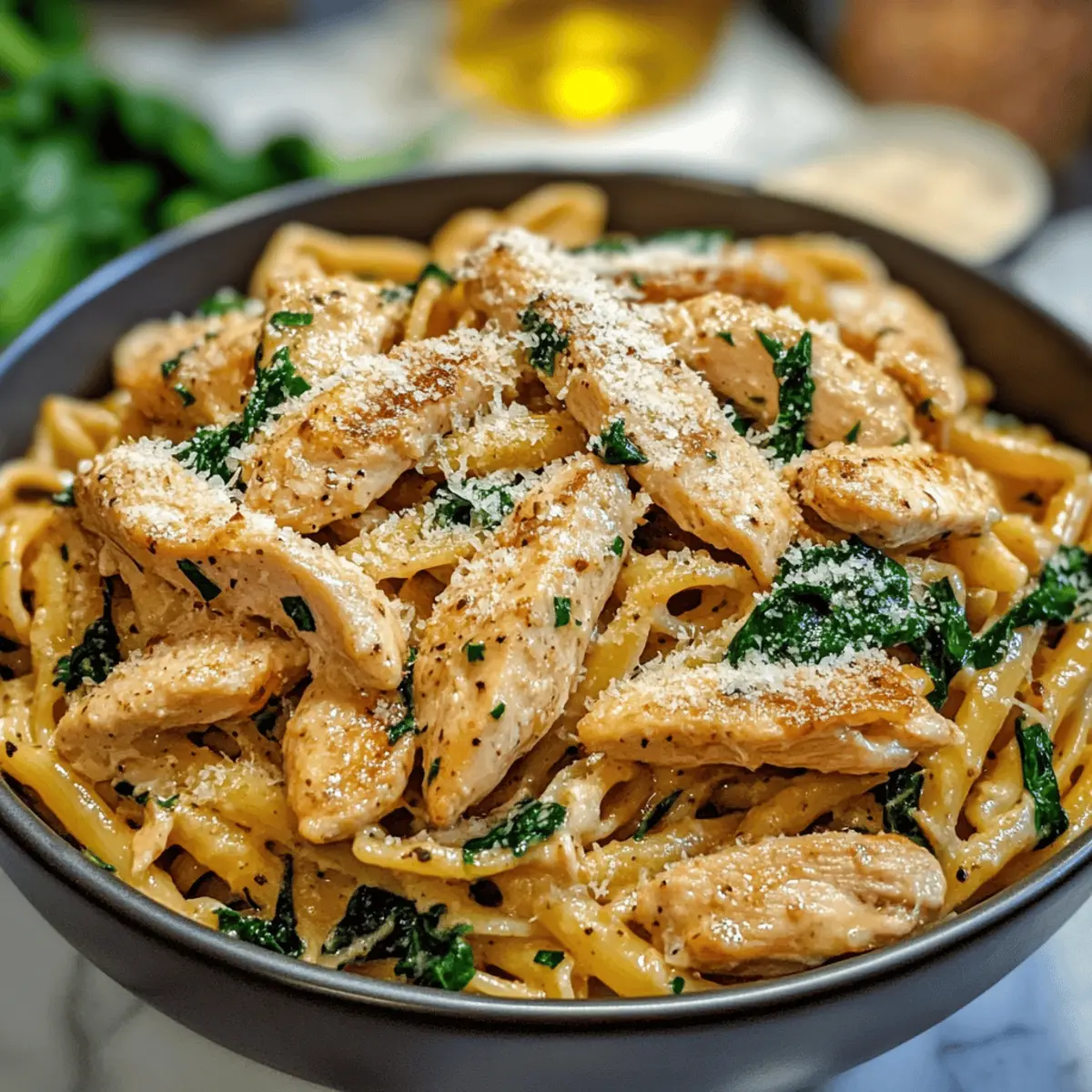 Als ich letztens nach einer sättigenden, aber gesunden Mahlzeit suchte, stieß ich auf das Gesunde Knoblauch Parmesan Hühnchen Pasta Rezept. Diese Kreation vereint die cremige, käsehaltige Genusswelt eines klassischen Pastagerichts mit den Vorteilen einer proteinreichen und kalorienbewussten Ernährung. Mit Zutaten wie griechischem Joghurt und fettfreier Milch zubereitet, bietet es den perfekten Genuss nach dem Workout! Und das Beste daran? Es ist schnell und einfach zuzubereiten, sodass du dir nie wieder eine langweilige Mahlzeit von unterwegs bestellen musst. Sieh dir also an, wie du diese leckere Pasta selbst zubereiten kannst – bereit, deinen Hunger zu stillen und gleichzeitig gesund zu bleiben? Warum wirst du dieses Rezept lieben? Einfachheit pur: Die Zubereitung dieser Gesunden Knoblauch Parmesan Hühnchen Pasta ist kinderleicht, sodass du ganz ohne Kochstress ein köstliches Gericht auf den Tisch zauberst. Vielfältiger Geschmack: Die Kombination aus** Knoblauch, Parmesan und griechischem Joghurt** sorgt für eine cremige Sauce, die geschmacklich überzeugt und dich nicht schwer macht. Gesund und nahrhaft: Mit hochwertigem* Protein aus Hühnchen und** komplexen Kohlenhydraten der Vollkornnudeln** ist dies eine ideale Post-Workout-Mahlzeit. Perfekte Flexibilität: Egal, ob du eine vegetarische Variante mit Tofu oder eine würzige Version mit Pesto ausprobieren möchtest, die Möglichkeiten sind endlos! Schnell und praktisch: In nur 30 Minuten zubereitet, ist dieses Rezept perfekt für einen schnellen Abendessen nach einem langen Tag. Du wirst nie wieder auf Fertiggerichte zurückgreifen wollen! Gesunde Knoblauch Parmesan Hühnchen Pasta Zutaten • Entdecke die perfekten Zutaten für ein gesundes und köstliches Gericht! Für die Pasta • Vollkornnudeln – Sie bieten komplexe Kohlenhydrate für langanhaltende Energie. Substitution: Glutenfreie Pasta für eine glutenfreie Variante. Für das Hühnchen • Hühnchenbrust – Eine magere Proteinquelle, die wichtig für den Muskelaufbau ist. Achte darauf, dass es gewürfelt ist, um die Kochzeit zu verkürzen. Für die Sauce • Olivenöl – Verleiht Geschmack und gesunde Fette beim Kochen. Alternative: Avocadoöl für einen höheren Rauchpunkt. • Knoblauch (gehackt) – Sorgt für eine intensive Geschmacksnote; anbraten, bis er aromatisch ist. Frischer Knoblauch wird für seine Potenz bevorzugt. • Vollkornmehl – Schafft eine leichte Mehlschwitze für die Sauce. Substitution: Allzweckmehl, wenn gewünscht. • Hühnerbrühe – Gibt der Sauce Feuchtigkeit und Tiefe. Substitute: Gemüsebrühe für eine vegetarische Option. • Fettarme Milch – Lässt die Sauce leichter werden im Vergleich zu Sahne. Alternativen: Mandelmilch oder eine andere pflanzliche Milch für eine milchfreie Variante. • Griechischer Joghurt – Bringt Cremigkeit und Protein ohne viele Kalorien. Substitution: Ungesüßter, milchfreier Joghurt für eine vegane Option. • Parmesan Käse (gerieben) – Bietet den charakteristischen Käsegeschmack. Verwende frisch geriebenen Käse für besseren Geschmack. • Spinat (optional) – Fügt Farbe, Nährstoffe und Frische hinzu. Er ist nicht essenziell, verbessert jedoch das Gericht. Garniervorschläge • Frische Petersilie – Verleiht dem Gericht nicht nur Farbe, sondern auch ein frisches Aroma. • Zusätzlicher Parmesan – Für diejenigen, die die Käseliebe wirklich zelebrieren wollen! Mach dich bereit, dieses köstliche Gesunde Knoblauch Parmesan Hühnchen Pasta Rezept in deiner Küche zu probieren! Schritt-für-Schritt-Anleitung für Gesunde Knoblauch Parmesan Hühnchen Pasta Rezept Step 1: Pasta kochen Bringe einen großen Topf mit leicht gesalzenem Wasser zum Kochen. Füge die Vollkornnudeln hinzu und koche sie für 8-10 Minuten bis sie al dente sind. Vergiss nicht, eine Tasse Nudelwasser aufzuheben, bevor du die Pasta abgießt. Dies wird später helfen, die Sauce zu verfeinern. Step 2: Hühnchen anbraten Erhitze in einer großen Pfanne bei mittlerer Hitze 2 Esslöffel Olivenöl. Gib die gewürfelten Hühnchenbruststücke hinein und brate sie für etwa 5-6 Minuten, bis sie goldbraun und durchgegart sind. Verwende eine Zange, um das Hühnchen gleichmäßig zu wenden und setze es dann auf einen Teller zur Seite. Step 3: Knoblauch anbraten In derselben Pfanne den gehackten Knoblauch hinzufügen und für etwa 30-60 Sekunden anbraten, bis er aromatisch ist. Achte darauf, dass der Knoblauch nicht anbrennt, da er sonst bitter werden kann. Die Aromen werden die Basis für die cremige Sauce deiner Gesunden Knoblauch Parmesan Hühnchen Pasta bilden. Step 4: Roux herstellen Streue das Vollkornmehl über den angebratenen Knoblauch und verrühre alles gut, um eine Mehlschwitze zu bilden. Lass die Mischung für etwa 1 Minute kochen, bis sie leicht goldbraun ist. Dies gibt der Sauce eine schöne Tiefe und Konsistenz. Step 5: Sauce köcheln lassen Gieße langsam die Hühnerbrühe und dann die fettarme Milch in die Pfanne, während du ständig rührst. Koche die Mischung auf mittlerer Hitze für 2-3 Minuten, bis die Sauce anfängt einzudicken. Sie sollte eine glatte und cremige Konsistenz erreichen, die perfekt für die Pasta ist. Step 6: Joghurt und Parmesan einrühren Reduziere die Hitze auf niedrig und rühre den griechischen Joghurt und den geriebenen Parmesan unter die Sauce, bis alles gut vermischt ist. Achte darauf, dass die Hitze niedrig bleibt, um ein Gerinnen des Joghurts zu vermeiden. Wenn die Sauce zu dickflüssig ist, füge etwas vom reservierten Nudelwasser hinzu. Step 7: Pasta und Hühnchen kombinieren Gib das gebratene Hühnchen sowie die abgetropften Vollkornnudeln in die Pfanne mit der cremigen Sauce. Füge optional den frischen Spinat hinzu und rühre alles gut um, bis jede Nudel gleichmäßig mit der Sauce bedeckt ist. Lass die Mischung für eine Minute in der Pfanne erwärmen, damit der Spinat weich wird. Step 8: Servieren und Garnieren Verteile die Gesunde Knoblauch Parmesan Hühnchen Pasta au