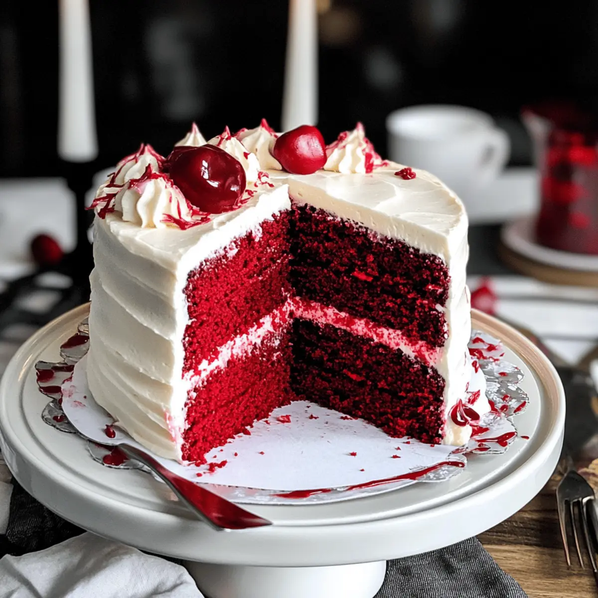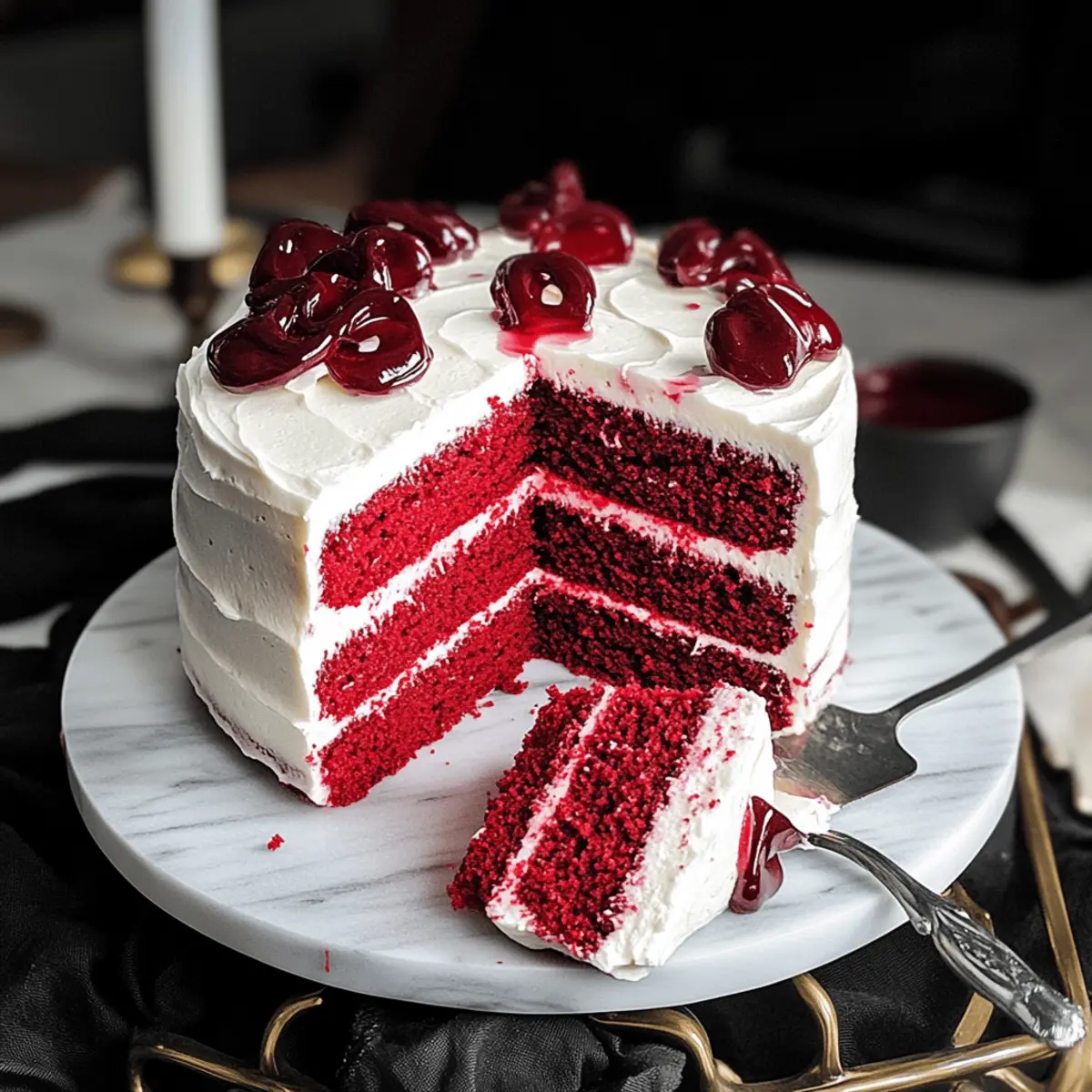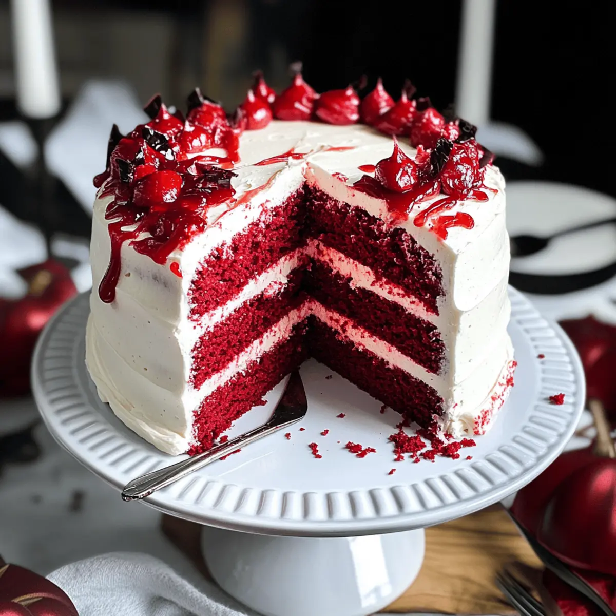 Es war einmal eine klare Halloween-Nacht, als ich von der Idee eines Gruseligen Roten Samtkuchens mit Frischkäse-Frosting träumte. Die lebendige rote Farbe und die cremige, zartschmelzende Glasur bringen nicht nur Freude in eure Küche, sondern verwandeln auch jede Halloween-Feier in ein ganz besonderes Erlebnis. Dieser köstliche Kuchen ist nicht nur einfach zuzubereiten, sondern auch der perfekte Hingucker – ideal für alle, die statt Fast Food lieber selbstgemachten Genuss auf den Tisch bringen möchten. Besonders die Kombination aus fluffig-feuchtem Teig und dessen fruchtige Begleitung aus Himbeeren wird eure Gäste zum Schwelgen bringen. Habt ihr schon Lust auf ein Stück? Warum wird dieser Kuchen begeistern? Einladende Farbe: Die lebendige rote Farbe dieses Kuchens macht ihn zum perfekten Highlight auf jeder Halloween-Feier und zieht die Blicke auf sich. Einfache Zubereitung: Mit einfachen Zutaten und klaren Anweisungen ist dieser Gruselige Rote Samtkuchen auch für weniger erfahrene Bäcker leicht zu meistern. Fluffige Textur: Das Zusammenspiel von feuchtem Teig und luftiger, cremiger Glasur garantiert ein einzigartiges Genusserlebnis, das euer Geschmackserlebnis auf das nächste Level hebt. Kreative Variation: Dieser Kuchen lässt sich leicht abwandeln – probiert unterschiedliche Frostings oder experimentiert mit Gewürzen für eine festliche Note! Idealer Genuss: Perfekt zu einer Tasse Kaffee oder Tee, wird er zum Star bei euren nächsten Zusammenkünften oder Feiertagsfeiern. Und wer eine Lösung für die Reststücke sucht, kann diese einfach aufbewahren! Gruseliger Roter Samtkuchen Zutaten Für den Teig • 3 Eier (Größe M) – Binden die Zutaten, sind essenziell für die Struktur. Veganes Äquivalent: Aquafaba. • 300g Zucker – Für die Süße, unverzichtbar für den Geschmack. Kokosblütenzucker als gesündere Alternative. • 250ml Sonnenblumenöl – Sorgt für Feuchtigkeit, damit der Kuchen zart bleibt. Kann durch Pflanzenöl oder geschmolzenes Kokosöl ersetzt werden. • 1 TL Essig (geschmacklos) – Reagiert mit Backpulver für den Auftrieb. Keine Alternativen empfohlen, um die Wirkung nicht zu beeinträchtigen. • 1 TL Vanillepaste – Verstärkt den Geschmack, bringt Tiefe. Vanilleextrakt als Ersatz möglich. • 200ml Buttermilch (Zimmertemperatur) – Für Feuchtigkeit und Zartheit; alternativ: saure Milch mit Milch und Essig. • 2 TL rote Lebensmittelfarbe – Für die visuelle Wirkung, sorgt für die rote Farbe. Gel-Lebensmittelfarbe empfohlen für mehr Intensität. • 400g Mehl – Hauptbestandteil, sorgt für die Struktur. Glutenfreies Mehl für eine glutenfreie Variante. • 1 EL Kakao – Gibt einen Hauch Schokolade. Dunkler Kakao für einen kräftigeren Geschmack. • 2 TL Backpulver – Treibmittel, das den Kuchen aufgehen lässt. Auf das Haltbarkeitsdatum achten! • Prise Salz – Verstärkt den Geschmack, balanciert die Süße. Unverzichtbar für ein perfektes Aroma. Für das Frosting • 250ml Schlagcreme – Für die Glasur, sorgt für Luftigkeit. Kann durch Schlagsahne ersetzt werden. • 80g Puderzucker – Süßt das Frosting, gibt die richtige Konsistenz. Stevia für eine zuckerfreie Version ist möglich. • 1 TL Vanillepaste – Geschmacksträger für das Frosting, gibt Tiefe. Gleiche Alternativen wie oben verwenden. • Prise Salz – Balanciert die Süße im Frosting; essenziell für den Geschmack. • 600g Frischkäse (Natur) – Hauptbestandteil des Frostings; verleiht eine leicht säuerliche Cremigkeit. Veganer Frischkäse ist eine Alternative. • 400g gefrorene Himbeeren – Für die Soße; bringen Geschmack und Dekoration. Frische Himbeeren verwenden, wenn verfügbar. Schritt-für-Schritt-Anleitung für Gruseliger Roter Samtkuchen Step 1: Ofen vorheizen und Formen vorbereiten Heize den Ofen auf 180°C (356°F) vor. Bereite zwei Ø20 cm Springformen vor, indem du den Boden mit Backpapier auslegst und die Ränder leicht einfettest. So gelingt es, den Gruseligen Roten Samtkuchen später problemlos aus der Form zu lösen. Step 2: Eier und Zucker vermengen Schlage in einer großen Rührschüssel die drei Eier zusammen mit dem Zucker kräftig auf, bis die Mischung hell und cremig ist. Dies dauert etwa 3-5 Minuten. Diese Basis verleiht dem Kuchen die notwendige Struktur und Süße. Step 3: Öl und Aromen hinzufügen Füge nun das Sonnenblumenöl, den Essig, die Vanillepaste, die Buttermilch und die rote Lebensmittelfarbe zu der Eimischung hinzu. Rühre alles gut durch, bis die Masse homogen und schön rot ist. Achte darauf, dass du alle Zutaten gründlich kombinierst, um ein gleichmäßiges Farb- und Geschmacksbild zu erreichen. Step 4: Trockene Zutaten vermengen In einer separaten Schüssel das Mehl, den Kakao, das Backpulver und die Prise Salz gut vermischen. Siebe die trockenen Zutaten, um Klumpen zu vermeiden und die Luftzirkulation zu verbessern. Jetzt ist es Zeit, die trockenen Zutaten nach und nach in die feuchte Mischung zu integrieren. Step 5: Teig zubereiten und backen Vermenge die trockenen Zutaten mit der feuchten Mischung, bis alles gut vermischt ist und ein glatter Teig entstanden ist. Teile den Teig gleichmäßig auf die beiden vorbereiteten Springformen auf. Backe die Kuchen für etwa 50-60 Minuten. Mache den Zahnstocher-Test, um sicherzustellen, dass der Teig durchgebacken ist. Step 6: Kuchen abkühlen lassen Lasse die Kuchen anschließend vollständig in den Formen abkühlen, bevor du sie vorsichtig herausnimmst. Dies verhindert, dass der Gruselige Rote Samtkuchen bricht. Warte mindestens eine Stunde, bis sie Raumtemperatur erreicht haben. Step 7: Frosting zubereiten Schlage in einer Schüssel die Schlagcreme zusammen mit dem Puderzucker, der Vanillepaste und der Prise Salz, bis sich kräftige Spitzen bilden. Füge dann den Frischkäse langsam hinzu und rühre vorsichtig, um eine glatte, cremige Konsistenz zu erreichen. Dies wird dem Kuchen ein köstliches, cremiges Finish verleihen. Step 8: Himbeersoße zubereite
