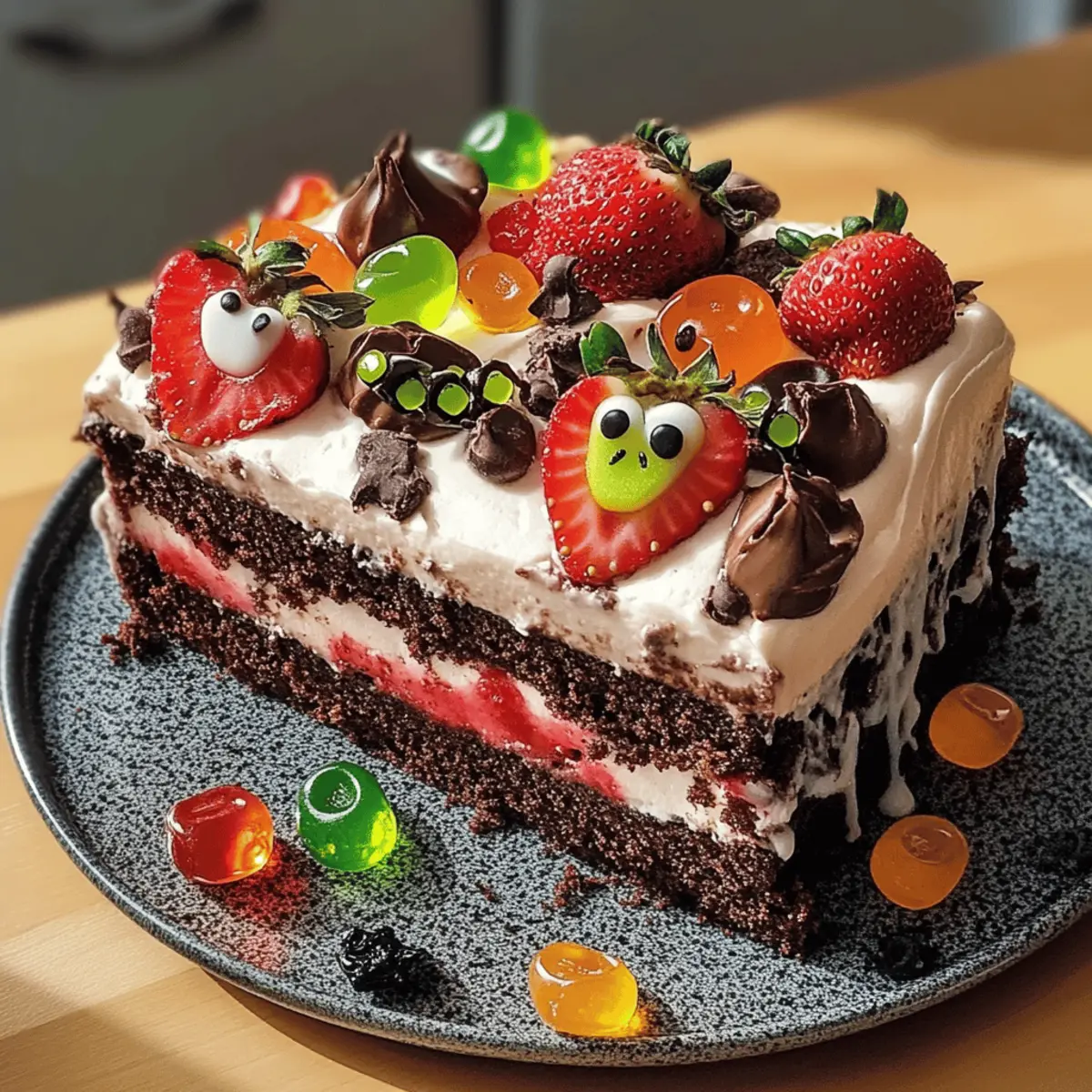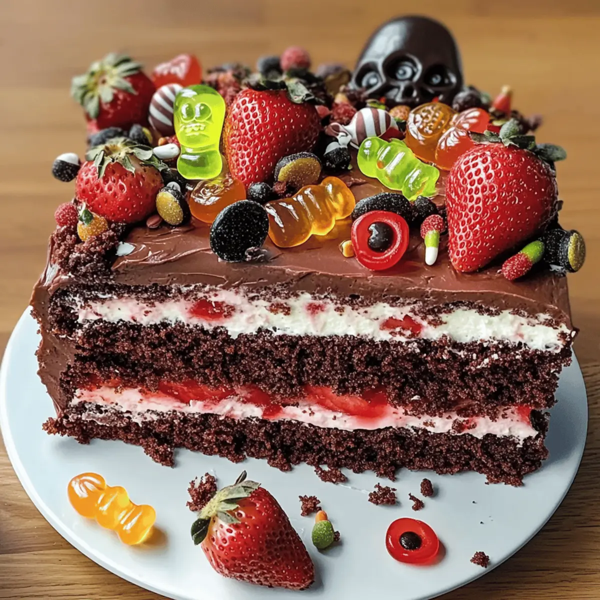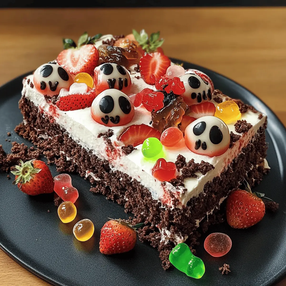 Irgendwo im Herzen meines Küchenuniversums hängt ein überdimensionaler Spinnenblick aus Zucker und Schokolade, der die kleinen Gäste begeistert. Diese gruselige Atmosphäre kann nur durch meinen Gruselkuchen entstehen, der mit einem herrlich cremigen Quark und saftigen Erdbeeren gefüllt ist. Besonders zu Halloween wird dieser schokoladige Traum zum Highlight jeder Feier und sorgt für leuchtende Augen bei den Kindern! Dieses Rezept vereint nicht nur den perfekten Schokoladengeschmack, sondern ist auch kinderfreundlich und leicht zuzubereiten. Bereiten Sie sich vor, eine ganz besondere Atmosphäre zu schaffen – es könnte sein, dass die Gäste gar nicht genug davon bekommen können! Also, welchen kreativen Twist werden Sie ihm in diesem Jahr verleihen? Warum ist Gruselkuchen ein Muss? Einzigartiger Geschmack: Dieser Gruselkuchen kombiniert rich chocolate und frische Erdbeeren für eine unwiderstehliche Geschmacksexplosion, die Gäste jeden Alters begeistert. Einfach zuzubereiten: Die Herstellung ist ** unkompliziert**, sodass auch weniger erfahrene Bäcker sich trauen können, dieses Rezept auszuprobieren. Die verständlichen Schritte machen das Backen zum Vergnügen! Visuelle Attraktivität: Mit seinen leuchtenden Farben und spooky Dekorationen zieht der Kuchen alle Blicke auf sich und wird zum Star Ihrer Halloween-Party. Vielseitigkeit: Ob mit Erdbeeren oder einer Mischung aus verschiedenen Beeren, dieser Kuchen lässt Raum für Kreativität. Passen Sie ihn nach Belieben an und überraschen Sie Ihre Gäste! Zeitersparnis: Zudem können Sie den Kuchen am Vortag zubereiten, was Ihnen Zeit am Festtag spart und die Vorbereitungen erleichtert. Verpassen Sie nicht unser Küchenuniversum mit weiteren inspirierenden Rezepten! Gruselkuchen Zutaten • Für den Teig Eier (4 M) – Sorgt für Struktur und Feuchtigkeit; ersetzen Sie sie durch Leinsamen-Eier für eine vegane Option. Zucker (160 g + 100 g) – Süßt den Teig und die Füllung; verwenden Sie Kokosnusszucker als gesündere Alternative. Öl (200 ml) – Fügt Feuchtigkeit hinzu; kann durch geschmolzenes Kokosöl ersetzt werden. Milch (200 ml) – Trägt zur Konsistenz des Teigs bei; nutzen Sie Mandelmilch für eine milchfreie Variante. Mehl (320 g) – Der Hauptstrukturelement im Kuchen; Vollkornmehl ist eine gesündere Alternative. Backpulver (1 Pck.) – Wirkt als Treibmittel. Kakaopulver (3 EL) – Bereichert den Kuchen mit Schokoladengeschmack; verwenden Sie niederländisches Kakaopulver für einen intensiveren Geschmack. • Für die Füllung Quark (400 g) – Sorgt für Cremigkeit und einen Hauch von Säure; kann durch griechischen Joghurt ersetzt werden. Mascarpone (250 g) – Fügt der Füllung Reichhaltigkeit hinzu; Frischkäse ist ein geeigneter Ersatz. Sahne (200 g) – Wird geschlagen für eine leichte Füllung; nutzen Sie Kokosnuss-Schlagsahne für eine milchfreie Option. Sahnesteif (1 Pck.) – Stabilisiert die Schlagsahne; optional, wenn Sie schwere Sahne verwenden. Erdbeerkonfitüre (100 g) – Süße Schicht, die die Erdbeeren ergänzt; jede Beerenmarmelade kann substiuiert werden. Erdbeeren (500 g) – Frischer Obstbelag, der natürliche Süße und Frische hinzufügt; tauschen Sie sie gegen Himbeeren oder Blaubeeren aus. Fruchtgummis (optionale Dekoration) – Fügt einen verspielten Touch hinzu, besonders für Kinder; jede Gummibärchenart kann verwendet werden. Verpassen Sie nicht, diesen faszinierenden Gruselkuchen zu probieren, der ein echter Hingucker auf Ihrer Halloween-Party sein wird! Schritt-für-Schritt-Anleitungen für Gruselkuchen Step 1: Ofen vorheizen und Backform vorbereiten Heizen Sie den Ofen auf 200 °C (Umluft) vor. Während der Ofen aufheizt, legen Sie ein Backblech mit Backpapier aus. Dies sorgt dafür, dass der Teig beim Backen nicht anklebt und leicht zu lösen ist. Halten Sie das Blech bereit, um den Schokoladenteig gleich gleichmäßig darauf zu verteilen. Step 2: Eier trennen und Teig rühren Trennen Sie die Eier und schlagen Sie das Eiweiß in einer großen Schüssel steif. In einer anderen Schüssel verrühren Sie die Eigelbe mit 160 g Zucker und 200 ml Öl, bis die Mischung cremig und fluffig ist. Fügen Sie nach und nach 200 ml Milch, 320 g Mehl, 1 Päckchen Backpulver und 3 EL Kakaopulver hinzu und wechseln Sie zur niedrigen Geschwindigkeit, bis alles gut vermischt ist. Heben Sie zuletzt das steifgeschlagene Eiweiß vorsichtig unter den Teig. Step 3: Teig backen Verteilen Sie den Teig gleichmäßig auf dem vorbereiteten Backblech und backen Sie ihn für etwa 20 Minuten. Der Kuchen sollte am Ende fest und leicht aufgegangen sein. Machen Sie die Stäbchenprobe: Ein Holzstäbchen sollte beim Herausziehen sauber bleiben, ohne an Teig zu kleben. Lassen Sie den Kuchen nach dem Backen auf einem Kuchengitter auskühlen. Step 4: Kuchen aushöhlen Sobald der Kuchen vollständig abgekühlt ist, nehmen Sie einen Löffel oder ein kleines Messer und schöpfen Sie vorsichtig eine dünne Schicht von der Oberseite des Kuchens ab, um eine Vertiefung zu schaffen. Achten Sie darauf, dabei einen Rand zu lassen, damit die Füllung später nicht ausläuft. Den herausgenommenen Kuchen zerbröseln und zur Seite stellen. Step 5: Füllung zubereiten Vermengen Sie 400 g Quark, 250 g Mascarpone und 100 g Zucker in einer großen Schüssel, bis die Masse gleichmäßig und cremig ist. In einer separaten Schüssel schlagen Sie 200 g Sahne mit 1 Päckchen Sahnesteif steif. Fügen Sie dann die geschlagene Sahne vorsichtig unter die Quarkmischung, sodass die Luftigkeit erhalten bleibt. Step 6: Kuchen füllen und dekorieren Verteilen Sie 100 g Erdbeerkonfitüre gleichmäßig auf der Oberfläche des Kuchens. Platzieren Sie die gewaschenen und halbierten Erdbeeren mit der Schnittseite nach unten auf die Marmelade. Decken Sie die Erdbeeren mit der Quarkmasse ab und streuen Sie die vorher zerbröselte Kuchenschicht sowie die optionalen Fruchtgummis gleichmäßig darüber. Step 7: Kuchen kühlen Lassen Sie den Gruselkuchen