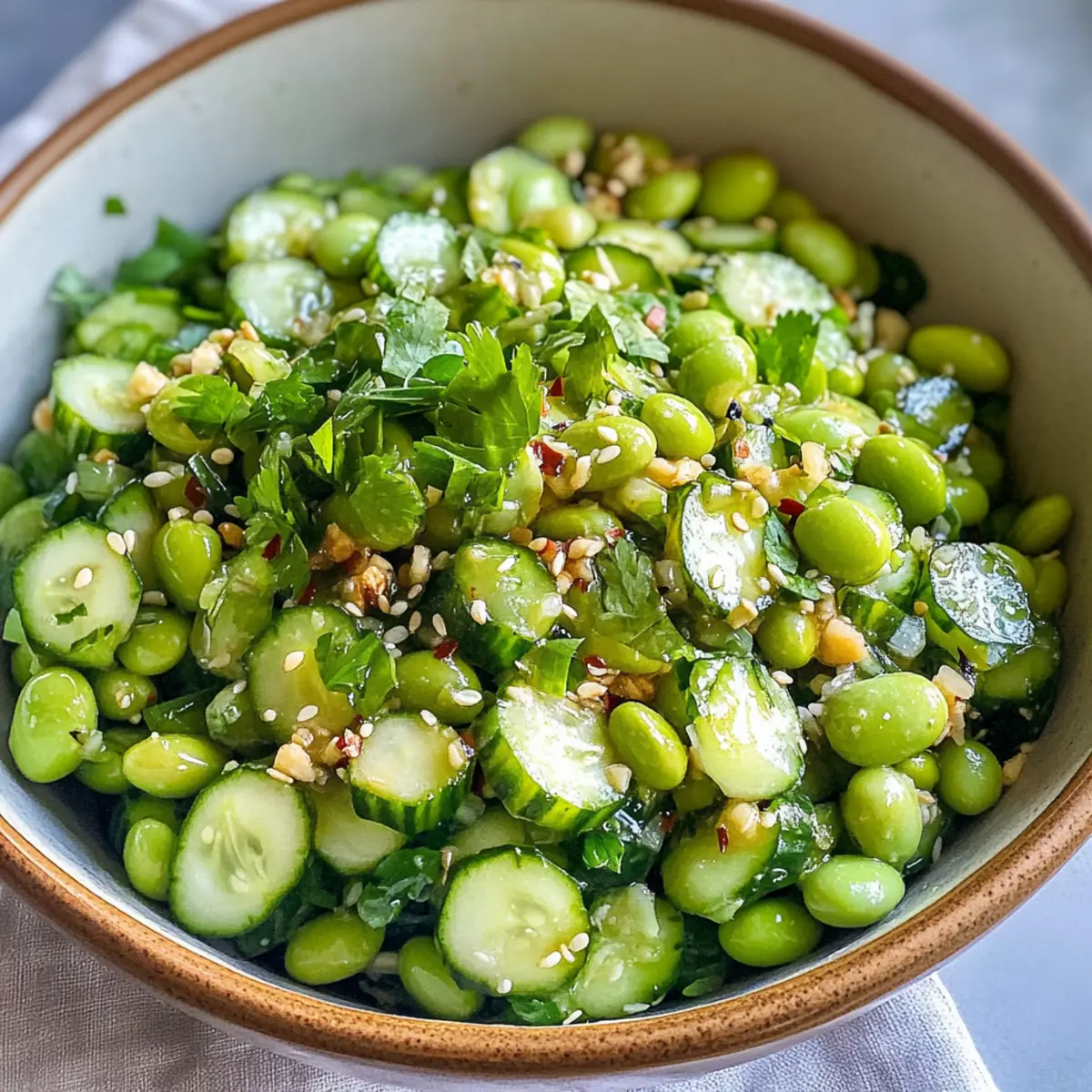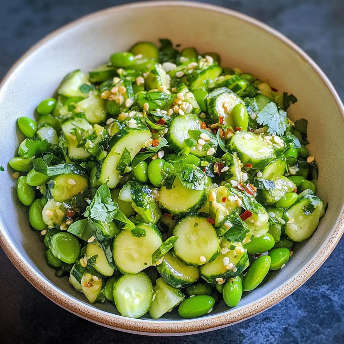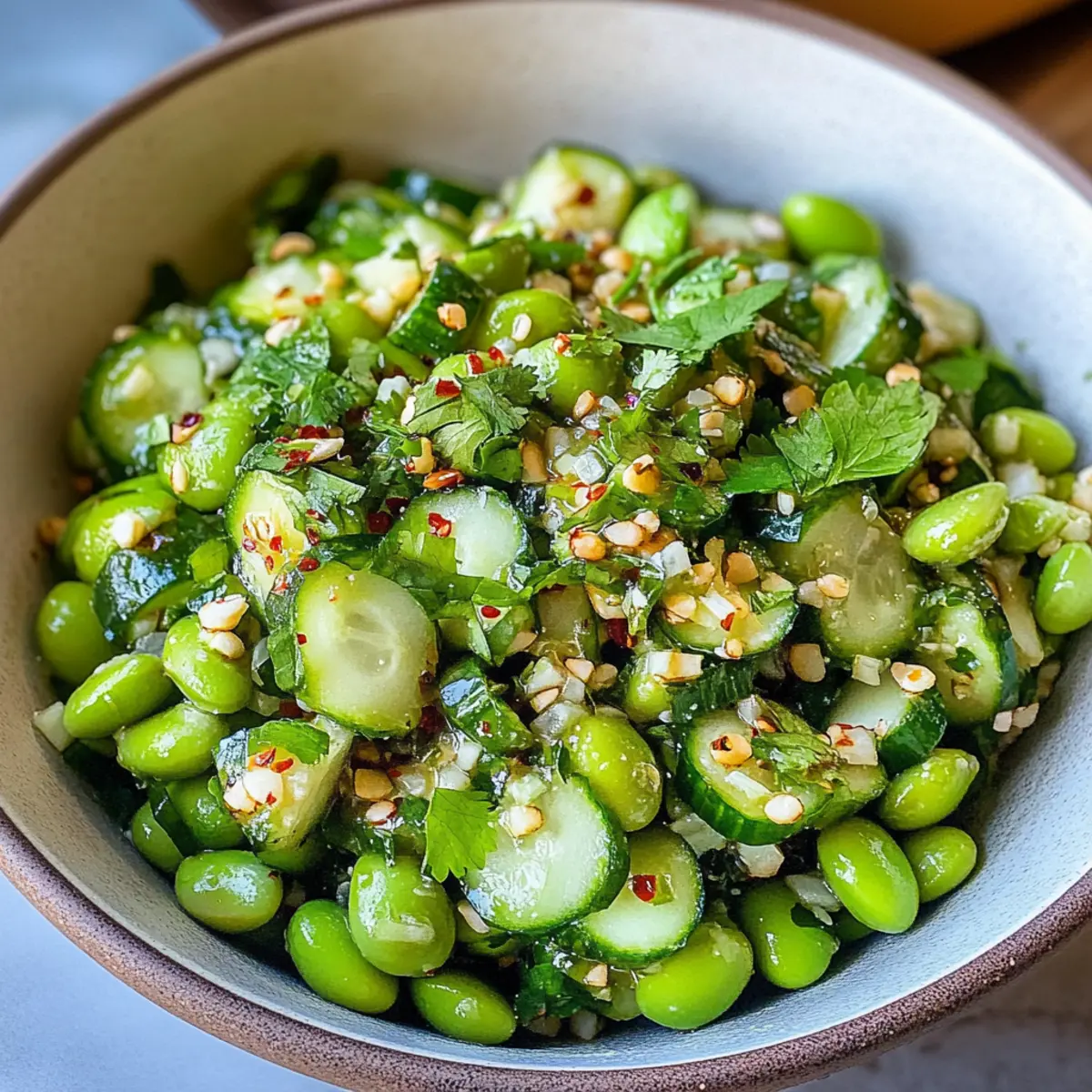 Hast du je das Gefühl gehabt, dass der Sommer dir frische, knackige Aromen ins Gesicht bläst? Mein Gurken Edamame Salat bringt genau dieses Sommergefühl direkt auf deinen Tisch. Diese leichte und erfrischende Mischung aus knackigen Gurken und proteinreichen Edamame ist nicht nur ein echter Hingucker, sondern auch vegan, glutenfrei und perfekt für jede Grillparty oder als schnelles Mittagessen. Mit einem zesty asiatisch inspirierten Dressing wird jede Gabel zu einem kleinen Geschmackserlebnis. Egal, ob du ihn als Beilage servierst oder zu einem vollwertigen Hauptgericht mit Reis kombinierst – dieser Salat wird dich und deine Gäste begeistern. Bist du bereit, mehr über die köstlichen Geheimnisse dieses Salats herauszufinden? Warum ist dieser Salat so erfrischend? Frische Zutaten: Der Gurken Edamame Salat bietet eine erfrischende Explosion aus knackigen und saftigen Aromen. Einfach zuzubereiten: Mit nur wenigen Schritten und einfachen Zutaten ist dieser Salat schnell gemacht. Vegan und gesund: Ideal für jeden Nahrungsstil, bietet er eine großartige Proteinquelle durch Edamame. Vielfältige Variationen: Du kannst ganz nach Belieben variieren und zum Beispiel Kichererbsen oder andere Kräuter hinzufügen. Perfekt für Geselligkeit: Egal bei Grillpartys oder Sommerpicknicks, dieser Salat wird garantiert zum Star auf dem Tisch! Entdecke auch meine leckeren Paprika Mais Salat oder den Kartoffelspalten Mit Gurkendip für noch mehr Erfrischung an warmen Tagen! Gurken Edamame Salat Zutaten Hinweis: Diese Zutaten sind die Grundlage für einen köstlichen Gurken Edamame Salat! Für den Salat Gurken – sorgen für die knackige Frische; ideal sind englische oder persische Gurken. Edamame – bringt Protein und einen nussigen Geschmack; gefrorene Edamame einfach auftauen. Frische Kräuter (Koriander/ Petersilie) – verleihen dem Salat eine aromatische Frische; Koriander hat einen intensiveren Geschmack, während Petersilie milder ist. Für das Dressing Öl – bildet die Basis des Dressings; anstelle von Gemüseöl kann auch Sesamöl verwendet werden. Reisessig – bringt Säure und Frische ins Dressing; kann durch Apfelessig ersetzt werden. Tamari – sorgt für Umami und Salzigkeit; ersatzweise kann Sojasauce genutzt werden. Sesamöl – verleiht dem Dressing einen reichen, nussigen Geschmack; kann weggelassen werden, wenn du es leichter magst. Ahornsirup – fügt eine süße Note hinzu; diesen kannst du auch mit Honig ersetzen oder ganz weglassen. Knoblauch – bringt intensive Aromen ins Dressing; frischer Knoblauch ist empfehlenswert, aber auch Knoblauchpulver ist möglich. Ingwer – sorgt für einen würzigen Kick; frischer Ingwer ist optimal, während gemahlener Ingwer als Abwandlung genutzt werden kann. Chili Crunch – fügt eine scharfe Note und Textur hinzu; du kannst es durch Sriracha ersetzen oder ganz weglassen, wenn du es milder magst. Salz – hebt den Geschmack des gesamten Salats; nach Geschmack anpassen. Zaubere dir mit diesen Zutaten einen erfrischenden Gurken Edamame Salat, der sowohl lecker als auch nahrhaft ist! Schritt-für-Schritt-Anleitung für Gurken Edamame Salat Schritt 1: Edamame zubereiten Wenn du gefrorene Edamame verwendest, koche sie gemäß der Verpackungsanweisung, normalerweise für etwa 5–7 Minuten in kochendem Wasser, bis sie zart aber noch bissfest sind. Danach abgießen und kurz in Eiswasser abkühlen, um den Garprozess zu stoppen. Achte darauf, dass sie vollständig abgekühlt sind, bevor du sie weiterverwendest. Schritt 2: Gemüse schneiden Wasche die Gurken gründlich und schneide sie in kleine, mundgerechte Würfel. Die Verwendung von englischen oder persischen Gurken sorgt für den besten Geschmack und die perfekte Textur. Hacke auch die frischen Kräuter, wie Koriander oder Petersilie, grob und halte sie bereit für die Mischung im Gurken Edamame Salat. Schritt 3: Dressing zubereiten In einer kleinen Schüssel zusammen 3 Esslöffel Pflanzenöl, 2 Esslöffel Reisessig, 2 Esslöffel Tamari, 1 Esslöffel Sesamöl, 1 Esslöffel Ahornsirup, 1 fein gehackte Knoblauchzehe, 1 Teelöffel frisch geriebenen Ingwer, 1 Teelöffel Chili Crunch und eine Prise Salz gut vermengen. Mit einem kleinen Schneebesen das Dressing gründlich verrühren, bis alles schön emulgiert ist. Schritt 4: Salat vermengen In einer großen Schüssel die vorbereiteten Gurkenwürfel, abgekühlten Edamame und die gehackten Kräuter kombinieren. Das selbstgemachte Dressing gleichmäßig darüber gießen und alles sorgfältig mit zwei großen Löffeln vermengen, bis alle Zutaten gut mit dem Dressing überzogen sind. Der Gurken Edamame Salat sollte eine schöne, glänzende Oberfläche haben. Schritt 5: Servieren und genießen Lass den Salat für mindestens 10 Minuten ruhen, damit sich die Aromen entfalten können. Serviere den Gurken Edamame Salat als erfrischende Beilage zu Grillgerichten oder als leichtes Hauptgericht. Genießen die bunte Mischung aus frischen Zutaten und dem aromatischen Dressing! Gurken Edamame Salat Variationen Entdecke die Vielfalt des Gurken Edamame Salats und passe ihn ganz nach deinem Geschmack an! Protein-Power: Ersetze Edamame durch Kichererbsen für eine herzhaftere Note. Kichererbsen sind reich an Ballaststoffen und Arbeit ganz wunderbar mit dem Dressing zusammen! Kräuterwechsel: Nutze frische Kräuter wie Dill oder Minze, um einen neuen Geschmackskick zu erzeugen. Diese Kräuter verleihen dem Salat eine erfrischende Wendung und sorgen für Abwechslung. Textur-Booster: Füge geschnittene Paprika oder Karotten hinzu, um zusätzliche Crunch-Elemente zu integrieren. So wird der Salat noch lebendiger und macht jeden Biss zum Erlebnis! Veganer Twist: Verwende einen veganen Honigersatz wie Agavendicksaft anstelle von Ahornsirup. Du wirst überrascht sein, wie gut die Süße auch ohne tierische Produkte zur Geltung kommt. Scharfer Kick: Wenn du es gerne würzig magst, ersetze den Chili Crunch durch frische Chilis oder Sriracha. So bringt der Salat einen feuri