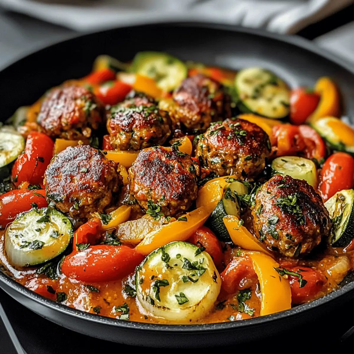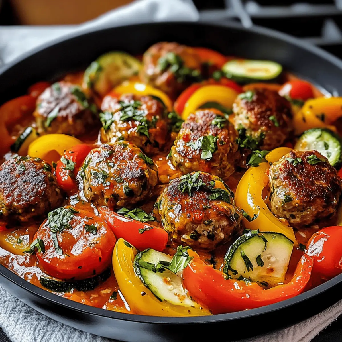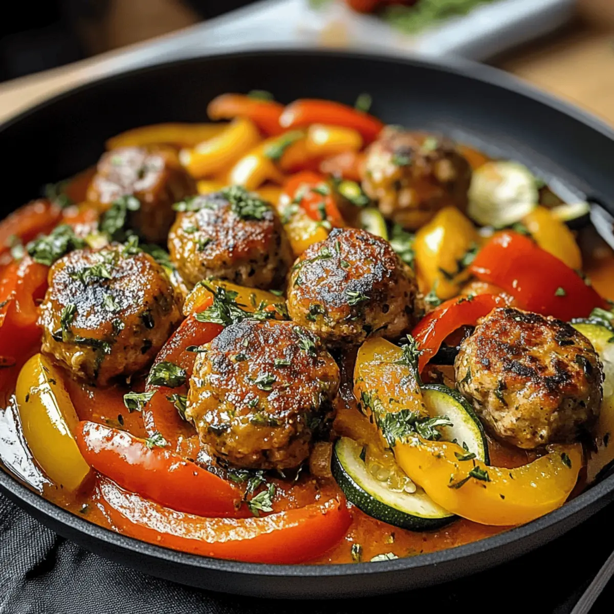 Ziemlich oft ertappe ich mich dabei, wie ich das Magenknurren nach einem langen Tag mit einer aufregenden Pfanne voll leckerem Essen besänftigen möchte. Die Hackbällchen Pfanne mit Ajvar ist genau das, was ich suche – saftige, würzige Hackbällchen in einer cremigen, rauchigen Ajvar-Sauce, die in nur 30 Minuten fertig ist. Dieses Rezept ist nicht nur schnell, sondern auch unglaublich vielseitig, sodass du es nach Herzenslust mit verschiedenen Fleischsorten oder Gemüse erweitern kannst. Als perfektes Abendessen unter der Woche oder für ein geselliges Mittagessen bietet es eine köstliche Abwechslung auf deinem Teller. Neugierig, wie du dieses herzhaft-leckere Gericht zubereiten kannst und dabei auch noch Zeit sparst? Lass uns direkt einsteigen! Warum wirst du dieses Rezept lieben? Einfachheit: Die Zubereitung der Hackbällchen Pfanne mit Ajvar ist unkompliziert und benötigt nur geringe Kochkenntnisse. Vielseitigkeit: Du kannst verschiedene Fleischsorten verwenden oder die Hackbällchen sogar mit einem vegetarischen Hack ersetzen – ganz nach deinem Geschmack! Herzhafter Geschmack: Die Kombination von Hackbällchen und der rauchigen Ajvar-Sauce sorgt für ein aromatisches Geschmackserlebnis, das alle begeistert. Schnelle Zubereitung: In nur 30 Minuten hast du ein vollwertiges Abendessen auf dem Tisch, ideal für hektische Wochentage. Nahrhaft: Diese Pfanne ist nicht nur lecker, sondern auch reich an Proteinen und bietet eine Vielzahl an Gemüse für eine ausgewogene Mahlzeit. Entdecke auch unsere Tipps für Variationen und Serviervorschläge, um das Gericht nach deinem Geschmack zu gestalten! Hackbällchen Pfanne mit Ajvar Zutaten • Entdecke die köstlichen Zutaten für deine Hackbällchen Pfanne mit Ajvar! Für die Hackbällchen 500g gemischtes Hackfleisch (Rind und Schwein) – Hauptbestandteil, der für saftige Hackbällchen sorgt; geeignet für Variationen mit Geflügel oder Lamm. 1 Zwiebel, fein gehackt – Gibt Aromatik; Schalotte oder Frühlingszwiebel können ebenfalls verwendet werden. 2 Knoblauchzehen, gepresst – Verstärkt den Geschmack; frischer Knoblauch ist aromatischer als Pulver. 1 Ei – Bindemittel für eine perfekte Textur; für vegane Version Leinsamen-Ei nutzen. 50g Semmelbrösel – Sorgt für Struktur; glutenfreie Semmelbrösel sind eine passende Alternative. 2 EL Milch – Macht das Hackfleisch zarter; pflanzliche Milch ist eine gute Option. 1 TL Paprikapulver, edelsüß – Würzt und verleiht eine schöne Farbe; geräuchertes Paprikapulver bringt ein zusätzliches Raucharoma. 1/2 TL Paprikapulver, rosenscharf – Optional für mehr Schärfe; Cayennepfeffer ist eine mögliche Substitution. 1/2 TL getrockneter Oregano – Aromageber für ein mediterranes Flair; italienische Kräutermischung funktioniert auch gut. Salz und Pfeffer nach Geschmack – Grundgewürze; andere Gewürze können je nach Vorliebe hinzugefügt werden. Für die Pfanne 2 EL Olivenöl – Zum Anbraten der Hackbällchen; Pflanzenöl oder Butterschmalz sind Alternativen. 1 rote und 1 gelbe Paprika, in Streifen geschnitten – Frisches Gemüse, das Süße hinzufügt; andere Sorten sind ebenfalls möglich. 1 Zucchini, in Scheiben geschnitten – Für zusätzliche Nährstoffe und Textur; Karotten oder Auberginen sind tolle Optionen. 200g Champignons, halbiert oder geviertelt – Bereichern das Gericht; Alternativen sind andere Pilzsorten. 200g Kirschtomaten, halbiert – Für Frische und Saftigkeit; gehackte Tomaten aus der Dose können auch verwendet werden. 4 EL Ajvar (mild oder scharf) – Der Star der Sauce; Paprikapaste kann als Ersatz dienen. 100ml Gemüsebrühe – Basis für die köstliche Soße; Rinderbrühe oder Wasser sind ebenfalls Optionen. Frische Petersilie, gehackt (zum Garnieren) – Aromatische Garnitur, die das Gericht vollendet; frischer Koriander ist eine alternative Wahl. Schritt-für-Schritt-Anleitung für Hackbällchen Pfanne mit Ajvar Step 1: Hackbällchen vorbereiten Vermenge in einer großen Schüssel das gemischte Hackfleisch, die fein gehackte Zwiebel, den gepressten Knoblauch, das Ei, die Semmelbrösel, die Milch, das edelsüße Paprikapulver, den Oregano sowie Salz und Pfeffer. Mische alles gründlich, bis eine homogene Masse entsteht. Lass die Mischung anschließend für 10–15 Minuten ruhen, sodass sich die Aromen gut verbinden können. Step 2: Hackbällchen formen Befeuchte deine Hände leicht, um ein Ankleben der Masse zu verhindern, und forme aus der Hackfleischmischung kleine Bällchen von etwa 3–4 cm Durchmesser. Achte darauf, gleichmäßig große Bällchen zu formen, damit sie gleichmäßig garen. Lege die geformten Hackbällchen auf einen Teller und halte sie bereit für das Braten. Step 3: Hackbällchen anbraten Erhitze in einer großen Pfanne 2 Esslöffel Olivenöl bei mittlerer Hitze. Sobald das Öl heiß ist, gib die Hackbällchen hinein und brate sie für etwa 8–10 Minuten. Wende die Bällchen regelmäßig, bis sie goldbraun und durchgegart sind. Nach dem Braten nimm die Hackbällchen aus der Pfanne und stelle sie beiseite. Step 4: Gemüse anbraten In derselben Pfanne, in der du die Hackbällchen gebraten hast, füge die geschnittenen Paprika, die Zucchini und die Champignons hinzu. Brate das Gemüse bei mittlerer Hitze für 5–7 Minuten, bis es leicht weich ist. Rühre gelegentlich um, damit alles gleichmäßig gart. Füge dann die halbierten Kirschtomaten hinzu und koche weiter, bis sie aufplatzen und saftig werden. Step 5: Fertigstellung Gib 4 Esslöffel Ajvar und 100 ml Gemüsebrühe zu dem angebratenen Gemüse in die Pfanne. Rühre alles gut um, sodass die Ajvar-Sauce gleichmäßig verteilt ist. Nach dem Mischen legst du die vorgebratenen Hackbällchen zurück in die Pfanne und lasse sie für kurz im Mix ziehen. Step 6: Schmoren Decke die Pfanne mit einem Deckel ab und lasse das Gericht bei niedriger Hitze für 15–20 Minuten schmoren. Achte darauf, dass die Hackbällchen gut durchgegart sind und die Sauce etwas eindickt. Rühre ge
