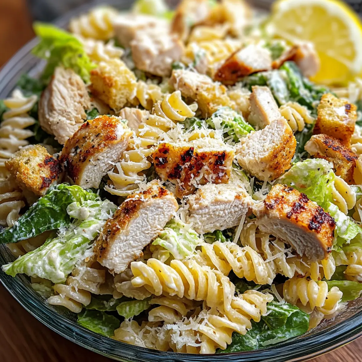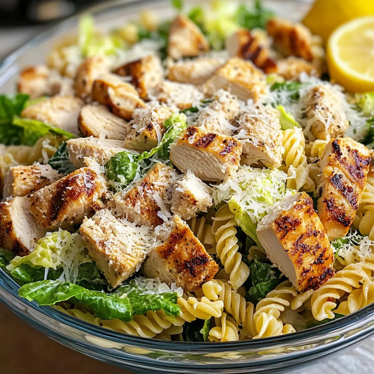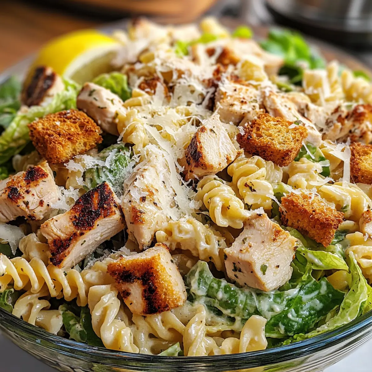 Als ich neulich mit Freunden am Tisch saß, hörte ich das leise murmeln über einen perfekten Sommermittag. Es war der Moment, in dem ich genau wusste, dass mein Hähnchen Caesar Nudelsalat der Star des Tages werden würde! Diese köstliche Mischung aus zartem Hühnerfleisch, cremigem Dressing und al dente Pasta bringt nicht nur einen Hauch von Frische auf den Tisch, sondern ist auch unglaublich vielseitig. Egal, ob du ihn für ein schnelles Mittagessen oder ein entspanntes Abendessen zubereitest, die einfache Zubereitung und die Möglichkeit, die Zutaten nach Belieben anzupassen, seien es frische Gemüse oder verschiedene Pastaformen, machen diesen Salat zu einem unwiderstehlichen Favoriten. Bist du bereit, diese köstliche Kreation auszuprobieren und deine Gäste zu beeindrucken? Warum wirst du diesen Nudelsalat lieben? Einfache Zubereitung: Der Hähnchen Caesar Nudelsalat ist ein Kinderspiel und benötigt nur einfache Kochfähigkeiten, sodass er schnell zubereitet werden kann. Vielseitig anpassbar: Egal, ob du dein Gemüse aufpeppen oder eine glutenfreie Option ausprobieren möchtest, dieser Salat ermöglicht endlose Variationen. Köstlicher Geschmack: Die Kombination aus zartem Hühnerfleisch, aromatischem Dressing und frischem Gemüse sorgt für ein Geschmackserlebnis, das deine Geschmacksknospen begeistert. Perfekt für Meal Prep: Bereite die Zutaten vor, um deinen Salat für ein schnelles Mittagessen oder ein entspanntes Abendessen griffbereit zu haben! Probiere auch unseren Paprika Mais Salat oder Karottenkuchen mit Frischkäse für weitere köstliche Ideen. Everybody’s Favorite: Ideal für gesellige Zusammenkünfte, dieser Salat wird nicht nur deine Familie, sondern auch deine Freunde begeistern! Hähnchen Caesar Nudelsalat Zutaten Für den Nudelsalat • Pasta – Jede kurze Pastaform wie Rotini, Penne oder Fusilli passt perfekt und sorgt für die Struktur. • Hähnchenbrust – Liefert Proteine und ein herzhaftes Gefühl, ideal für ein sättigendes Gericht. • Römersalat – Bringt Frische und Knackigkeit ins Spiel. • Caesar-Dressing – Ein Muss für den cremigen Geschmack; selbstgemachte Varianten mit Mayonnaise und Parmesan sind köstlich. • Parmesan – Fügt einen herzhaften Reichtum hinzu; optional durch eine laktosefreie Käsesorte ersetzen. • Croutons – Sorgen für zusätzlichen Crunch; entweder gekauft oder aus altem Brot selbstgemacht. Für Variationen • Gemüse – Füge gewürfelte Gurken, Kirschtomaten oder Paprika hinzu, um den Salat aufzupeppen und bunter zu gestalten. • Dressing – Ersetze das Caesar-Dressing durch eine vegane Option für eine pflanzliche Mahlzeit. Dieser Hähnchen Caesar Nudelsalat ist nicht nur einfach zuzubereiten, sondern auch unglaublich anpassungsfähig und wird sicherlich zu deinem neuen Favoriten! Schritt-für-Schritt-Anleitung für Hähnchen Caesar Nudelsalat W Step 1: Pasta kochen Bringe einen großen Topf mit gesalzenem Wasser zum Kochen und füge die Pasta hinzu. Koche sie 8-10 Minuten lang, bis sie al dente sind. Achte darauf, dass sie beim Abgießen nicht zu weich wird; die richtige Konsistenz ist wichtig für deinen Hähnchen Caesar Nudelsalat W. Nach dem Abgießen die Pasta mit kaltem Wasser abspülen, um das Garen zu stoppen und sie abkühlen zu lassen. Step 2: Hähnchen vorbereiten Würze die Hähnchenbrust mit Salz, Pfeffer und einem Schuss Olivenöl. Erhitze eine Grill- oder Pfanne bei mittlerer Hitze und brate das Hähnchen für etwa 6-7 Minuten pro Seite, bis es vollständig durchgegart ist und eine goldene Kruste hat. Lasse das Hähnchen kurz ruhen, bevor du es in mundgerechte Stücke würfelst und für den Hähnchen Caesar Nudelsalat W bereitstellst. Step 3: Römersalat zubereiten Wasche den Römersalat gründlich unter fließendem Wasser und lasse ihn abtropfen. Schneide ihn dann in mittelgroße Stücke, damit die Blätter schön knusprig und leicht zu essen sind. Der frische Römersalat verleiht deinem Hähnchen Caesar Nudelsalat W eine angenehme Knackigkeit und Frische. Step 4: Dressing herstellen Wenn du ein selbstgemachtes Caesar-Dressing verwenden möchtest, verrühre in einer Schüssel Mayonnaise, frisch gepressten Zitronensaft, etwas gehackten Knoblauch, Anchovypaste, Dijon-Senf, Worcestershire-Sauce und frisch geriebenen Parmesan. Schneide bis zur gewünschten Cremigkeit und stelle sicher, dass alle Zutaten gut vermischt sind. Das Dressing ist der Schlüssel für den vollen Geschmack in deinem Hähnchen Caesar Nudelsalat W. Step 5: Alles vermengen In einer großen Schüssel kombiniere die abgekühlte Pasta, das gewürfelte Hähnchen, den Römersalat und die Croutons. Gieße ausreichend Caesar-Dressing darüber, um alles gut zu überziehen. Mische die Zutaten vorsichtig, sodass jede Komponente gleichmäßig mit dem Dressing überzogen wird. Dein Hähnchen Caesar Nudelsalat W sollte schön cremig und einladend aussehen. Step 6: Kühlen Decke die Schüssel mit Frischhaltefolie ab und stelle sie für mindestens 30 Minuten in den Kühlschrank. Dies hilft, die Aromen zusammenzufügen und die Texturen zu harmonisieren. Dadurch wird dein Hähnchen Caesar Nudelsalat W noch schmackhafter und erfrischend, wenn du ihn servierst. Step 7: Servieren Vor dem Servieren den Hähnchen Caesar Nudelsalat W aus dem Kühlschrank nehmen. Optional kannst du ihn mit zusätzlichem geriebenem Parmesan und frisch gemahlenem schwarzem Pfeffer garnieren und gemeinsam mit Zitronenschnitzen servieren. Diese frischen Elemente bringen eine lebendige Note in dein Gericht und machen es zum Highlight jeder Mahlzeit. Vorbereitung für deinen Hähnchen Caesar Nudelsalat W Der Hähnchen Caesar Nudelsalat W ist perfekt für alle, die Zeit sparen möchten! Du kannst die Pasta bis zu 24 Stunden im Voraus kochen und im Kühlschrank aufbewahren, um sicherzustellen, dass sie al dente bleibt. Auch das Hähnchen kannst du bereits am Vortag grillen oder braten und dann gewürfelt im Kühlschrank lagern. Der Römersalat sollte frisch zubereit