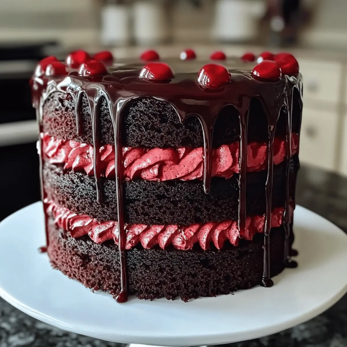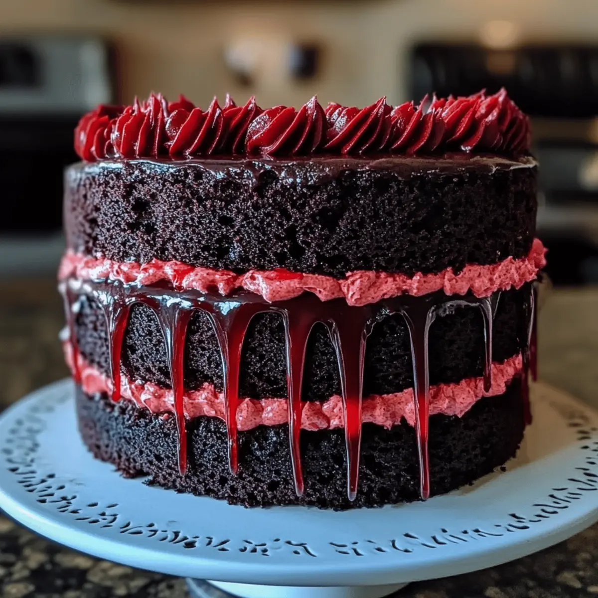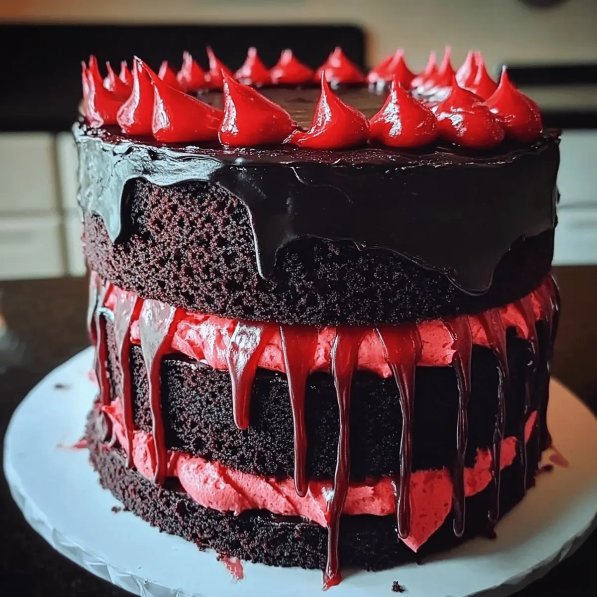 Diese schaurige Halloween-Torte ist ein schwarzer Genuss mit roter Deko – perfekt für jede Halloween-Feier.