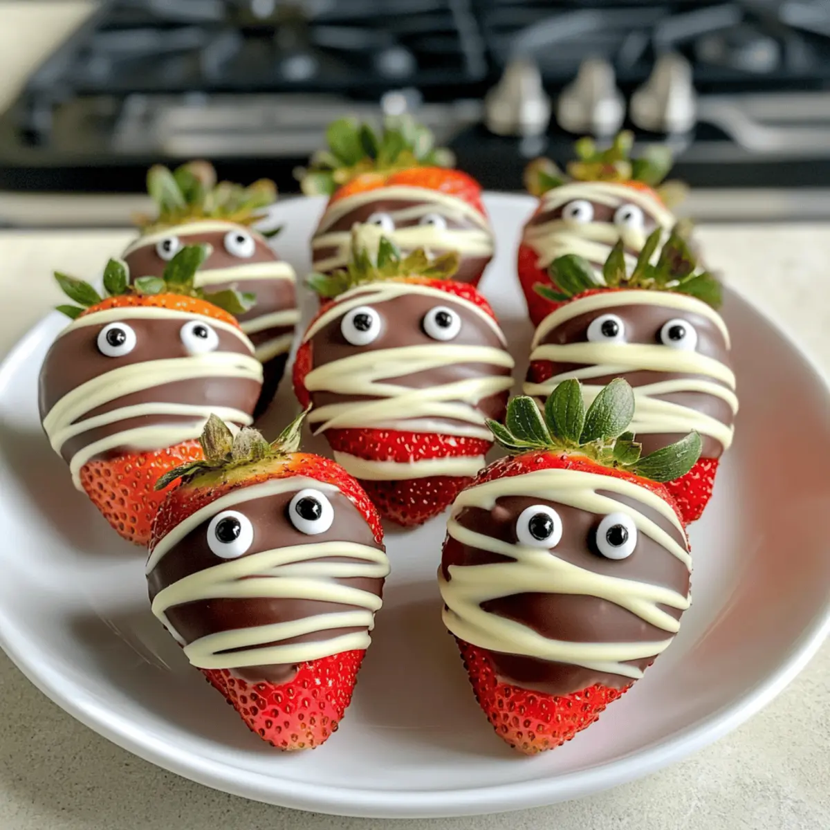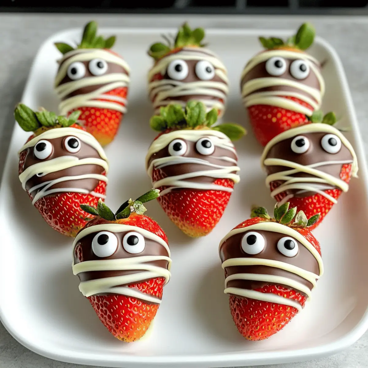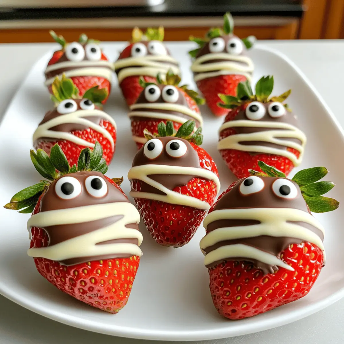 Als ich das letzte Mal in der Küche stand, um für eine Halloween-Feier vorzubereiten, fiel mir das perfekte Rezept in die Hände: Mummy Chocolate-Covered Halloween-Erdbeeren! Diese charmanten, schokoladigen Leckereien sind nicht nur ein echter Hingucker, sondern bieten auch einen unwiderstehlichen Genuss aus saftigen, frischen Erdbeeren umhüllt von reichhaltiger, schmelzender Schokolade. Die Kombination aus dunkler und weißer Schokolade bringt nicht nur Abwechslung auf den Tisch, sondern ist auch blitzschnell zubereitet – ideal für alle, die ihren Freunden und Familie etwas Besonderes bieten möchten, ohne stundenlang in der Küche zu stehen. Bereiten Sie sich darauf vor, diese schmackhaften Mummy-Erdbeeren in Ihre Halloween-Feier zu integrieren und neugierige Fragen über Ihre kreative Kochkunst zu ernten! Warum Mummy-Erdbeeren lieben? Einfachheit: Die Zubereitung ist ein Kinderspiel! Mit nur wenigen Zutaten und klaren Schritten können Sie im Handumdrehen diese festlichen Leckereien zaubern. Kreativität: Personalisieren Sie Ihre Mummy-Erdbeeren ganz nach Ihrem Geschmack. Fügen Sie bunte Streusel oder essbares Glitter hinzu für einen zusätzlichen festlichen Effekt. Geschmacksexplosion: Die Kombination aus frischen, saftigen Erdbeeren und reichhaltiger Schokolade sorgt für einen unwiderstehlichen Genuss, der sowohl Kinder als auch Erwachsene begeistert. Ideal für Partys: Diese schaurig schönen Snacks sind der Star auf jedem Halloween-Buffet und passen perfekt zu anderen Leckereien wie Gruseligen Spinnennetzen-Brownies. Gesunde Nascherei: Genießen Sie einen Happen, der nicht nur süß, sondern auch mit Vitaminen aus den Erdbeeren angereichert ist – eine schmackhafte, etwas gesündere Alternative zu herkömmlichen Süßigkeiten! Zutaten für Halloween-Erdbeeren • Diese Mummy-Erdbeeren sind ein Spaß für die ganze Familie! Für die Erdbeeren Frische Erdbeeren – Achten Sie darauf, dass sie vollkommen trocken sind, damit die Schokolade gut haftet. Dunkle Schokoladenstückchen – Sie bieten eine tiefgründige Geschmacksbasis; alternativ können Sie halbherbe Schokolade verwenden, je nach Vorliebe für Süße. Für die Schokolade Kokosöl – Optional; sorgt für eine seidige Textur in der geschmolzenen Schokolade. Weiße Schokolade – Diese wird für die mütterlichen “Binden” verwendet; weiße Schokoladenstückchen sind eine praktische Alternative, falls nötig. Für die Dekoration Zuckeraugen – Sie verleihen den Erdbeeren den perfekten, gruseligen Ausdruck und machen sie zu einer echten Augenweide. Genießen Sie die Zubereitung Ihrer Halloween-Erdbeeren – sie sind der perfekte süße Happen für Ihre nächste Feier! Schritt-für-Schritt-Anleitung für Halloween-Erdbeeren Step 1: Erdbeeren vorbereiten Waschen Sie die frischen Erdbeeren sorgfältig und tupfen Sie sie mit einem Küchenpapier gründlich trocken. Lassen Sie sie am besten an der Luft einige Minuten trocknen, um sicherzustellen, dass keine Feuchtigkeit zurückbleibt. Dies ist entscheidend, damit die Schokolade gut haftet und gleichmäßig über die Erdbeeren fließen kann. Step 2: Dunkle Schokolade schmelzen Geben Sie die dunklen Schokoladenstückchen in eine mikrowellengeeignet Schüssel und erwärmen Sie sie in 20-30 Sekunden Intervallen. Rühren Sie dabei immer wieder um, bis die Schokolade komplett geschmolzen und glänzend ist. Wenn gewünscht, können Sie etwas Kokosöl hinzufügen, um der Schokolade eine seidige Textur zu verleihen. Step 3: Erdbeeren dippen Halten Sie jede Erdbeere an den grünen Blättern und tauchen Sie sie in die geschmolzene dunkle Schokolade, sodass etwa drei Viertel der Erdbeere bedeckt sind. Lassen Sie überschüssige Schokolade abtropfen und platzieren Sie die Erdbeeren auf einem mit Backpapier ausgelegten Blech. Wiederholen Sie diesen Vorgang für alle Erdbeeren. Step 4: Zuckeraugen anbringen Sobald die Schokolade noch weich ist, drücken Sie vorsichtig zwei Zuckeraugen auf jede getauchte Erdbeere. Achten Sie darauf, dass sie fest sitzen, damit sie beim Abkühlen nicht abfallen. Diese Schritte verleihen Ihren Halloween-Erdbeeren den perfekten schaurigen Look. Step 5: Weiße Schokolade schmelzen Wiederholen Sie den Schmelzprozess für die weiße Schokolade in einer sauberen Schüssel. Nutzen Sie die gleiche Methode wie bei der dunklen Schokolade, indem Sie die Schokolade in 20-30 Sekunden Intervallen schmelzen und regelmäßig umrühren, bis sie glatt und cremig ist. Step 6: Mumien-Wicklungen erstellen Füllen Sie eine Spritztüte oder einen wiederverschließbaren Beutel mit einem abgeschnittenen Eck mit der geschmolzenen weißen Schokolade. Träufeln Sie die Schokolade über die Erdbeeren, um die charakteristischen Mumienbandagen zu formen. Arbeiten Sie schnell, damit die Schokolade nicht zu fest wird. Step 7: Festigen und servieren Lassen Sie die dekorierten Erdbeeren bei Raumtemperatur aushärten oder stellen Sie sie für etwa 10 Minuten in den Kühlschrank. Servieren Sie die Halloween-Erdbeeren am besten sofort für eine optimale Konsistenz und genießen Sie die bewundernden Blicke Ihrer Gäste! Lagerungstipps für Halloween-Erdbeeren Raumtemperatur: Genießen Sie die Halloween-Erdbeeren am besten frisch zubereitet. Bei Raumtemperatur sind sie etwa 2 Stunden haltbar, bevor die Schokolade zu schmelzen beginnt. Kühlschrank: Bewahren Sie die Erdbeeren in einer einzelnen Schicht in einem luftdichten Behälter auf. So bleiben sie frisch für bis zu 4 Stunden und verhindern, dass sie aneinanderkleben oder ihre Textur verlieren. Gefrierschrank: Für eine längere Lagerung können die Erdbeeren eingefroren werden. Legen Sie sie auf ein Blech zum Vorfrieren und übertragen Sie sie dann in einen gefrierfesten Behälter – haltbar bis zu 2 Monate. Beachten Sie, dass die Textur nach dem Auftauen verändert sein kann. Wiedereinwärmen: Für einen warmen Schokoladen-Look können Sie die geschmolzene Schokolade bei Bedarf vorsichtig in der Mikrowelle oder im Wasserbad wieder er