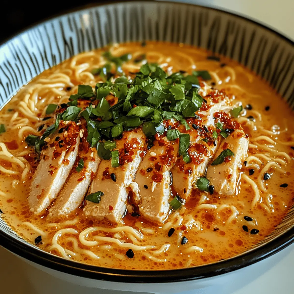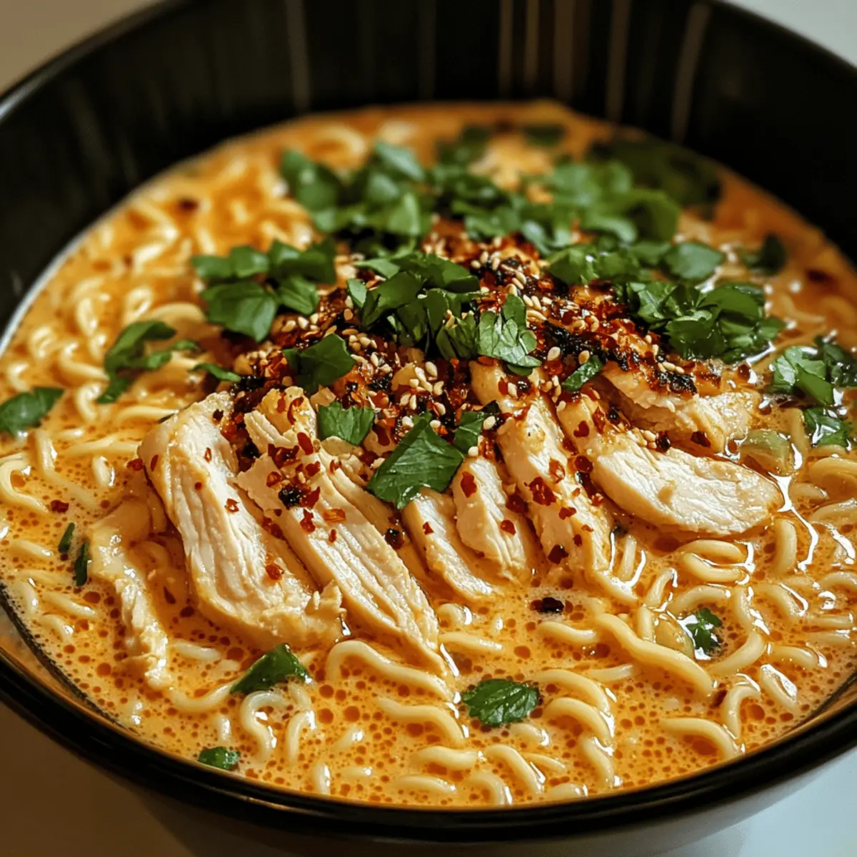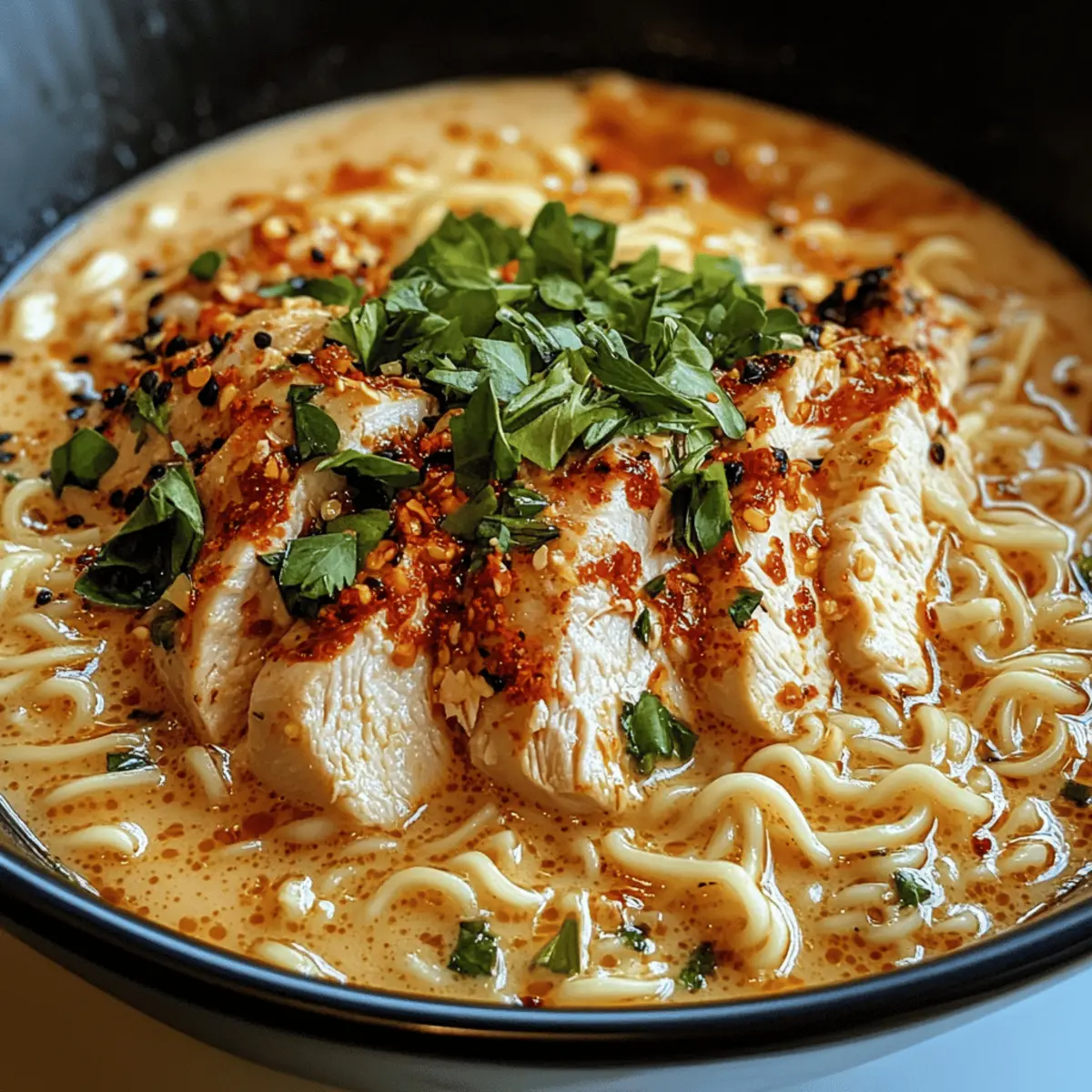 Heirate mich Huhn Ramen kombiniert zartes Hähnchen mit cremiger Sauce und Ramen-Nudeln für ein einfaches, aber eindrucksvolles Gericht.
