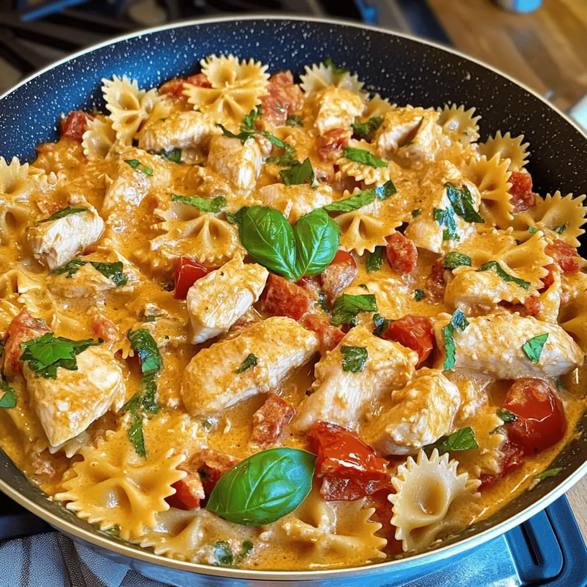 Mische die gekochten Nudeln zusammen mit dem reservierten Nudelwasser in die Sauce. Rühre gut um, damit die Nudeln gleichmäßig mit der cremigen Sauce beschichtet werden. Schneide das gebratene Hähnchen in Scheiben und lege es obendrauf. Füge frischen Basilikum hinzu, um das Aroma zu intensivieren.