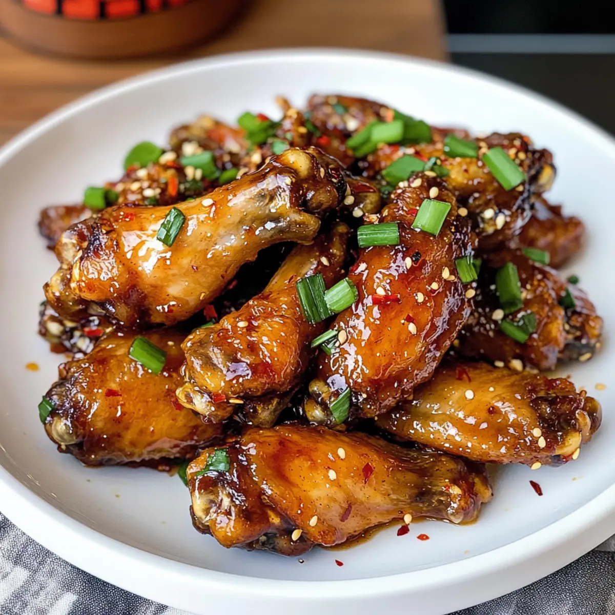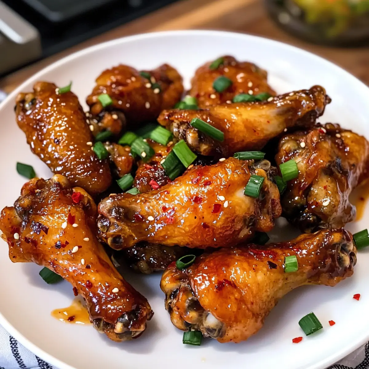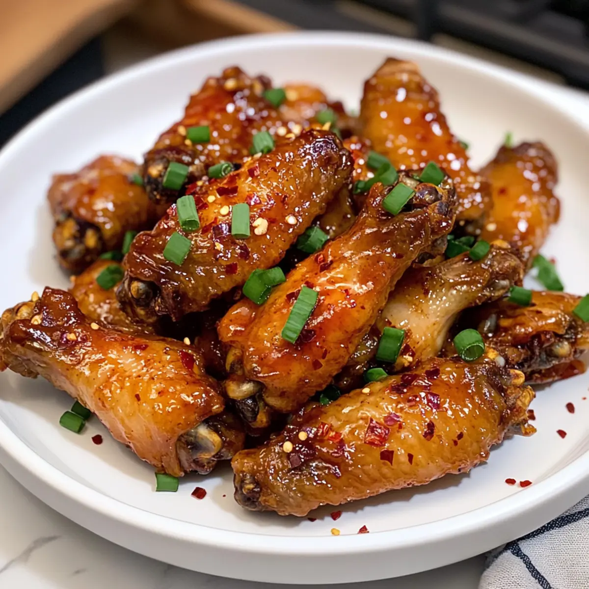 Richtet die Heißen Honigflügel auf einer großen Servierplatte an. Falls gewünscht, träufelt die restliche Sauce darüber und dekoriert sie mit gehackten Frühlingszwiebeln und zusätzlichen roten Pfefferflocken. Jetzt sind eure Heißen Honigflügel bereit, serviert zu werden – perfekt für gesellige Runden oder einfach als Genuss für euch selbst!
