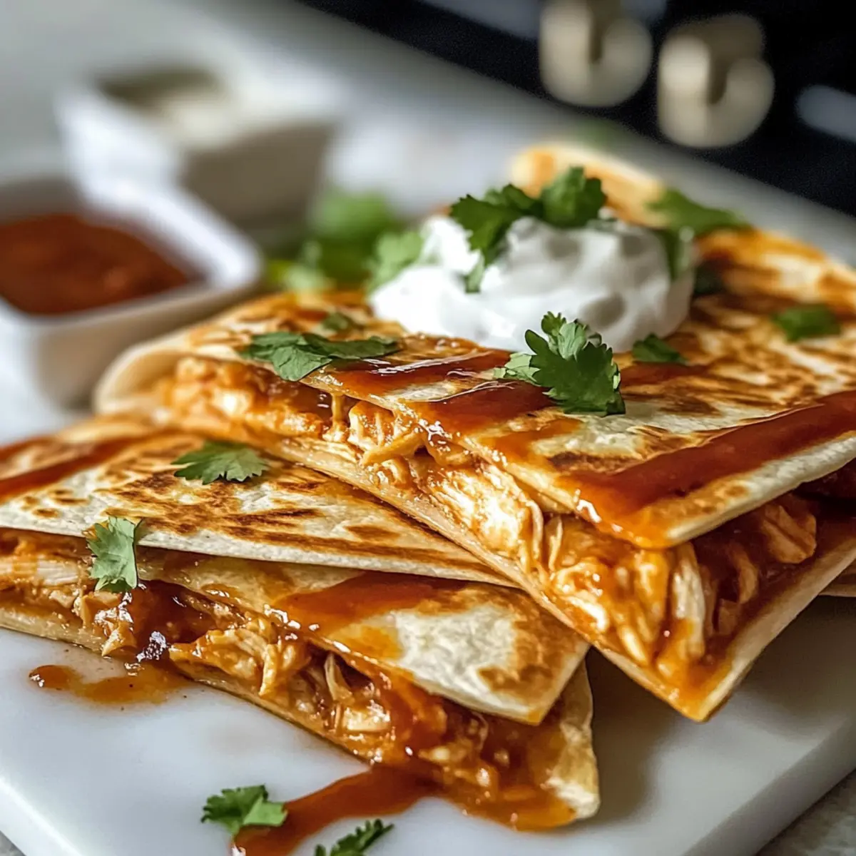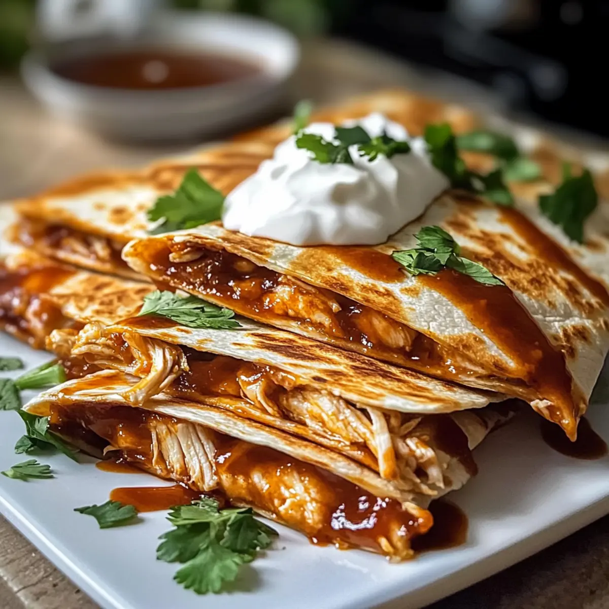 Die salzigen Klänge einer Grillparty hallen in meinem Kopf, während ich an diese köstlichen Heißer Honig BBQ Hähnchen Quesadillas denke. Jede Biss ist eine aufregende Kombination aus süß und scharf, perfekt für einen schnellen und herzhaften Abendessen unter der Woche. In nur 20 Minuten zubereitet, sind diese Quesadillas nicht nur ein echtes Comfort Food, sondern auch voller Protein und anpassbar für jeden Geschmack – egal, ob du einfache Käse-Varianten oder würzigere Füllungen bevorzugst. Stell dir vor, du legst sie auf den Tisch und beobachtest, wie sie alle begeistern und ihre perfekten goldenen Küchlein genießen. Bereit, deine Familie oder Freunde mit etwas Einzigartigem zu überraschen? Lass uns gemeinsam in die Welt dieser schmackhaften Quesadillas eintauchen! Warum wirst du diese Quesadillas lieben? Schnell und Einfach: In nur 20 Minuten hast du ein köstliches Abendessen auf dem Tisch, das jeder genießen kann. Vielseitig: Diese Quesadillas können ganz nach deinem Geschmack angepasst werden – egal, ob du mehr Gemüse oder verschiedene Käsesorten hinzufügst. Familienfreundlich: Ein Gericht, das Groß und Klein gleichermaßen begeistert und alle am Esstisch vereint. Proteinreich: Mit Hähnchen als Hauptbestandteil bleibt jeder satt und glücklich! Außerdem kannst du diese Quesadillas im Voraus zubereiten oder sogar für einen späteren Genuss einfrieren. Perfekte Mischung: Der süßliche Geschmack des heißen Honigs in Kombination mit BBQ-Sauce sorgt für ein unvergessliches Geschmackserlebnis, das du so schnell nicht vergisst! Heißer Honig BBQ Hähnchen Quesadillas Zutaten Diese Quesadillas sind ein Genuss, einfach und so anpassbar! Für die Füllung Gekochtes, zerkleinertes Hähnchen – dieser Proteingehalt sorgt für ein herzhaftes Gericht, das mit Rotisserie-Hähnchen besonders aromatisch wird. BBQ-Sauce – verleiht eine süße und würzige Note; wähle deine Lieblingsmarke, um den Geschmack anzupassen. Heißer Honig – fügt einen süß-würzigen Kick hinzu; passe die Menge nach deinem Geschmack an oder mische Honig mit Cayennepfeffer für mehr Schärfe. Für die Quesadillas 10-Zoll-Mehltortillas – sie bieten die perfekte Struktur für die Quesadillas; frische Tortillas lassen sich besser falten, ohne zu reißen. Geriebener Monterey Jack/Cheddar Käse – sorgt für Cremigkeit und Geschmack; eine Käsemischung hebt das Aroma und die Textur hervor. Butter (geschmolzen) – wird verwendet, um die Quesadillas zu bestreichen und eine goldene, knusprige Außenseite zu fördern. Optionale Beilagen Sauerrahm – rundet das Gericht ab und sorgt für einen cremigen Akzent. Guacamole – perfekt als Dip, um die Quesadillas noch köstlicher zu machen. Koriander – bringt frische Aromen und eine ansprechende Optik auf den Tisch. Schritt-für-Schritt-Anleitungen für Heißer Honig BBQ Hähnchen Quesadillas Step 1: Füllung vorbereiten In einer mittelgroßen Schüssel das zerkleinerte Hähnchen mit der BBQ-Sauce und dem heißen Honig gründlich vermengen, bis die Mischung gleichmäßig und glänzend ist. Diese süß-würzige Füllung gibt den Heißer Honig BBQ Hähnchen Quesadillas ihren charakteristischen Geschmack. Stelle sicher, dass alles gut durchmischt ist, um jeden Bissen köstlich zu machen. Step 2: Quesadillas zusammenstellen Lege die 10-Zoll-Mehltortillas auf eine saubere Arbeitsfläche. Streue eine großzügige Menge Käse auf die eine Hälfte jeder Tortilla und verteile dann die Hähnchenfüllung gleichmäßig darüber. Füge eine weitere Schicht Käse hinzu, klappe die Tortilla in der Mitte und drücke leicht zusammen, um sie zu verschließen. Bereite die Quesadillas vor, indem du eine gleichmäßige Verteilung der Füllung sicherstellst, damit sie beim Kochen nicht herausquellen. Step 3: Quesadillas braten Erhitze eine große Pfanne bei mittlerer Hitze und lasse etwas Butter darin schmelzen. Pinsel die Oberseite der Quesadilla mit geschmolzener Butter, bevor du sie mit der gebutterten Seite nach unten in die Pfanne legst. Brate die Quesadilla 2-3 Minuten lang, bis sie goldbraun und knusprig ist. Achte darauf, dass der Käse beginnt zu schmelzen und die Tortilla eine schöne Farbe annimmt. Step 4: Umdrehen und weiterbraten Nachdem die erste Seite gut gegrillt ist, drehe die Quesadilla vorsichtig mit einem Pfannenwender um. Bestreiche die obere Seite erneut mit Butter und brate sie für weitere 2-3 Minuten. Sie sollte jetzt golden und knusprig sein, während der Käse vollständig geschmolzen ist. Diese Bratzeit sorgt dafür, dass die Heißer Honig BBQ Hähnchen Quesadillas innen schön weich und außen schön knusprig sind. Step 5: Ruhen lassen und servieren Lasse die fertigen Quesadillas für etwa eine Minute ruhen, bevor du sie in Keile schneidest. Dadurch kann die Füllung etwas abkühlen und verhindert, dass beim Schneiden alles herausquillt. Serviere die Heißer Honig BBQ Hähnchen Quesadillas mit optionalen Dips wie Sauerrahm oder Guacamole, um das Geschmackserlebnis abzurunden. Was passt zu Heißer Honig BBQ Hähnchen Quesadillas? Erlebe eine kulinarische Reise, während du diese köstlichen Quesadillas genießt – perfekt kombiniert, um ein vollwertiges und schmackhaftes Essen zu kreieren. Cremige Guacamole: Dieser frische Dip sorgt für eine perfekte Balance mit der Schärfe der Quesadillas und fügt eine cremige Textur hinzu. Sauerrahm: Der milde Geschmack des Sauerrahms bietet einen wunderbaren Kontrast zu den würzigen Aromen, ideal für das Eintauchen. Frischer Koriander: Ein Hauch von frisch gehacktem Koriander bringt eine aromatische Frische, die das Essen lebendiger macht. Gegrillte Paprika: Diese süßlich gerösteten Stücke fügen eine zusätzliche Knusprigkeit sowie eine angenehme Süße hinzu, die gut mit dem BBQ harmoniert. Pikante Salsa: Eine fruchtige Salsa mit Tomaten und Zwiebeln verstärkt das Geschmackserlebnis und bietet eine erfrischende Note zwischen den herzhaften Bissen. Eiskalte Limonade: Ein kohlensäurehaltiges G