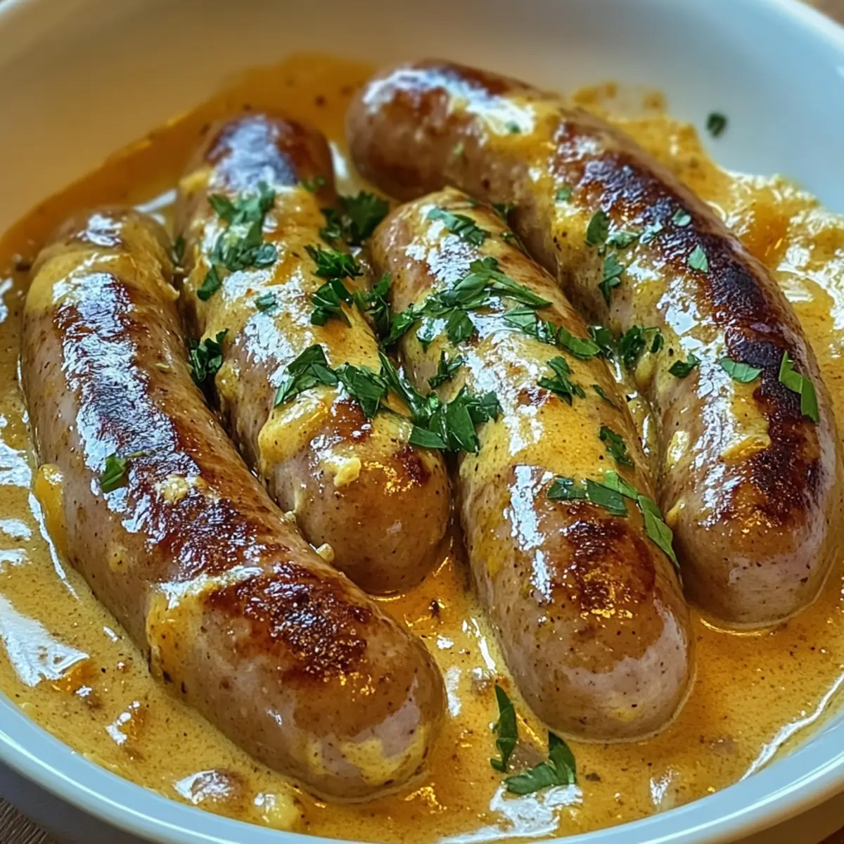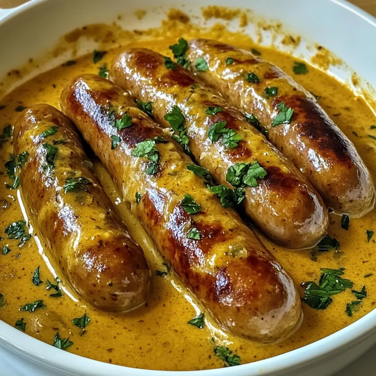 Die ersten warmen Sonnenstrahlen kündigen den Frühling an, und ich habe sofort Lust auf ein köstliches Gericht, das Erinnerungen an die heimische Küche weckt. Heute präsentiere ich dir meine Herzhafte Bratwurst in Zwiebel-Curry-Sahnesauce – ein Rezept, das nicht nur schnell zubereitet ist, sondern auch die Herzen der ganzen Familie erobert. Die Kombination aus saftig gegrillten Bratwürsten und einer aromatischen, cremigen Sauce hat die Macht, selbst die hektischsten Wochentage in ein kleines Festmahl zu verwandeln. Diese homely Kreation ist perfekt für gemütliche Abende und liefert jede Menge Komfort, während sie gleichzeitig einfach genug ist, um schnell auf den Tisch zu kommen. Hast du schon Lust darauf, deine Küche mit verlockenden Düften zu erfüllen? Warum du dieses Rezept lieben wirst Einfachheit: Die Zubereitung ist unkompliziert und erfordert keine besonderen Kochkünste – ideal für alle, die ein herzhaftes Gericht im Handumdrehen auf den Tisch bringen möchten. Reichhaltiger Geschmack: Du wirst die Kombi aus der würzigen Curry-Sahnesauce und den saftigen Bratwürsten lieben, die für ein unvergessliches Geschmackserlebnis sorgt. Vielfältigkeit: Passe das Rezept nach deinem Geschmack an, indem du zum Beispiel die Bratwurst gegen Gemüseoptionen austauschst – so wird jeder fündig! Familienfreundlich: Ein Gericht, das sowohl Kinder als auch Erwachsene begeistert und für fröhliche Gesichter am Tisch sorgt. Gemütliche Atmosphäre: Perfekt für gemütliche Abende oder überraschende Gäste, die sich über ein hausgemachtes, herzhaftes Essen freuen. Wenn du nach weiteren tollen Ideen suchst, schau dir auch unsere bequeme deutsche Küche an! Herzhafte Bratwurst in Zwiebel-Curry-Sahnesauce Zutaten Für die Sauce: • Neutrales Pflanzenöl – Ideal zum Anbraten der Bratwürste; kann durch Raps- oder Sonnenblumenöl ersetzt werden. • Gemüsezwiebel – Sorgt für eine süße und geschmackliche Tiefe; verwende Schalotten für eine mildere Note. • Salz – Wichtig zur Geschmacksverstärkung während des Kochens. • Tomatenmark – Fügt der Sauce Umami und Tiefe hinzu. • Sahne – Kreiert die cremige Textur der Sauce; du kannst auch saure Sahne für einen säuerlicheren Geschmack verwenden. • Crème fraîche – Macht die Sauce besonders cremig und gibt einen kleinen Säurekick; griechischer Joghurt kann ebenfalls verwendet werden. • Zitronensaft – Bringt Frische und Balance in die Aromen. • Chiliflocken – Sorgt für eine prickelnde Schärfe; nach Geschmack anpassen. • Currypulver – Vermittelt Wärme und Komplexität; wähle die Art je nach gewünschtem Schärfegrad. • Gehackte Kräuter – Sorgen für Frische; verwende eine Kräutermischung oder deine Lieblingskräuter. • Pfeffer – Zum Abschmecken der Sauce. Für die Bratwurst: • Bratwurst – Der Hauptakteur des Gerichts, sorgt für eine herzhafte Fleischkomponente; frisch oder gefroren verwenden. Schritt-für-Schritt-Anleitung für Herzhafte Bratwurst in Zwiebel-Curry-Sahnesauce Schritt 1: Bratwürste anbraten Erhitze 1 Esslöffel neutrales Pflanzenöl in einer großen beschichteten Pfanne bei mittlerer Hitze. Lege die Bratwürste hinein und brate sie von allen Seiten rund 5-7 Minuten lang an, bis sie eine goldbraune Kruste haben. Es ist nicht nötig, sie vollständig durchzukochen, da sie später im Ofen weitergaren. Schritt 2: Backblech vorbereiten Übertrage die angebratenen Bratwürste vorsichtig in ein Backblech. Optional kannst du sie der Länge nach halbieren, um die Garzeit zu verkürzen. Stell das Backblech beiseite, während du die Sauce zubereitest. Schritt 3: Zwiebeln sautieren Gib den restlichen Esslöffel Öl in dieselbe Pfanne und erhitze ihn erneut bei mittlerer Hitze. Füge die gewürfelten Zwiebeln und eine Prise Salz hinzu und brate sie etwa 5-7 Minuten lang an, bis sie weich und glasig aussehen. Diese süßen Zwiebeln bilden die Basis der köstlichen Zwiebel-Curry-Sahnesauce. Schritt 4: Sauce zubereiten Rühre das Tomatenmark unter die Zwiebeln und lasse es kurz anbraten, etwa 1 Minute lang, um die Aromen zu intensivieren. Füge dann Sahne, Crème fraîche, Zitronensaft, Chiliflocken und Currypulver hinzu und bringe die Mischung unter ständigem Rühren zum Kochen. Die Sauce sollte cremig und gut vermischt sein. Schritt 5: Kombinieren Nehme die Pfanne vom Herd und füge die gehackten Kräuter hinzu. Schmecke die Sauce mit Salz und Pfeffer ab. Gieße die heiße Sauce gleichmäßig über die Bratwürste im Backblech und lasse sie gut bedeckt. Schritt 6: Backen Heize den Ofen auf 200°C vor und backe die Herzhafte Bratwurst in Zwiebel-Curry-Sahnesauce für etwa 20 Minuten auf der mittleren Schiene. Die Bratwürste sollten durchgegart und die Sauce blubbern, wenn sie fertig sind. Was passt zu Herzhafter Bratwurst in Zwiebel-Curry-Sahnesauce? Dieses Gericht verzaubert nicht nur mit seinem köstlichen Aroma, sondern bietet auch zahlreiche Möglichkeiten, um ein vollwertiges Menü zu kreieren. Cremige Kartoffelbrei: Die samtige Textur des Kartoffelbreis ergänzt die reichhaltige Sauce perfekt. Er nimmt die Aromen auf und sorgt für ein harmonisches Geschmackserlebnis. Frischer Gemüsesalat: Ein leichter, knackiger Salat bringt Frische und eine angenehme Säure ins Spiel. Verwende saisonales Gemüse, um ein buntes und schmackhaftes Gericht zu kreieren. Knuspriges Baguette: Dieses Brot eignet sich hervorragend, um die Sauce bis auf den letzten Tropfen aufzuessen. Die krosse Kruste steht in schönem Kontrast zur cremigen Sauce. Gebratene grüne Bohnen: Diese Beilage bringt Farbe und eine knackige Textur auf den Teller. Mit etwas Knoblauch und Zitrone zubereitet, harmonieren sie wunderbar mit der Würzigkeit der Bratwurst. Dunkles Bier: Ein vollmundiges, dunkles Bier verstärkt die herzhaften Aromen des Gerichts. Die leichten Karamell- und Malznoten des Bieres harmonieren ideal mit der Curry-Sahnesauce. Dessert: Vergiss nicht, das Festessen mit einem leichten Dessert abzurunde