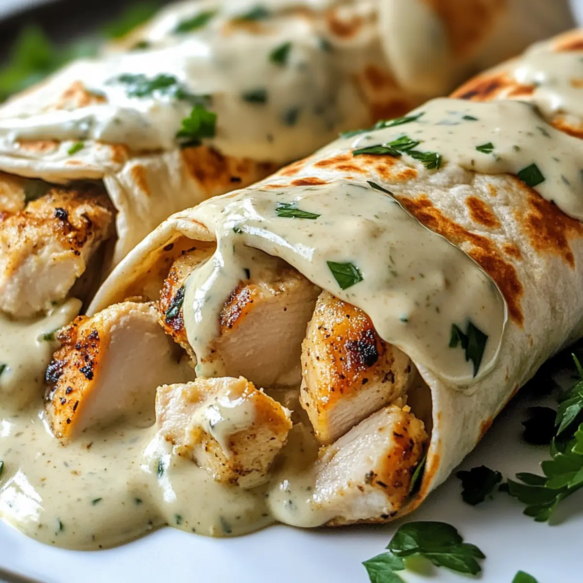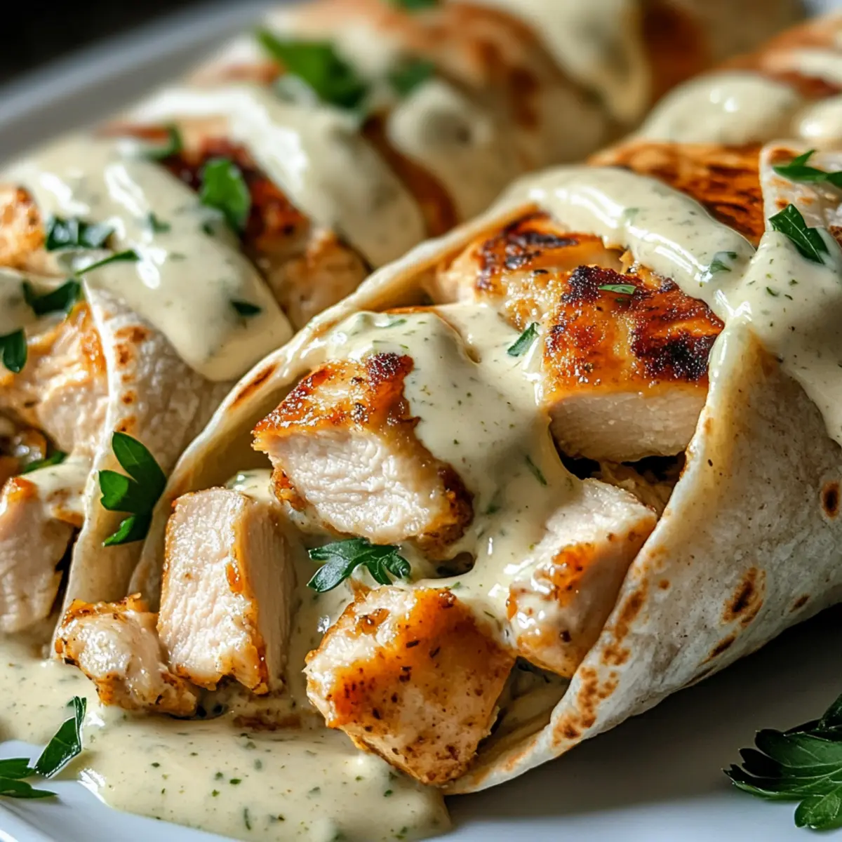 Es war einmal ein hektischer Wochentag, an dem ich gerade nach einem köstlichen und gesunden Abendessen suchte, als mich die Idee für die Herzhafte Hähnchen-Wraps mit Knoblauch-Sahnesoße regelrecht überflutete. Diese schnell zubereitete Rezept ist nicht nur ein wahrer Gaumenschmaus, sondern auch ein perfektes Beispiel für eine proteinreiche Mahlzeit, die ganz einfach im heimischen Kochbereich umgesetzt werden kann. Stellen Sie sich vor: zarte, gewürzte Hähnchenstücke umhüllt von einem warmen Vollkorn-Wrap, dazu eine reichhaltige, knoblauchige Sahnesoße – der Traum eines jeden Feinschmeckers! Ideal für eine stressfreie Abendbrot-Routine oder als leckeres Mittagessen, sind diese Wraps nicht nur einfach zuzubereiten, sondern lassen sich auch wunderbar für die gesamte Woche vorbereiten. Welche köstlichen Variationen könnten Sie Ihrer eigenen Version hinzufügen? Warum sind diese Wraps so verlockend? Einfachheit: Die Zubereitung könnte nicht einfacher sein! Mit nur wenigen Zutaten und unkomplizierten Schritten sind diese Wraps schnell gemacht. Vielseitigkeit: Sie können die Füllung nach Belieben anpassen und gesundes Gemüse hinzufügen, um zusätzliche Nährstoffe zu integrieren. Reichhaltiger Geschmack: Der aromatische Knoblauch in der Sahnesoße sorgt für einen unvergleichlichen Geschmack, der die Aromen des Hähnchens perfekt ergänzt. Gesunde Wahl: Diese wraps sind proteinreich und bieten eine gesunde Alternative zu Fast Food. Sie sind ideal für eine ausgewogene Ernährung. Zeitersparnis: Perfekt für hektische Wochenabende – in weniger als 30 Minuten auf dem Tisch! Wenn Sie mehr Optionen für schnelles Abendessen suchen, können Sie sich auch diese einfache Rezeptidee für schnelle Abendgerichte ansehen. Herzhafte Hähnchen-Wraps mit Knoblauch-Sahnesoße Zutaten • Die perfekten Zutaten für ein schnelles und gesundes Abendessen! Für das Hähnchen • Hähnchenbrustfilets – Hauptproteinquelle; dünn geschnitten für gleichmäßiges Garen und Zartheit. • Olivenöl – Zum Braten des Hähnchens; verbessert den Geschmack und sorgt für Saftigkeit. Für die Wraps • Vollkorn-Wraps/Tortillas – Servieren als Grundlage; fügen Ballaststoffe hinzu und machen das Gericht herzhaft. Für die Knoblauch-Sahnesoße • Knoblauch – Essentiell für die Soße; frisch gehackt für maximalen Geschmack. • Schlagsahne – Schafft eine reichhaltige, cremige Soße; für eine leichtere Version austauschbar mit griechischem Joghurt. • Hühnerbrühe – Fügt Geschmack und Tiefe zur Sahnesoße hinzu; verwenden Sie natriumarme Brühe zur Kontrolle des Salzgehalts. • Geriebener Mozzarella oder Parmesan – Schmilzt in die Soße und verstärkt die Cremigkeit und den Geschmack. Würzungen • Salz & Pfeffer – Grundgewürze zur Geschmacksverstärkung; nach Geschmack anpassen. • Geräucherter Paprika – Gibt eine subtile Rauchnote; kann mit normalem Paprika ersetzt werden, wenn nicht verfügbar. • Frische Petersilie (optional) – Bietet Frische und eine farbenfrohe Garnierung. Jede Zutat ist sorgfältig ausgewählt, um die herzhaften Hähnchen-Wraps mit Knoblauch-Sahnesoße zu einem köstlichen Erlebnis zu machen! Schritt-für-Schritt-Anleitung für Herzhafte Hähnchen-Wraps mit Knoblauch-Sahnesoße Step 1: Hähnchen braten Erhitzen Sie in einer großen Pfanne bei mittlerer Hitze einen Esslöffel Olivenöl. Fügen Sie die dünn geschnittenen Hähnchenbrustfilets hinzu und würzen Sie sie mit Salz, Pfeffer und geräucherter Paprika. Braten Sie das Hähnchen für 5-7 Minuten, bis es goldbraun und vollständig durchgegart ist. Nehmen Sie es dann aus der Pfanne und stellen Sie es beiseite. Step 2: Knoblauch-Sahnesoße zubereiten In derselben Pfanne fügen Sie ungeschälte, frisch gehackte Knoblauchzehen hinzu und braten sie 30 Sekunden lang, bis sie aromatisch sind. Gießen Sie dann die Hühnerbrühe und die Schlagsahne hinein und rühren Sie gut um. Lassen Sie die Mischung 2-3 Minuten köcheln, bis sie leicht eingedickt ist und die Aromen verschmelzen. Step 3: Käse hinzufügen Streuen Sie den geriebenen Mozzarella oder Parmesan in die köchelnde Knoblauch-Sahnesoße und rühren Sie, bis der Käse geschmolzen ist und die Soße cremig wird. Probieren Sie die Soße und passen Sie die Gewürze nach Ihrem Geschmack an, um den perfekten Geschmack für Ihre Herzhafte Hähnchen-Wraps mit Knoblauch-Sahnesoße zu erreichen. Step 4: Wraps zusammenstellen Erwärmen Sie die Vollkorn-Wraps in einer separaten Pfanne oder Mikrowelle, bis sie warm und flexibel sind. Legen Sie dann die gebratenen Hähnchenstreifen in die Mitte jedes Wraps. Beträufeln Sie die Hähnchenstücke großzügig mit der köstlichen Knoblauch-Sahnesoße. Step 5: Wraps einrollen und servieren Falten Sie die Seiten des Wraps ein und rollen Sie ihn dann straff zusammen. Servieren Sie die Wraps warm, eventuell mit frischer Petersilie garniert, um ein ansprechendes und leckeres Gericht zu kreieren. Genießen Sie Ihre Herzhafte Hähnchen-Wraps mit Knoblauch-Sahnesoße! Expert Tips für Herzhafte Hähnchen-Wraps Hähnchen gleichmäßig garen: Achten Sie darauf, dass die Stücke gleichmäßig geschnitten sind, um eine einheitliche Garzeit zu gewährleisten. Dadurch wird das Hähnchen zart und saftig. Knoblauch richtig dosieren: Beginnen Sie mit einer kleinen Menge Knoblauch und probieren Sie die Soße. Sie können immer mehr hinzufügen, aber zu viel Knoblauch kann überwältigend sein. Füllung aufpeppen: Ergänzen Sie die Herzhafte Hähnchen-Wraps mit sautiertem Gemüse wie Paprika oder Spinat, um den Nährstoffgehalt zu erhöhen und zusätzliche Farben hinzuzufügen. Sahnesoße leicht köcheln: Halten Sie die Soße bei niedriger Hitze am Köcheln, um ein Ausflocken der Sahne zu vermeiden. So bleibt die Soße cremig und geschmeidig. Wraps richtig erwärmen: Erwärmen Sie die Wraps sorgfältig, damit sie flexibel sind und sich leicht einrollen lassen. Überhitzung kann sie brüchig machen. Herzhafte Hähnchen-Wraps Variat