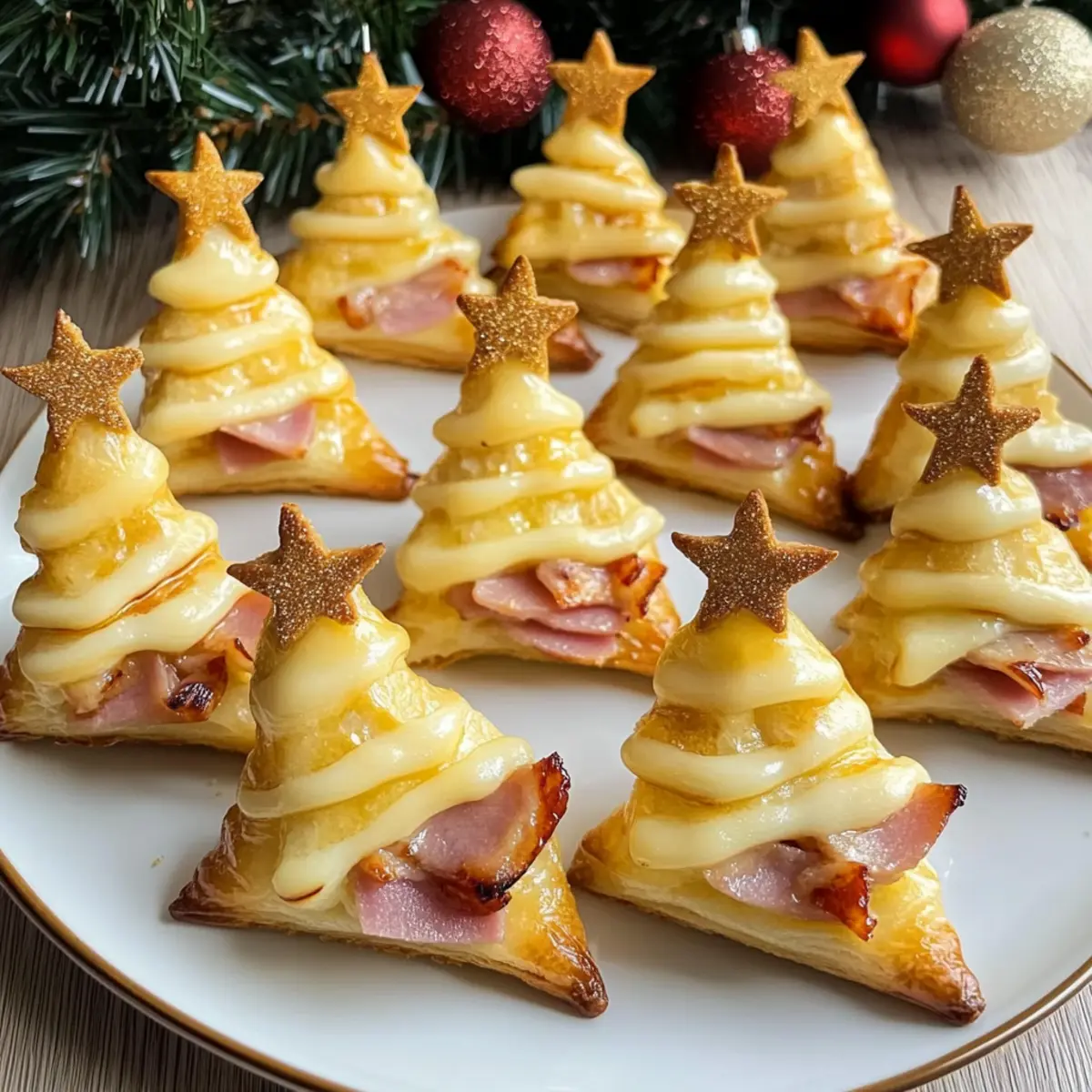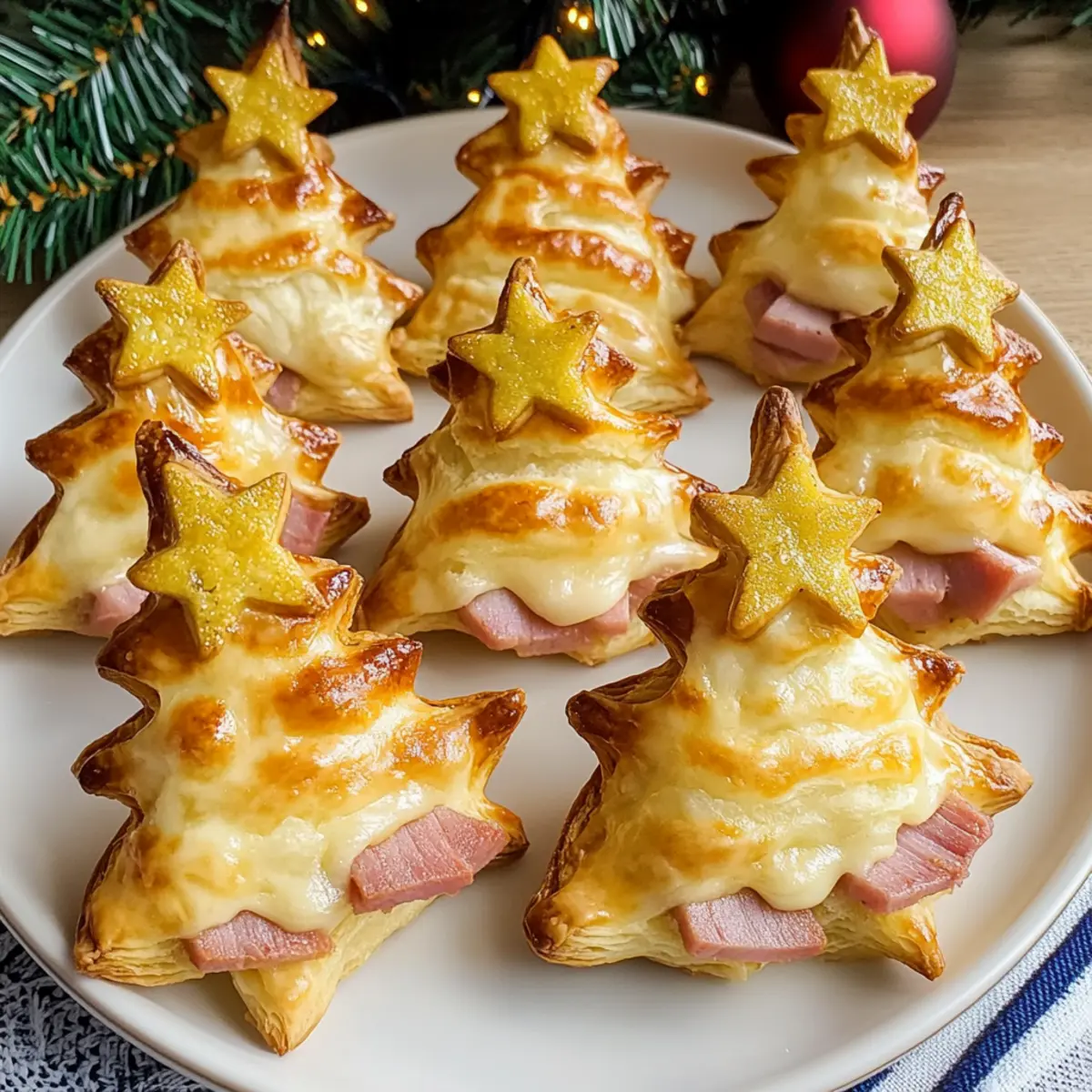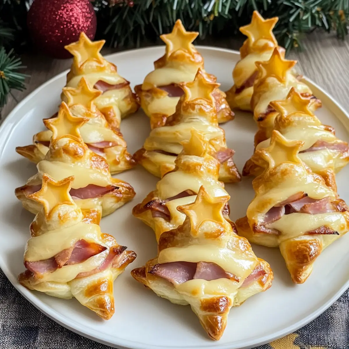 Wenn ich an die festliche Zeit denke, kommen mir sofort die köstlichen Aromen und das fröhliche Beisammensein in den Sinn. Diese herzhaften Tannenbäume aus Blätterteig für Feste sind nicht nur ein wahrer Blickfang, sondern auch ein Hochgenuss in jeder Hinsicht. Mit einer goldenen, flauschigen Kruste und einer herzhaften Füllung aus Schinken und geschmolzenem Gouda sind sie perfekt für gemütliche Abende mit Freunden und Familie. Und das Beste daran? Sie sind in nur 30 Minuten zubereitet und lassen sich ganz nach Belieben mit vegetarischen Optionen anpassen. Wer könnte da widerstehen? Bereit für ein festliches Versuchungsspiel, das alle Gäste begeistert? Warum sollten Sie diese Tannenbäume probieren? Vielfältige Anpassungsmöglichkeiten: Diese herzhaften Tannenbäume aus Blätterteig sind äußerst anpassbar, sodass Sie Ihre Lieblingsfüllungen verwenden können. Ob mit Gemüse oder verschiedenen Käsesorten, die Optionen sind grenzenlos! Schnell und einfach: In nur 30 Minuten können Sie diese festlichen Leckerbissen zubereiten, perfekt für spontane Feiern oder Familienversammlungen. Köstlicher Geschmack: Der mix aus Schinken und geschmolzenem Gouda sorgt für ein Geschmackserlebnis, das auf der Zunge zergeht und alle Gäste begeistert. Wunderbare Präsentation: Diese Tannenbäume sind nicht nur lecker, sondern sehen auch fantastisch aus und bringen festliche Stimmung auf jeden Tisch. Kinderfreundlich: Lassen Sie die Kleinsten mithelfen, beim Formen der Bäume und dem Platzieren der Käsesterne – es ist eine tolle Aktivität für die ganze Familie! Genießen Sie diese einfachen und vielseitigen Snacks, die jedem Festzarum Glanz verleihen. Herzhafte Tannenbäume aus Blätterteig Zutaten Für den Teig Blätterteig – Dieser ist die Basis der Tannenbäume und sorgt für eine flauschige, goldene Kruste. Verwenden Sie hochwertigen, aufgetauten Blätterteig oder frischen aus der Kühltheke. Für die Füllung Schinken – Fügt eine herzhafte Note hinzu; kann durch geflügeltes Gemüse, gefrorene Erbsen oder Pilze als vegetarische Option ersetzt werden. Gouda – Schmilzt wunderbar und verleiht den Tannenbäumen Geschmack; Cheddar ist eine leckere Alternative. Für die Glasur Milch – Wird mit Eigelb gemischt, um die Oberfläche zu glaze; pflanzliche Alternativen sind auch möglich. Eigelb – Sorgt für eine schöne goldene Farbe; kann für eine vegane Variante durch Pflanzenmilch ersetzt werden. Sonstiges Holzspieße – Benötigt, um die Form der Tannenbäume zu halten; vorher in Wasser einweichen, um ein Anbrennen während des Backens zu vermeiden. Diese herzhaften Tannenbäume aus Blätterteig sind die perfekte Ergänzung für Ihre festlichen Feiern! Schritt-für-Schritt-Anleitung für Herzhafte Tannenbäume aus Blätterteig für Feste Step 1: Holzspieße vorbereiten Weichen Sie 16 Holzspieße für mindestens 30 Minuten in Wasser ein. Dies verhindert das Anbrennen während des Backens. Legen Sie die Spieße danach bereit, damit Sie sie später für die Formung der Tannenbäume verwenden können. Step 2: Blätterteig ausrollen Rollen Sie den aufgetauten Blätterteig auf einer bemehlten Arbeitsfläche aus und schneiden Sie ihn in 16 Streifen, jeweils 5 cm breit. Achten Sie darauf, dass der Teig gleichmäßig dick ist, um eine gleichmäßige Backergebnisse für Ihre herzhaften Tannenbäume aus Blätterteig zu erzielen. Step 3: Schinken hinzufügen Legen Sie gleichmäßig Schinkenscheiben auf jeden Blätterteigstreifen, achten Sie darauf, die Ränder frei zu lassen, um das Falten zu erleichtern. Experimentieren Sie gerne mit verschiedenen Schinkenarten oder ersetzen Sie ihn durch eine vegetarische Option, um die Füllung Ihrer Tannenbäume anzupassen. Step 4: Bäume formen Falten Sie jeden Streifen in Form eines Tannenbaums, beginnen Sie breiter an der Basis und arbeiten Sie sich nach oben. Stecken Sie die geformten Tannenbäume vorsichtig auf die vorbereiteten Holzspieße. Dies verleiht den Tannenbäumen Stabilität und sorgt für eine ansprechende Präsentation. Step 5: Glasur vorbereiten Vermischen Sie in einer kleinen Schüssel das Eigelb mit einem Schuss Milch. Diese Mischung sorgt für eine goldene, glänzende Oberfläche. Mit einem Pinsel können Sie die Oberseite der Tannenbäume sorgfältig bestreichen, um einen appetitlichen Glanz zu erzielen. Step 6: Backen Heizen Sie den Ofen auf 200°C vor und legen Sie die Tannenbäume auf ein mit Backpapier ausgelegtes Blech. Backen Sie die Tannenbäume für etwa 15 Minuten, bis sie goldbraun und aufgegangen sind. Ein toller Anblick und Duft wird den Raum erfüllen – genau das, was Sie für Ihre festlichen Anlässe brauchen. Step 7: Käsesterne hinzufügen Schneiden Sie während des Backens einige Gouda-Scheiben in Sternformen. Sobald die Tannenbäume aus dem Ofen kommen, legen Sie die Käsesterne sofort auf die warmen Spitzen der Bäume. Das geschmolzene Käsestück sorgt für einen zusätzlichen festlichen Touch und köstlichen Geschmack. Expert Tips für Herzhafte Tannenbäume Teigvorbereitung:: Achten Sie darauf, dass der Blätterteig vollständig aufgetaut ist und keine dunklen Flecken aufweist, um eine perfekte Textur zu erreichen. Baking beobachten:: Überwachen Sie die Backzeit genau, um ein Überbacken zu vermeiden; der ideale Farbton ist goldbraun und leicht. Kreativ sein:: Lassen Sie Kinder beim Formen der Tannenbäume helfen – es sorgt für Spaß und eine schöne Familieaktivität! Lagerung:: Bewahren Sie übrig gebliebene Tannenbäume in einem luftdichten Behälter auf, um die Knusprigkeit zu erhalten, und erwärmen Sie sie vor dem Servieren im Ofen. Genießen Sie die herzhafte Leckerei und variieren Sie die Füllungen nach Ihrem Geschmack für Ihre herzhaften Tannenbäume aus Blätterteig! Tipps zur Vorbereitung der herzhaften Tannenbäume aus Blätterteig für Feste Diese herzhaften Tannenbäume aus Blätterteig für Feste sind perfekt für einfache und zeitsparende Essensvorbereitung! Sie können alle Bestan