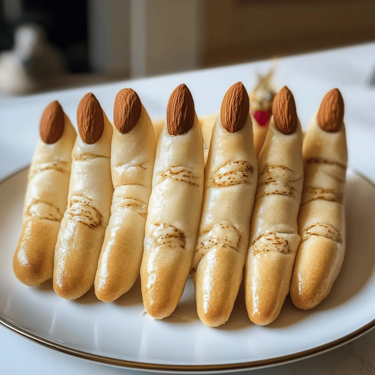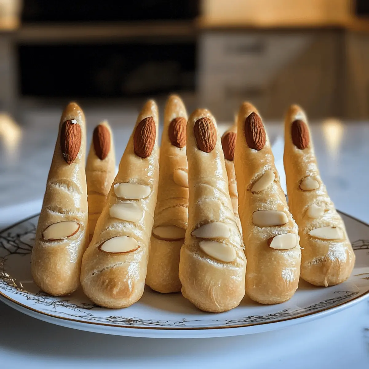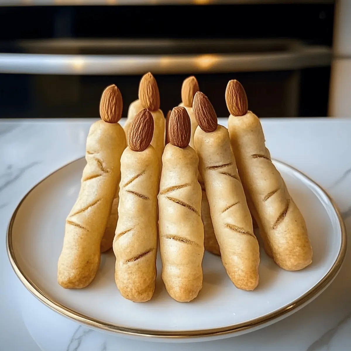 Drücken Sie vorsichtig eine Mandel oder einen Kürbiskern in das verjüngte Ende jedes Teigstücks, um einen gruseligen Fingernagel zu simulieren. Achten Sie darauf, die „Nägel“ fest genug zu drücken, damit sie beim Backen nicht herausfallen. Diese kleinen Details machen Ihre Hexenfinger Brotsticks noch unheimlicher und sorgen für Aufsehen bei Ihren Gästen.