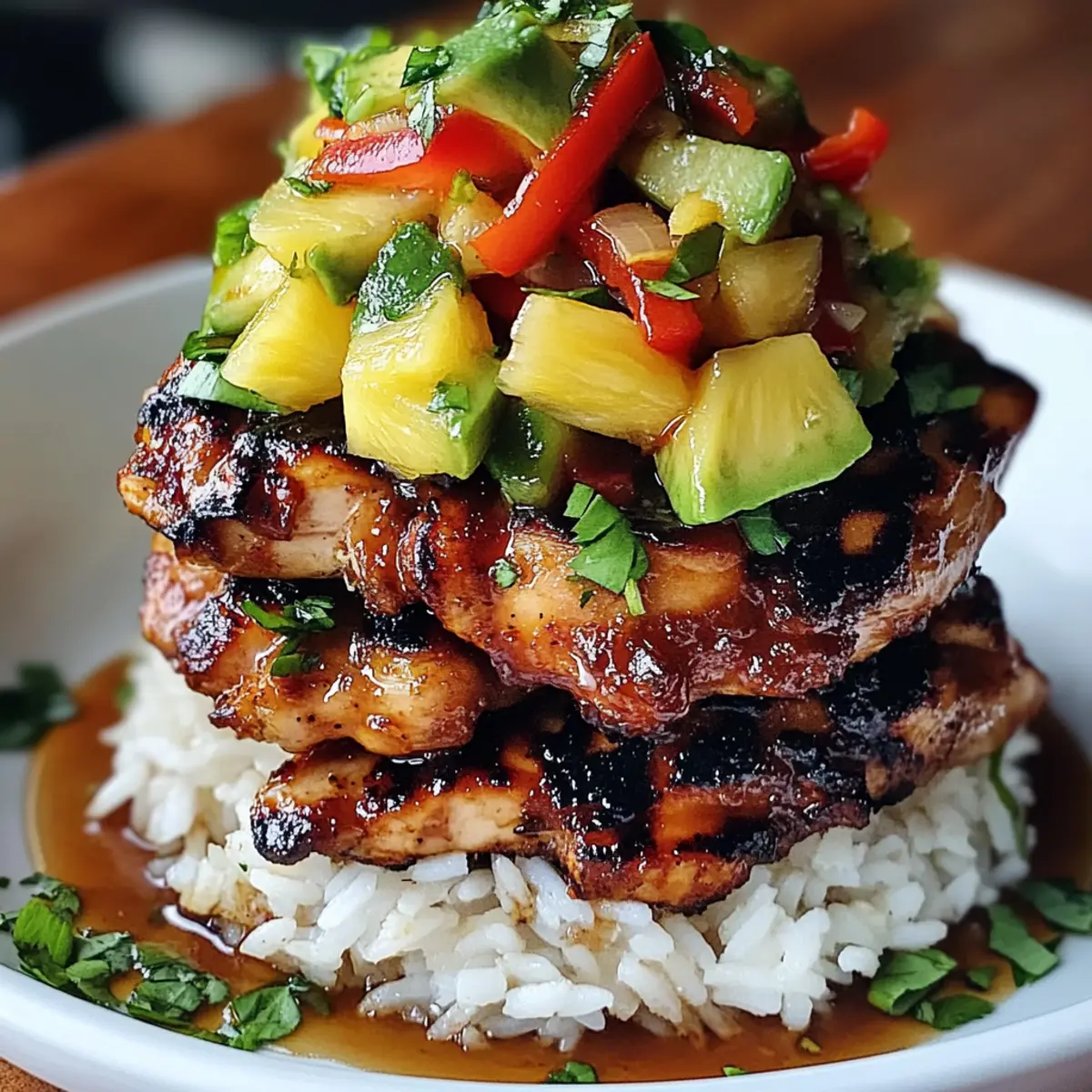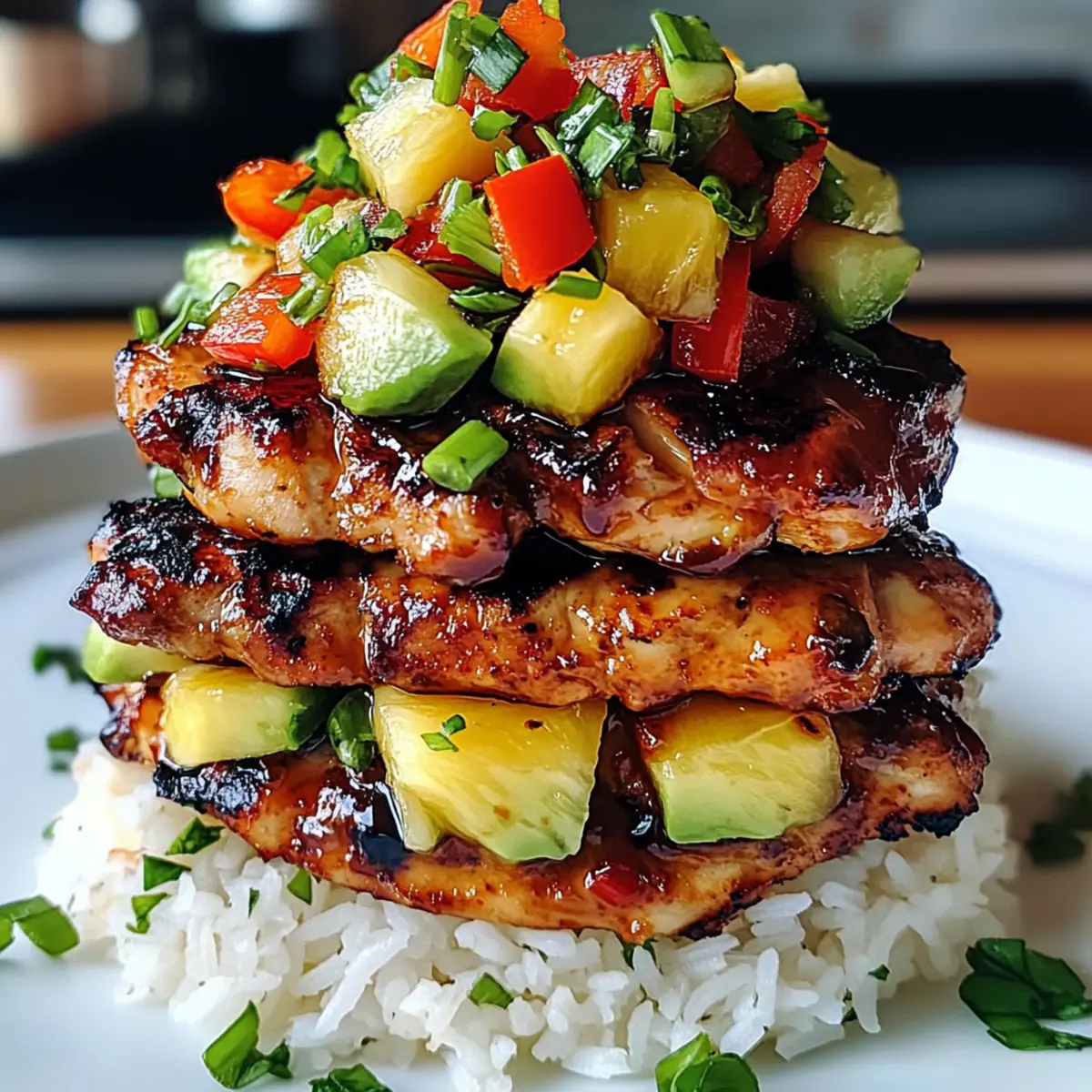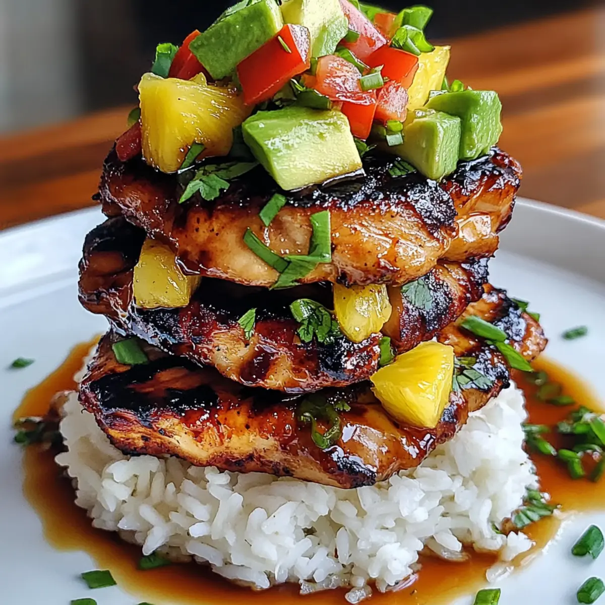 Stell dir vor, du kommst nach einem langen Tag nach Hause und der Duft von süßem, gegrilltem Huli Huli Hähnchen erfüllt die Luft. Dieser Hawaiian Huli Huli Chicken Stack bietet dir nicht nur ein tropisches Geschmackserlebnis, sondern bringt auch ein Stück Urlaub auf deinen Tisch. Mit saftigem, mariniertem Hähnchen und der cremigen Frische von Avocado ist dieses Rezept nicht nur einfach zuzubereiten, sondern auch ein wahrer Publikumsliebling. Perfekt für Sommerabende oder gesellige Zusammenkünfte, wird dieser Stapel mit aromatischem Jasminreis und fruchtiger Ananas alle Blicke auf sich ziehen. Bist du bereit, die Aromen Hawaiis in deiner eigenen Küche zu entdecken? Warum wirst du dieses Rezept lieben? Einzigartige Aromen: Die Kombination aus süßem Ananassaft und herzhaftem Soja sorgt für ein unvergessliches Geschmackserlebnis. Einfache Zubereitung: Nur wenige Schritte und alltägliche Zutaten machen das Kochen zum Vergnügen. Tolle Optik: Farbige Schichten aus Grillhähnchen, hellem Reis und frischem Gemüse sind ein echter Hingucker auf dem Tisch. Vielseitig: Ob mit Reis oder in einem Wrap serviert, der Huli Huli Hähnchen Stapel passt zu vielen Beilagen und ist für alle Gäste geeignet! Perfekt für Feiern: Mit diesem Gericht beeindruckst du Familie und Freunde bei jedem Treffen. Lass auch deine Gäste in den Genuss vom Geschmack Hawaii kommen – probiere dazu auch einen fruchtigen Tropischen Obstsalat! Huli Huli Hähnchen Stapel Zutaten Für das Hähnchen Boneless Skinless Chicken Thighs – Verwende zarte Hähnchenschenkel für einen saftigeren Biss. Soy Sauce – Sorgt für tiefe, umami-reiche Aromen und kann durch eine salzarme Variante ersetzt werden. Brown Sugar – Balanciert die herzhaften Noten; Honig oder Ahornsirup sind ebenso tolle Alternativen. Pineapple Juice – Bringt tropische Süße ins Gericht; frisch gepresster Saft ist ideal, aber Dosenware funktioniert auch. Ketchup – Fügt eine süße und leicht saure Note hinzu. Suche nach einer zuckerreduzierten Variante für eine gesündere Option. Rice Vinegar – Bietet eine angenehme Säure, die den Reichtum des Gerichts ausgleicht. Apfelessig kann hier ebenfalls verwendet werden. Garlic – Verleiht ein aromatisches Geschmacksprofil; frisch gehackter Knoblauch sorgt für den besten Geschmack. Fresh Ginger – Gibt eine warme, würzige Note; getrockneter Ingwer kann verwendet werden, jedoch in halber Menge. Vegetable Oil – Verhindert das Ankleben auf dem Grill; Olivenöl ist eine gute Alternative. Für das Gemüse und Beilagen Jasmine Rice – Die perfekte Basis; zart und duftend. Basmati-Reis eignet sich auch gut, falls er verfügbar ist. Fresh Pineapple – sorgt für einen erfrischenden Kontrast; achte darauf, die Ananas in kleine Stücke zu schneiden. Red Bell Pepper – Bringt Farbe und Crunch ins Gericht; jede süße Paprika kann alternativ genutzt werden. Green Onions – Ideal zur Garnierung; auch Schnittlauch sind eine passende Wahl. Avocado – Ihre Cremigkeit ergänzt den Stapel wunderbar; griechischer Joghurt können dafür auch benutzt werden. Fresh Cilantro – Ermöglicht einen geschmacklichen Wow-Effekt; Petersilie eignet sich für eine mildere Note. Lime Wedges – Sorgt für eine erfrischende Note beim Servieren; frische Limetten sind für den Geschmack unverzichtbar. Dieses Huli Huli Hähnchen Stapel Rezept überrascht nicht nur geschmacklich, sondern auch optisch! Warum also nicht gleich beim nächsten Abendessen ausprobieren? Schritt-für-Schritt-Anleitungen für Huli Huli Hähnchen Stapel Step 1: Marinade vorbereiten Vermische in einer großen Schüssel die Sojasauce, braunen Zucker, Ananassaft, Ketchup, Reisessig, Knoblauch und frischen Ingwer zu einer glatten Marinade. Stelle sicher, dass der Zucker vollständig aufgelöst ist. Dies dauert etwa 2-3 Minuten. Die süße, würzige Mischung ist die Grundlage für das köstliche Aroma des Huli Huli Hähnchen Stapel. Step 2: Hähnchen marinieren Lege die entbeinten Hähnchenschenkel in einen wiederverschließbaren Beutel und gieße die Marinade darüber. Verschließe den Beutel und massiere die Marinade gut in das Fleisch ein, sodass alles gleichmäßig bedeckt ist. Lasse das Hähnchen mindestens 2 Stunden (idealerweise über Nacht) im Kühlschrank marinieren, damit die Aromen in das Fleisch einziehen. Step 3: Grill vorbereiten Heize den Grill oder eine Grillpfanne auf mittelhohe Hitze vor, etwa 200°C. Trage dabei eine dünne Schicht Pflanzenöl auf das Grillrost auf, damit das Hähnchen nicht kleben bleibt. Während der Grill vorheizt, kannst du schon mit der Zubereitung des Reis beginnen, falls du diesen zunächst kochen möchtest. Step 4: Hähnchen grillen Lege die marinierten Hähnchenschenkel auf den vorgeheizten Grill und grille sie für 6-7 Minuten auf jeder Seite. Das Hähnchen ist fertig, wenn die Innentemperatur 75 °C erreicht. Die Außenseite sollte eine leckere, leicht karamellisierte Farbe zeigen. Verwende ein Fleischthermometer, um sicherzustellen, dass es durchgegart ist. Step 5: Reis kochen Während das Hähnchen auf dem Grill ist, bereite den Jasminreis gemäß der Verpackungsanweisung zu. Das Kochen dauert normalerweise etwa 15 Minuten. Stelle sicher, dass der Reis locker und duftend wird, damit er als perfekte Grundlage für deinen Huli Huli Hähnchen Stapel dient. Step 6: Hähnchen ruhen lassen Nehme das gegrillte Hähnchen vom Grill und lasse es 5 Minuten ruhen. Dies ist wichtig, da das Fleisch dadurch saftig bleibt. Am besten wickelst du es in Alufolie, während es ruht, um die Wärme zu halten. Anschließend kannst du das Hähnchen in Streifen schneiden. Step 7: Stapeln beginnen Bereite eine Servierplatte vor, indem du eine Schicht des duftenden Jasminreises auf den Boden legst. Achte darauf, dass der Reis gleichmäßig verteilt ist. Dies wird die Basis für deinen Huli Huli Hähnchen Stapel und sollte etwa 2-3 cm dick sein. Step 8: Hähnchen hinzufügen Lege die in Streifen geschnittenen Hähnchenstücke gleichmä
