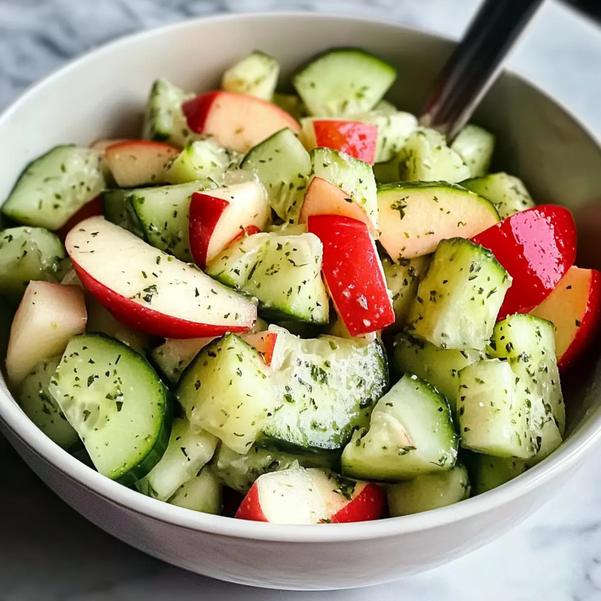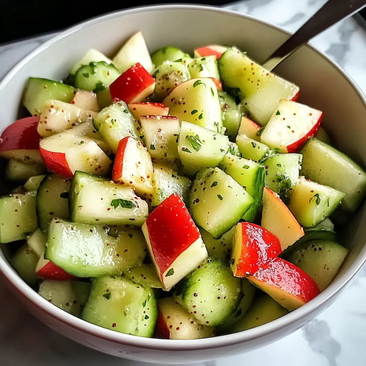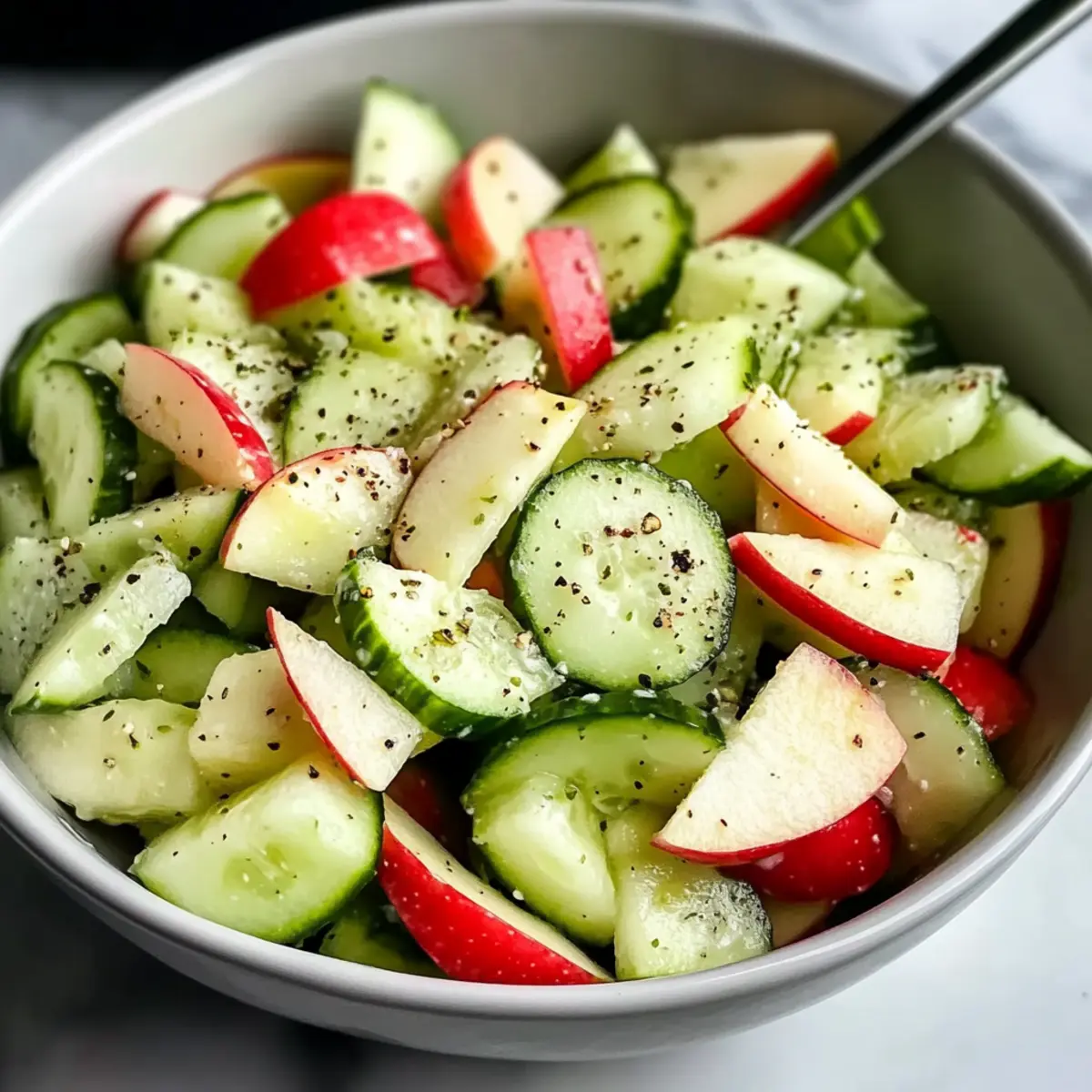 Ein warmer Sommertag, und ich stehe in meiner Küche, der erfrischende Duft von knackigen Gurken und süßen Äpfeln erfüllt den Raum. Mein neuester Küchenheld? Das Rezept für einen knackigen Gurken-Apfelsalat mit würzigem Dressing! Dieses einfache, aber köstliche Gericht ist nicht nur blitzschnell zubereitet, sondern eignet sich auch perfekt als leichter Snack, keine Kochkunst erforderlich! Die harmonische Kombination von kühlen Gurken und saftigen Äpfeln, umhüllt von einem würzigen Dressing aus Apfelessig und frischem Zitronensaft, wird dir garantiert ein Lächeln ins Gesicht zaubern. Wenn du also auf der Suche nach einem gesunden und erfrischenden Gericht bist, das sowohl deine Gäste begeistert als auch deine Geschmacksknospen verwöhnt, dann bleib dran! Welche spannenden Aromen erlebst du in deiner Küche? Warum wirst du dieses Rezept lieben? Einfachheit pur: Die Zubereitung ist kinderleicht und benötigt keine besonderen Kochkünste. Frische Aromen: Die Kombination aus kühlen Gurken und knackigen Äpfeln sorgt für einen erfrischenden Genuss. Vielfältige Verwendung: Ob als leichter Snack, Barbecue-Beilage oder gesundes Mittagessen – dieser Salat passt immer. Gesunde Zutaten: Reich an Vitaminen und kalorienarm, macht er beim Genuss keine Kompromisse. Probiere ihn auch als Ergänzung zu gegrilltem Hähnchen oder Quinoa-Gerichten; das wird deine Familie sicher begeistern! Knackiger Gurken-Apfelsalat Zutaten • Dieser Salat ist der Inbegriff frischer, gesunder Küche und wird deine Geschmacksnerven überraschen! Für den Salat Gurken – sorgen für den perfekten Crunch; verwende für die beste Textur englische oder persische Gurken und schneide sie in mundgerechte Stücke. Äpfel – bieten die süße Note; die Sorten Honeycrisp oder Fuji sind ideal, während Granny Smith für einen herberen Geschmack sorgt. Für das Dressing Apfelessig – bringt die gewünschte Würze ins Dressing; dieser ist entscheidend für das Aroma des Salats. Zitronensaft – verstärkt die frische Note; frische Zitronen sind bevorzugt für ein intensives Aroma. Honig – balanciert die Säure von Essig und Zitronensaft; für eine vegane Variante kann er durch Agavendicksaft oder Ahornsirup ersetzt werden. Salz und Pfeffer – nach Geschmack verwenden, um die Aromen des Salats zu verstärken. Hol dir die Frische auf den Teller mit diesem knackigen Gurken-Apfelsalat mit würzigem Dressing Rezept! Schritt-für-Schritt-Anleitung für Knackiger Gurken-Apfelsalat mit würzigem Dressing Rezept Step 1: Zutaten vorbereiten Wasche die Gurken und Äpfel gründlich unter fließendem Wasser, um Schmutz und Rückstände zu entfernen. Schneide die Gurken in mundgerechte Stücke und die Äpfel in kleine Würfel, wobei du die Schale für zusätzlichen Crunch und Nährstoffe dran lässt. Lege beides in eine große Salatschüssel und bewundere die frischen, lebendigen Farben. Step 2: Dressing zubereiten In einer kleinen Schüssel vermenge den Apfelessig, den frisch gepressten Zitronensaft und den Honig. Verwende einen Schneebesen, um die Zutaten gut zu verrühren, bis sich der Honig vollständig aufgelöst hat und das Dressing eine homogene, glänzende Konsistenz erreicht. Der süß-säuerliche Duft wird schon jetzt die Vorfreude steigern. Step 3: Salat mischen Gieße das würzige Dressing über die vorbereiteten Gurken und Äpfel in der großen Schüssel. Mit einer großen Gabel oder Zange vorsichtig alles vermengen, sodass die Fruchtstücke gleichmäßig mit dem Dressing überzogen sind. Achte darauf, nicht zu fest zu mischen, damit die Gurken und Äpfel knackig bleiben und die Textur des Knackiger Gurken-Apfelsalat mit würzigem Dressing nicht leidet. Step 4: Würzen und servieren Schmecke den Salat mit einer Prise Salz und Pfeffer ab, um die Aromen hervorzuheben. Serviere den knackigen Gurken-Apfelsalat sofort für optimalen Crunch oder stelle ihn für etwa 30 Minuten in den Kühlschrank, damit die Geschmäcker sich gut vermischen und intensivieren. Genieße eine erfrischende, gesunde Mahlzeit! Expert Tips für Knackiger Gurken-Apfelsalat Frische Zutaten: Wähle möglichst frische, in Saison befindliche Gurken und Äpfel, um maximale Aromen und Nährstoffe zu erhalten. Dressing vorher zubereiten: Stelle das Dressing am besten einen Tag vorher her und lasse es im Kühlschrank ziehen – so intensivieren sich die Aromen. Äpfel vor Oxidation schützen: Um das Braunwerden der geschnittenen Äpfel zu vermeiden, mariniere sie sofort in dem Dressing mit Zitronensaft. Vorsicht beim Mischen: Vermeide es, den Salat zu kräftig zu mischen; sanftes Wenden hilft, die knackige Textur des Knackiger Gurken-Apfelsalat mit würzigem Dressing zu bewahren. Variationen erschaffen: Füge je nach Geschmack Zutaten wie rote Zwiebeln oder geröstete Nüsse hinzu, um den Salat interessanter zu gestalten. Was passt zum knackigen Gurken-Apfelsalat mit würzigem Dressing? Dieser bunte Salat ist der perfekte Begleiter für zahlreiche Gerichte, die deine Mahlzeit abrunden und das Geschmackserlebnis steigern. Gegrilltes Hähnchen: Das saftige Hähnchen ergänzt die frische des Salats und bietet eine proteinreiche Komponente. Zusammen wird es zu einer harmonischen Kombination, die sättigt und gleichzeitig leicht bleibt. Quinoa-Salat: Ein nussiger Quinoa-Salat bringt zusätzlichen Biss und eine weitere Ebene an Nährstoffen. Diese Kombination ist nicht nur gesund, sondern auch sättigend und sorgt für ein ausgewogenes Mittagessen. Glasierter Lachs: Der süßlich-glänzende Lachs harmoniert wunderbar mit dem würzigen Dressing des Salats. Die Frische der Gurken und Äpfel schafft einen tollen Kontrast zur reichen Textur des Fisches. Frisches Baguette: Ein köstliches, knuspriges Baguette ist die perfekte Ergänzung, um alle Aromen aufzunehmen. Es sorgt für eine angenehme Textur und füllt die Mahlzeit auf köstliche Weise. Minztee: Ein erfrischender Minztee rundet das Mahlzeit ab. Die kühlenden Aromen der Minze passen hervorragend zu den f
