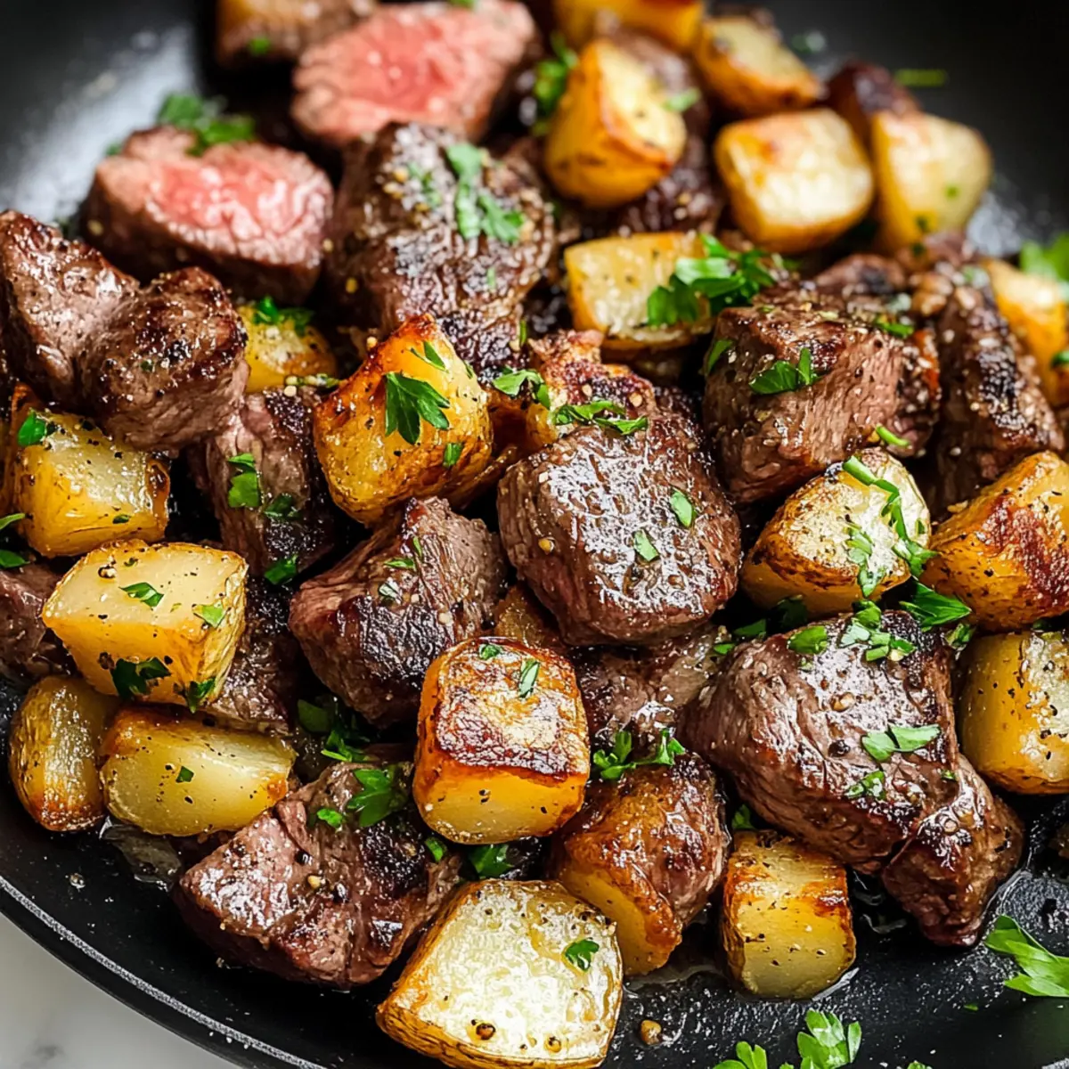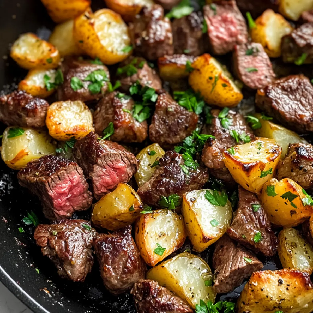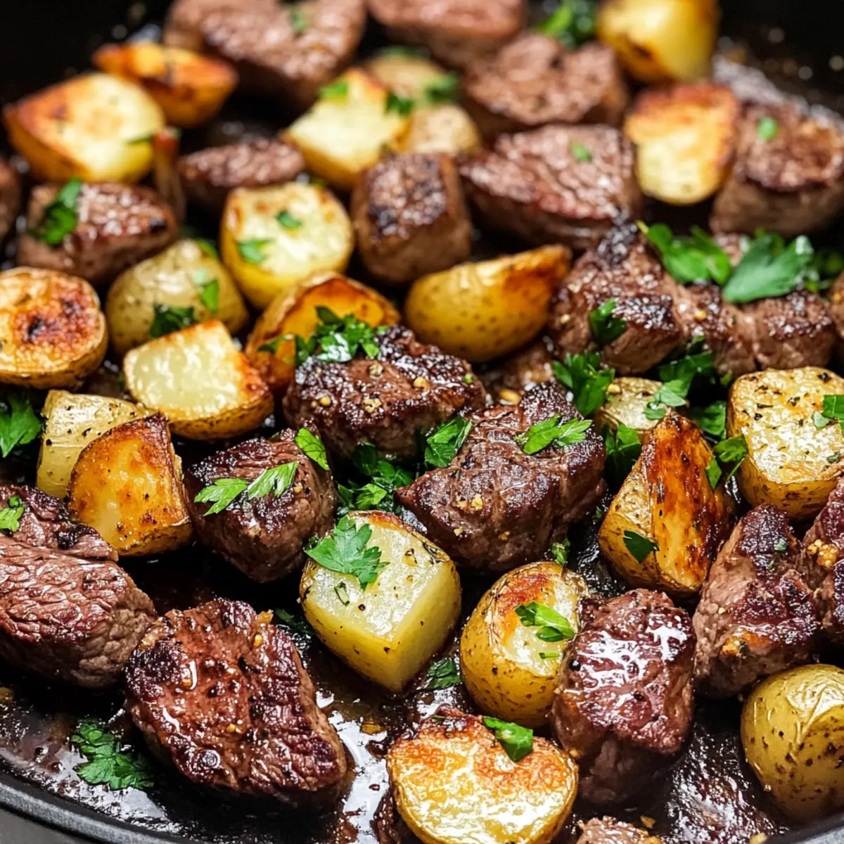 Wenn der Duft von knusprigen Kartoffeln und zartem Steak durch die Küche zieht, kann man sicher sagen, dass ein ganz besonderes Gericht in der Luft liegt: Knoblauchbutter-Rinderbissen und Kartoffeln. Diese köstliche Kombination aus saftigen Rinderbissen, perfekt angebraten und umhüllt von aromatischer Knoblauchbutter, bleibt nicht nur in der Erinnerung der Genießenden haften, sondern liefert auch ein schnelles und nahrhaftes Abendessen. In weniger als 20 Minuten zaubern wir ein Gericht auf den Tisch, das sowohl praktisch als auch gemütlich ist – ideal für geschäftige Wochentage oder entspannte Familienabende. Wie würde Ihr Abend aussehen, wenn Sie diese köstlichen Bissen servieren? Tauchen Sie ein in den unwiderstehlichen Genuss und lassen Sie sich von meiner Variante verführen! Warum werden Sie dieses Rezept lieben? Einfachheit: Die Zubereitung könnte nicht leichter sein – mit nur wenigen Zutaten und einem einzigen Pfannen-Gericht sind Sie in weniger als 20 Minuten fertig. Reichhaltiger Geschmack: Die Kombination aus Knoblauchbutter und zartem Steak bringt eine Geschmacksexplosion auf Ihren Teller, die selbst Feinschmecker begeistert. Vielseitigkeit: Variieren Sie die Rezeptur ganz nach Ihrem Geschmack – addieren Sie Gemüse wie Paprika oder Champignons für zusätzliche Frische und Nährstoffe! Geselligkeit: Perfekt für gesellige Abende – jeder wird nach dem Rezept fragen, nachdem sie die köstlichen Rinderbissen und Kartoffeln probiert haben. Gesundheitsbewusst: Glutenfrei und proteinreich, ist dieses Gericht auch eine großartige Wahl für gesundheitsbewusste Esser. Entdecken Sie auch die klassische Kürbissuppe mit Hokkaido für ein weiteres schnelles und schmackhaftes Rezept oder probieren Sie die Luftfritteuse Frühlingsrollen Rezept für eine leckere Vorspeise! Knoblauchbutter-Rinderbissen und Kartoffeln Zutaten Für die Butter: Ghee oder Butter (¼ Tasse) – Verleiht dem Gericht Reichhaltigkeit und Geschmack; für Laktoseempfindlichkeit kann Ghee verwendet werden. Olivenöl (1 Esslöffel) – Üblicherweise zum Sautieren der Kartoffeln genutzt; kann durch Avocadoöl ersetzt werden, um einen höheren Rauchpunkt zu erreichen. Für die Kartoffeln: Yukon Gold Kartoffeln (1 Pfund, in 1,5 cm Würfel geschnitten) – Bietet eine cremige Textur; auch rote oder fingerling Kartoffeln sind geeignet. Knoblauch (3 Zehen, gehackt) – Fügt einen kräftigen, herzhaften Geschmack hinzu; frischer Knoblauch ist für den besten Geschmack empfohlen. Für die Gewürze: Getrockneter Thymian (1 Teelöffel) – Bringt aromatische Noten; frischer Thymian kann verwendet werden, die Menge entsprechend anpassen. Getrockneter Oregano (½ Teelöffel) – Harmoniert mit den anderen Aromen; kann bei Bedarf durch italienisches Gewürz ersetzt werden. Meersalz (½ Teelöffel, plus mehr nach Geschmack) – Verstärkt alle Geschmäcker; nach Belieben anpassen. Schwarzer Pfeffer (¼ Teelöffel, plus mehr nach Geschmack) – Sorgt für eine subtile Schärfe; frisch gemahlener Pfeffer wird für den besten Geschmack empfohlen. Für das Fleisch: Rinderfilet (1 ¼ Pfund, in 1,5 cm Würfel geschnitten) – Ideal zum schnellen Garen und für Zartheit; Alternativen sind Ribeye oder Filetsteak. Entdecken Sie die unvergleichliche Kombination aus Knoblauchbutter und Rinderbissen in diesem einfachen und köstlichen Rezept! Schritt-für-Schritt-Anleitung für Knoblauchbutter-Rinderbissen und Kartoffeln Step 1: Pfanne vorbereiten Erhitzen Sie eine große gusseiserne Pfanne bei mittlerer Hitze. Geben Sie 1 Esslöffel Olivenöl und 2 Esslöffel Ghee in die Pfanne. Warten Sie, bis das Fett geschmolzen und leicht sprudelnd ist, um sicherzustellen, dass die Pfanne heiß genug ist für die nächsten Schritte. Step 2: Kartoffeln kochen Fügen Sie die in Würfel geschnittenen Yukon Gold Kartoffeln in die Pfanne hinzu. Streuen Sie den gehackten Knoblauch, Thymian, Oregano, Salz und Pfeffer darüber. Braten Sie die Kartoffeln für 2-3 Minuten ohne Rühren an, bevor Sie sie regelmäßig umrühren. Kochen Sie weiter, bis sie goldbraun und mit einer Gabel zart sind, etwa 8-10 Minuten. Nehmen Sie die Kartoffeln dann aus der Pfanne und stellen Sie sie beiseite. Step 3: Steak anbraten Erhöhen Sie die Hitze auf mittel-hoch und geben Sie das restliche Ghee in die Pfanne. Warten Sie, bis das Ghee geschmolzen und leicht blubbernd ist, bevor Sie die Rinderfiletwürfel hinzufügen. Würzen Sie die Stücke mit Salz und Pfeffer. Braten Sie das Steak 2 Minuten lang ungestört an, bis es goldbraun ist. Rühren Sie um und braten Sie es weitere 1-2 Minuten, bis es gleichmäßig gebräunt ist. Step 4: Kombinieren und servieren Geben Sie die vorher gekochten Kartoffeln wieder in die Pfanne zu den Rinderbissen. Vermengen Sie alles gut, damit die Aromen sich verbinden. Schmecken Sie das Gericht ab und passen Sie nach Belieben mit mehr Salz und Pfeffer an. Servieren Sie die Knoblauchbutter-Rinderbissen und Kartoffeln warm und garnieren Sie sie nach Wunsch mit frisch gehackter Petersilie. Knoblauchbutter-Rinderbissen und Kartoffeln im Voraus zubereiten Die Knoblauchbutter-Rinderbissen und Kartoffeln sind perfekt für die Vorbereitung im Voraus! Sie können die Kartoffeln bereits bis zu 24 Stunden im Voraus schneiden und in kaltem Wasser aufbewahren, um das Braunwerden zu verhindern. Zusätzlich können Sie das Steak bereits würzen und in einem luftdichten Behälter im Kühlschrank lagern. Am Tag des Servierens erhitzen Sie einfach das Olivenöl und das Ghee in der Pfanne und fügen die vorbereiteten Kartoffeln hinzu, gefolgt vom Steak. Diese Schritte sparen nicht nur Zeit, sondern garantieren auch, dass Ihr Gericht frisch und köstlich bleibt. So steht einem stressfreien Abendessen nichts im Wege, und Ihre Familie wird es lieben! Lagerungstipps für Knoblauchbutter-Rinderbissen und Kartoffeln Kühlschrank: Bewahren Sie Reste in einem luftdichten Behälter auf und konsumieren Sie sie innerhalb von 5 Tagen, um den besten Geschmack und die o