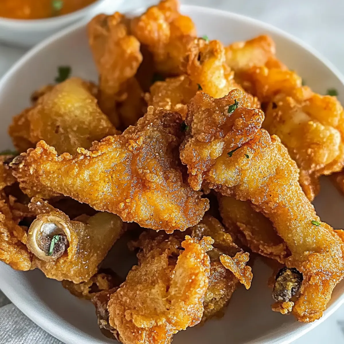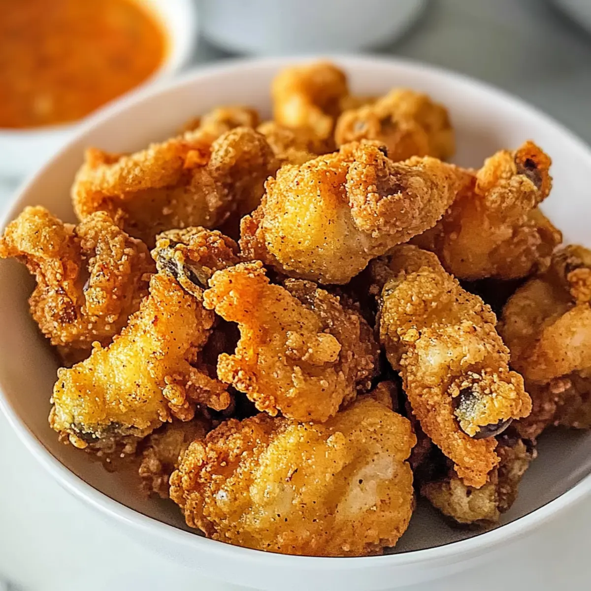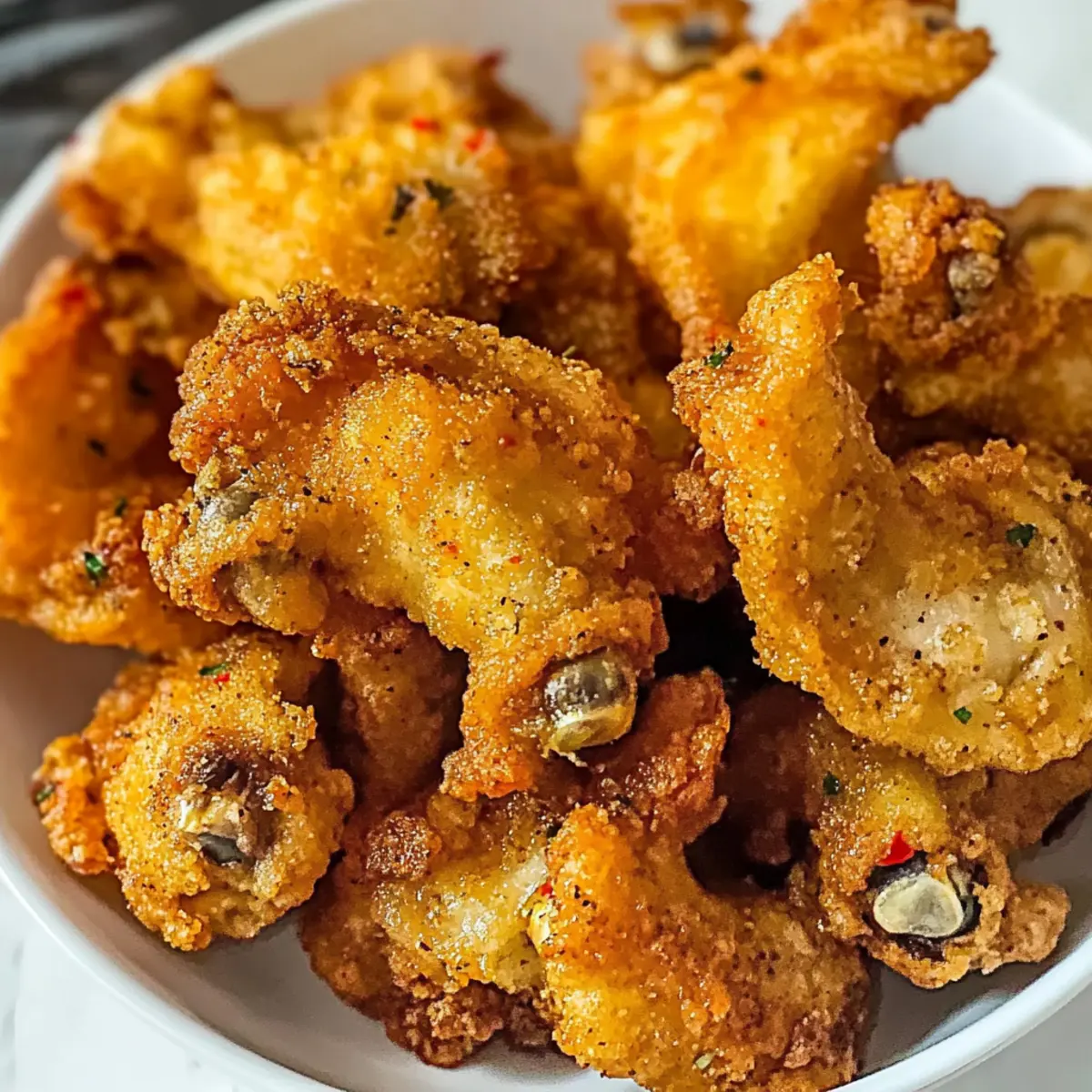 Als ich kürzlich in einer kleinen, belebten Stadt ein charmantes Restaurant betrat, durchzog der köstliche Duft von frittierten Austernpilzen die Luft. Diese knusprigen Leckerbissen sind nicht nur ein wahrer Genuss, sondern auch eine einfache und schnelle Lösung für alle, die sich nach etwas Hausgemachtem sehnen. Mit meinem Rezept für knusprige frittierte Austernpilze mit scharfer Gewürzmischung könnt ihr euren nächsten Snack oder ein aufregendes Appetithäppchen zubereiten, das garantiert begeistert – besonders ideal für gesellige Abende oder spontane Zusammenkünfte. Und das Beste daran? Diese Pilze sind vegetarisch und können sogar glutenfrei zubereitet werden, sodass echt jeder mitgenießen kann! Seid ihr bereit, in die Welt der knusprigen Genüsse einzutauchen? Warum wirst du dieses Rezept lieben? Einfachheit: Die Zubereitung ist unkompliziert und benötigt nur grundlegende Kochfertigkeiten, sodass du in kürzester Zeit deine Gäste beeindrucken kannst. Köstlicher Geschmack: Die Kombination aus scharfen Gewürzen und der zarten Textur der Austernpilze sorgt für ein unvergleichliches Geschmackserlebnis. Vielseitigkeit: Diese frittierten Pilze können sowohl als Snack, als auch als Beilage zu jedem Gericht serviert werden – perfekt für jede Gelegenheit! Gesellige Speise: Ideal für gesellige Abende, die knusprigen Austernpilze machen selbst einfache Zusammenkünfte aufregend! Gesunde Wahl: Mit einer vegetarischen Variante und der Möglichkeit, glutenfreies Mehl zu verwenden, ist dieses Rezept für jeden geeignet. Experimentiere auch mit verschiedenen Dips wie spicy aioli oder lass dich von anderen Appetithäppchen inspirieren! Knusprige frittierte Austernpilze Zutaten • Hier sind die Zutaten für das perfekte Rezept! Für die Panade Austernpilze – Frische, feste Pilze liefern einen reichen Umami-Geschmack und eine zarte Textur. Achte darauf, dass sie lebendig und ohne Schleim sind. Weizenmehl – Schafft die knusprige Panade. Du kannst glutenfreies Mehl verwenden, um diese knusprigen frittierte Austernpilze mit scharfer Gewürzmischung glutenfrei zuzubereiten. Paprikapulver (1½ TL) – Fügt Rauchigkeit und Tiefe zum Geschmacksprofil hinzu. Verwende geräuchertes Paprikapulver für zusätzliche Schärfe. Knoblauchpulver (1½ TL) – Unverzichtbar für aromatische Fülle und ergänzt die Pilze perfekt. Zwiebelpulver (1½ TL) – Verstärkt den herzhaften Geschmack, ohne dass du Zwiebeln hacken musst. Kurkuma (1 TL) – Sorgt für eine wunderschöne goldene Farbe und erdigen Geschmack der Panade. Cayennepfeffer (¼ TL) – Fügt eine Prise Schärfe hinzu und hebt den Gesamtgeschmack hervor. Salz (1 TL) – Unentbehrlich für die Geschmacksverstärkung; nach Geschmack anpassen. Gemahlener Pfeffer – Fügt Wärme und Biss zur Panade hinzu. Für das Frittieren Öl zum Frittieren – Ein neutrales Öl mit hohem Rauchpunkt (z.B. Pflanzen- oder Rapsöl) eignet sich ideal zum Frittieren. Schritt-für-Schritt-Anleitung für Knusprige frittierte Austernpilze mit scharfer Gewürzmischung Step 1: Austernpilze vorbereiten Die Austernpilze vorsichtig mit einem feuchten Papiertuch abwischen, um Verunreinigungen zu entfernen, ohne dass sie Feuchtigkeit aufnehmen. Achte darauf, dass die Pilze frisch und fest sind. Diese Vorbereitung ist entscheidend, um die perfekte Textur in deinem Rezept für knusprige frittierte Austernpilze mit scharfer Gewürzmischung zu erreichen. Step 2: Trockene Zutaten mischen In einer großen Schüssel das Weizenmehl mit Paprikapulver, Knoblauchpulver, Zwiebelpulver, Kurkuma, Cayennepfeffer, Salz und gemahlenem Pfeffer gründlich vermengen. Diese Mischung bildet die knusprige Panade. Achte darauf, dass die Gewürze gleichmäßig verteilt sind, um jedem Bissen den besten Geschmack zu verleihen. Step 3: Teig vorbereiten In einer separaten Schüssel ein Drittel der trockenen Mischung mit ¾ Tasse Wasser verrühren, bis ein glatter Teig entsteht. Dieser Teig wird helfen, die Austernpilze gleichmäßig zu ummanteln, was für die knusprige Textur beim Frittieren wichtig ist. Stelle sicher, dass keine Klumpen im Teig sind. Step 4: Pilze panieren Die vorbereiteten Austernpilze in den nassen Teig eintauchen und überschüssigen Teig abtropfen lassen. Danach die Pilze in die trockene Mischung tauchen, bis sie gut bedeckt sind. Für eine extra knusprige Textur kannst du die Pilze erneut in den Teig und wieder in die trockene Mischung tauchen. So werden die knusprigen frittierte Austernpilze noch köstlicher. Step 5: Pilze frittieren In einem großen Topf ausreichend Öl bei mittlerer bis hoher Hitze erhitzen, bis es etwa 180 °C erreicht. Die Austernpilze vorsichtig nacheinander ins heiße Öl geben und für 3-4 Minuten frittieren, bis sie goldbraun und knusprig sind. Achte darauf, die Pilze zu wenden, um eine gleichmäßige Bräunung zu gewährleisten. Step 6: Abtropfen und Auskühlen Die frittierten Austernpilze mit einem Schaumlöffel herausnehmen und auf einem mit Küchenpapier ausgelegten Teller ablegen, um überschüssiges Öl abzutropfen. Danach die Pilze auf einem Gitterrost anrichten, damit sie abkühlen können. So bleibt die knusprige Textur auch nach dem Frittieren erhalten. Bereite deine knusprigen frittierte Austernpilze im Voraus vor! Die knusprigen frittierte Austernpilze mit scharfer Gewürzmischung sind perfekt für die Meal Prep! Du kannst die Austernpilze bis zu 24 Stunden im Voraus reinigen und die trockenen Zutaten wie Mehl und Gewürze bereits mischen. Bewahre die vorbereiteten Pilze und die Trockenmischung in luftdichten Behältern im Kühlschrank auf. Ein wichtiges Tipp: Um die knusprige Textur zu erhalten, frittiere die Pilze direkt vor dem Servieren, sodass sie frisch und köstlich sind. Bei der Zubereitung einfach die Pilze in die vorbereitete Bierteig-Mischung tauchen, die Trockenmischung hinzufügen und in heißem Öl frittieren. So sparst du Zeit und erhältst dennoch ein erstklassiges Ergebnis! Aufbewahrungstipps für knusprige frit