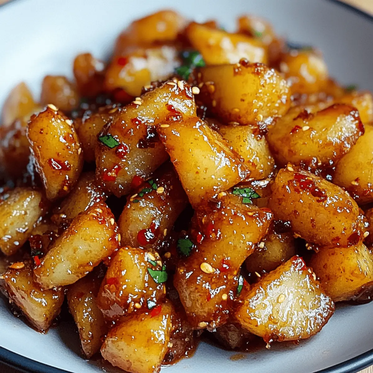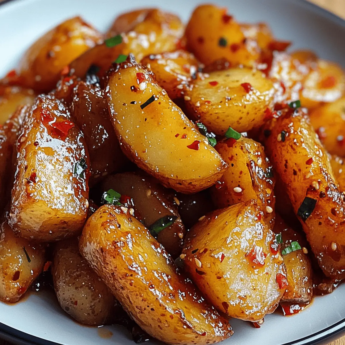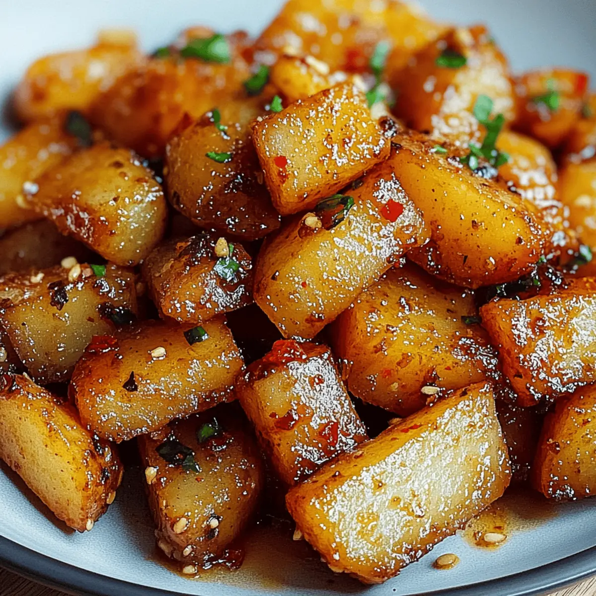 Die beste Art, um einen langweiligen Snack-Bereich aufzupeppen? Natürlich mit Knusprigen Honig-Chili-Kartoffeln! Diese kleinen Wunderwerke sind nicht nur schnell und einfach zuzubereiten, sondern auch wahre Alleskönner: Sie eignen sich perfekt als herzhafter Snack für zwischendurch oder als köstliche Beilage zu jedem Hauptgericht. Mit einer perfekten Kombination aus süßem Honig und würziger Chili-Note verwandeln sie jede Get-together-Party in ein Geschmacksfest. Die goldbraune, knusprige Außenschicht und das weiche Innere bringen ein harmonisches Zusammenspiel der Texturen auf den Teller. Mit nur wenigen Zutaten und in weniger als einer Stunde zubereitet, werden sie schnell zum Favoriten in deiner Küche. Bereit, das Rezept für dich zu entdecken? Lass uns gemeinsam diese süß-scharfen Leckerbissen kreieren! Warum Knusprige Honig-Chili-Kartoffeln lieben? Vielfalt: Diese Kartoffeln sind mehr als nur ein Snack; sie passen fantastisch zu jeder Hauptspeise und sind auch beim Grillen ein Hit. Einfache Zubereitung: Mit nur wenigen Zutaten und minimalem Aufwand sind sie ideal für spontane Hungerattacken. Aromen, die begeistern: Die Kombination aus süßem Honig und scharfer Chili sorgt für ein Geschmackserlebnis, das deine Gäste ins Staunen versetzen wird. Texturen, die verführen: Die goldbraune, knusprige Außenschicht harmoniert perfekt mit dem weichen, fluffigen Inneren. Wenn du weitere spannende Rezepte suchst, schau dir doch mal die knusprigen Kohlrabi Schnitzel oder die knusprigen Hähnchen Frühlingsrollen an – sie sind ebenso lecker und schnell gemacht! Knusprige Honig-Chili-Kartoffeln Zutaten • Für die Kartoffeln Kartoffeln – Wähle wachsige Kartoffeln für eine optimale Textur und besseren Geschmack. Öl – Verwende hochwertiges Olivenöl oder ein neutrales Öl, um die perfekte Knusprigkeit zu erreichen. • Für die Marinade Honig – Er sorgt für die süße Note und verstärkt die Karamellisierung; für eine vegane Variante kann Sirup genutzt werden. Chili – Verwende Chili-Pulver oder -Flocken, um der Marinade die nötige Schärfe zu verleihen; passe die Menge nach deinem Geschmack an. Salz – Unverzichtbar für die perfekte Würze; runde das Gesamtaroma der Knusprigen Honig-Chili-Kartoffeln ab. Bon appétit und viel Spaß beim Kochen! Schritt-für-Schritt-Anleitung für Knusprige Honig-Chili-Kartoffeln Step 1: Backofen vorheizen Heize deinen Backofen auf 200°C (392°F) vor. Diese Temperatur sorgt dafür, dass die Knusprigen Honig-Chili-Kartoffeln gleichmäßig garen und eine schöne goldbraune Farbe annehmen. Bereite währenddessen ein Backblech mit Backpapier vor, auf dem die Kartoffeln später gleichmäßig verteilt werden. Step 2: Kartoffeln vorbereiten Wasche die Kartoffeln gründlich und schneide sie in gleichmäßige Stücke. Achte darauf, dass die Stücke etwa gleich groß sind, damit sie gleichmäßig garen. Je nach Größe der Kartoffeln solltest du die Stücke in Viertel oder Würfel schneiden, um die ideale Textur für die knusprigen Kartoffeln zu erreichen. Step 3: Marinade zubereiten In einer großen Schüssel vermischst du den Honig, das Chili-Pulver und das Olivenöl, bis alles gut kombiniert ist. Die Marinade sollte eine glatte Konsistenz haben. Der Honig sorgt für Süße, während das Chili-Pulver eine angenehme Schärfe hinzufügt. Diese Mischung ist die geheime Zutat, die deinen Kartoffeln das besondere Aroma verleiht. Step 4: Kartoffeln marinieren Gib die geschnittenen Kartoffeln in die Schüssel mit der Marinade und toss sie gut, bis jedes Stück gleichmäßig bedeckt ist. Dies garantiert, dass jede Kartoffel die köstliche Kombination aus Honig und Chili aufnehmen kann. Lass die Kartoffeln für ein paar Minuten in der Marinade ruhen, damit sie die Aromen aufnehmen können. Step 5: Kartoffeln auf dem Blech verteilen Verteile die marinierten Kartoffeln gleichmäßig auf dem vorbereiteten Backblech. Achte darauf, dass sie in einer einzelnen Schicht liegen, um ein Ankleben zu verhindern und eine gleichmäßige Bräunung zu erzielen. Überfülle das Blech nicht, da dies die Knusprigkeit beeinträchtigen könnte. Step 6: Kartoffeln rösten Schiebe das Blech in den vorgeheizten Ofen und röste die Knusprigen Honig-Chili-Kartoffeln für 30-35 Minuten. Wende die Kartoffeln nach der Hälfte der Garzeit, um sicherzustellen, dass sie auf allen Seiten schön knusprig werden. Behalte sie im Auge, um eine perfekte goldene Bräunung zu erreichen. Step 7: Würzen und servieren Nehme die Kartoffeln aus dem Ofen, wenn sie goldbraun und knusprig sind. Würze sie nach Belieben mit etwas Salz, um den Geschmack zu intensivieren. Die Kombination aus Süße und Schärfe wird deine Sinne begeistern und macht diese Knusprigen Honig-Chili-Kartoffeln zu einem perfekten Snack oder einer Beilage. Lagerung und Einfrieren von Knusprigen Honig-Chili-Kartoffeln Raumtemperatur: Lass die Kartoffeln vollständig abkühlen, bevor du sie bei Raumtemperatur für bis zu 2 Stunden aufbewahrst. Sie können jedoch am besten frisch genossen werden. Kühlschrank: Bewahre übrig gebliebene Knusprige Honig-Chili-Kartoffeln in einem luftdichten Behälter im Kühlschrank für bis zu 2 Tage auf. So bleiben sie frischer und geschmackvoller. Einfrieren: Für eine längere Lagerung kannst du die Kartoffeln einfrieren. Lege sie nach dem Abkühlen in einen Gefrierbeutel und friere sie ein. Sie sind bis zu 3 Monate haltbar. Aufwärmen: Um die Knusprigen Honig-Chili-Kartoffeln erneut zu genießen, erhitze sie im Ofen bei 180°C (356°F) für ca. 10-15 Minuten, bis sie wieder schön knusprig sind. Expert Tips für Knusprige Honig-Chili-Kartoffeln Gleichmäßiges Schneiden: Achte darauf, die Kartoffeln in gleichmäßige Stücke zu schneiden. So garen sie gleichmäßig und werden perfekt knusprig. Marinade einziehen lassen: Lasse die Kartoffeln einige Minuten in der Marinade ruhen, damit sie den vollen Geschmack der Honig-Chili-Mischung aufnehmen können. Platzieren: Lege die Kartoffeln in eine