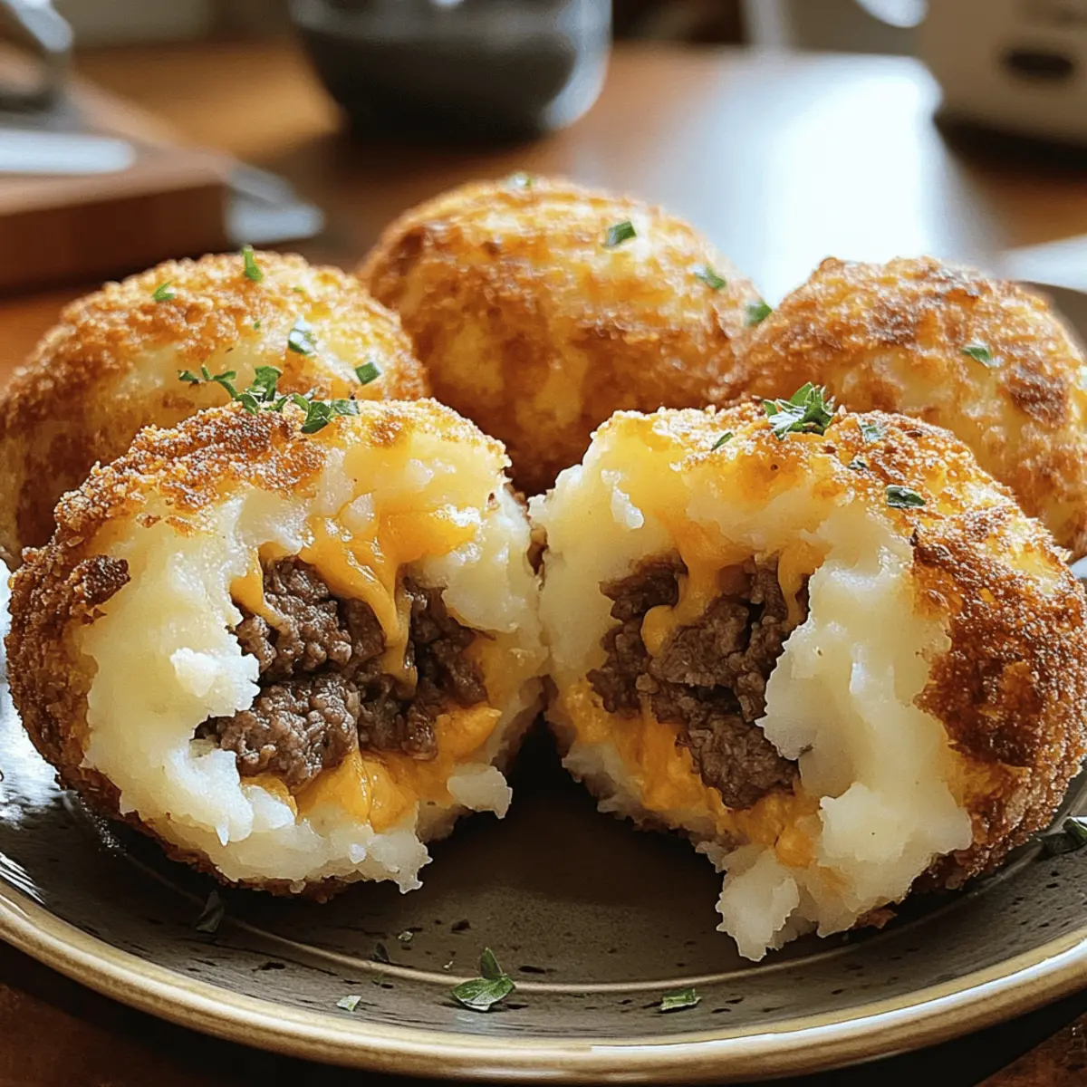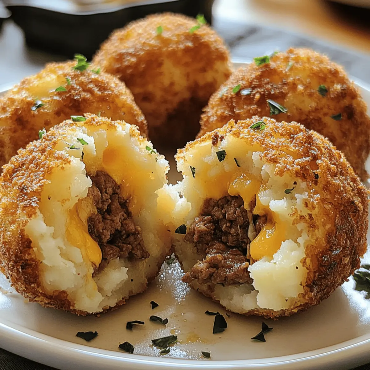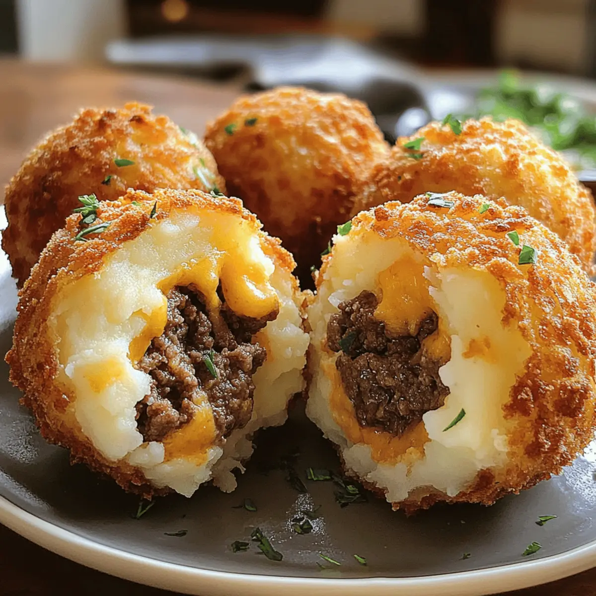 Die krosse Hülle, die beim Zubeißen einen verlockenden Klang erzeugt, ist nur der Anfang eines unwiderstehlichen Genusses. Heute präsentiere ich euch mein Rezept für knusprige Kartoffelbrei mit Käse und Rindfleisch gefüllt. Dieses Gericht vereint einen goldbraunen, knusprigen Teig mit einer cremigen Füllung aus samtigem Kartoffelpüree, die mit herzhaftem Rinderhack und schmelzendem Käse verfeinert ist. Perfekt für ein schnelles Abendessen nach einem langen Tag oder als Showstopper beim nächsten Familientreffen – diese kleinen Leckereien sind nicht nur lecker, sondern auch kinderleicht zuzubereiten. Ihr müsst euch keine Sorgen um komplizierte Techniken machen! Neugierig, wie ihr mit ein paar einfachen Zutaten zu einem wahren Genuss gelangen könnt? Warum sind diese Kartoffelbällchen so besonders? Einzigartiger Genuss: Diese knusprigen Kartoffelbrei mit Käse und Rindfleisch gefüllt sind ein wahrer Gaumenschmaus! Vielfältige Variationen: Egal, ob ihr Vegetarier seid oder Lust auf eine Low-Carb-Option habt, die Anpassungsmöglichkeiten sind endlos. Einfache Zubereitung: Auch für Kochanfänger ist das Rezept leicht verständlich, sodass jeder Erfolg haben kann. Perfekte Konsistenz: Der köstliche Kontrast zwischen der knusprigen Außenseite und dem cremigen Inneren sorgt für ein unvergessliches Geschmackserlebnis. Ideal für jeden Anlass: Egal ob als Snack, Vorspeise oder Hauptgericht – diese kleinen Leckerbissen sind ein Hit bei Familie und Freunden! Wenn ihr nach einer schnellen und schmackhaften Lösung sucht, schaut euch unbedingt unsere Variationen für vegetarische Optionen an! Knusprige Kartoffelbrei mit Käse und Rindfleisch gefüllt Rezept Zutaten Unten stehend findet ihr alles, was ihr braucht, um diese köstlichen Kartoffelbällchen zuzubereiten! Für die Kartoffelmischung • Festkochende Kartoffeln (1 kg) – Sorgt für die perfekte Struktur und Cremigkeit; am besten eignen sich Yukon Gold oder Charlotte. • Eier (2) – Binden die Kartoffelmischung zusammen; für eine vegane Version kann eine Leinsamenmehl-Alternative verwendet werden. • Butter (4 EL) – Verleiht der Mischung zusätzliche Reichhaltigkeit; kann durch Olivenöl für eine leichtere Option ersetzt werden. • Salz (1 TL), Pfeffer (1/2 TL), Paprikapulver (1 TL) – Gewürze, die das gesamte Gericht aufwerten; experimentiert ruhig mit anderen Gewürzen wie Kreuzkümmel oder Chili! Für die Füllung • Rinderhackfleisch (200 g) – Bringt herzhaften Geschmack und Protein; kann durch Hähnchen oder eine Mischung aus Linsen und Pilzen ersetzt werden. • Zwiebel (1, fein gehackt) – Bereichert die Füllung mit einer zusätzlichen Geschmackstiefe; jede Zwiebelart ist verwendbar. • Knoblauchzehen (2, gehackt) – Fügt aromatische und würzige Noten hinzu; frischer Knoblauch ist bevorzugt, aber Knoblauchpulver kann auch verwendet werden. • Geriebener Käse (100 g) – Sorgt für eine cremige Textur; Cheddar oder Gouda sind ideal, oder probiert Variationen mit Mozzarella oder Feta. Für die knusprige Panade • Paniermehl (100 g) – Gewährleistet eine schöne, knusprige Beschichtung; Alternativen sind Mandelmehl oder glutenfreies Paniermehl. Für das Finale • Frische Kräuter (z.B. Petersilie oder Schnittlauch) – Garnierung, die Frische hinzufügt; achtet darauf, sie frisch zu verwenden! Mit diesen Zutaten seid ihr bereit, die unwiderstehlichen Knusprige Kartoffelbrei mit Käse und Rindfleisch gefüllt Rezept in die Tat umzusetzen! Schritt-für-Schritt-Anleitung für Knusprige Kartoffelbrei mit Käse und Rindfleisch gefüllt Rezept Schritt 1: Kartoffeln kochen Die festkochenden Kartoffeln schälen, in Würfel schneiden und in einem großen Topf mit gesalzenem Wasser für 15-20 Minuten kochen, bis sie weich sind. Um zu überprüfen, ob sie fertig sind, mit einer Gabel hineinstechen – sie sollten leicht zerfallen. Danach die Kartoffeln abgießen und kurz ausdampfen lassen. Schritt 2: Füllung zubereiten In einer Pfanne 2 Esslöffel Butter bei mittlerer Hitze schmelzen. Zwiebel und Knoblauch hinzufügen und 2-3 Minuten sautieren, bis sie weich und aromatisch sind. Das zerkleinerte Rinderhackfleisch dazugeben und braten, bis es vollständig durchgegart und leicht gebräunt ist. Mit Salz, Pfeffer und Paprikapulver würzen und abkühlen lassen. Schritt 3: Kartoffeln pürieren Die abgetropften Kartoffeln in eine große Schüssel zurückgeben. Die restliche Butter hinzufügen und alles zu einem cremigen Kartoffelpüree zerstampfen. Wichtig ist, dass keine Klumpen mehr vorhanden sind. Das Kartoffelpüree ist die Basis für eure Knusprige Kartoffelbrei mit Käse und Rindfleisch gefüllt Rezept. Schritt 4: Kartoffelmischung verfeinern Die Eier und den geriebenen Käse in das Kartoffelpüree geben und alles gut vermengen, bis eine homogene Masse entsteht. Diese Mischung ist die köstliche Füllung, also überprüft den Geschmack und fügt bei Bedarf noch mehr Gewürze hinzu. Schritt 5: Bällchen formen Eine Portion der Kartoffelmischung in der Handfläche flach drücken, etwa einen Esslöffel der vorbereiteten Füllung in die Mitte geben und die Kartoffelmasse um die Füllung formen. So entstehen schöne Bällchen, die gleichmäßig geformt sind. Legt die geformten Bällchen auf einen Teller. Schritt 6: Bällchen panieren und frittieren Die Kartoffelbällchen in Paniermehl wälzen, sodass sie gleichmäßig bedeckt sind. In einer großen Pfanne ausreichend Öl erhitzen, bis es 180°C erreicht. Die Bällchen vorsichtig hineinlegen und 4-5 Minuten frittieren, bis sie goldbraun und knusprig sind. Danach auf Küchenpapier abtropfen lassen. Vorbereitung für Knusprige Kartoffelbrei mit Käse und Rindfleisch gefüllt Rezept Diese knusprigen Kartoffelbrei mit Käse und Rindfleisch gefüllt sind ideal für die Mahlzeitenvorbereitung und sparen euren wertvollen Zeit! Ihr könnt die Füllung (Rinderhack, Zwiebeln, Knoblauch) bis zu 3 Tage im Voraus zubereiten und im Kühlschrank aufbewahren. Um die Qualitä